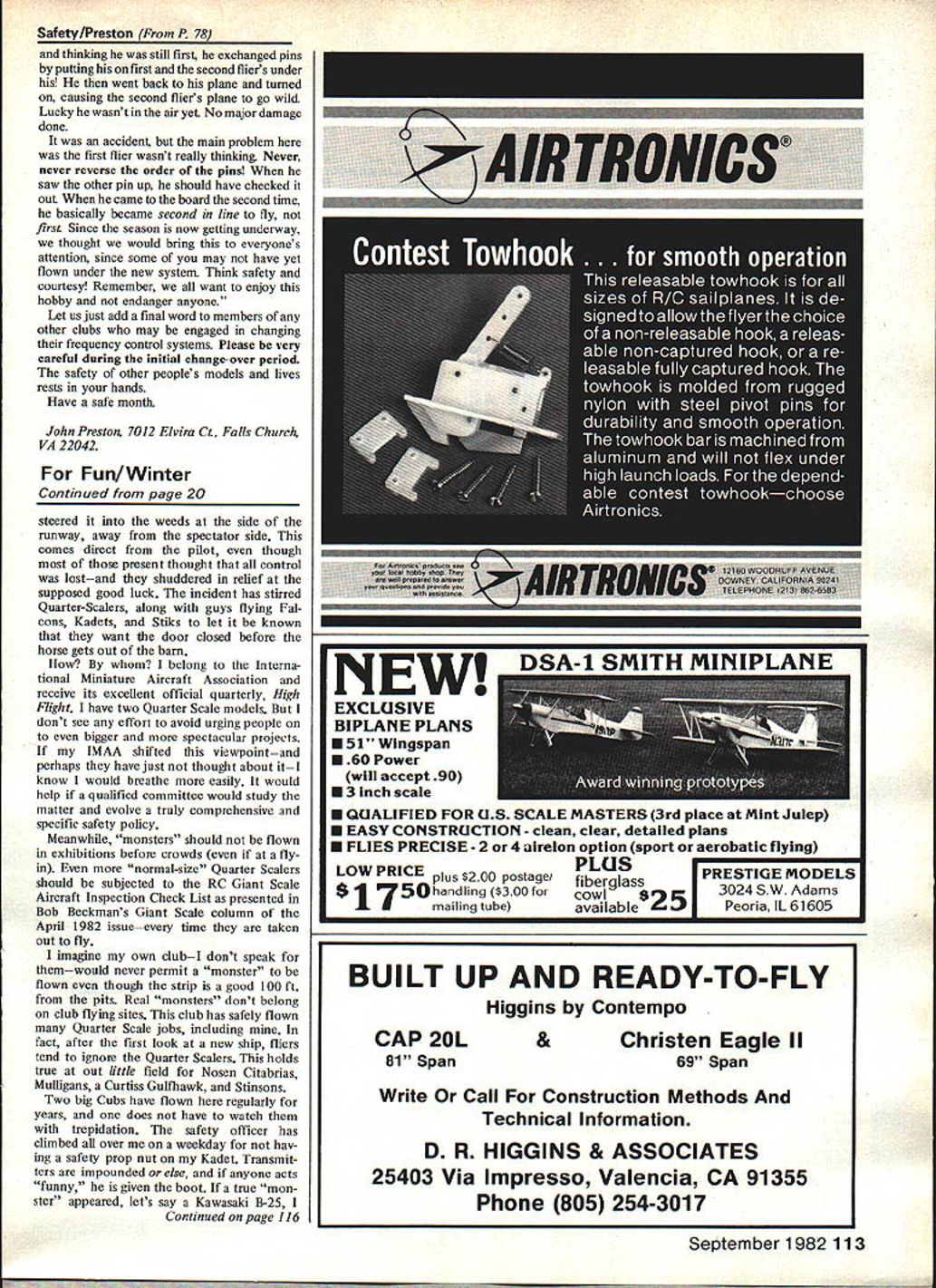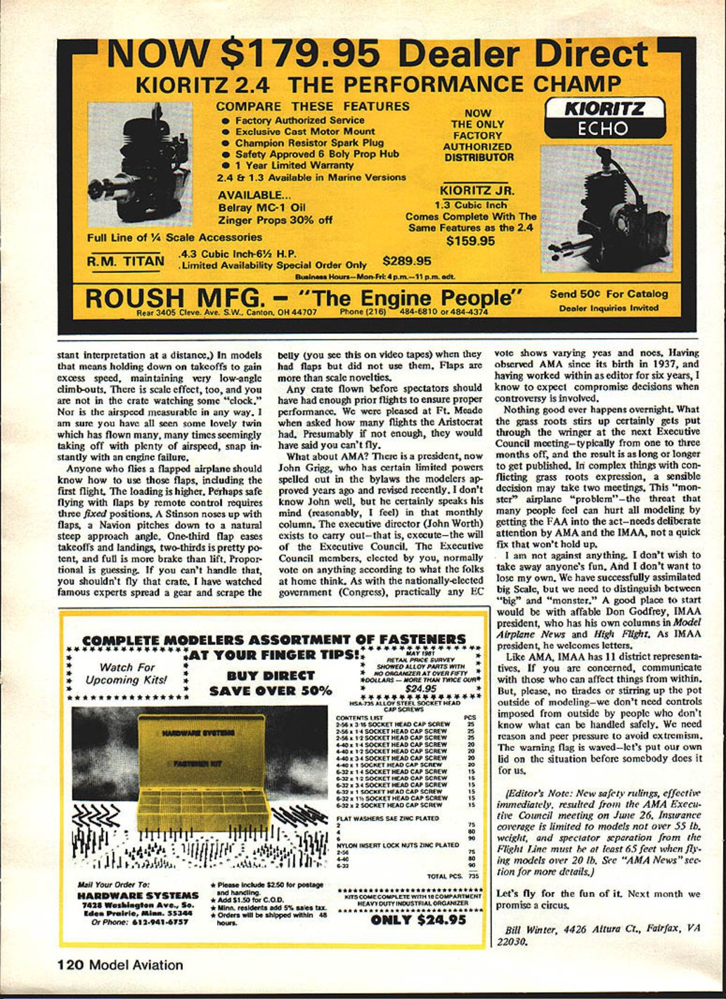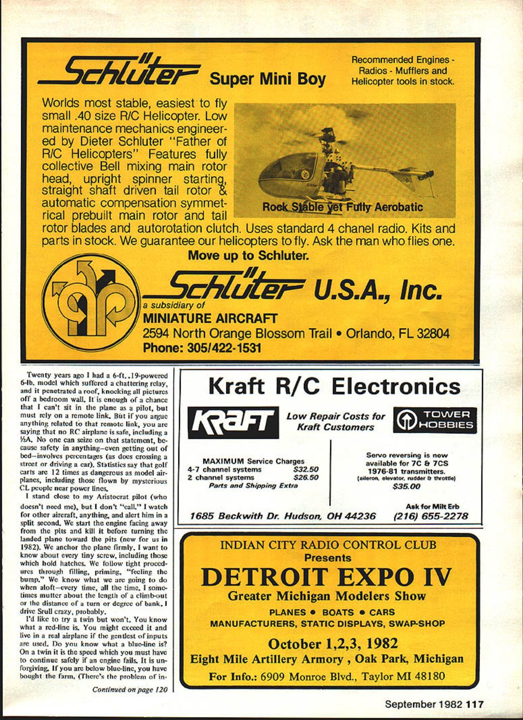 #ev #t HE BUILDS PEANUTS takes contests apt win anyone else need have information relate George Meyer Corpus Christi TX George Little Toot man money Little Toot prettiest niftiest home-built ever George first flew Little Toot sensation Experi mental Aircraft Association George never produced kits sells plans meas ure wonder planes longevity plans once cost $50 now cost twice Most builders nowadays want kit design says George knowsorta like RC Scale shake box airplane drops out Most home-builts either prefab fiberglass About 40 Little Toots now flying quite few RC Scale models around world couple flown national champs uscd England tow model Gliders Meyer Aircrafts literature states would like have airplane easy fly safe fully aerobatic will out turn out-roll anything have ever flown before build Little Toot note specifics statement mind leaps Pitts Lasers et a] Sadly George sold airplane last year modifying bigger engine Texas storm tore up wings George couldnt get rebuilding gifted machinist George already experimenting homemade model diesel engines time availabic quickly developed real heart-stoppers some manage show started out build few diesels 020 category George relates After few rough days several failures finally worked out method lapping little pistons dont leak run very well turn about 9500 After spent couple years building Free Flight Scale models Last fail decided go back building engines pictures show what George managed six months Having never built four-cycle engine George tells us decided build crank case-supercharged four-cycle 12 Cu dis placement bad little trouble blown head gaskets soft copper gaskets cured 16 Model Aviation Creations George Meyer Right full-size Little Toot designed built three-view beneath 19-ft span Little Toot perfect RC aerobatic bipe 1/5 Y4 1/3scalegreat especially twin-cylinder engines Center-line cabanes simplify attachment Kshaped interplane struts also help An appropriate wire gear doubled large versions could carried up fuselage bolted slanted ply piece attached rear firewall Skilled build ers can cope suitable sheet metal gearper haps leaf spring approach Dont know checkerboard motif top wing Curtiss P-6E hawk talon paint scheme also au thentic Below Meet George Meyer Thats 5cylinder 4-cycle 3 cu Nothing best Georgenote laminated prop display test stand beautiful costly furniture Below Middle Singing merrily Kinner-like 5-cylin der crankcase-supercharged radial George will have 4-cylinder 4-cycle running Christmas Bottom Left Three Meyers 020 homemade diesels parking along 9500 rpm three run ning tells something about ease starting uses starter ordinarily dont dare small diesel Bottom Right 4-cycle glow twin runs like clock scale-type engine mount work art Twin 12 cu turns 16-6 6500 5-cylinder radial 6000 using 6 oz nf nlkv fiani fair tmin,ta rain 1AA E A 2212 -cZZI DD EEE ee D IGEO MEYER LITTLE TOOli September 1982 17 problem After seven hours running time tums 16-6 prop 6500 Since ran well decided build five-cylinder 3 cu engine Its radial valve train like old Kinner five camshafts six gears carb Perry 21 engine still think should sleeved down little caib mounted back gear case Five holes let fuel gear case front gear case has five holes let fuel crankcase intake pipes lead crankcase turns 6000 18-6 runs 8 min 6 oz glow fuel latest project four-cylinder in-line crankshaft finishedwith four throws five malns has oil system pres sure mains rods hope have running Christmas As contributor years Rubber Scale models various mags re cently Quarter Scaler cant resist show ing Little Toot three-view magic swept-wing biplanes want best going Scale get Lou Andrews immortal Aeromaster noted sweptwing thing first Udet Flamingo published 1936 MAN Both wings swept like later-day Jungmeister Although Udet mid-20s German trainer said pilots compare favorably famous Jungineister Great Lakes another Overlooked among Curtiss Seahawk top wing swept ala Fal con stralght bottom wingno taper either scale Williams Bros engine would lovely Some air show Great Lakes square outside loops greatest aerial exhibitions ever saw some Marine pilot decided wring out a Seahawk over two grass strips Teter boro 1933 Cars stopped miles un named maneuvers flowed rapidly air craft literally turned inside out 19-ft span Little Toot less 5ft -scale somewhat 6-ft 1/3-scale careful observations flying sites wed urge CG located front leading edge bottom wing sweep top wing Nine-out-of-lO RC Scale bipes waliow tricky am proach tail too low George has said bet hed put nominal price three-viewor maybe has spare literature Little Toot includes larger threeview reduced size printed Meyer Aircraft 5706 Abby Dr Corpus Chris ti TX 78413 SAM has authorized Free Flight Vaga bond Wog Old-Timers Old Square Sides republished recently MA MB Antique rather Old-Timerwhich erroneous listing ask noti fy quickly Vagabond Revisited recent MAN probably acceptable under SAM rules because changes made create modern sport RC-assist up right 19 instead inverted 60 Model Builder has fuli-size plans Old Square Sides designed John Spragueanother byline used years ago John Ponds Plan Service will have official plans three ships Next month Ill provide brief commentary flight characteristics well suggestions Vagabond can equipped de thermalizer Please dont take sunshine away Lets dis tinguish between fun thrilis subject Continued page 20 18 Model Aviation Knighthood Flower Major Hank Bourgeois US Marine Corps pie dated 1937-38 sure 1947-48 correct state-of-the-art Radio Control lob Still universal planes flown escapements turned rudder full right left Receiver relays activated chattered vibration chancy businessand approved frequency aside Ham stuff 465 fliers day RC equivalent moonshining Strange devices flowered desperate tempts get away escapement syndrome job escapement see vane tail behind stab vane rotated Since could stopped slant-wise positions provided feeble elevator doubtful rudder action combina tiOns 