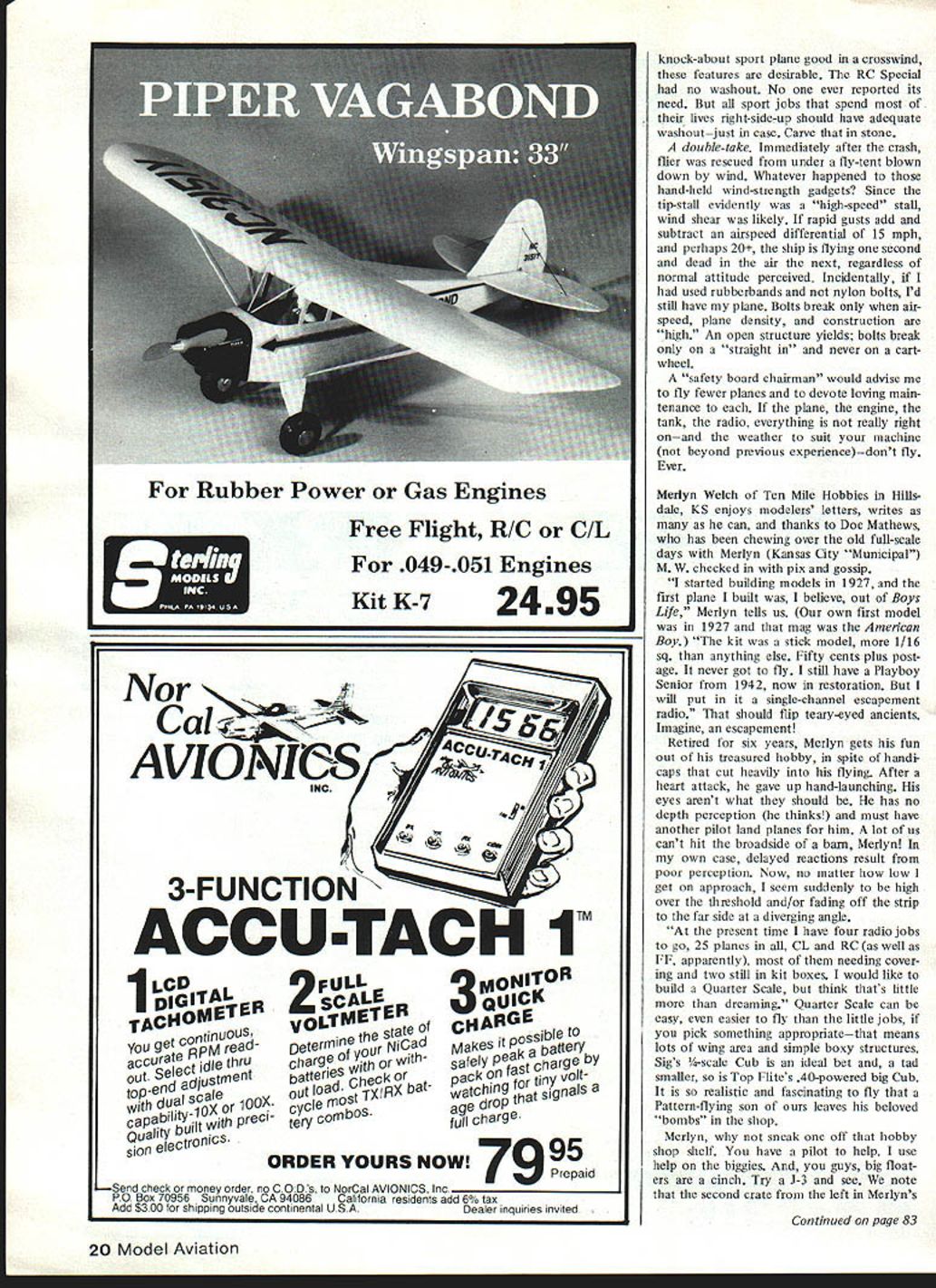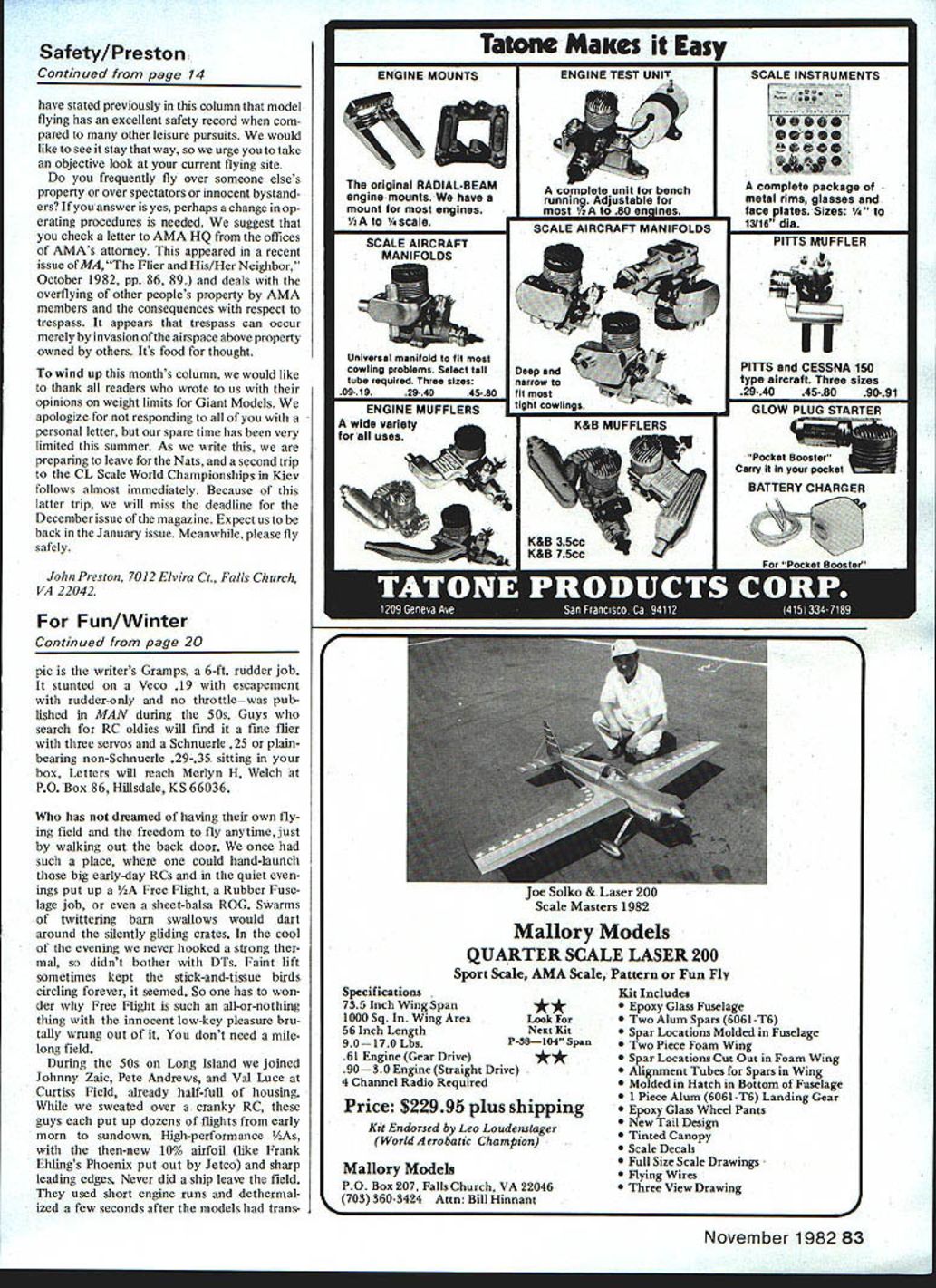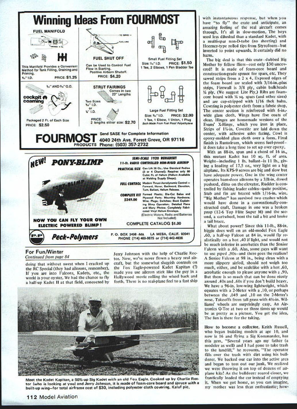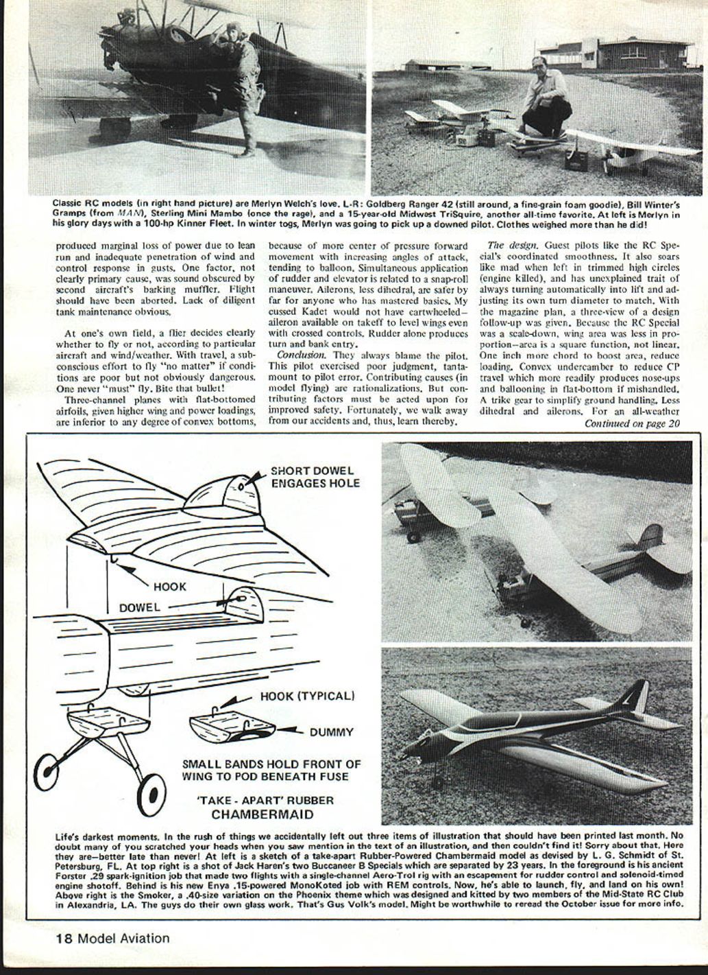 ACCORDING TO THE PAPERS Frank Perdue once hated chickens Perdue feisty guy pushes chickens TV throwing classy bachelor dinners Cornish hens four telling us send hack other guys blackened bones note say ing Gentlemen bones Did eat chicken 01 Frank would make perfect modeler classic AMA activist too am fowl mood busted crate No oppressed Kadet Like unfortu nate airline takeoff mishaps crash textbook accident Perhaps youve noticed accidents involve bare minimum three contributing causes Model postmortems teach five years uneventful hacking around Cursory wakes field blame errant transmitters spooky signais failed batteries etc trash remains no accident investi gations fun lets see what accident anaiysis reveais Subject aircraft Five-year-old RC Special scaled-down version 1948 design pub ilshed September 1980 MA cabin con figuration tail-dragger flat-bottom airfoil 5 deg dibedral three channels no ailerons last powered ST 35 Weather 90 degrees high humidity vari able wind averaging 12-15 mph gusts 25 Gusty changing crosswind vectors 90 deg port starboard Location 50-miles-away visited club field 560-ft well-mowed grass strip unlimit ed approaches Airspace burn Aircraft log 131 flights fleet log same period 700-minus Initially powered K&B 19 Long runs delicate lift-offs sluggish rudder during run flight 22 Pattern flier unable spin until shown wiggling rudder nose-high produced entry stalling tip flight 23 temperature humidity matching later accident takeoff quartering out crosswind short strip visited field lift-off premature coupled severe rudder correction wind back runway line produced tip stall roll inverted cartwheel teasing out cabin major repair Flight 128 same site terminal accident Fast long power approach idled near thresh old slightly nose down fading away runway center line airplanes left Gen tle flare-out correction elevator simultane ous slight rudder correction heading ample airspeed plane abruptly rolled moderately toward pilot line heading cor rected now roughly 8-ft altitude required botb left right rudder maintain control too close pits hard rudder regain runway augered spin damage During 1980-1981 plane flown Davis Diesel-converted ST 35 bor rowed engine test bed expert pilot Radio change aging oil-soaked etc pro duced CG change rearward mid-I 982 com pensated nose ballastwing loading up 18 ounces flight Engine overheating unusual re setting high- low-speed throttle Taxied out long wait runway side Scale mod eler checked taxiing another aircraft Ex tremely ineffective muffler other aircraft own engine almost unheard Initial run accel erated normally up-control held momentarily 16 Model Aviation U jUSt fun Bill Winter Bill Winter left Col Bill Kaluf Fredericksburg before Bill pranged RC Special Flight 131 Youll want read accident analysis text find out Winters transmitter carries both blue-and-white brown-and-white frequency clip Bill Winter figures perfect answer cantilever-strut gear big models Its Gull-wing Stinson Fits fuselage slot removable model being built Les Putnam reported Fred Nielsen Realistic Models acquired production rights Stinson 150 Quarter Scale kit redesigned remove several pounds has made five kits Traced down Fred says gear intended below floor boards actually proiected under seats Bill Winters big Aristocrat real life too redesigned lighter extending above floor boards compression factor l3to 2 instead l3to 1 principle adaptable size weight plane Gear shown job craftsman having lathe Pictures Les Putnam show gear normal loaded modes Realistic Models has crawings does produce gear begin run relaxed tail rose slight down held build up speed Undue rudder correc tions required somewhat erratic ground path during later stages run true head ing wheels skimmed ground Slight downcon trol held avoid abrupt lift-off wind Gust switch starboard port right rip dropped approximately 15 degrees seemingly adequate airspeed ship off ground rudder unable prevent severe cartwheel Radio brown-and-white susceptible blue-and-white adjaccnt frequency antenna down Flew both color pins precaution Operable after crash First-line radio manufacturer stated totally desuned antenna down condition apparent before crash antenna xas always uptherefore nut factor suggest never operating pits antenna down es pecially taxiing Has gone high engine past antcnna down Tank Could emptied filled electric pump after crash turned brown age black neoprene clunk affected diesel fuel hence last-flight needle adjust ments Heavy corrections takeoff delay lift-offspeed did seem adequate Happily posing MA shot energetic 83-year-young Joe Ott soon-to-be kitted Golden Falcon perhaps Swallow Has unique features Flies well about 20 inverts does outsides takes off 15 ftlargely due Joes mix M-6 Eppler 205 St Cyr 52 airfoils St Cyr used Heath Parasol already fiddling mid-engine low-winger ex tension shaft Gosh what next November 1982 17 Classic RC models right hand picture Merlyn Welchs love L-R Goldberg Hanger 42 still around tine-grain toam goodiel Bill Winters Gramps AlAN Sterling Mini Mambo once rage 15-year-old Midwest Triquire another all-time favorite left Merlyn glory days 100-hp Kinner Fleet winter togs Merlyn going pick up downed pilot Clothes weighed did produced marginal loss power due lean run inadequate penetration wind control response gusts factor clearly primary cause sound obscured second aircrafts barking muffler Flight should have aborted Lack diligent tank maintenance obvious ones own field flier decides clearly whether fly according particular aircraft wind/weather travel sub conscious effort fly no matter condi tions poor obviously dangerous never must fly Bite bullet Three-channel planes flat-bottomed airfoils given higher wing power loadings inferior degree convex bottoms because center pressure forward movement witls increasing angles attack tending balloon Simultaneous appilcation rudder elevator related snap-roll maneuver Ailerons less dihedral safer far anyone has mastered bas