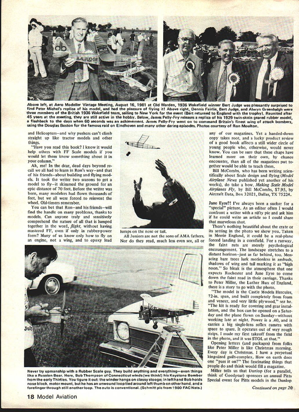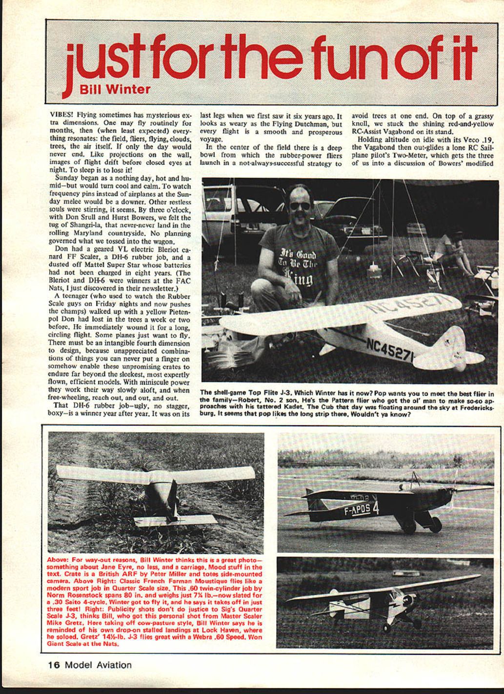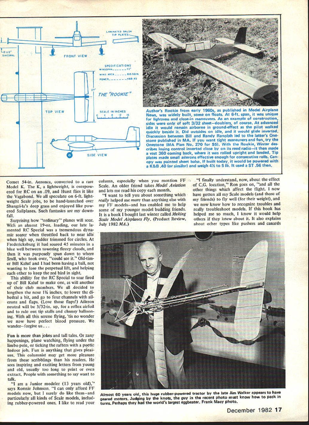 VIBES Flying sometimes has mysterious ex tra dimensions may fly routinely months least expected thing resonates field fliers flying clouds trees air itself day would never end Like projections wall images flight drift before closed eyes night sleep lose Sunday began nothing day hot hu midbut would turn cool cairn watch frequency pins instead airplanes Sun day melee would downer Other restless souls stirring seems three oclock Don Srull Hurst Bowers felt tug Shangri-la never-never land rolling Maryland countryside No planning governed what tossed wagon Don geared VL electric Bleriot ca nard FF Scaler DH-6 rubber job dusted off Mattel Super Star batteries charged eight years Bleriot DH-6 winners FAC Nats just discovered newsletter teenager used watch Rubber Scale guys Friday nights now pushes champs walked up yellow Pieten pol Don lost trees week two before immediately wound long circling flight Some planes just want fly must intangible fourth dimension design because unappreciated combina tions things can never put finger somehow enable unpromising crates endure far beyond sleekest expertly flown efficient models miniscule power work way slowly aloft free-wheeling reach out out out DH-6 rubber jobugly no stagger boxyis winner year after year its last legs first saw six years ago avoid trees end top grassy looks weary Flying Dutchman knoll stuck shining red-and-yellow flight smooth prosperous RC-Assist Vagabond its stand voyage Holding altitude idle its Veco 19 center field deep Vagabond out-glides lone RC Sailbowl rubber-power fliers plane pilots Two-Meter gets three launch not-always-successful strategy us discussion Bowers modified shell-game Top Flite J-3 Which Winter has now Pop wants meet best flier familyRobert No 2 son Hes Pattern flier got 01 man make so-so ap proaches hue tattered Kadet Cub day floating around sky Fredericks burg seems pop likes long strip Wouldnt ye know 16 Model Aviation Above I-Or way-out reasons Bill Winter thinks great photo something about Jane Eyre no less carriage Mood stuff text Crate British ARF Peter Miller totes side-mounted camera Above Right Classic French Farman Moustique flies like modern sport job Quarter Scale size 60 twin-cylinder job Norm Rosenstock spans 80 weighs just 7% lbnow slated 30 Saito 4-cycle Winter got fly says takes off just three feet Right Publicity shots dont justice Sigs Quarter Scale J-3 thinks Bill got personal shot Master Scaler Mike Gretz taking off cow-pasture style Bill Winter says reminded own drop-on stalled landings Lock Haven soloed Gretz 14%-lb J-3 flies great Webra 60 Speed Won Giant Scale Nats LAMINATED BALSA TIP PLATES S REC IF CATION S WINGSPAN72 WINS AREASINSOIN POWER6W845 THE 9QQKfE SCALE IN INCHES 04S12IA L SlOE VIEW Comet 54-in Aeronca converted rare Model K K lightweight overpow ered RC 09 Hurst flies like Vagabond speculate 6-ft light weight Scale jobs hand-launched over Shangri-las deep grass enjoyed like pow ered Sailpianes Such fantasies down fall Surprising ordinary planes will soar almost 19-oz loading late la mented RC Special tremendous dyna mic soarer throttled back near idle high up rudder trimmed circles Fredericksburg soared 45 minutes blue well between towering fleecy clouds purposely spun down Srull took over could see Old-tim er Bill Kaluf having ball wanting lose perpetual lift helping other keep red bird sight ability RC Special soar fired up ol Bill Kaluf make will another club members decided lengthen nose 1% inches lower di hedral bit go four channels ail erons flaps Love flaps Aileron neutral will 3/32-in up reflex airfoil rule out tip stalls clumsy balloon ing serene flying tis no wonder now have perfect blood pressure wanderforgive us Fun jokes tall tales zany happenings plane watching flying under limbo pole ticking rafters poetic Indoor job Fun anything givespleas ure columnist may get pleasure scribbllngs readers sees inspiring exciting letters young old usually too long print extract People something say want talk am Junior modeler 13 years old says Ronnie Johnson can afford FF models now surely like themand particularly kinds Scale models includ ing rubber-powered ones like read column especially mention FF Scale An older friend takes Model Aviation lets read copy month want tell about something really helped anything else FF modelsand has enabled help some younger model building friends book bought last winter called Making Scale Model Airplanes Ely Product Review July 1982 MA finally understand now about effect CG location Ron goes other things affect flight now have gotten Scale models friends fly well weight now know recognize troubles really troubleshoot models book has helped much know would help others knew about also explains about other types ilke pushers canards December 1982 17 FRONT VIEW TOP VIEW Li Authors Rookie early 1960s published Model Airplane News widely built some floats 6-ft span unique lightness close-in maneuvers As example construction sides soft 3132 sheetdoublers course advanced idle would remain airborne ground-effect pilot walked quickly beside Did outsides idle would glide inverted Discussion between Bill Randy Ranolph led latters Onestone published MA want tight maneuvers fun try Onestone MA Plan No 270 $5 Rookie Winter des cribes losing control inverted close its reed radioit made vast 360 coming back rolled upright landed Tip plates made small ailerons effective enough consecutive rolls Can opy painted sheet balsa built today would powered K&B 40 similar weigh 4% 5 lb used ST 56 Almost 60 years old huge rubber-powered tractor late Jim Walker appears have geared motors Judging knots guy recent photo mist know pack turns Perhaps worlds largest eggbeater Frank Macy photo Helicoptersand pushers cant climb straight up like tractor models other things Have read book know would help others FF Scale models would let know something about column Ah dear dead days beyond re call learn Rons wayand friendsabout building flying mod els took writer two seasons ge