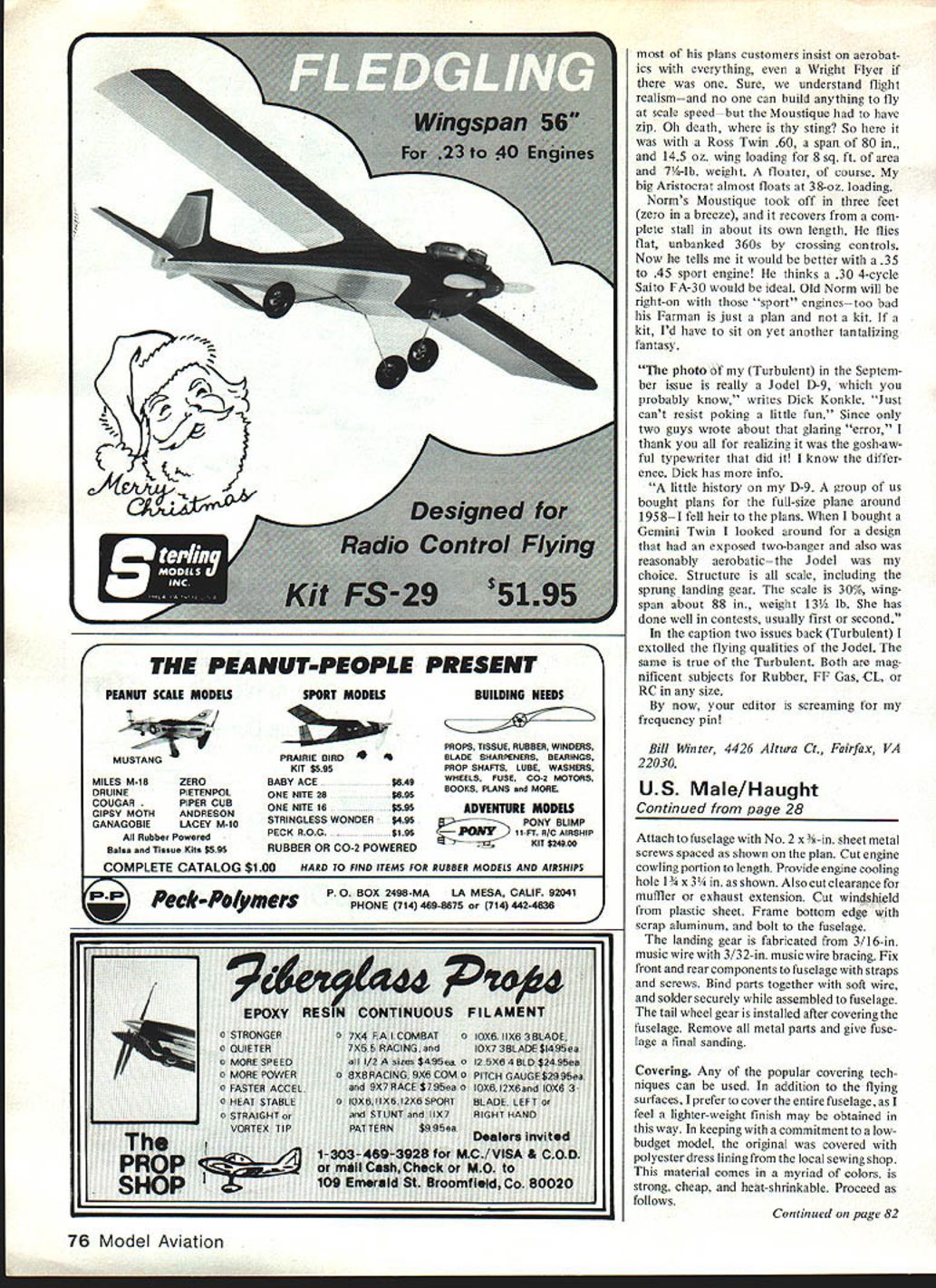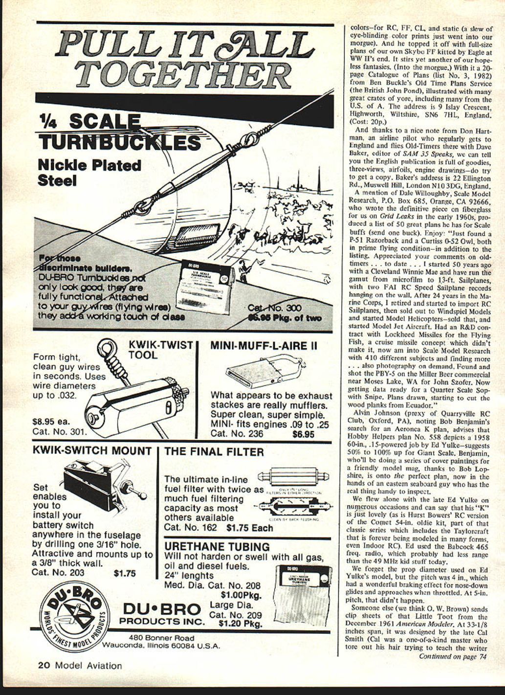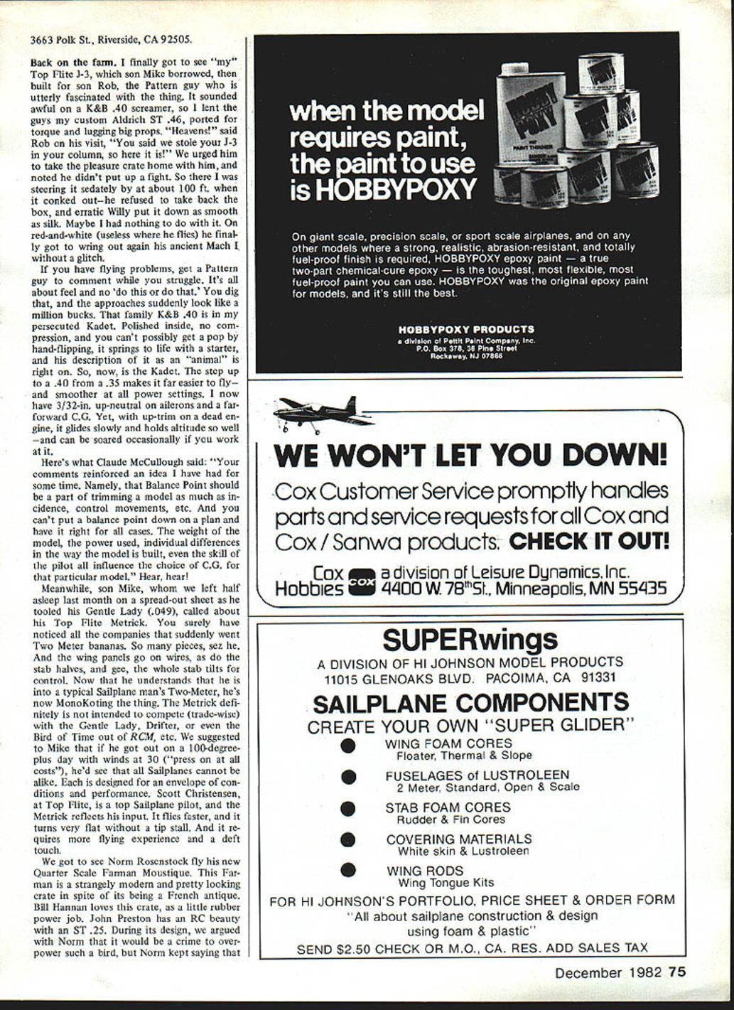 VIBES Flying sometimes has mysterious ex tra dimensions may fly routinely months least expected thing resonates field fliers flying clouds trees air itself day would never end Like projections wall images flight drift before closed eyes night sleep lose Sunday began nothing day hot hu midbut would turn cool cairn watch frequency pins instead airplanes Sun day melee would downer Other restless souls stirring seems three oclock Don Srull Hurst Bowers felt tug Shangri-la never-never land rolling Maryland countryside No planning governed what tossed wagon Don geared VL electric Bleriot ca nard FF Scaler DH-6 rubber job dusted off Mattel Super Star batteries charged eight years Bleriot DH-6 winners FAC Nats just discovered newsletter teenager used watch Rubber Scale guys Friday nights now pushes champs walked up yellow Pieten pol Don lost trees week two before immediately wound long circling flight Some planes just want fly must intangible fourth dimension design because unappreciated combina tions things can never put finger somehow enable unpromising crates endure far beyond sleekest expertly flown efficient models miniscule power work way slowly aloft free-wheeling reach out out out DH-6 rubber jobugly no stagger boxyis winner year after year its last legs first saw six years ago avoid trees end top grassy looks weary Flying Dutchman knoll stuck shining red-and-yellow flight smooth prosperous RC-Assist Vagabond its stand voyage Holding altitude idle its Veco 19 center field deep Vagabond out-glides lone RC Sailbowl rubber-power fliers plane pilots Two-Meter gets three launch not-always-successful strategy us discussion Bowers modified shell-game Top Flite J-3 Which Winter has now Pop wants meet best flier familyRobert No 2 son Hes Pattern flier got 01 man make so-so ap proaches hue tattered Kadet Cub day floating around sky Fredericks burg seems pop likes long strip Wouldnt ye know 16 Model Aviation Above I-Or way-out reasons Bill Winter thinks great photo something about Jane Eyre no less carriage Mood stuff text Crate British ARF Peter Miller totes side-mounted camera Above Right Classic French Farman Moustique flies like modern sport job Quarter Scale size 60 twin-cylinder job Norm Rosenstock spans 80 weighs just 7% lbnow slated 30 Saito 4-cycle Winter got fly says takes off just three feet Right Publicity shots dont justice Sigs Quarter Scale J-3 thinks Bill got personal shot Master Scaler Mike Gretz taking off cow-pasture style Bill Winter says reminded own drop-on stalled landings Lock Haven soloed Gretz 14%-lb J-3 flies great Webra 60 Speed Won Giant Scale Nats LAMINATED BALSA TIP PLATES S REC IF CATION S WINGSPAN72 WINS AREASINSOIN POWER6W845 THE 9QQKfE SCALE IN INCHES 04S12IA L SlOE VIEW Comet 54-in Aeronca converted rare Model K K lightweight overpow ered RC 09 Hurst flies like Vagabond speculate 6-ft light weight Scale jobs hand-launched over Shangri-las deep grass enjoyed like pow ered Sailpianes Such fantasies down fall Surprising ordinary planes will soar almost 19-oz loading late la mented RC Special tremendous dyna mic soarer throttled back near idle high up rudder trimmed circles Fredericksburg soared 45 minutes blue well between towering fleecy clouds purposely spun down Srull took over could see Old-tim er Bill Kaluf having ball wanting lose perpetual lift helping other keep red bird sight ability RC Special soar fired up ol Bill Kaluf make will another club members decided lengthen nose 1% inches lower di hedral bit go four channels ail erons flaps Love flaps Aileron neutral will 3/32-in up reflex airfoil rule out tip stalls clumsy balloon ing serene flying tis no wonder now have perfect blood pressure wanderforgive us Fun jokes tall tales zany happenings plane watching flying under limbo pole ticking rafters poetic Indoor job Fun anything givespleas ure columnist may get pleasure scribbllngs readers sees inspiring exciting letters young old usually too long print extract People something say want talk am Junior modeler 13 years old says Ronnie Johnson can afford FF models now surely like themand particularly kinds Scale models includ ing rubber-powered ones like read column especially mention FF Scale An older friend takes Model Aviation lets read copy month want tell about something really helped anything else FF modelsand has enabled help some younger model building friends book bought last winter called Making Scale Model Airplanes Ely Product Review July 1982 MA finally understand now about effect CG location Ron goes other things affect flight now have gotten Scale models friends fly well weight now know recognize troubles really troubleshoot models book has helped much know would help others knew about also explains about other types ilke pushers canards December 1982 17 FRONT VIEW TOP VIEW Li Authors Rookie early 1960s published Model Airplane News widely built some floats 6-ft span unique lightness close-in maneuvers As example construction sides soft 3132 sheetdoublers course advanced idle would remain airborne ground-effect pilot walked quickly beside Did outsides idle would glide inverted Discussion between Bill Randy Ranolph led latters Onestone published MA want tight maneuvers fun try Onestone MA Plan No 270 $5 Rookie Winter des cribes losing control inverted close its reed radioit made vast 360 coming back rolled upright landed Tip plates made small ailerons effective enough consecutive rolls Can opy painted sheet balsa built today would powered K&B 40 similar weigh 4% 5 lb used ST 56 Almost 60 years old huge rubber-powered tractor late Jim Walker appears have geared motors Judging knots guy recent photo mist know pack turns Perhaps worlds largest eggbeater Frank Macy photo Helicoptersand pushers cant climb straight up like tractor models other things Have read book know would help others FF Scale models would let know something about column Ah dear dead days beyond re call learn Rons wayand friendsabout building flying mod els took writer two seasons ge