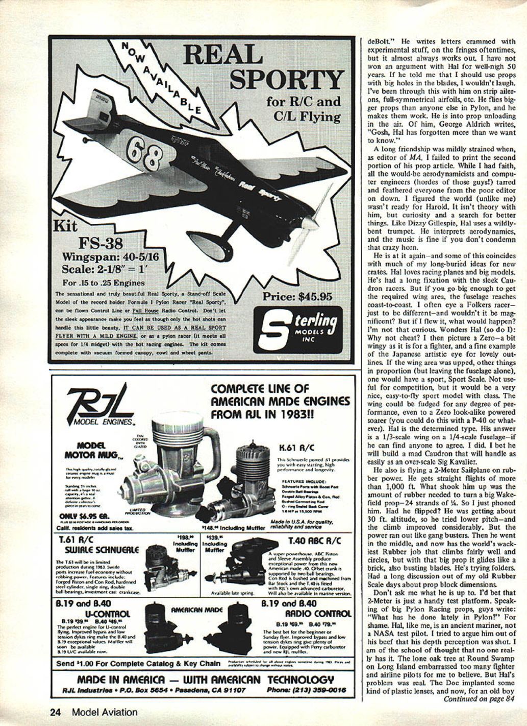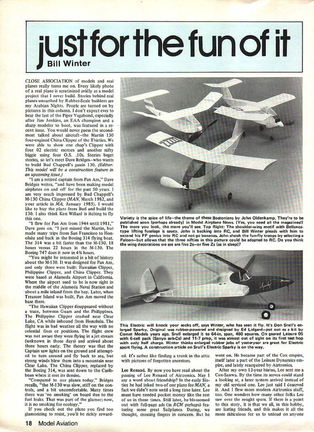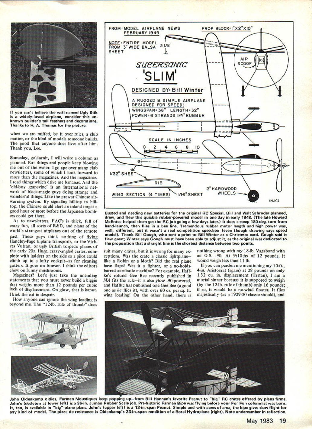 CLOSE ASSOCIATION models real planes really turns likely photo real plane scrutinized avidly model project never build Stories behind real planes unearthed Rubber-Scale builders Arabian Nights People turned pictures column dont expect ever hear last Piper Vagabond especially after Jim Jenkins EAA champion sharp modeler boot featured re cent issue would never guess secondmost talked about aircraftthe Martin 130 four-engined China Clipper Thirties able show chaps Clipper four 02 electric motors another nifty biggie using four OS 10s Stories beget stories lets meet Dave Bridgeswho wants build Bud Chappells gassie 130 Editor model will construction feature upcoming issue am retired captain Pan Am Dave Bridges writes have making model airplanes off past 50 years am very much impressed Bud Chappells M-130 China Clipper MAN March 1982 article MA January 1983 would like buy plans Bud build 130 also think Ken Willard itching fly flew Pan Am 1944 until 1981 Dave goes just missed Martin made trips San Francisco Hon olulu back Boeing 314 flying boat 314 bit faster M-130 18 hours versus 22 hours M-130 Boeing 747 does now 4% hours might interested bit history about M-130 designed Pan Am three built Hawaiian Clipper Philippine Clipper China Clipper based Alameda Airport California airport used now right middle Alameda Naval Station about mile inland bay Later Treasure Island built Pan Am moved base Hawaiian Clipper disappeared trace between Guam Philippines Philippine Clipper crashed near Clear Lake CA inbound Honolulu flight bad weather way no celestial fixes positions flight crew aware flying jet stream unknown days arrived about three hours early theory Captain saw lights ground attempt ed turn around fly back sea strong winds blew mountain near Clear Lake China Clipper replaced Boeing 314 sent down Carib bean met its demise Compared planes today Bridges recalls M-1 30 slow stiff con trols bit uncomfortable times no smoking board due fuel leaks part glamor now no smoking ecology check out plane find too glamorizing resist youll richly rewarded Its rather like finding trunk attic pictures forgotten ancestors Lee Renaud now have read about passing Lee Renaud Airtronics May say word about friendship early Six ties inked two plans MAN fact didnt note until long time later Lee must have needed pocket money like rest us times Still later blossomed out full-page ads RCM perhaps fea turing some great Sailplanes Daring thought crossing fingers concern went became part Cox empire itself later part Leisure Dynamics em pire lately reacquired Airtronics After own 12-year hiatus Lee sent Cox-Sanwa time its servos could stand looking later system arrived instead old serviced Lee just said deserved flew modern Airtronics stuff too wonders other folks Lee saw over rought spots point story hobby lasting friends makes ridiculous us unload anyone 18 Model Aviation U lust fun Bill Winter Variety spice lifethe theme Bostonians John Oldenkamp Theyre published soon perhaps already Model Airplane News Yes need magazines look youll see Top Right shoulder-wing motif Bellanca type lifting fuselage saucy John backing RC Bill Winter pleads him extend FF genius RC go bananas John shook fun-fly troops selecting Falconbut allows three nifties picture could adapted RC think wing decorations see five 2sor five Zs sleep Electric will knock socks off says Winter has seen fly Its Don Srulls en larged Sparky Original rubber-powered designed Ed Lidgardput out kit Comet Models years ago SruIl enlarged 64-in span 460 squares geared Leisure 05 6-cell pack Sanyo sub-Cs 11-7 prop almost out sight its first test hop half charge Winter thinks enlarged rubber jobs yesteryear great Electric sport flying construction article Srulls Electric Sparky way miffed over rules club matter kind models someone builds good anyone does lives after him Thank Lee Someday goldarnit will write column planned things people keep blowing out water go ape over club newsletters some look forward magazines magazines read things drive bananas old-boy grapevine international net work black-magic guys doing strange wonderful things Like prewar Chinese airwarning system signaling hilltop hill top Chinese could alert inland target good hour before Japanese bomb ers could get As newsletters FACs thick full crazy fun sorts R&D plans worlds strangest airplanes out remote past guys think nothing flying Handley-Page biplane transports Vick ers Vulcan ugly British torpedo planes early 20s Huge crazy-angled crates com plete ladders side pilot could climb up lofty cockpitas cleaning gutters goes forever think editors chew funny mushrooms Magazines Lets just take unending statements must never build biggie weighs 12 pounds per cubic inch displacement glow kaput kick cat despair anyone can ignore wing loading beyond 12-lb rule thumb does FROM-MODEL AIRPLANE NEWS_________________ FEBRUARY 1949 NOTE ENTIRE MODEL 31/8 FROM 3WIDE BALSA SHEET DESIGNED BY Bill Winter ERsa/W-a PROP BLOCKl X2XIO RUGGED SIMPLE AIRPLANE DESIGNED FOR SPEED III 1~ -- II 1/32 SHE 2HARDWOOD WHEELS - HJCI WING SECTION 4 TIMES1/16 SHEET Busted needing new batteries original RC Special Bill Walt Schroder planned drew flew quickie rubber-powered model day early 1948 late Howard McEntee helped get RC job going few days later does steep 180-deg turn hand-launch flies bee line Tremendous rubber motor length high power well different wasnt real competition speedster though drawing says speed model Thank Bill Gough sent print Bill Winter Christmas card Gough said flew great Winter says Gough must have able adjust original dedicated proposition straight line shortest distance between two points suit crates wrong ex ceptions crate classic lightplane like Robin Moth Did real plane have flaps fighter no-holdsbarred aerobatic machine example Haff kes rotund Gee Bee recently published MA fits ruleit also glow 90-powered Hafike has published Gee Bee good flies over 60 oz per sq ft wing loading other hand nothing wrong 18-lb Vagabo
