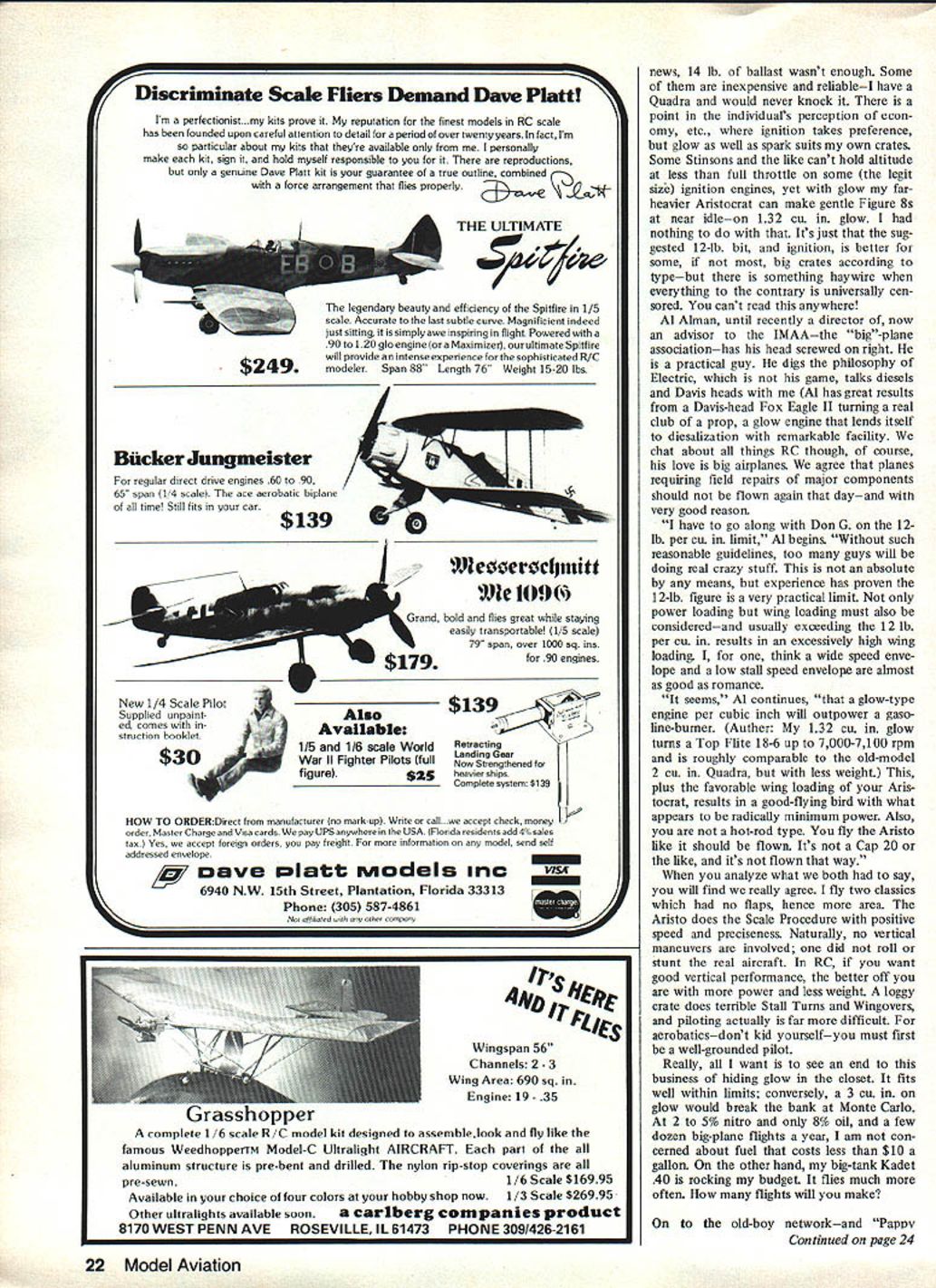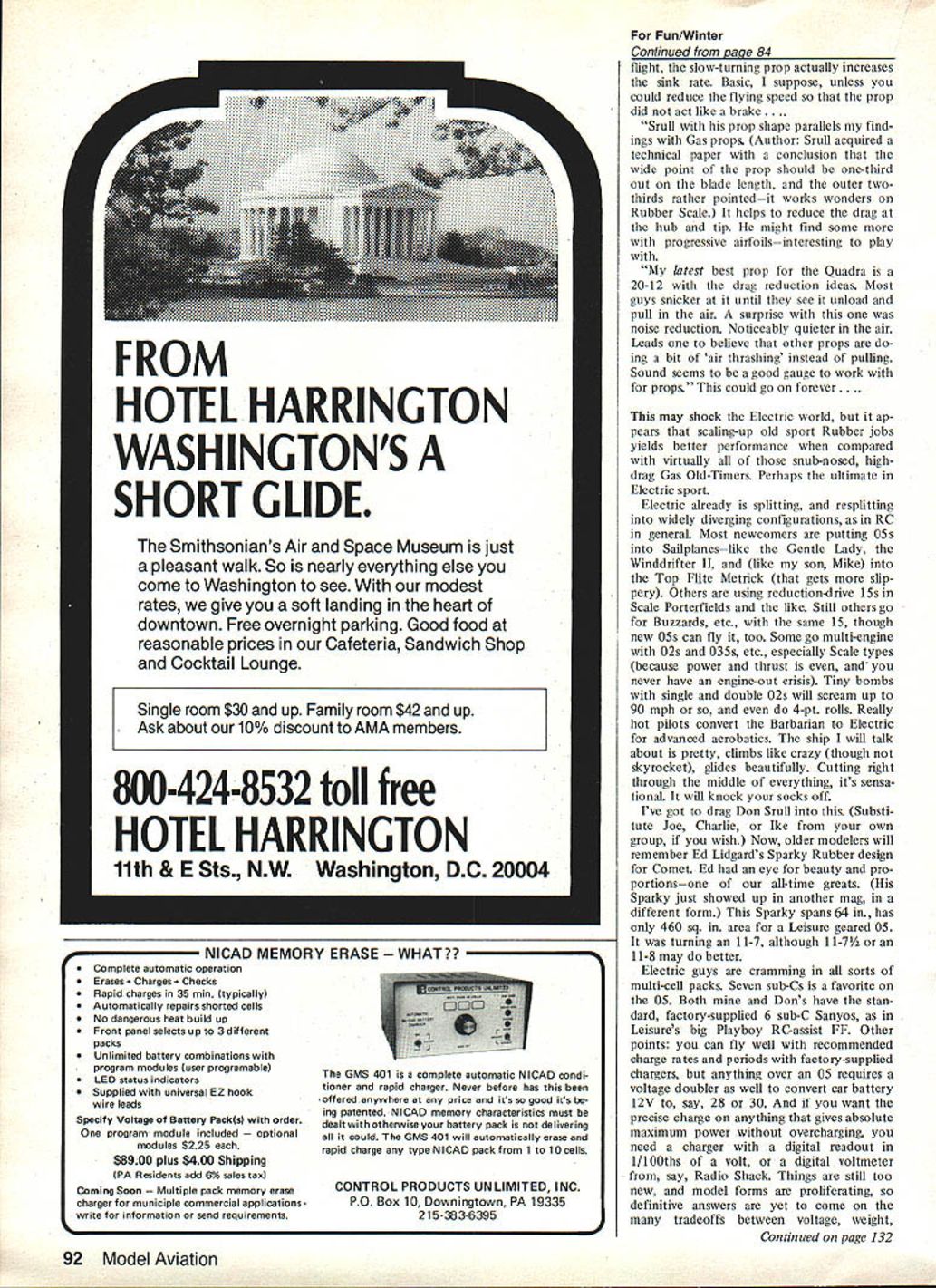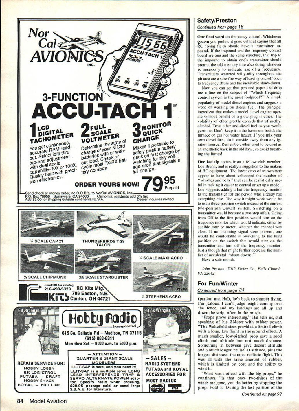 CLOSE ASSOCIATION models real planes really turns likely photo real plane scrutinized avidly model project never build Stories behind real planes unearthed Rubber-Scale builders Arabian Nights People turned pictures column dont expect ever hear last Piper Vagabond especially after Jim Jenkins EAA champion sharp modeler boot featured re cent issue would never guess secondmost talked about aircraftthe Martin 130 four-engined China Clipper Thirties able show chaps Clipper four 02 electric motors another nifty biggie using four OS 10s Stories beget stories lets meet Dave Bridgeswho wants build Bud Chappells gassie 130 Editor model will construction feature upcoming issue am retired captain Pan Am Dave Bridges writes have making model airplanes off past 50 years am very much impressed Bud Chappells M-130 China Clipper MAN March 1982 article MA January 1983 would like buy plans Bud build 130 also think Ken Willard itching fly flew Pan Am 1944 until 1981 Dave goes just missed Martin made trips San Francisco Hon olulu back Boeing 314 flying boat 314 bit faster M-130 18 hours versus 22 hours M-130 Boeing 747 does now 4% hours might interested bit history about M-130 designed Pan Am three built Hawaiian Clipper Philippine Clipper China Clipper based Alameda Airport California airport used now right middle Alameda Naval Station about mile inland bay Later Treasure Island built Pan Am moved base Hawaiian Clipper disappeared trace between Guam Philippines Philippine Clipper crashed near Clear Lake CA inbound Honolulu flight bad weather way no celestial fixes positions flight crew aware flying jet stream unknown days arrived about three hours early theory Captain saw lights ground attempt ed turn around fly back sea strong winds blew mountain near Clear Lake China Clipper replaced Boeing 314 sent down Carib bean met its demise Compared planes today Bridges recalls M-1 30 slow stiff con trols bit uncomfortable times no smoking board due fuel leaks part glamor now no smoking ecology check out plane find too glamorizing resist youll richly rewarded Its rather like finding trunk attic pictures forgotten ancestors Lee Renaud now have read about passing Lee Renaud Airtronics May say word about friendship early Six ties inked two plans MAN fact didnt note until long time later Lee must have needed pocket money like rest us times Still later blossomed out full-page ads RCM perhaps fea turing some great Sailplanes Daring thought crossing fingers concern went became part Cox empire itself later part Leisure Dynamics em pire lately reacquired Airtronics After own 12-year hiatus Lee sent Cox-Sanwa time its servos could stand looking later system arrived instead old serviced Lee just said deserved flew modern Airtronics stuff too wonders other folks Lee saw over rought spots point story hobby lasting friends makes ridiculous us unload anyone 18 Model Aviation U lust fun Bill Winter Variety spice lifethe theme Bostonians John Oldenkamp Theyre published soon perhaps already Model Airplane News Yes need magazines look youll see Top Right shoulder-wing motif Bellanca type lifting fuselage saucy John backing RC Bill Winter pleads him extend FF genius RC go bananas John shook fun-fly troops selecting Falconbut allows three nifties picture could adapted RC think wing decorations see five 2sor five Zs sleep Electric will knock socks off says Winter has seen fly Its Don Srulls en larged Sparky Original rubber-powered designed Ed Lidgardput out kit Comet Models years ago SruIl enlarged 64-in span 460 squares geared Leisure 05 6-cell pack Sanyo sub-Cs 11-7 prop almost out sight its first test hop half charge Winter thinks enlarged rubber jobs yesteryear great Electric sport flying construction article Srulls Electric Sparky way miffed over rules club matter kind models someone builds good anyone does lives after him Thank Lee Someday goldarnit will write column planned things people keep blowing out water go ape over club newsletters some look forward magazines magazines read things drive bananas old-boy grapevine international net work black-magic guys doing strange wonderful things Like prewar Chinese airwarning system signaling hilltop hill top Chinese could alert inland target good hour before Japanese bomb ers could get As newsletters FACs thick full crazy fun sorts R&D plans worlds strangest airplanes out remote past guys think nothing flying Handley-Page biplane transports Vick ers Vulcan ugly British torpedo planes early 20s Huge crazy-angled crates com plete ladders side pilot could climb up lofty cockpitas cleaning gutters goes forever think editors chew funny mushrooms Magazines Lets just take unending statements must never build biggie weighs 12 pounds per cubic inch displacement glow kaput kick cat despair anyone can ignore wing loading beyond 12-lb rule thumb does FROM-MODEL AIRPLANE NEWS_________________ FEBRUARY 1949 NOTE ENTIRE MODEL 31/8 FROM 3WIDE BALSA SHEET DESIGNED BY Bill Winter ERsa/W-a PROP BLOCKl X2XIO RUGGED SIMPLE AIRPLANE DESIGNED FOR SPEED III 1~ -- II 1/32 SHE 2HARDWOOD WHEELS - HJCI WING SECTION 4 TIMES1/16 SHEET Busted needing new batteries original RC Special Bill Walt Schroder planned drew flew quickie rubber-powered model day early 1948 late Howard McEntee helped get RC job going few days later does steep 180-deg turn hand-launch flies bee line Tremendous rubber motor length high power well different wasnt real competition speedster though drawing says speed model Thank Bill Gough sent print Bill Winter Christmas card Gough said flew great Winter says Gough must have able adjust original dedicated proposition straight line shortest distance between two points suit crates wrong ex ceptions crate classic lightplane like Robin Moth Did real plane have flaps fighter no-holdsbarred aerobatic machine example Haff kes rotund Gee Bee recently published MA fits ruleit also glow 90-powered Hafike has published Gee Bee good flies over 60 oz per sq ft wing loading other hand nothing wrong 18-lb Vagabo