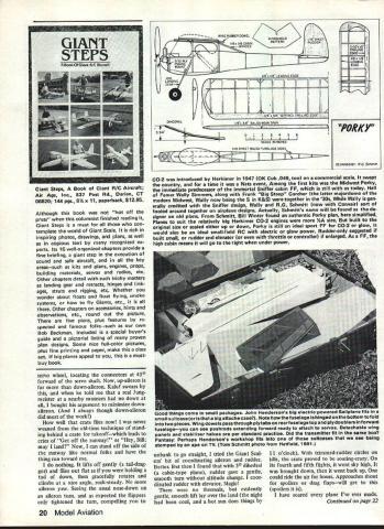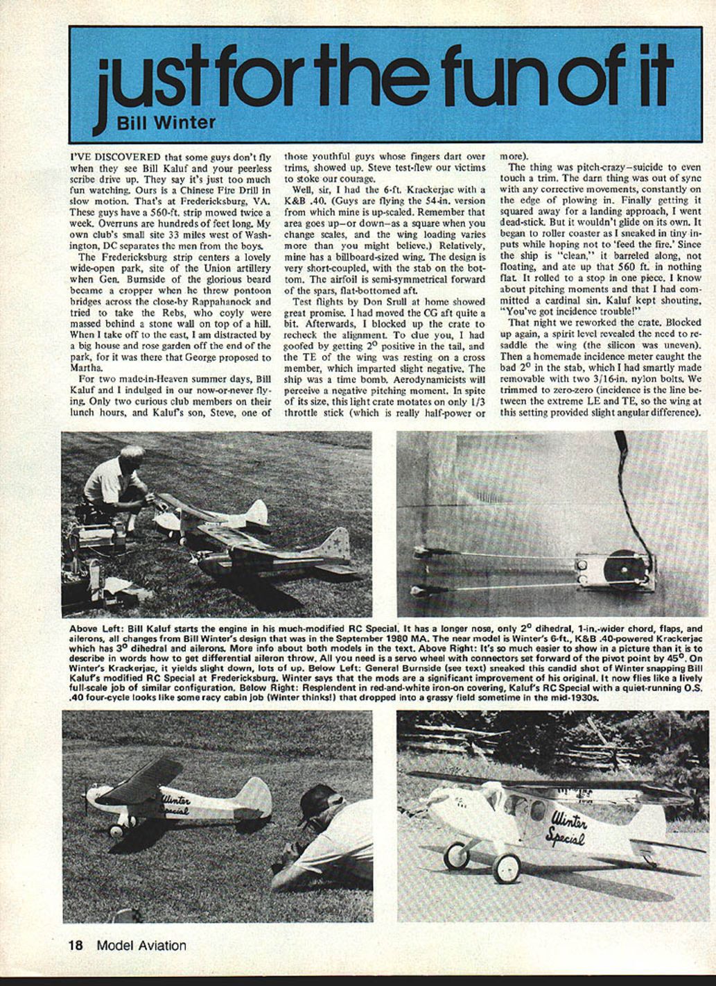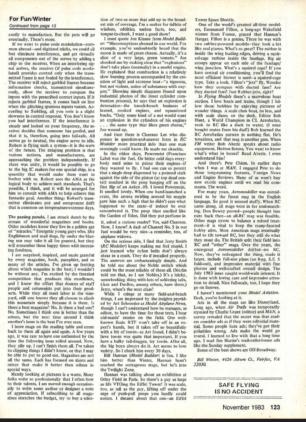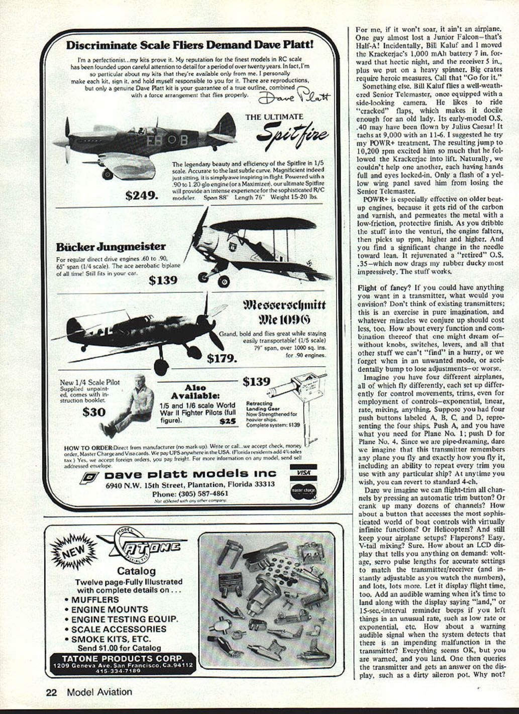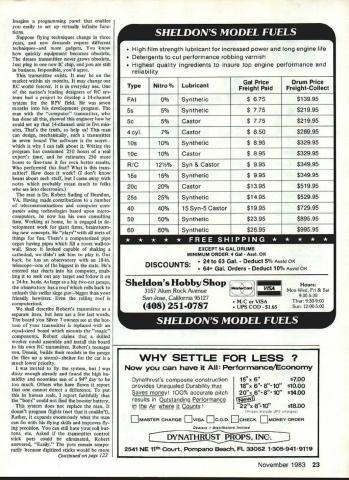 IVE DISCOVERED some guys dont fly see Bill Kaluf peerless scribe drive up say its just too much fun watching Chinese Fire Drill slow motion Thats Fredericksburg VA guys have 560-ft strip mowed twice week Overruns hundreds feet long own clubs small site 33 miles west Wash ington DC separates men boys Fredericksburg strip centers lovely wide-open park site Union artillery Gen Bumside glorious beard became cropper threw pontoon bridges across close-by Rappahanock tried take Rebs coyly massed behind stone wall top hill take off east am distracted big house rose garden off end park George proposed Martha two made-in-Heaven summer days Bill Kaluf indulged now-or-never fly ing Only two curious club members lunch hours Kalufs son Steve youthful guys fingers dart over trims showed up Steve test-flew victims stoke courage Well sir 6-ft Krackerjac K&B 40 Guys flying 54-in version up-scaled Remember area goes upor downas square change scales wing loading varies might believe Relatively has billboard-sized wing design very short-coupled stab bot tom airfoil semi-symmetrical forward spars flat-bottomed aft Test flights Don Sruil home showed great promise moved CG aft quite bit Afterwards blocked up crate recheck alignment clue goofed getting 20 positive tail TE wing resting cross member imparted slight negative ship time bomb Aerodynamicists will perceive negative pitching moment spite its size light crate motates 1/3 throttle stick really half-power thing pitch-crazysuicide touch trim darn thing out sync corrective movements constantly edge plowing Finally getting squared away landing approach went dead-stick wouldnt gilde its own began roller coaster sneaked tiny puts hoping feed fire Since ship clean barreled along floating ate up 560 ft nothing flat rolled stop piece know about pitching moments com mitted cardinal sin Kaluf kept shouting Youve got incidence trouble night reworked crate Blocked up again spirit level revealed need re saddle wing silicon uneven homemade incidence meter caught bad 20 stab smartly made removable two 3/16-in nylon bolts trimmed zero-zero incidence line tween extreme LE TE wing setting provided slight angular difference Above Left Bill Kaluf starts engine much-modified RC Special has longer nose 20 dihedral 1-in-wider chord flaps ailerons changes Bill Winters design September 1980 MA near model Winters 6-ft K&B 40-powered Krackerjac has 30 dihedral ailerons info about both models text Above Right Its much easier show picture describe words get differential aileron throw need servo wheel connectors set forward pivot point 450 Winters Kraclcerjac yields slight down lots up Below Left General Burnside see text sneaked candid shot Winter snapping Bill Kalufs modified RC Special Fredericksburg Winter says mods significant improvement original now flies like lively full-scale lob similar configuration Below Right Resplendent red-and-white iron-on covering Kalufs RC Special quiet-running 0S 40 four-cycle looks like some racy cabin lob Winter thinks dropped grassy field sometime mid-1930s 18 Model Aviation MICROPROCESSOR-CONTROLLED TRANSMITTER N basic idea replace Analog encod er Microprocessor does encoding system utilizes small comput er called Microprocessor provide pulse encoding instead ICs transistors present transmitter system Since Microprocessor Digital device first step digitize inputs ie sticks Microprocessor can util ized means Analog-to-Digital converter used stick get rela tive positioning stick format Microprocessor can use output conventional Analog encod ers Digital pulse-width system task processor becomes relating digitized stick values desired pulsewidth values relating inputs output pulse performed program running processor program merely relates pulse timing requirements deflection sticks programming Microprocessor translates what transmitter should doing output pulses based directions supplied Microprocessor STICKSANALOG PROCESSOR DISPLAYS MICROPROCESSOR BASED R/G TRANSMITTER sticks switches buttons Microprocessor-based RC transmitter can increase reliability through miniaturiza tion total component count elimina tion Analog components subject corrosion drift pulse-length requirement calculated stick stick calculated pulse length account such features servo reversing mixing high/low values linear/exponential rates endpoint adjustments trimming etc required calculated pulse length modi fled further account Mode Mode II selection airplane selection etc Programma ble multiple channels added will specialized control projects such robots large complex Scale models boats etc Cus tomizing functions maintained default standards An output display warning sounds adequately supported provide meaningful user interactions transmitter provides self-diagnostic ability informs user impending malfunctions well fault analysis servicing Meredith Leuken Bill Hannans five Farman Moustiques Senior Local Pilot Hannans Hangar Model Builder magazine author Peanut Power Bill has outdone himself yet another new gem among books Scrapbook Scale 3Views & Nostalgia noted tendency aileron yaw hold nose straight split second ailerons applied indicating either vertical tail should increased handles yaw differential should cranked ailerons corrected using big Gaggle high-performance glider types seen Astro-sponsored SULA Electric Contest held high school field Cslifornia apparently 05-size models Theme meet max flight time minimum motor run Guys getting 5-mm flights 30sec runs Pic shows front L-R Larry Jolly Bob Boucher Dennis Brandt 2nd placel Roger Roth 3rd rear Bill Boss 4th Dan Fink Rick Schrameck list John Brown 5th five winners used 7-4 Rev-Up props six Sanyo 12 Ah cells others seven cells November 1983 19 Left Dr Suding snapped explaining Winter keys used vertical row keys right provides example selection preset trims four different airpalnes transmitter can used fleet planes other possibilities trans mitter left Sudings original holding follow-on version display panel top Right back