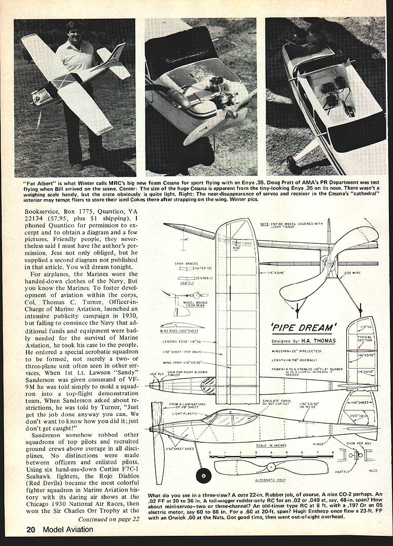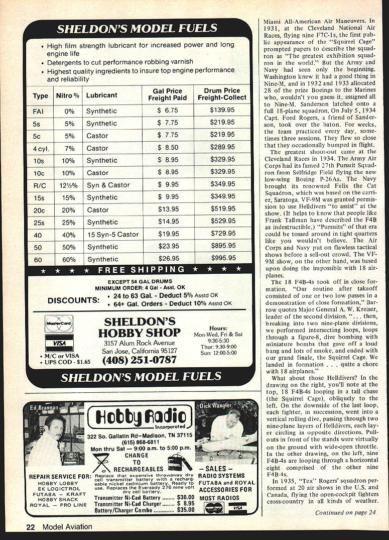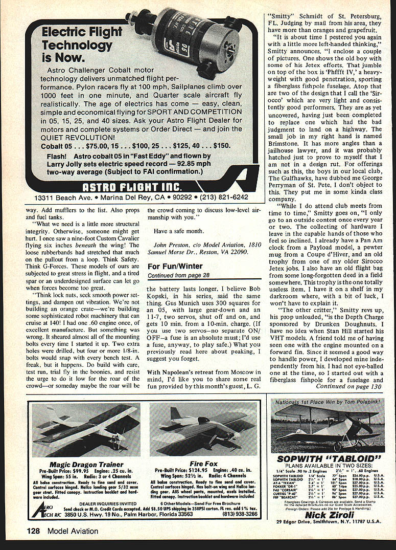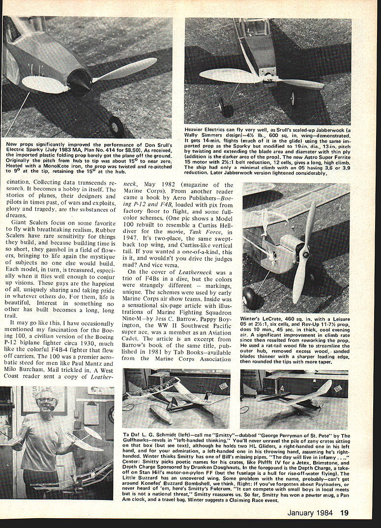 DOCUMENTATION painful chore folks enter Scale events won der share view simpler days built few hundred so-called Scale jobs almost rubber-powered research limited stumbling over some three-view caught fancy Photos just stirred juices did bother details authentic markings people have libraries airplane books drawings articles photos Documentation sounds dull Some have love everything ever flew older subject greater fas Boeing F4B-4 fighters piloted daredevil Marines VF-9M thrilled air show audiences 1930s flying wing tip wing tip 18-plane stunt formationsso close fact planes occasional ly bumped other VF-9Ms Red Devils team sometimes practiced three times day pictures drawings Jess C Barrow collection courtesy Leatherneck magazine Engine cowls wheels VF-9Ms F4B-4s bright red three-plane section having solid-color tails red white blue Cen tered across top wing U S Marines large letters assist quick identification rolling around wild maneuvers regulation markings replaced 2-ft-high numerals side fuselage 30-in-high number underside bottom right wing panel rest airplane standard Navy-Marine colors might want model plane should note rather large bottom wing-fuselage fillet famous Squirrel Cage executed 18 F4B-4s spiral-dived through two nine-plane groups VO-7M 1-feildivers circled opposite directions finishing on-the-deck W pullouts grandstand flyby must have awesome sight sure show-stopper typical 18-plane act Marine F4B-4s Nine planes looped tail-chase through horizontal Figure 8 flown other nine about VF-9M text *fr I__ 14 K iS P48-4 LOOPING TO FORM SQUIRREL CAGE idANEUvER CIRCLES OF vO-7N PLANES GOING IN ORPOSiTE DIRECTIONS PULL OUT AT VERY LOW AL1TUeE-WIUE OPEN MmsYMmgTNTTLE 18 Model Aviation cination Collecting data transcends re search becomes hobby itself stories planes designers pilots times past wars exploits glory tragedy substances dreams Giant Scalers focus some favorite fly breathtaking realism Rubber Scalers have rare sensitivity things build because building time short gambol field flow ers bringing life again mystique subjects no else would build model turn treasured especi ally flies well enough conjur up visions guys happiest uniquely sharing taking pride whatever others life beautiful Interest something no other has built becomes long long trail may go like have occasionally mentioned fascination Boe ing 100 civilian version Boeing P-12 biplane fighter circa 1930 much like colorful F4B-4 fighter flew off carriers 100 premier aero batic steed men like Paul Mantz Milo Burcham Mail trickled West Coast reader sent copy Leatherneck May 1982 magazine Marine Corps another reader came book Aero PublishersBoe ing P-]2 F4B loaded pix factory floor flight some fullcolor schemes pic shows Model 100 rebuilt resemble Curtiss Helldiver movie Task Force 1 947 Its two-place same sweptback top wing Curtiss-like vertical tail wanted one-of-a-kind wouldnt drive judges mad vice versa cover Leatherneck trio F4Bs dive colors strangely different ings unique schemes used early Marine Corps air show teams Inside sensational six-page article illus trations Marine Fighting Squadron Nine-Mby Jess C Barrow Pappy Boy ington WW II Southwest Pacific super ace member Aviation Cadet article excerpt Barrows book same title pub lished 1981 Tab Booksavailable Marine Corps Association Ta Dal L G Schmidt left call Smittydubbed George Perryman St Pete Gulfhawksrevels left-handed thinking Youll never unravel pile zany crates sitting box see text although holds two HL Gliders right-handed left hand admiration left-handed throwing hand assuming hes right handed Winter thinks Smitty has Bills missing pipes day will live infamy. Center Smitty picks poetic names crates like Phffft IV Jetex Brimstone Depth Charge Sponsored Drunken Doughnuts foregound Depth Charge take off Stan Hills motor-on-pylon FF fuselage hull rise-off-water flying Little Buzzard has uncovered wing Some problem name probablycant get around Konefes Buzzard Bombshell think Right youve forgotten about Payloaders never heard em heres Smittys Fulcrum can compete small boys local meets national threat Smitty reassures us So far Smitty has won pewter mug Pan Am clock travel bag Winter suggests Claiming Race event January 1984 19 New props significantly improved performance Don Srulls Electric Sparky July 1983 MA Plan No 414 $850 As received imported plastic folding prop barely got plane off ground Originally pitch hub tip about 150 near zero Heated MonoKote iron prop twisted re-pitched go tip retaining 150 hub Heavier Electrics can fly very well Srulls scaled-up Jabberwock Wally Simmers design4A lb 600 sq wingdemonstrated gets 14-mm flights much glide using same im ported prop Sparky modified 19-in dia 13-in pitch twisting extending blade area diameter thin ply addition darker area prop new Astro Super Ferrite 15 motor 2A1 belt reduction 12 cells gives long high climb ship minimal climb 05 having 36 39 reduction Later Jabberwock version lightened considerably Winters LeCrate 460 sq Leisure 05 2%1 six cells Rev-Up 11-7% prop does 10 mm 45 sec thick cool evening air significant improvement climb rate since resulted reworking prop used rat-tail wood file streamline outer hub removed excess wood sanded blades thinner sharper leading edge rounded tips taper Bookservice Box 1775 Quantico VA 22134 $795 plus $1 shipping phoned Quantico permission ex cerpt obtain diagram few pictures Friendly people never theless said must have authors per mission Jess obliged supplied second diagram published article will dream tonight airplanes Marines wore handed-down clothes Navy know Marines foster devel opment aviation within corps Col Thomas C Turner Officer-inCharge Marine Aviation launched intensive publicity campaign 1930 failing convince Navy ad ditional funds equipment bad ly needed survival Marine Aviation took case people ordered special aerobatic squadron formed merely two- three-plane unit often seen other ser vices 1st Lt Lawson Sandy Sanderson given command VF 9M 