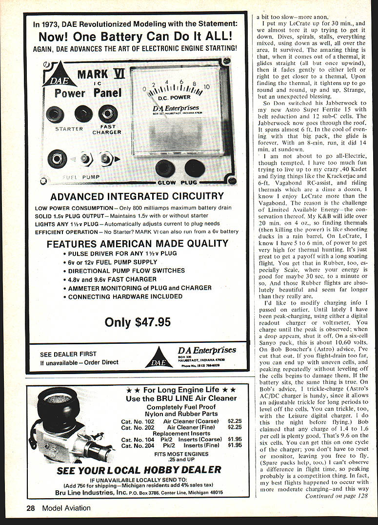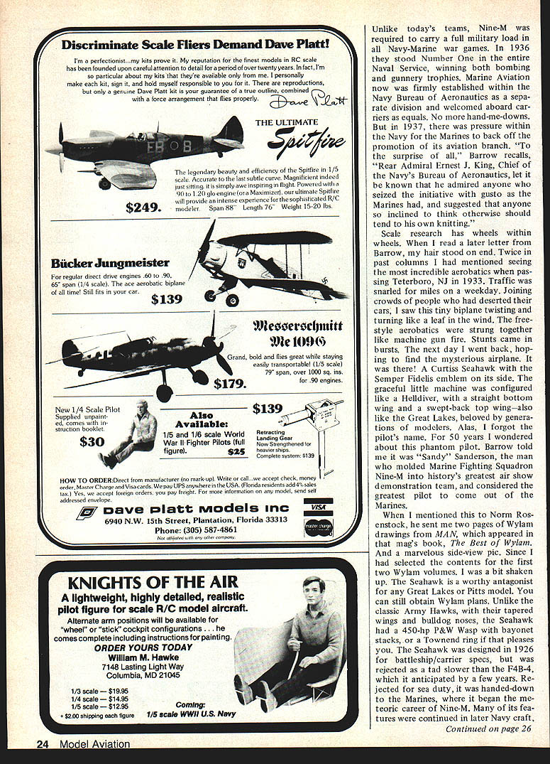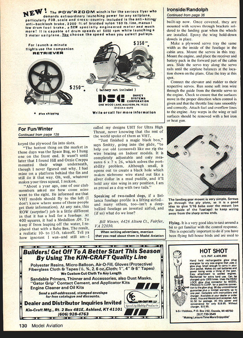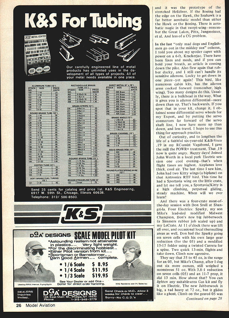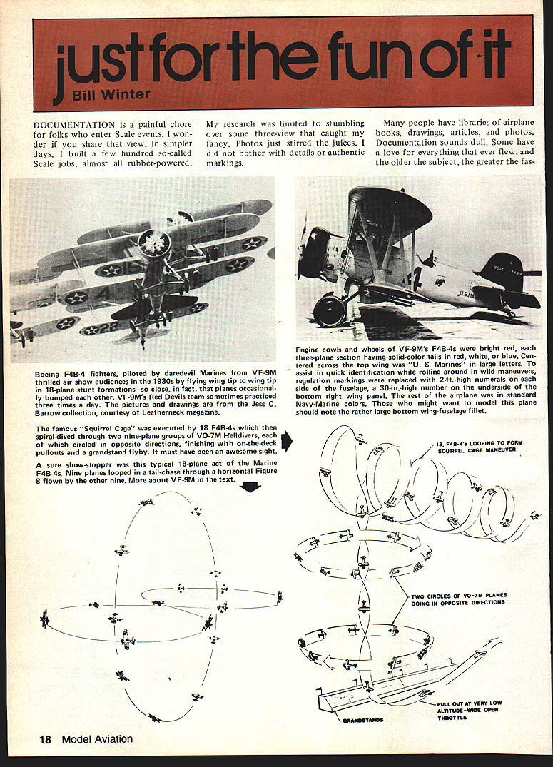DOCUMENTATION painful chore folks enter Scale events won der share view simpler days built few hundred so-called Scale jobs almost rubber-powered research limited stumbling over some three-view caught fancy Photos just stirred juices did bother details authentic markings people have libraries airplane books drawings articles photos Documentation sounds dull Some have love everything ever flew older subject greater fas Boeing F4B-4 fighters piloted daredevil Marines VF-9M thrilled air show audiences 1930s flying wing tip wing tip 18-plane stunt formationsso close fact planes occasional ly bumped other VF-9Ms Red Devils team sometimes practiced three times day pictures drawings Jess C Barrow collection courtesy Leatherneck magazine Engine cowls wheels VF-9Ms F4B-4s bright red three-plane section having solid-color tails red white blue Cen tered across top wing U S Marines large letters assist quick identification rolling around wild maneuvers regulation markings replaced 2-ft-high numerals side fuselage 30-in-high number underside bottom right wing panel rest airplane standard Navy-Marine colors might want model plane should note rather large bottom wing-fuselage fillet famous Squirrel Cage executed 18 F4B-4s spiral-dived through two nine-plane groups VO-7M 1-feildivers circled opposite directions finishing on-the-deck W pullouts grandstand flyby must have awesome sight sure show-stopper typical 18-plane act Marine F4B-4s Nine planes looped tail-chase through horizontal Figure 8 flown other nine about VF-9M text *fr I__ 14 K iS P48-4 LOOPING TO FORM SQUIRREL CAGE idANEUvER CIRCLES OF vO-7N PLANES GOING IN ORPOSiTE DIRECTIONS PULL OUT AT VERY LOW AL1TUeE-WIUE OPEN MmsYMmgTNTTLE 18 Model Aviation cination Collecting data transcends re search becomes hobby itself stories planes designers pilots times past wars exploits glory tragedy substances dreams Giant Scalers focus some favorite fly breathtaking realism Rubber Scalers have rare sensitivity things build because building time short gambol field flow ers bringing life again mystique subjects no else would build model turn treasured especi ally flies well enough conjur up visions guys happiest uniquely sharing taking pride whatever others life beautiful Interest something no other has built becomes long long trail may go like have occasionally mentioned fascination Boe ing 100 civilian version Boeing P-12 biplane fighter circa 1930 much like colorful F4B-4 fighter flew off carriers 100 premier aero batic steed men like Paul Mantz Milo Burcham Mail trickled West Coast reader sent copy Leatherneck May 1982 magazine Marine Corps another reader came book Aero PublishersBoe ing P-]2 F4B loaded pix factory floor flight some fullcolor schemes pic shows Model 100 rebuilt resemble Curtiss Helldiver movie Task Force 1 947 Its two-place same sweptback top wing Curtiss-like vertical tail wanted one-of-a-kind wouldnt drive judges mad vice versa cover Leatherneck trio F4Bs dive colors strangely different ings unique schemes used early Marine Corps air show teams Inside sensational six-page article illus trations Marine Fighting Squadron Nine-Mby Jess C Barrow Pappy Boy ington WW II Southwest Pacific super ace member Aviation Cadet article excerpt Barrows book same title pub lished 1981 Tab Booksavailable Marine Corps Association Ta Dal L G Schmidt left call Smittydubbed George Perryman St Pete Gulfhawksrevels left-handed thinking Youll never unravel pile zany crates sitting box see text although holds two HL Gliders right-handed left hand admiration left-handed throwing hand assuming hes right handed Winter thinks Smitty has Bills missing pipes day will live infamy. Center Smitty picks poetic names crates like Phffft IV Jetex Brimstone Depth Charge Sponsored Drunken Doughnuts foregound Depth Charge take off Stan Hills motor-on-pylon FF fuselage hull rise-off-water flying Little Buzzard has uncovered wing Some problem name probablycant get around Konefes Buzzard Bombshell think Right youve forgotten about Payloaders never heard em heres Smittys Fulcrum can compete small boys local meets national threat Smitty reassures us So far Smitty has won pewter mug Pan Am clock travel bag Winter suggests Claiming Race event January 1984 19 New props significantly improved performance Don Srulls Electric Sparky July 1983 MA Plan No 414 $850 As received imported plastic folding prop barely got plane off ground Originally pitch hub tip about 150 near zero Heated MonoKote iron prop twisted re-pitched go tip retaining 150 hub Heavier Electrics can fly very well Srulls scaled-up Jabberwock Wally Simmers design4A lb 600 sq wingdemonstrated gets 14-mm flights much glide using same im ported prop Sparky modified 19-in dia 13-in pitch twisting extending blade area diameter thin ply addition darker area prop new Astro Super Ferrite 15 motor 2A1 belt reduction 12 cells gives long high climb ship minimal climb 05 having 36 39 reduction Later Jabberwock version lightened considerably Winters LeCrate 460 sq Leisure 05 2%1 six cells Rev-Up 11-7% prop does 10 mm 45 sec thick cool evening air significant improvement climb rate since resulted reworking prop used rat-tail wood file streamline outer hub removed excess wood sanded blades thinner sharper leading edge rounded tips taper Bookservice Box 1775 Quantico VA 22134 $795 plus $1 shipping phoned Quantico permission ex cerpt obtain diagram few pictures Friendly people never theless said must have authors per mission Jess obliged supplied second diagram published article will dream tonight airplanes Marines wore handed-down clothes Navy know Marines foster devel opment aviation within corps Col Thomas C Turner Officer-inCharge Marine Aviation launched intensive publicity campaign 1930 failing convince Navy ad ditional funds equipment bad ly needed survival Marine Aviation took case people ordered special aerobatic squadron formed merely two- three-plane unit often seen other ser vices 1st Lt Lawson Sandy Sanderson given command VF 9M 