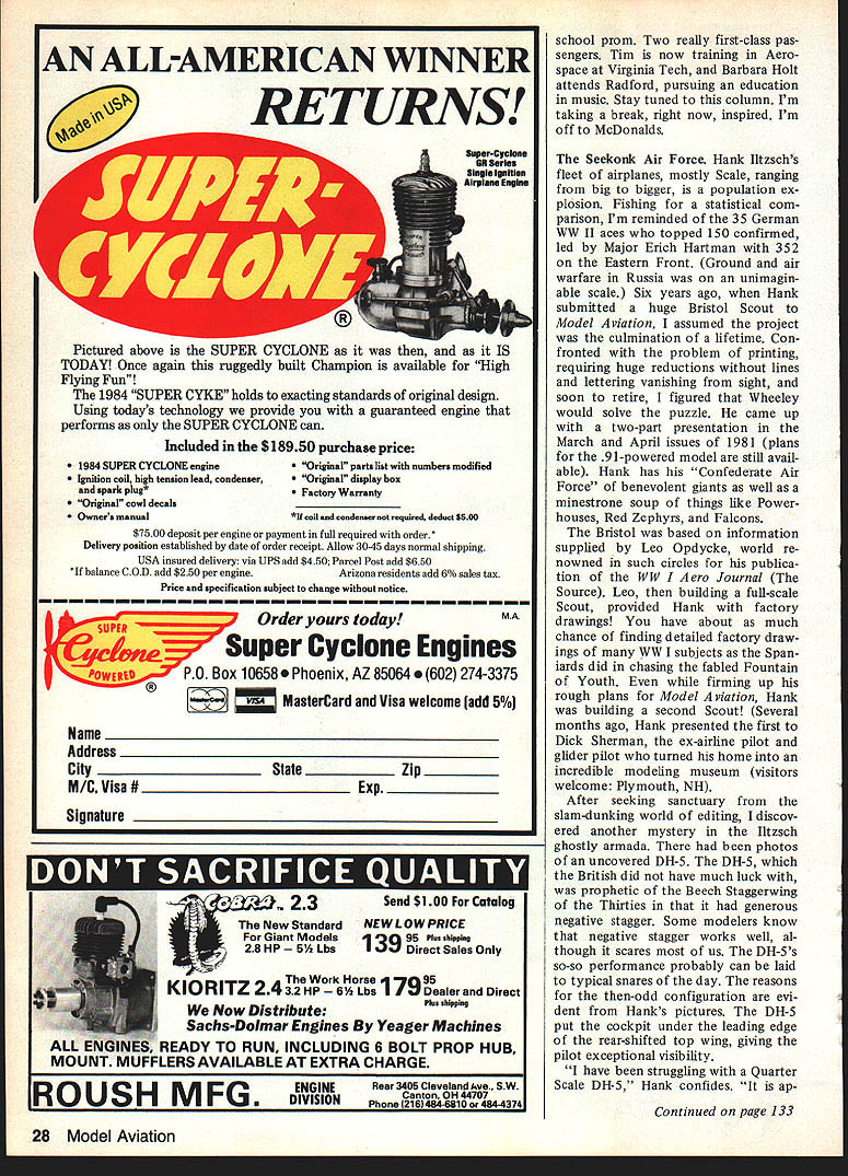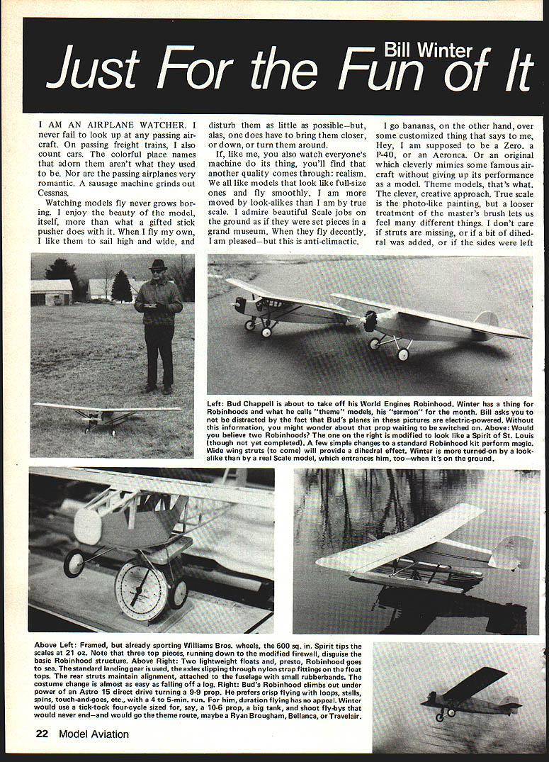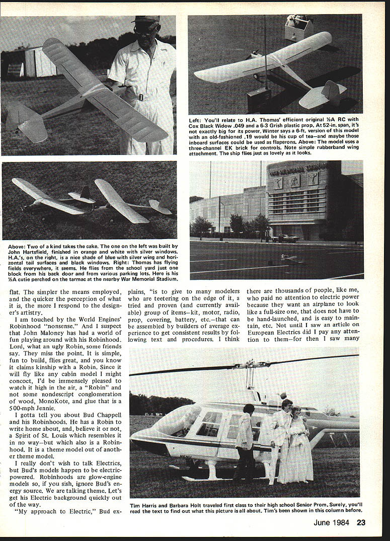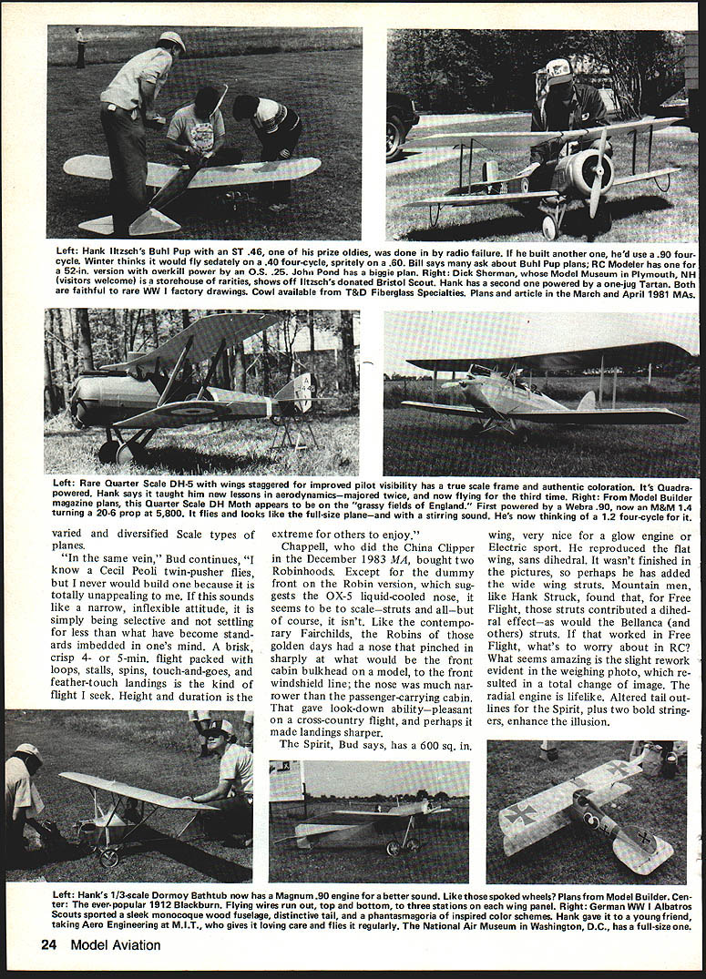 I AM AIRPLANE WATCHER never fail look up passing air craft passing freight trains also count cars colorful place names adorn arent what used Nor passing airplanes very romantic sausage machine grinds out Cessnas Watching models fly never grows bor ing enjoy beauty model itself what gifted stick pusher does fly own like sail high wide disturb little possiblebut alas does have bring closer down turn around like also watch everyones machine its thing youll find another quality comes through realism like models look like full-size ones fly smoothly am moved look-alikes am true scale admire beautiful Scale jobs ground set pieces grand museum fly decently am pleasedbut anti-climactic go bananas other hand over some customized thing says Hey am supposed Zero P-40 Aeronca original cleverly mimics some famous air craft giving up its performance modeL Theme models thats what clever creative approach True scale photo-like painting looser treatment masters brush lets us feel different things dont care struts missing bit dihed ral added sides left Left Bud Chappell about take off World Engines Robinhood Winter has thing Robinhoods what calls theme models sermon month Bill asks distracted fact Buds planes pictures electric-powered Without information might wonder about prop waiting switched Above Would believe two Robinhoods right modified look like Spirit St Louis though yet completed few simple changes standard Robinhood kit perform magic Wide wing struts come will provide dihedral effect Winter turned-on lookalike real Scale model entrances him toowhen its ground Above Left Framed already sporting Williams Bros wheels 600 sq Spirit tips scales 21 oz Note three top pieces running down modified firewall disguise basic Robinhood structure Above Right Two lightweight floats presto Robinhood goes sea standard landing gear used axles slipping through nylon strap fittings float tops rear struts maintain alignment attached fuselage small rubberbands costume change almost easy falling off log Right Buds Robinhood climbs out under power Astro 15 direct drive turning 9-9 prop prefers crisp flying loops stalls spins touch-and-goes etc 4 5-mm run him duration flying has no appeal Winter would use tick-tock four-cycle sized say 10-6 prop big tank shoot fly-bys would never endand would go theme route maybe Ryan Brougham Bellanca Travelair 22 Model Aviation flat simpler means employed quicker perception what respond design ers artistry am touched World Engines Robinhood nonsense suspect John Maloney has world fun playing around Robinhood Lord what ugly Robin some friends say miss point simple fun build flies great know claims kinship Robin Since will fly like cabin model might concoct Id immensely pleased watch high air Robin some nondescript conglomeration wood MonoKote glue 500-mph Jennie gotta tell about Bud Chappell Robinhoods has Robin write home about believe Spirit St Louis resembles no waybut also Robinhood theme model out anoth er theme model really dont wish talk Electrics Buds models happen electric powered Robinhoods glow-engine models sish ignore Buds en ergy source talking theme Lets get Electric background quickly out way approach Electric Bud ex plains give modelers teetering edge tried proven currently avail able group itemskit motor radio prop covering battery etcthat can assembled builders average ex perience get consistent results fol lowing text procedures think thousands people like paid no attention electric power because want airplane look like fuli-size does have hand-launched easy main tain etc until saw article European Electrics did pay atten tion themfor saw June 1984 23 Left Youll relate HA Thomas efficient original AA RC Cox Black Widow 049 6-3 Grish plastic prop 52-in span its exactly big its power Winter says 6-ft version model oldfashioned 19 would cup teaand maybe inboard surfaces could used flaperons Above model uses three-channel EK brick controls Note simple rubberband wing attachment ship flies just lovely looks Above Two kind takes cake left built John Hartsfield finished orange white silver windows HAs right nice shade blue silver wing hori zontal tail surfaces black windows Right Thomas has flying fields everywhere seems flies school yard just block back door various parking lots AA cutie perched tarmac nearby War Memorial Stadium Tim Harris Barbara Holt traveled first class high school Senior Prom Surely youll read text find out what picture about Tims shown column before Left Hank lltzschs Buhi Pup ST 46 prize oldies done radio failure built another hed use 90 fourcycle Winter thinks would fly sedately 40 four-cycle spritely 60 Bill says ask about Buhi Pup plans RC Modeler has 52-in version overkill power OS 25 John Pond has biggie plan Right Dick Sherman Model Museum Plymouth NH visitors welcome storehouse rarities shows off lltzschs donated Bristol Scout Hank has second powered one-jug Tartan Both faithful rare WW factory drawings Cowl available T&D Fiberglass Specialties Plans article March April 1981 MAs Len Hare Quarter Scale DH-5 wings staggered improved pilot visibility has true scale frame authentic coloration Its Quadrapowered Hank says taught him new lessons aerodynamicsmajored twice now flying third time Right Model Builder magazine plans Quarter Scale DH Moth appears grassy fields England First powered Webra 90 now M&M 14 turning 20-6 prop 5800 flies looks like full-size planeand stirring sound Hes now thinking 12 four-cycle varied diversified Scale types planes same vein Bud continues know Cecil Peoli twin-pusher flies never would build because totally unappealing sounds like narrow inflexible attitude simply being selective settling less what have become stand ards imbedded ones mind brisk crisp 4- 5-mm flight packed loops stalls spins touch-and-goes feather-touch landings kind flight seek Height duration extreme others enjoy Chappell did China Clipper December 1983 MA bought two Robinhoods Except dummy front Robin version sug gests OX-S liquid-cooled nose 