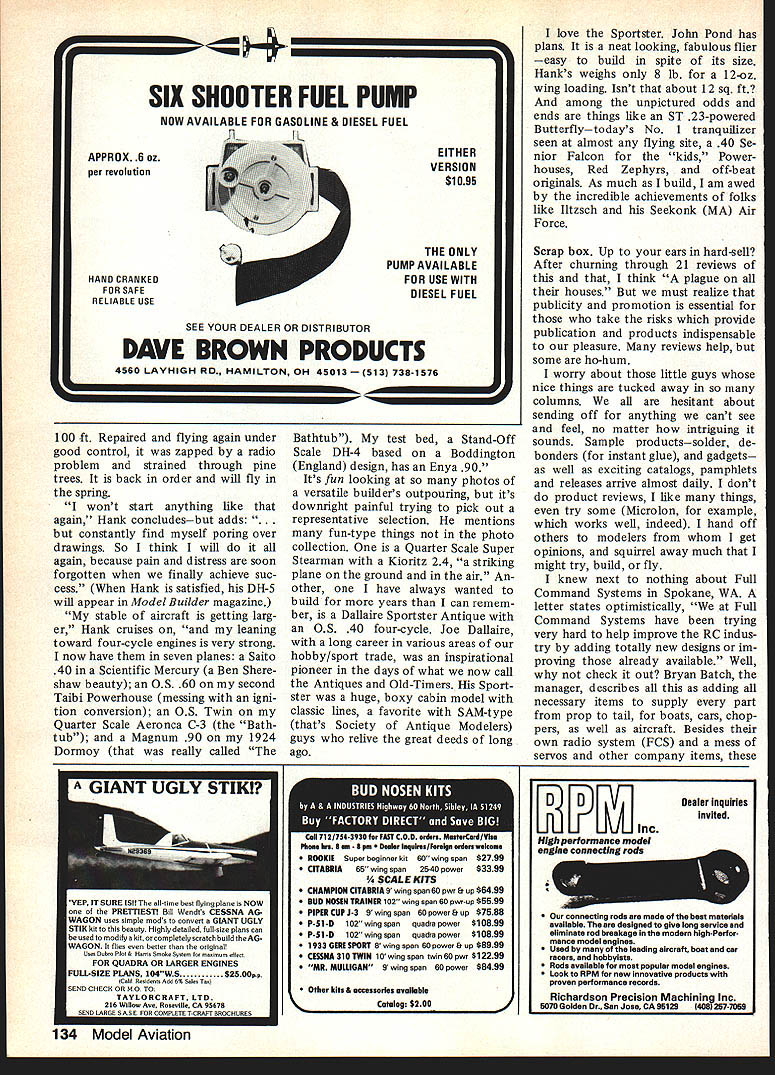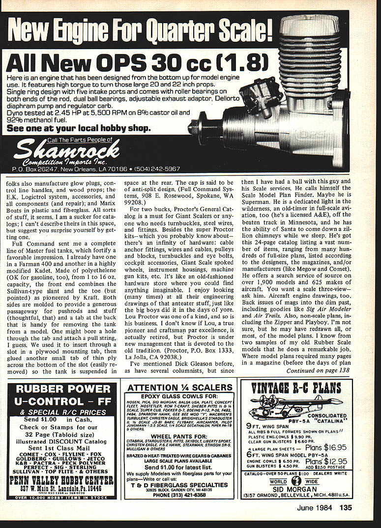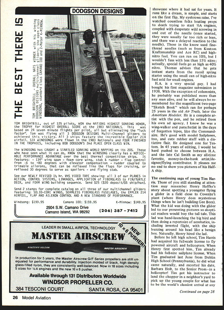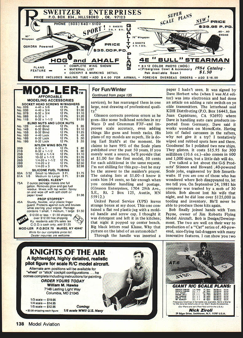 I AM AIRPLANE WATCHER never fail look up passing air craft passing freight trains also count cars colorful place names adorn arent what used Nor passing airplanes very romantic sausage machine grinds out Cessnas Watching models fly never grows bor ing enjoy beauty model itself what gifted stick pusher does fly own like sail high wide disturb little possiblebut alas does have bring closer down turn around like also watch everyones machine its thing youll find another quality comes through realism like models look like full-size ones fly smoothly am moved look-alikes am true scale admire beautiful Scale jobs ground set pieces grand museum fly decently am pleasedbut anti-climactic go bananas other hand over some customized thing says Hey am supposed Zero P-40 Aeronca original cleverly mimics some famous air craft giving up its performance modeL Theme models thats what clever creative approach True scale photo-like painting looser treatment masters brush lets us feel different things dont care struts missing bit dihed ral added sides left Left Bud Chappell about take off World Engines Robinhood Winter has thing Robinhoods what calls theme models sermon month Bill asks distracted fact Buds planes pictures electric-powered Without information might wonder about prop waiting switched Above Would believe two Robinhoods right modified look like Spirit St Louis though yet completed few simple changes standard Robinhood kit perform magic Wide wing struts come will provide dihedral effect Winter turned-on lookalike real Scale model entrances him toowhen its ground Above Left Framed already sporting Williams Bros wheels 600 sq Spirit tips scales 21 oz Note three top pieces running down modified firewall disguise basic Robinhood structure Above Right Two lightweight floats presto Robinhood goes sea standard landing gear used axles slipping through nylon strap fittings float tops rear struts maintain alignment attached fuselage small rubberbands costume change almost easy falling off log Right Buds Robinhood climbs out under power Astro 15 direct drive turning 9-9 prop prefers crisp flying loops stalls spins touch-and-goes etc 4 5-mm run him duration flying has no appeal Winter would use tick-tock four-cycle sized say 10-6 prop big tank shoot fly-bys would never endand would go theme route maybe Ryan Brougham Bellanca Travelair 22 Model Aviation flat simpler means employed quicker perception what respond design ers artistry am touched World Engines Robinhood nonsense suspect John Maloney has world fun playing around Robinhood Lord what ugly Robin some friends say miss point simple fun build flies great know claims kinship Robin Since will fly like cabin model might concoct Id immensely pleased watch high air Robin some nondescript conglomeration wood MonoKote glue 500-mph Jennie gotta tell about Bud Chappell Robinhoods has Robin write home about believe Spirit St Louis resembles no waybut also Robinhood theme model out anoth er theme model really dont wish talk Electrics Buds models happen electric powered Robinhoods glow-engine models sish ignore Buds en ergy source talking theme Lets get Electric background quickly out way approach Electric Bud ex plains give modelers teetering edge tried proven currently avail able group itemskit motor radio prop covering battery etcthat can assembled builders average ex perience get consistent results fol lowing text procedures think thousands people like paid no attention electric power because want airplane look like fuli-size does have hand-launched easy main tain etc until saw article European Electrics did pay atten tion themfor saw June 1984 23 Left Youll relate HA Thomas efficient original AA RC Cox Black Widow 049 6-3 Grish plastic prop 52-in span its exactly big its power Winter says 6-ft version model oldfashioned 19 would cup teaand maybe inboard surfaces could used flaperons Above model uses three-channel EK brick controls Note simple rubberband wing attachment ship flies just lovely looks Above Two kind takes cake left built John Hartsfield finished orange white silver windows HAs right nice shade blue silver wing hori zontal tail surfaces black windows Right Thomas has flying fields everywhere seems flies school yard just block back door various parking lots AA cutie perched tarmac nearby War Memorial Stadium Tim Harris Barbara Holt traveled first class high school Senior Prom Surely youll read text find out what picture about Tims shown column before Left Hank lltzschs Buhi Pup ST 46 prize oldies done radio failure built another hed use 90 fourcycle Winter thinks would fly sedately 40 four-cycle spritely 60 Bill says ask about Buhi Pup plans RC Modeler has 52-in version overkill power OS 25 John Pond has biggie plan Right Dick Sherman Model Museum Plymouth NH visitors welcome storehouse rarities shows off lltzschs donated Bristol Scout Hank has second powered one-jug Tartan Both faithful rare WW factory drawings Cowl available T&D Fiberglass Specialties Plans article March April 1981 MAs Len Hare Quarter Scale DH-5 wings staggered improved pilot visibility has true scale frame authentic coloration Its Quadrapowered Hank says taught him new lessons aerodynamicsmajored twice now flying third time Right Model Builder magazine plans Quarter Scale DH Moth appears grassy fields England First powered Webra 90 now M&M 14 turning 20-6 prop 5800 flies looks like full-size planeand stirring sound Hes now thinking 12 four-cycle varied diversified Scale types planes same vein Bud continues know Cecil Peoli twin-pusher flies never would build because totally unappealing sounds like narrow inflexible attitude simply being selective settling less what have become stand ards imbedded ones mind brisk crisp 4- 5-mm flight packed loops stalls spins touch-and-goes feather-touch landings kind flight seek Height duration extreme others enjoy Chappell did China Clipper December 1983 MA bought two Robinhoods Except dummy front Robin version sug gests OX-S liquid-cooled nose 