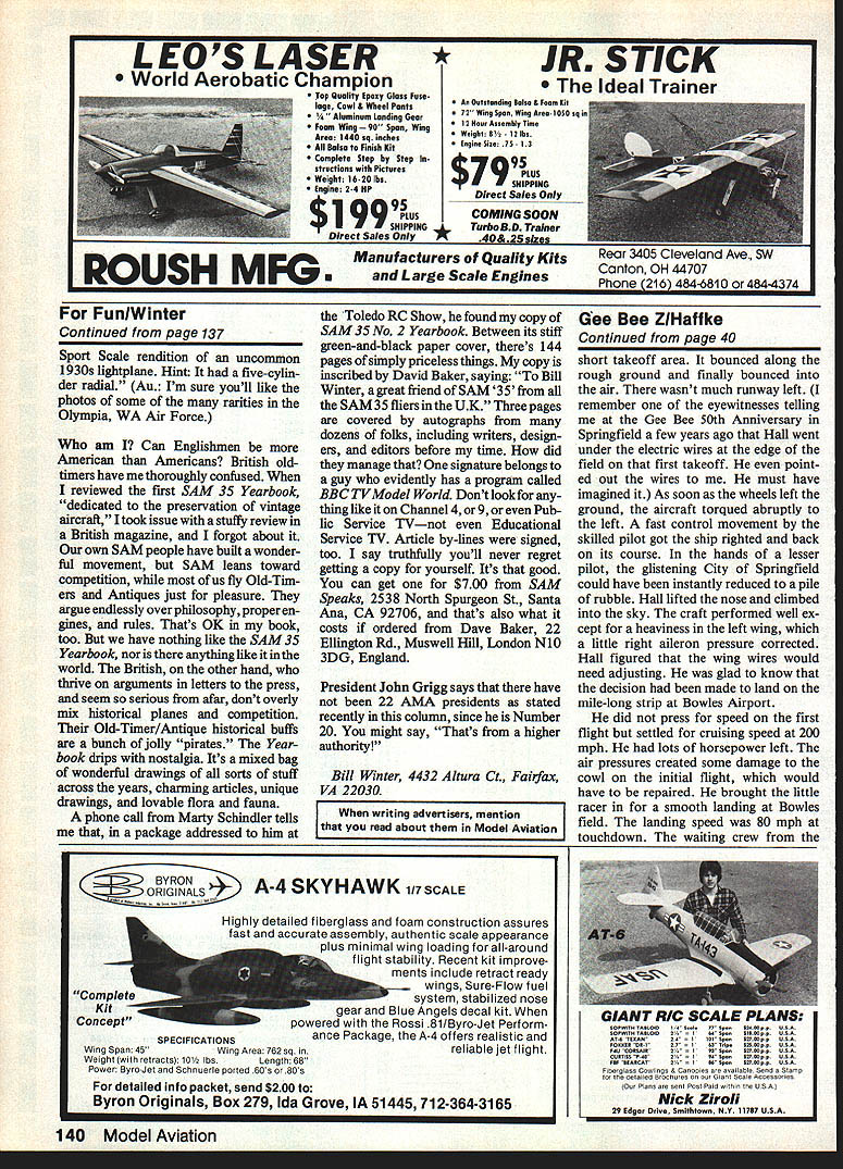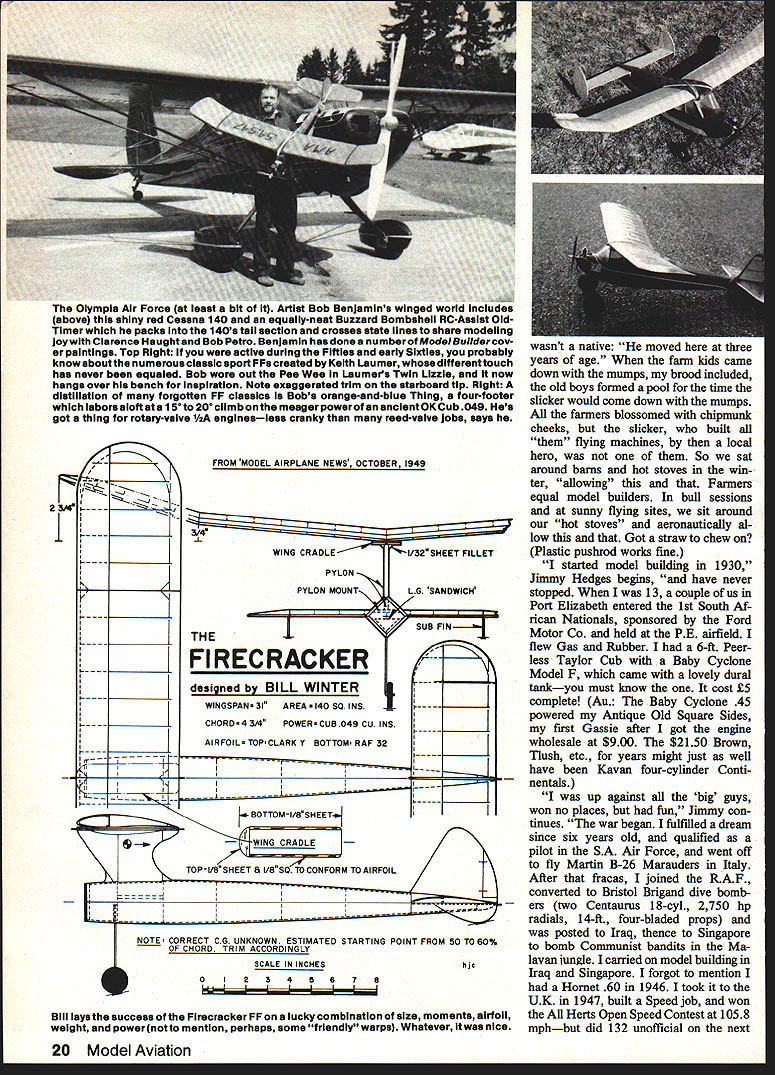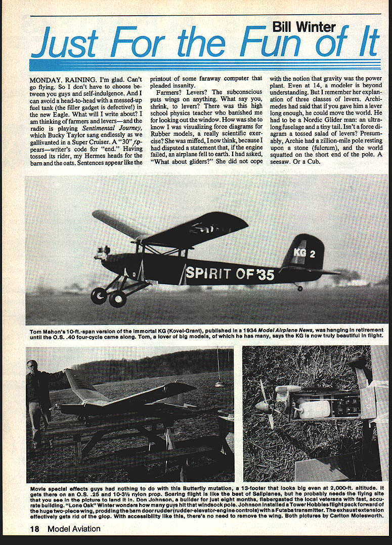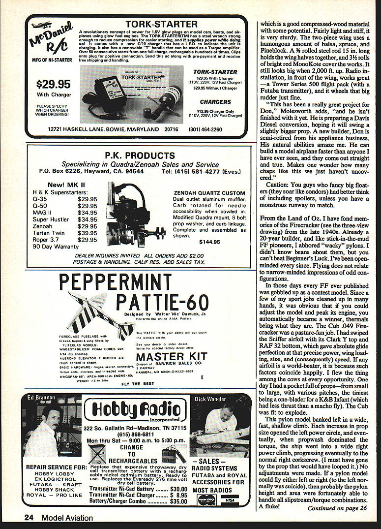 Bill Winter Just For_the Fun MONDAY RAINING Im glad Cant go flying So dont have choose tween guys self-indulgence can avoid head-to-head messed-up fuel tank filler gadget defective new Eagle What will write about am thinking farmers leversand radio playing Sentimental Journey Bucky Taylor sang endlessly gallivanted Super Cruiser pearswriters code end Having tossed its rider Hermes heads barn andthe oats Sentences appear like printout some faraway computer pleaded insanity Farmers Levers subconscious puts wings anything What say shrink levers high school physics teacher banished looking out window know visualizing force diagrams Rubber models really scientific exer cise miffed now think because disputed statement engine failed airplane fell earth asked What about gliders did cope notion gravity power plant 14 modeler beyond understanding remember explan ation three classes levers Archi medes said gave him lever long enough could move world Nordic Glider man ultralong fuselage tiny tail Isnt force di agram tossed salad levers Presum ably Archie zillion-mile pole resting upon stone fulcrum world squatted short end pole seesaw Cub Tom Mahons 1 0-ft-span version Immortal KG Kovei-Grsnt published 1934 ModelAlrplane News hanging retirement until 08 40 four-cycle came along Tom lover big models has says KG now truly beautIful flight Movie special effects guys nothing Butterfly mutation 13-footer looks big 2000-ft altitude gets 08 25 10-3/a nylon prop Soaring flight l like best Sailpianes probably needs flying site see picture land Don Johnson builder just eight months fiabergasted local vetemna fast accu rste building Lone Oak Winter wonders guys hitthet windsock pole Johnson Installed aTower Hobbiesfllght packforward huge two-piece wing prodding barn door rudderrudderlevator-englne controls Futaba trenemitter exhaust extension effectively gets rid giop accessibility like thems no need remove wing Both pictures Canton Moiesworth 18 Model Aviation Its merely setup conventional aircraft center lift CL bit aft center gravity CG stab exerting its downward force Archie end infinite pole keeps whole shooting match equilibrium what about FF models Rubber Gas Gilder etc incorporate lift airfoiled stab locate CG tween CL both wing taillike 75 100% wing chord No modelers arent unique ap proach canard tail-first must does same thing since its CG must forward center aerodynamic lift entire aircraft puts between CL wing tail Consider Burt Rutan super-efficient aircraft get Archie think now wheelbar row Incidentally Dec Mathews tells Rutan won Jr-Sr Cargo 1960 Dallas Nats noble concept coming apart seams wheel fulcrum load middle force guy prying handles upward plane cant fly way Maybe action reac tion wheel fulcrum must fulcrum perhaps load middle back Free Flight Suspend levers air would take Einstein pinpoint fulcrum Confused Good equally Websters New Collegiate Dictionary describes three levers case cant sleep Ijust phoned scientist/modeler did nt know three classes leversstoneage stuff computer age said cant B forces applied whereever must equal load level flight C what about wedge piqued physics teacher said inclined plane screw inclined plane Are now talking about props Draw tri angle base representing distance traveled forward prop tip revolution back wedges inclined planes Before 10000 aerodynamicists rush forward pull out tar pit lets switch farmers Im city slicker Id prefer farm er dont like work town gentleman er county pa per ran obituary guy lived 93 years said course PLYWOOD Bill Winter keeps moanin about -Scale Piper vagabond stored Norm Rosenstocks car barn 200 miles away 18 ib 08 90 what Biil wanted forthe per formance visualizes Biii says hes turned timid think jurys stili out Vag looks simpie form Winter says its devilish strange some respects4 negative stab wing flat huge twist including ailerons Bill claims probably arent true-scale model Vags CG way way forward Figured out SeDtember 1984 19 Beneath surface attractive bipiane iurksan Eaglet John Hunton performed aichemywith further modsto Screamin Eaglet featured MA last month says reminds him Wacos et al supplies sketches below reveal secrets Natch flies well Effective gap plenty stagger smaller span/chord bottom wing easy-attach I-struts pragmatic solution quickie bipe conversion avoids normal fuselage cabanes cutting saddle too-slim fuselage text Olympia u ~ uuiujamins wingeu above suuny u mud equally-neat Buzzard Bombshell RC-Assist OldTimer packs rnu stall section crosses state lines share modeling joywith Clarence Haught Bou retro Benjamin has done numberofModelBulldercov er paintings Top Right active during Fifties early Sixties probably know about numerous classic sport FFs created Keith Laumer whosedifferenttouch has never equaled Bob wore out Pee Wee Laumers Twin Lizzie now hangs over bench inspiration Note exaggerated trim starboard tip Right distiliation forgotten FF classics Bobs orange-and-biue Thing four-footer isbors aloft ate 150 20 climb meager powerof ancientOK Cub 049 Hes got thing rotary-valve 1/2A enginesless cranky reed-valve jobs says FROM MODEL AIRPLANE NEWS OCTOBER 1949 344 WING CRADLE~ PYLON PYLON MOUNTN THEI FIRECRACKER designed BILL WINTER WINGSPAN 31 AREA140 SO INS 4 CHORD43/4POWERCUB049 CU INS AIRFOIL TOP CLARK Y BOTTOM RAF 32 II __ 4--___WING CRADLE TOP-I/8SHEET 1/850 TO CONFORM TOAIRFOIL irz T FILLET L G SANDWICH SUB FIN II NOTE CORRECT CG UNKNOWN ESTIMATED STARTING POINT FROM 50 TO 60% OF CHORD TRIM ACCORDINGLY SCALE IN INCHES OI2345 57S Julliii Bili lays success Firecracker FF lucky combination size moments airfoil weight powernotto mention perhaps some friendly warps Whatever nice wasnt native moved turee years age farm kids came down mumps brood included old boys formed pool time slicker would come down mumps farmers blossomed chipmunk cheeks slicker built flying machines local hero So sat around barns hot stoves win ter allowing Farmers equal model builders bull sessions sunny flying sites sit around
