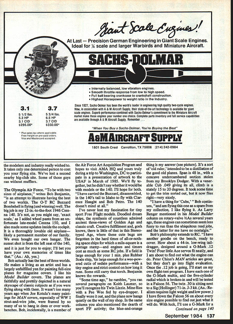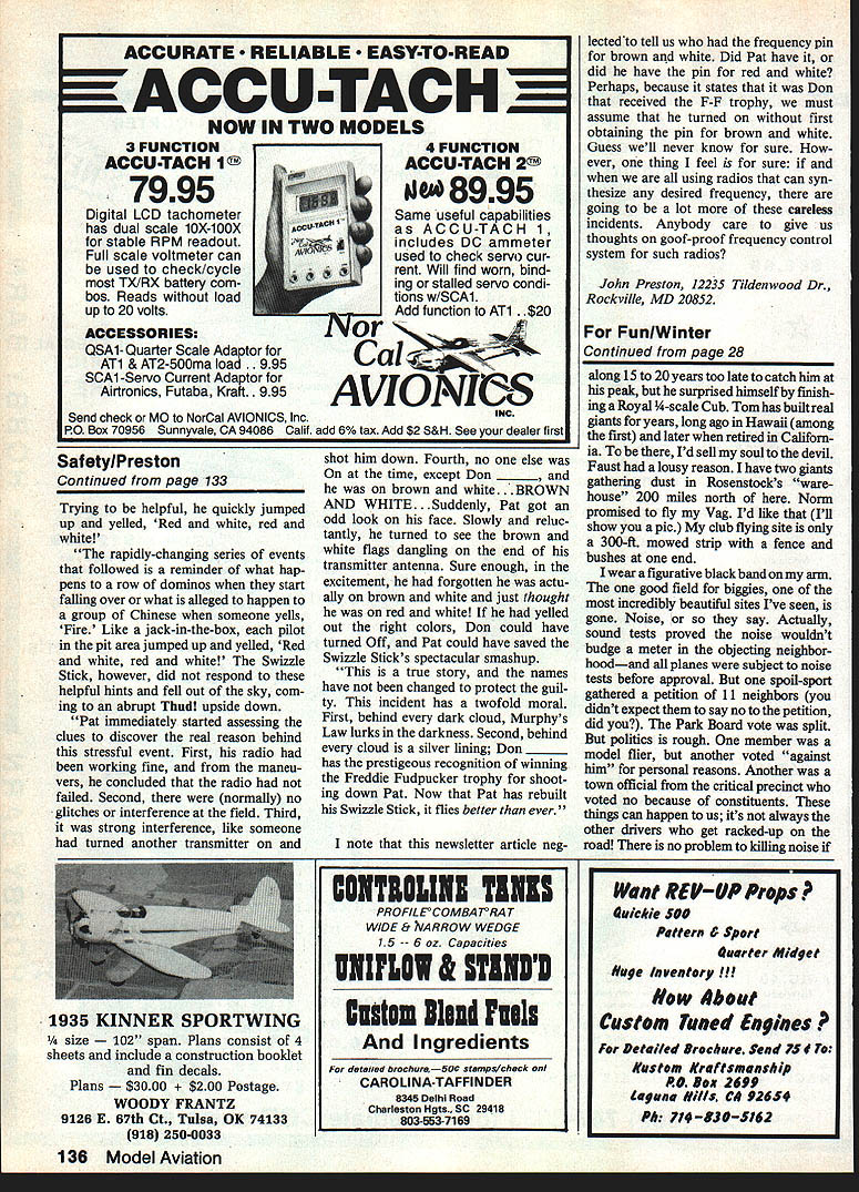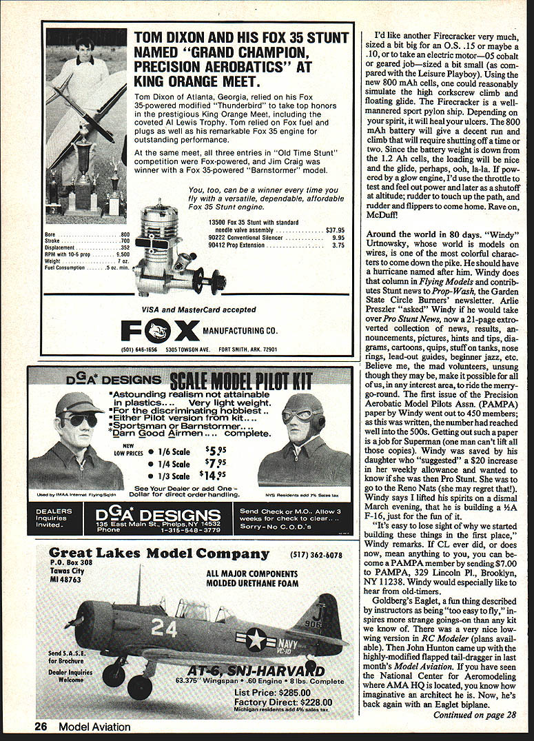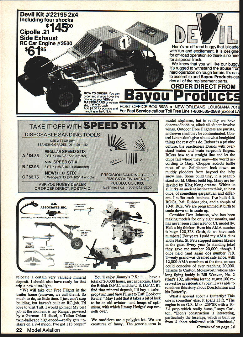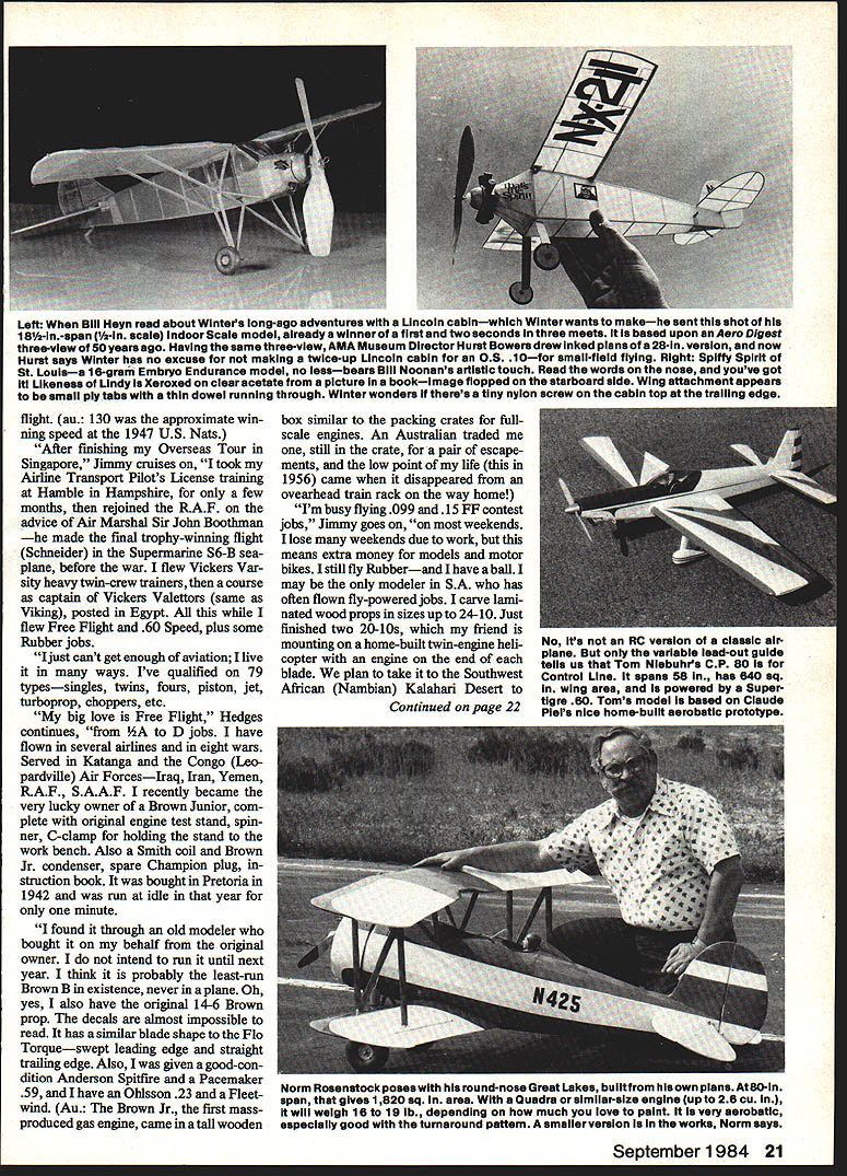 Bill Winter Just For_the Fun MONDAY RAINING Im glad Cant go flying So dont have choose tween guys self-indulgence can avoid head-to-head messed-up fuel tank filler gadget defective new Eagle What will write about am thinking farmers leversand radio playing Sentimental Journey Bucky Taylor sang endlessly gallivanted Super Cruiser pearswriters code end Having tossed its rider Hermes heads barn andthe oats Sentences appear like printout some faraway computer pleaded insanity Farmers Levers subconscious puts wings anything What say shrink levers high school physics teacher banished looking out window know visualizing force diagrams Rubber models really scientific exer cise miffed now think because disputed statement engine failed airplane fell earth asked What about gliders did cope notion gravity power plant 14 modeler beyond understanding remember explan ation three classes levers Archi medes said gave him lever long enough could move world Nordic Glider man ultralong fuselage tiny tail Isnt force di agram tossed salad levers Presum ably Archie zillion-mile pole resting upon stone fulcrum world squatted short end pole seesaw Cub Tom Mahons 1 0-ft-span version Immortal KG Kovei-Grsnt published 1934 ModelAlrplane News hanging retirement until 08 40 four-cycle came along Tom lover big models has says KG now truly beautIful flight Movie special effects guys nothing Butterfly mutation 13-footer looks big 2000-ft altitude gets 08 25 10-3/a nylon prop Soaring flight l like best Sailpianes probably needs flying site see picture land Don Johnson builder just eight months fiabergasted local vetemna fast accu rste building Lone Oak Winter wonders guys hitthet windsock pole Johnson Installed aTower Hobbiesfllght packforward huge two-piece wing prodding barn door rudderrudderlevator-englne controls Futaba trenemitter exhaust extension effectively gets rid giop accessibility like thems no need remove wing Both pictures Canton Moiesworth 18 Model Aviation Its merely setup conventional aircraft center lift CL bit aft center gravity CG stab exerting its downward force Archie end infinite pole keeps whole shooting match equilibrium what about FF models Rubber Gas Gilder etc incorporate lift airfoiled stab locate CG tween CL both wing taillike 75 100% wing chord No modelers arent unique ap proach canard tail-first must does same thing since its CG must forward center aerodynamic lift entire aircraft puts between CL wing tail Consider Burt Rutan super-efficient aircraft get Archie think now wheelbar row Incidentally Dec Mathews tells Rutan won Jr-Sr Cargo 1960 Dallas Nats noble concept coming apart seams wheel fulcrum load middle force guy prying handles upward plane cant fly way Maybe action reac tion wheel fulcrum must fulcrum perhaps load middle back Free Flight Suspend levers air would take Einstein pinpoint fulcrum Confused Good equally Websters New Collegiate Dictionary describes three levers case cant sleep Ijust phoned scientist/modeler did nt know three classes leversstoneage stuff computer age said cant B forces applied whereever must equal load level flight C what about wedge piqued physics teacher said inclined plane screw inclined plane Are now talking about props Draw tri angle base representing distance traveled forward prop tip revolution back wedges inclined planes Before 10000 aerodynamicists rush forward pull out tar pit lets switch farmers Im city slicker Id prefer farm er dont like work town gentleman er county pa per ran obituary guy lived 93 years said course PLYWOOD Bill Winter keeps moanin about -Scale Piper vagabond stored Norm Rosenstocks car barn 200 miles away 18 ib 08 90 what Biil wanted forthe per formance visualizes Biii says hes turned timid think jurys stili out Vag looks simpie form Winter says its devilish strange some respects4 negative stab wing flat huge twist including ailerons Bill claims probably arent true-scale model Vags CG way way forward Figured out SeDtember 1984 19 Beneath surface attractive bipiane iurksan Eaglet John Hunton performed aichemywith further modsto Screamin Eaglet featured MA last month says reminds him Wacos et al supplies sketches below reveal secrets Natch flies well Effective gap plenty stagger smaller span/chord bottom wing easy-attach I-struts pragmatic solution quickie bipe conversion avoids normal fuselage cabanes cutting saddle too-slim fuselage text Olympia u ~ uuiujamins wingeu above suuny u mud equally-neat Buzzard Bombshell RC-Assist OldTimer packs rnu stall section crosses state lines share modeling joywith Clarence Haught Bou retro Benjamin has done numberofModelBulldercov er paintings Top Right active during Fifties early Sixties probably know about numerous classic sport FFs created Keith Laumer whosedifferenttouch has never equaled Bob wore out Pee Wee Laumers Twin Lizzie now hangs over bench inspiration Note exaggerated trim starboard tip Right distiliation forgotten FF classics Bobs orange-and-biue Thing four-footer isbors aloft ate 150 20 climb meager powerof ancientOK Cub 049 Hes got thing rotary-valve 1/2A enginesless cranky reed-valve jobs says FROM MODEL AIRPLANE NEWS OCTOBER 1949 344 WING CRADLE~ PYLON PYLON MOUNTN THEI FIRECRACKER designed BILL WINTER WINGSPAN 31 AREA140 SO INS 4 CHORD43/4POWERCUB049 CU INS AIRFOIL TOP CLARK Y BOTTOM RAF 32 II __ 4--___WING CRADLE TOP-I/8SHEET 1/850 TO CONFORM TOAIRFOIL irz T FILLET L G SANDWICH SUB FIN II NOTE CORRECT CG UNKNOWN ESTIMATED STARTING POINT FROM 50 TO 60% OF CHORD TRIM ACCORDINGLY SCALE IN INCHES OI2345 57S Julliii Bili lays success Firecracker FF lucky combination size moments airfoil weight powernotto mention perhaps some friendly warps Whatever nice wasnt native moved turee years age farm kids came down mumps brood included old boys formed pool time slicker would come down mumps farmers blossomed chipmunk cheeks slicker built flying machines local hero So sat around barns hot stoves win ter allowing Farmers equal model builders bull sessions sunny flying sites sit around