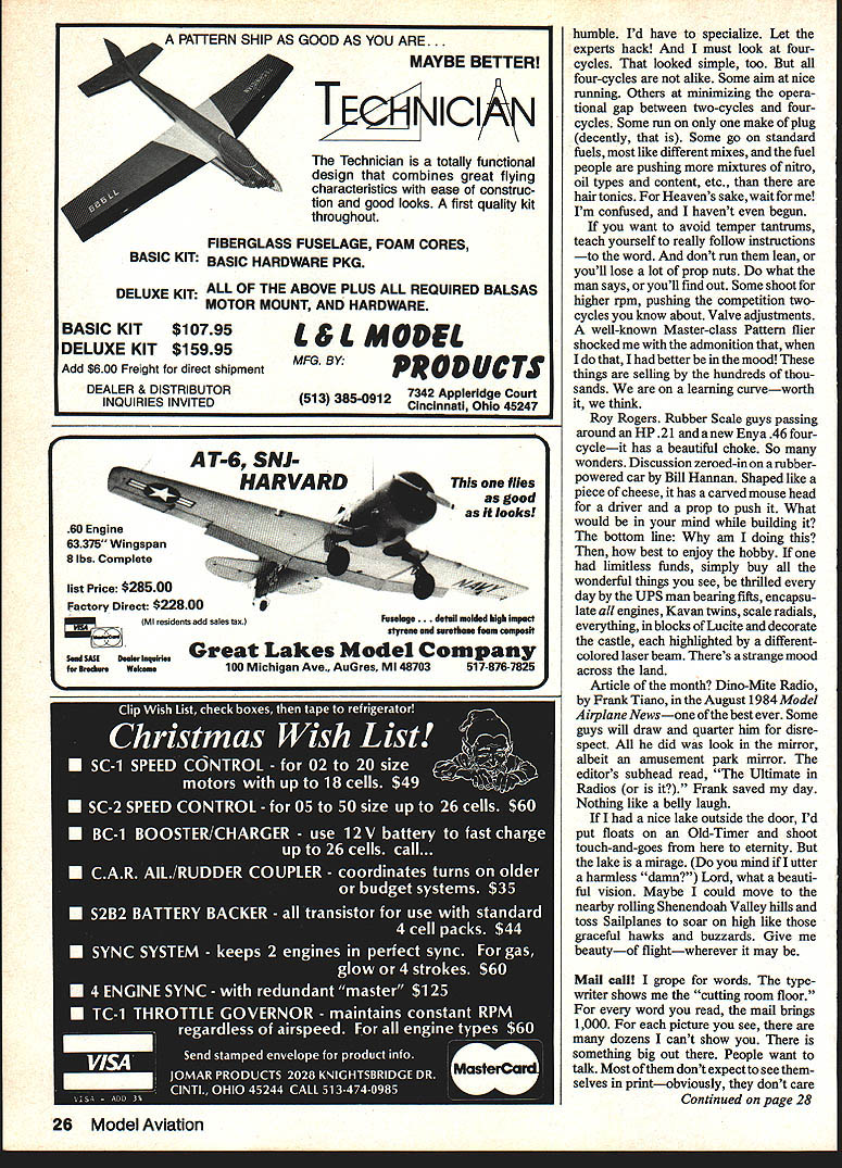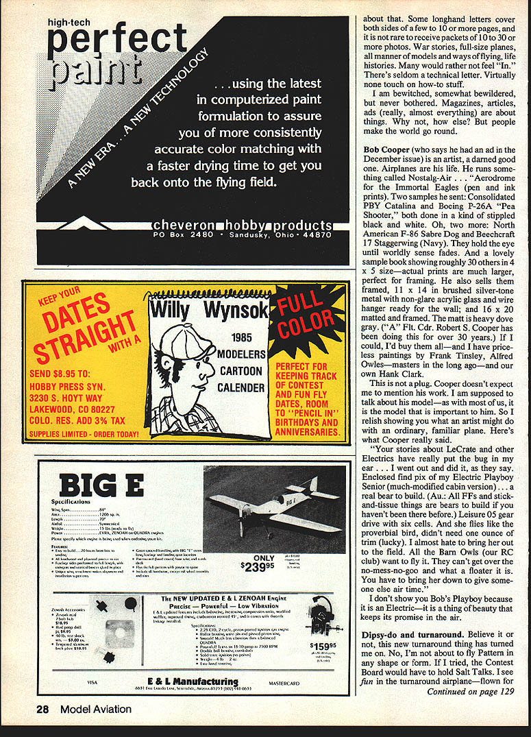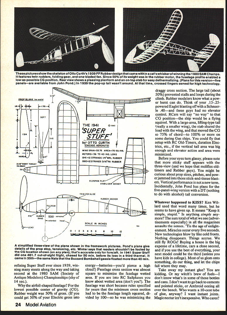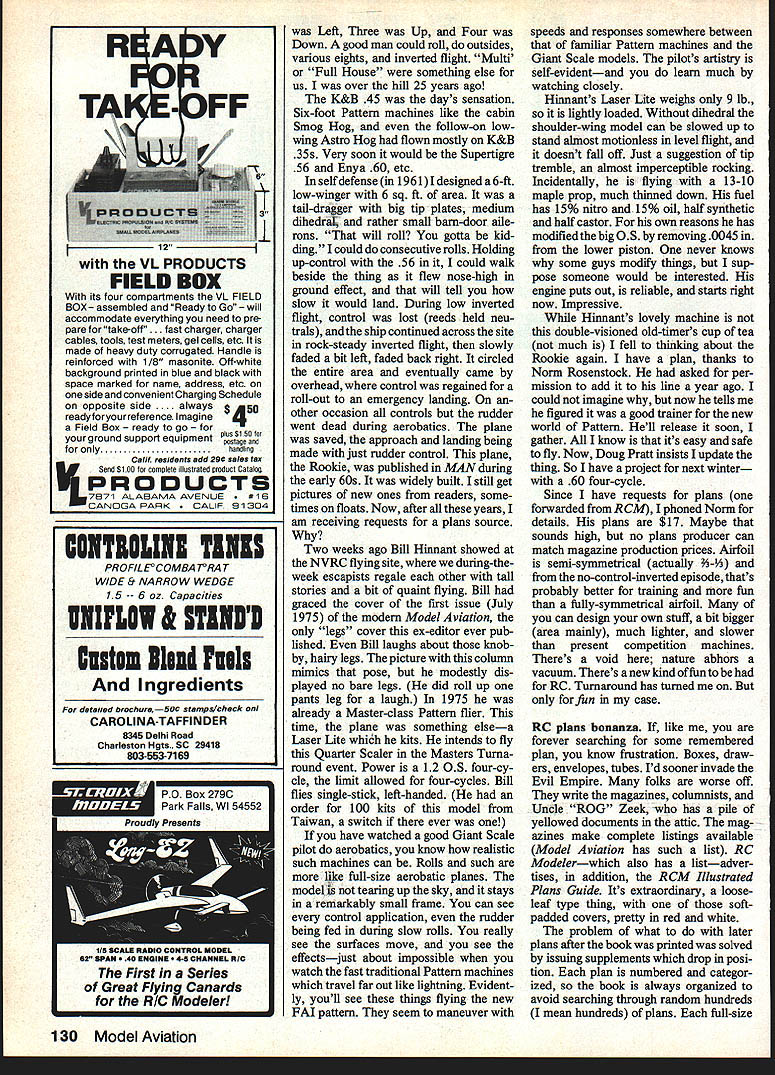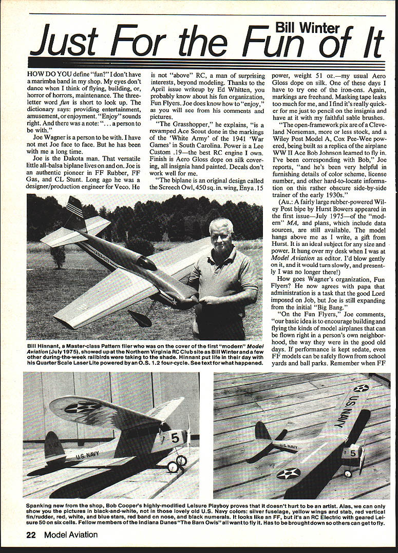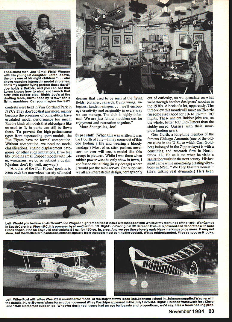 Bill Winter Just Fun o t ______[I HOW DO YOU define fun dont have marimba band shop eyes dont dance think flying building horror horrors maintenance threeletter word fun short look up dictionary says providing entertainment amusement enjoyment Enjoy sounds right note rson Joe Wagner person have met Joe face face has long time Joe Dakota man versatile little all-balsa biplane lives on Joe authentic pioneer FF Rubber FF Gas CL Stunt Long ago designer/production engineer Veco above RC man surprising interests beyond modeling Thanks April issue writeup Ed Whitten probably know about fun organization Fun Flyers Joe does know enjoy~ will see comments pictures Grasshopper explains revamped Ace Scout done markings White Army 1941 War Games South Carolina Power Lee Custom 19the best RC engine own Finish Aero Gloss dope silk cover ing insignia hand painted Decals dont work well biplane original design called Screech Owl 450 sq wing Enya 15 power weight 51 ozmy usual Aero Gloss dope silk days have try iron-ons Again markings freehand Masking tape leaks too much find its really quick er just pencil insignia have faithful sable brushes open-framework pix Cleve land Norseman less stock Wiley Post Model Cox Pee-Wee pow ered being built replica airplane WW II Ace Bob Johnson learned fly Ive corresponding Bob Joe reports hes very helpful furnishing details color scheme license number other hard-to-locate informa tion rather obscure side-by-side trainer early 1930s Au fairly large rubber-powered Wil ey Post bipe Hurst Bowers appeared first issueJuly 1975of mod ern MA plans include data sources still available model hangs above write gift Hurst ideal subject size power hung over desk Model Aviation editor Id blow gently it would turn slowly present ly no longer goes Wagners organization Fun Flyers now agrees papa administration task good Lord imposed Job Joe still expanding initial Big Bang Fun Flyers Joe comments basic idea encourage building flying kinds model airplanes can flown right persons own neighbor hood way good old days performance kept sedate FF models can safely flown school yards ball parks Remember FF Spanking new shop Bob Coopers hlghly-modif led Leisure Playboy proves doesnt hurt artist Alas wecan show pictures black-and-white lovely old US Navy colors silver fuselage yellow wings stab red vertical fin/rudder red white blue stars red band nose black numerals looks like FF its RC Electric geared Lei sure 50 six cells Fellow members Indiana Dunes Barn Owls want fly Has brought down others can get fly 22 Model Aviation Bill Hinnant Master-class Pattern flier cover first modern Model Aviation July1975 showed up atthe Northern Virginia RC Club site Bill Winter few other during-the-week railbirds taking shade Hinnant put life day Quarter Scale Laser Lite powered byan 0S 12 four-cycle See text what happened contests held Van Cortland Park NYC dont mainly because pressures competition have escalated model performance too much kinds models old codgers like us used fly parks can still flown prevent high-performance types superseding sport models Fun Flyers have no formal competition Without competition need no model classifications engine displacement cate gories other such limitations feel like building small Rubber models 14in wingspans quahn Qualms dont fly well anyway Another Fun Flyers goals bring back marvelous variety model designs used seen flying fields biplanes canards flying wings au togiros tandem-wingers. well encour age creativity originality way can manage club highly infor mal just fellow modelers out enjoyment recreation together Shangri-las Joe Super stuff written Fourth JulyI may come out tooting fife wearing bloody bandage Most us stick pushers never saw ever will see model like except pictures rubber power show town confess visualizing dotage would put mini servos supposes interested design perhaps out curiosity speculate what went through hotshot designers noodles 1 930s heck lot apparently three-view month will make Electric some size good 10- 15-nun RC flights ancient Rubber jobs whole better RC Old-Timers stubby-nosed Gassies snow plow landing gears Otto Curth long-time member famous Chicago Aeronuts old est clubs US Carl Gold berg belonged Zipper days consulting research firm Northbrook IL calls visits sanitation works next county last input came monitoring blasting vibra tions NYC keep blasters honest Hes talking real dynamite Hes Left Would believe Air Scout Joe Wagner highly modified Grasshopper White Army markings 1941 War Games South Carolina Flown RC powered bya Lee Custom 19 Right Joesoriginal RC Screech Owlsllkcovered decorated Aero Gloss dopes Has Enya 15 weighs 51 oz 450 sq area see lovely early Navy markings once may show vertical whip antenna extends upward radio mast behind cockpit Wings rubberbanded Flies good looks Left Wiley Post Pee Wee 02 authentic model ship WW Il ace Bob Johnson soloed Johnson supplied wagnerwin details Hurst Bowers plans rubber-powered Wiley Post bipe appeared July1975 MA Right Finished framework fora Cleve land 1940 Norseman rubber job Whoever designed sure eye beauty proportions wed say Has freewheeling prop November 1984 23 Dakota man Joe Small Field Wagner youngest daughter Loren above eight children. shows genuine interest model airplanes shes regular flying partner days Joe holds Dakota can bet Loren knows wind launch nitty little rubber bipe Right Joes drafting table surrounded few flying machines Can imagine rest aa piusuruaanuw EIIU aiuirnun u Luui a r uuslgn uatuairawu,n urn awnialwrut winning 9ouRm Lnampu features twin rudders folding gear one-blausa Tan oincu 50% Its weight rubber motor fuselage profile enabled low-as-possible CG position Rear view shows pleasing planform on-top stab easy dethermalizing Plans versionfive panelsare available John Pond 1939 pop-up tall wasnt around time crossed fingers served high technology THE 1941nisBo SUPER 3STUFF 1/2by OTTO CURTH LiCHICAGO AERONUTSf7] WING SPAN3375 AREAIO SO INS MOTORS 36