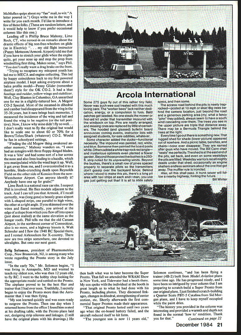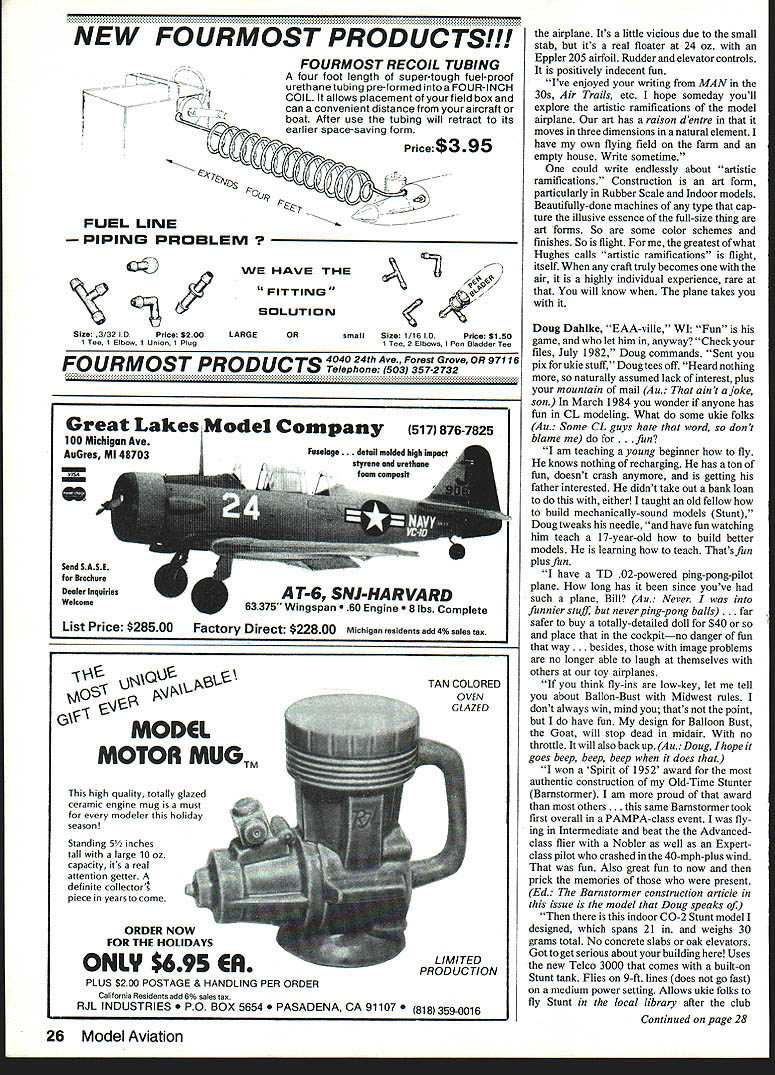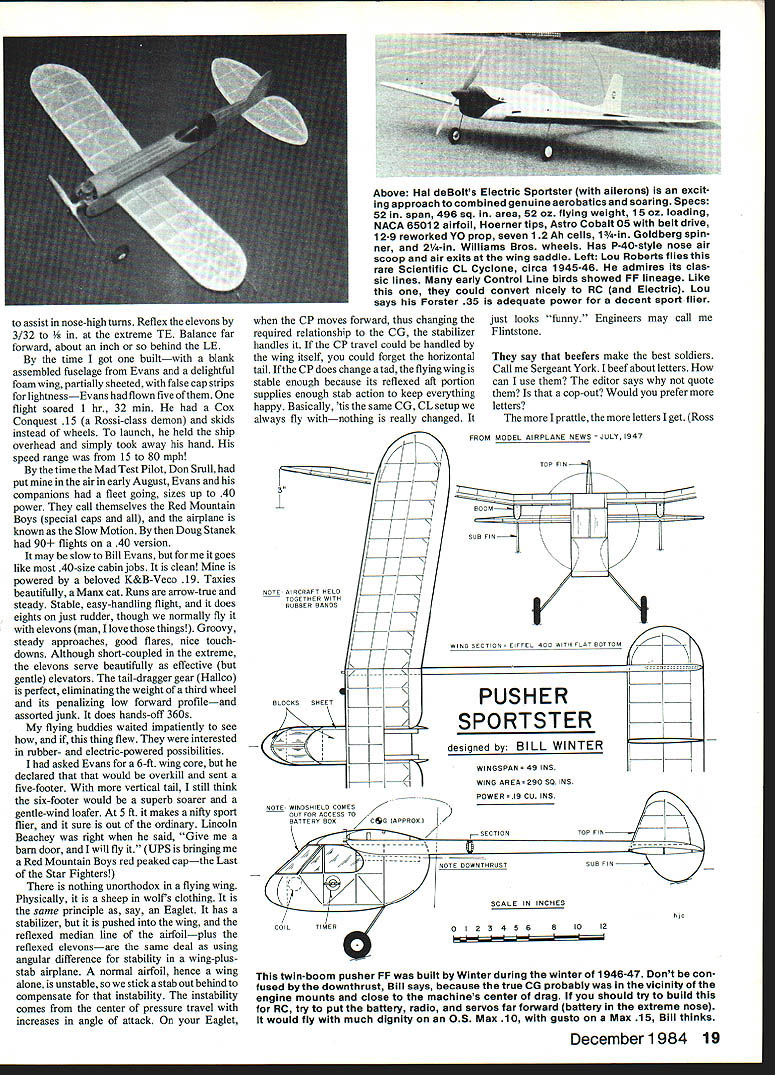 Bill Winter Just Fun t fi FOR GUY never builds planes appear nowhere keep getting water Gremlins have crazy airplane another new spite draconian efforts get rid old ones todays radios never seem totally crash anything dont deserve such luck rafters filled dust gatherers heirlooms hardy attic trunks did take saw cardboard monster loomed like dinosaur Museum Naturai History dish out airplanes helpless victims Nondescript va grants scattered New England two beyond Mississippi Some gather dust other guys rafters some sail like Flying Dutchman Three actively flown over 20 years old cant take cannibaiized radio adds hulk graveyard ships Ever meet yourself coming going Sunday afternoon Bloody April club site few us threaded back roads tiny rough strip set middle huge field waving long grass wheat-like flew unlikely mixed bag Gas Electric planes mind can imagine generai lend-lease operation barn stormers have failen things get passed aroundplanes engines ra dios some poor things dont know belong Cruising around lazy flight flaps down Eagle watched Krack eliac flashing underneath back forth Far above whining steadily own LeCrate Electric Other planes sat waiting fly Can imaglne three models flying together get pleasure seeing others fly stuff flying myself get invited occasionally try sticks learn far watching flying design flight characteristics bag Literally hundreds flights have made plane before note myriad subtle things good bad may visible just session observing good man pilot planes thing understood anything bites dust thats way cookie crumbles Now about new crazy airplane Know what Simitar some years head MA plans sale Simitar first Star Wars madness series Bill Evans Simitar weird flying wing highly aerobatic flies fastlike bomb flat wing has straight leading edge LE swept-forward trailing edge TE trun cated fuselagechopped off TE elevons its low wingsticking out well forward tractor englne nose strike gear last airplane world would build could never handie like fool dashed angels fear tread needled Bill Evans quip slow enough Id consider flying What want asked Feeling hot breath devil neck gave him list impossible requirements bigger wing much reduced loading low power ability fly hands-off either three four channels would have soar greatest ease Also wanted stable groovy flight rudder-only too asked him make tail-dragger could taxied tipping over thought would go away Sketches flew back forth Odd problems arose Dihedral necessary put twist reflex airfoil youll find reflex Simitar draw median line airfoil What about hands-off stability 360soaring know no spiraling-down rudder control Extend fuselage aft lower billboard-size vertical tail Simitar actually Simitar Deuce move back fuselage extended 8 aft rudder TE Lower aft profile raise forward profile add good-sized canopy far forward Left Don SruIl mad test pilot always gets first try Winters crazy creations sets tfle idle Tor simitar slow Motion unaer Bills watchful gaze Winter cajoled Bill Evans designing saying hed make light could soar fly three four channels rudder alone too have trike baloney Note elevons reflexed 3/32 lengthened fuselage lower vertical tall higher nose forward canopy profiles dihedral East Coast version elevons short full span Right Could tail-dragger Simitar Slow Motion taxi Would nose over Ground handling proved perfect crew taxied out Secret wings Evans airfoil far forward high point reflexed median line Balance point about Inch behind LE first half-speed taxi run looked good Srull lifted off perfect flightincluding high-power rudder turns slow-flight flybys loop K&B Veco 19 venturi came loose Srull made successful dead-stick landing weeds Far easier twas said aileron trainers Has hands-oft stability Pictures first flight sequenced show lift-off holding slight back pressure climb-out slow-flight flyby high-speed flyby hands-off groove mild problem seems odd pilot see plane air stabilizer about ship text photos Tom Schmitt 18 ModelAviation assist nose-high turns Reflex elevons 3/32 i extreme TE Balance far forward about inch behind LE time got builtwith blank assembled fuselage Evans delightful foam wing partially sheeted false cap strips lightnessEvans flown five ofthem flight soared 1 hr 32 mm Cox Conquest 15 Rossi-class demon skids instead wheels launch held ship overhead simply took away hand speed range 15 80 mph time Mad Test Pilot Don Srull put air early August Evans companions fleet going sizes up 40 power call themselves Red Mountain Boys special caps and airplane known Slow Motion Doug Stanek 90 flights 40 version may slow Bill Evans goes like 40-size cabin jobs clean Mine powered beloved K&B-Veco 19 Taxies beautifully Manx cat Runs arrow-true steady Stable easy-handling flight does eights just rudder though normally fly elevons man love things Groovy steady approaches good flares nice touch downs Although short-coupled extreme elevons serve beautifully effective gentle elevators tail-dragger gear Hallco perfect eliminating weight third wheel its penalizing low forward profileand assorted junk does hands-off 360s flying buddies waited impatiently see thing flew interested rubber- electric-powered possibilities asked Evans 6-ft wing core declared that would overkill sent five-footer vertical tail still think six-footer would superb soarer gentle-wind loafer 5 ft makes nifty sport flier sure out ordinary Lincoln Beachey right said Give barn door will fly UPS bringing Red Mountain Boys red peaked capthe Last Star Fighters nothing unorthodox flying wing Physically sheep wolf s clothing same principle say Eaglet has stabilizer pushed wing reflexed median line airfoilplus reflexed elevonsare same deal using angular difference stability wing-plusstab airplane normal airfoil hence wing alone unstable stick stab out behind compensate instability instability comes center pressure travel increases angle attack Eaglet CP moves forward thus changlng required relationship CG stabilizer handles CP travel could handl