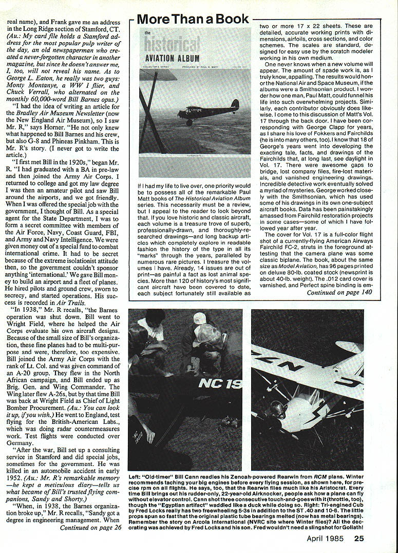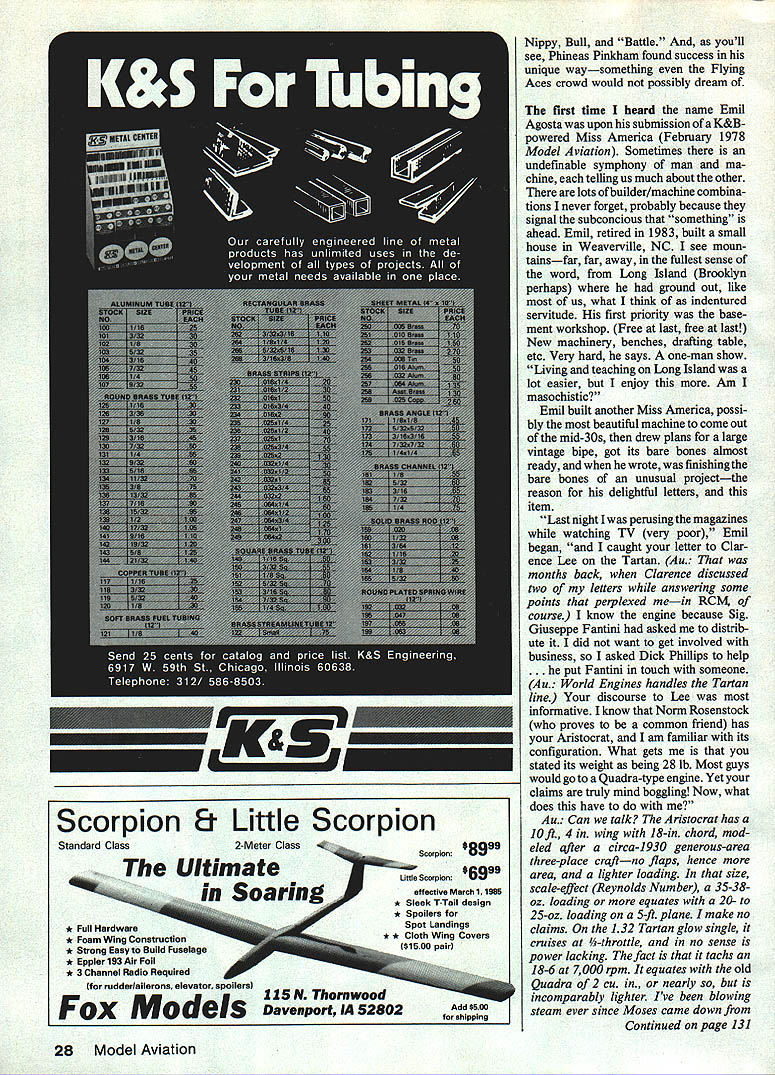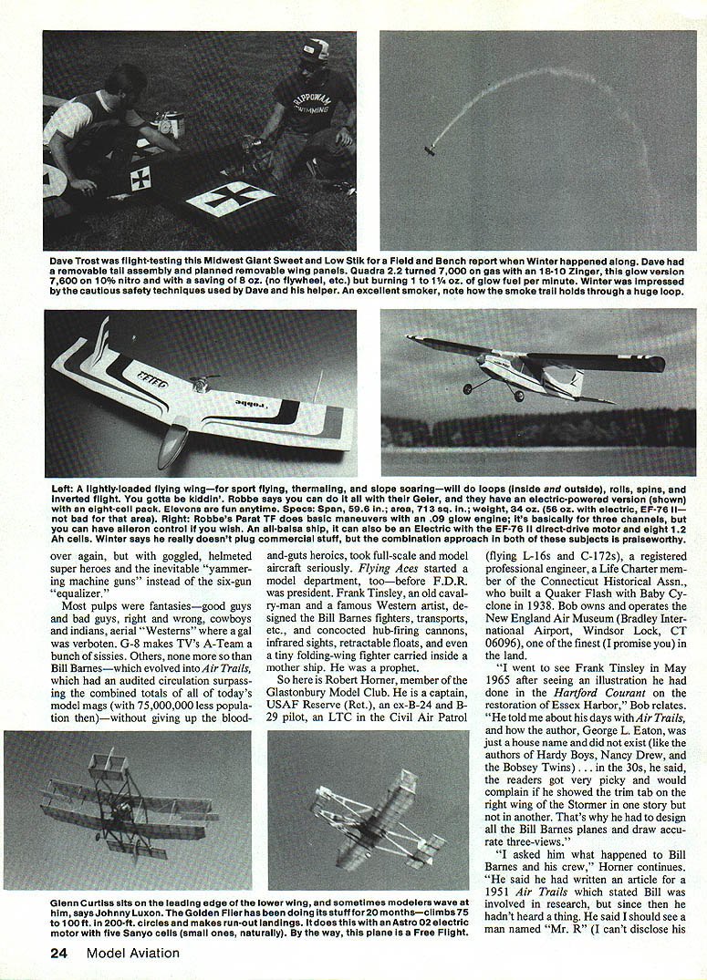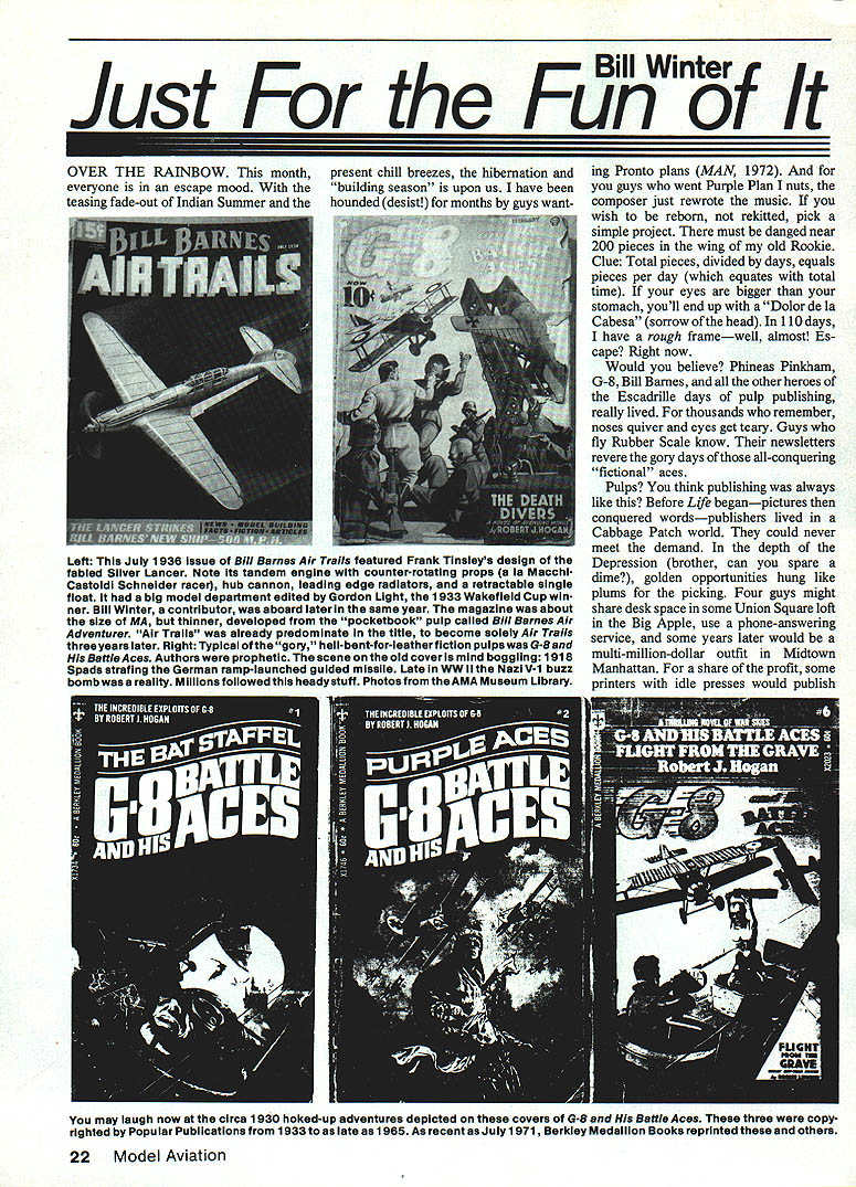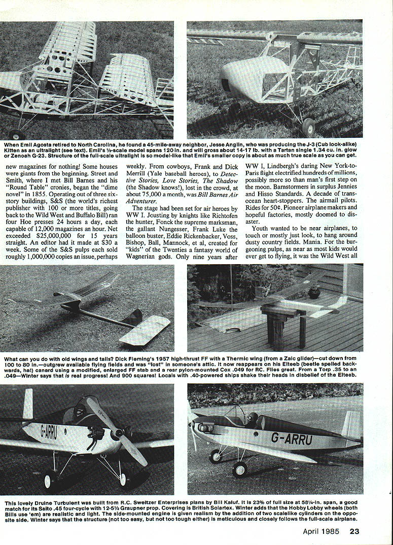 Bill Winter [I Just Fun t OVER THE RAINBOW month everyone escape mood teasing fade-out Indian Summer present chill breezes hibernation building season upon us have hounded desist months guys wanting Pronto plans MAN 1972 guys went Purple Plan nuts composer just rewrote music wish reborn rekitted pick simple project must danged near 200 pieces wing old Rookie Clue Total pieces divided days equals pieces per day equates total time eyes bigger stomach youll end up Dolor de la Cabesa sorrow head 110 days have rough framewell almost Es cape Right now Would believe Phineas Pinkham G-8 Bill Barnes other heroes Escadrille days pulp publishing really lived thousands remember noses quiver eyes get teary Guys fly Rubber Scale know newsletters revere gory days all-conquering fictional aces Pulps think publishing always like Before Lfe beganpictures conquered wordspublishers lived Cabbage Patch world could never meet demand depth Depression brother can spare dime golden opportunities hung like plums picking Four guys might share desk space some Union Square loft Big Apple use phone-answering service some years later would multi-million-dollar outfit Midtown Manhattan share profit some printers idle presses would publish 22 Model Aviation Left This July 1936 Issue Bill Barnes Air Trails featured Frank Tinsleys design fabled Silver Lancer Note its tandem engine counter-rotating props Macchi Castoidi Schneider racer hub cannon icading edge radiators retractable single float big model department edited Gordon Light 1933 Wakefield Cup win ner Bill Winter contributor aboard later same year magazine about size MA thinner developed pocketbook pulp called Bill Barnes Air Adventurer Air Trails already predominate title become solely Air Trails threeyears later Right Typical gory heil-bent-for-leatherfiction pulpa G-8 Battle Aces Authors prophetic scene old cover mind boggling 1918 Spads strafing German ramp-launched guided missile Late WW lithe Nazi V-i buzz bomb reality Millions followed headystuff Photos theAMA Museum Library may laugh now circa 1930 hoked-up adventures depicted covers G-B Baffle Aces three copy righted Popular Publications 1933 late 1965 As recent July1971 Berkley Medallion Books reprinted others new magazines nothing Some houses giants beginning Street Smith met Bill Barnes Round Table cronies began dime novel 1855 Operating out three sixstory buildings S&S worlds richest publisher 100 titles going back Wild West Buffalo Bill ran four Hoe presses 24 hours day capable 12000 magazines hour Net exceeded $25000000 15 years straight An editor made $30 week Some S&S pulps sold roughly 1000000 copies issue perhaps weekly cowboys Frank Dick Merrill Yale baseball heroes Detec tive Stories Love Stories Shadow Shadow knows lost crowd about 75000 amonth BillBarnes Air Adventurer stage set air heroes WW Jousting knights like Richtofen hunter Fonck supreme marksman gallant Nungesser Frank Luke balloon buster Eddie Rickenbacker Voss Bishop Ball Mannock et al created kids Twenties fantasy world Wagnerian gods Only nine years after WW Lindberghs daring New York-toParis flight electrified hundreds millions possibly mans first step moon Bamstormers surplus Jennies Hisso Standards decade trans ocean heart-stoppers airmail pilots Rides 504 Pioneer airplane makers hopeful factories mostly doomed dis aster Youth wanted near airplanes touch mostly just look hang around dusty country fields Mania bur geoning pulps near kids would ever get flying Wild West What can old wings tails Dick Flemings 1957 hIgh-thrust FF Thermic wing Zaic giidercut down 100 80 inoutgrew available flying fields lost someones attic now reappears Elteeb beetle spelled back wards ha canard using modified enlarged FF stab rear pylon-mounted Cox 049 RC Flies great Torp 35 049Winter says real progress 900 squares Locals 40-powered ships shake heads disbelief Elteeb lovely Drums Turbulent built RC Sweitzer Enterprises plans BIll Kaluf 23% full size 58/4-ln span good match its Saito 45 four-cycle 1 251/2 Graupner prop Covering British Solartex Winter adds Hobby Lobby wheels both Bills use em realistic light side-mounted engine given realism addition two scalelike cylinders oppo site side WInter says structure too easy too tough either meticulous closely follows full-scale airplane April 1985 23 Emil Agosta retired North Carolina found 45-mile-away neighbor Jesse Anglin producing J-3 Cub look-alike Kitten ultralight see text Emils 1/a-scale model spans 120 will gross about 14-17 lb Tartan single 134 cu glow Zenoah G-23 Structure full-scale ultrallght model-like Emils smaller copy about much true scale can get Dave Trost flight-testing Midwest Giant Sweet Low Stik Field Bench report Winter happened along Dave removabie tall assembly planned removable wing panels Quadra 22 turned 7000 gas 18-10 Zinger glow version 7800 10% nltro saving 8 o no flywheel etc burning ito 1 oz giow fuel per minute Winter impressed cautious safety techniques used Dave helper An excellent smoker note smoke trail holds through huge loop Left A lightly-loaded flying wingfor sport flying thermaling slope soaringwill loops inside outside rolls spine inverted flight gotta kiddin Robbe says can Geler have electric-powered version shown eight-cell pack Elevons fun anytime Specs Span 596 area 713 sq weight 34 oz 56 oz electric EF-76 Ii bad area Right Robbes Parat TF does basic maneuvers 09 glow engine its basically three channels can have aileron control wish An all-balsa ship can also Electric EF-76 Ii direct-drive motor eight 12 Ah cells Winter says really doesnt plug commercial stuff combination approach both subjects praiseworthy over again goggled helmeted super heroes inevitable yammer ing machine guns instead six-gun 'equalizer' Most pulps fantasiesgood guys bad guys right wrong cowboys indians aerial Westerns gal verboten G-8 makes TVs A-Team bunch sissies Others Bill Barneswhich evolved Air Trails audited circulation surpass ing combined totals of todays model mags 7500000