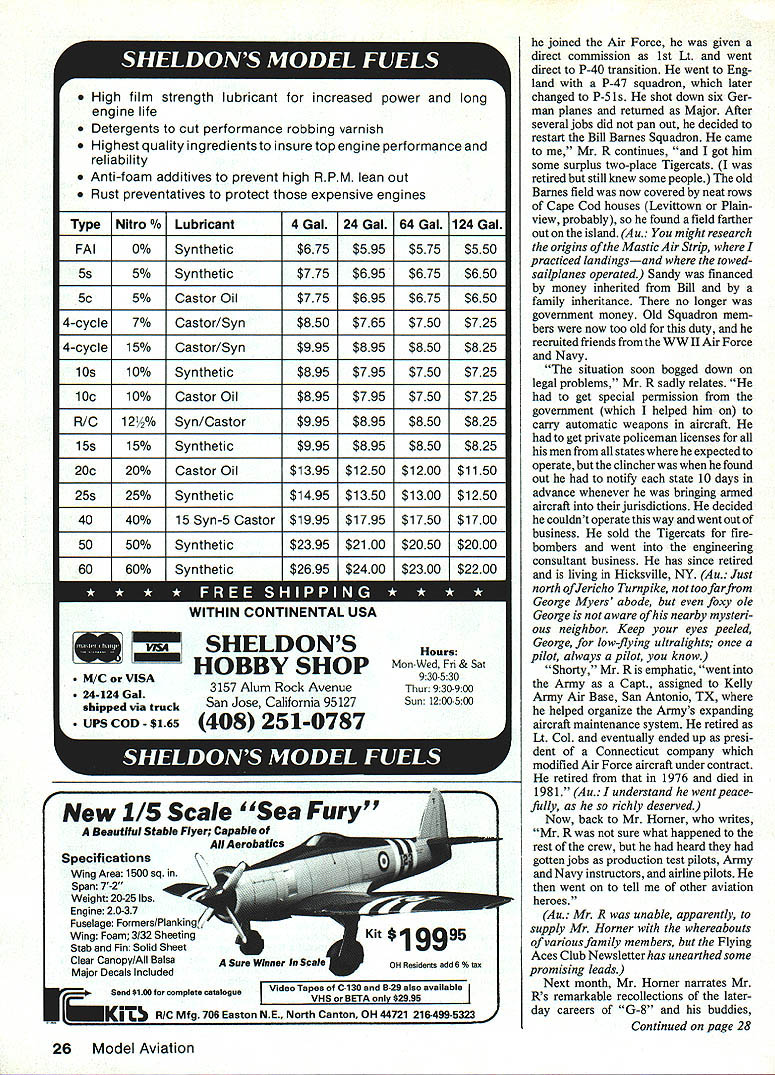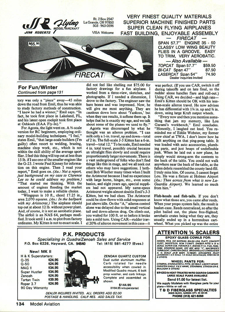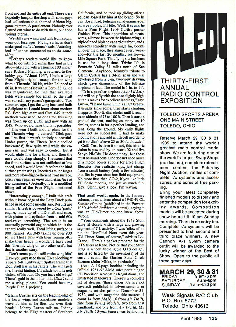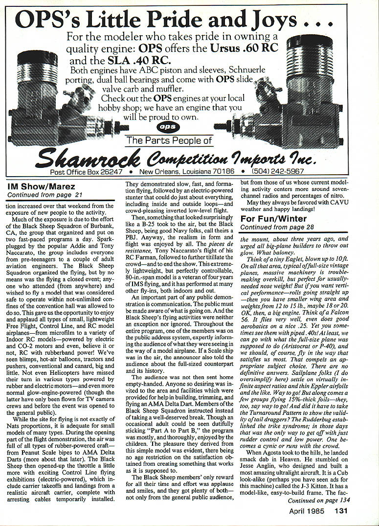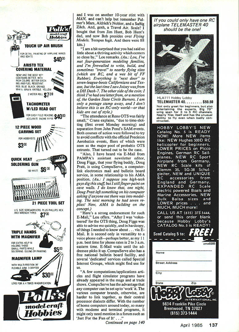 Bill Winter [I Just Fun t OVER THE RAINBOW month everyone escape mood teasing fade-out Indian Summer present chill breezes hibernation building season upon us have hounded desist months guys wanting Pronto plans MAN 1972 guys went Purple Plan nuts composer just rewrote music wish reborn rekitted pick simple project must danged near 200 pieces wing old Rookie Clue Total pieces divided days equals pieces per day equates total time eyes bigger stomach youll end up Dolor de la Cabesa sorrow head 110 days have rough framewell almost Es cape Right now Would believe Phineas Pinkham G-8 Bill Barnes other heroes Escadrille days pulp publishing really lived thousands remember noses quiver eyes get teary Guys fly Rubber Scale know newsletters revere gory days all-conquering fictional aces Pulps think publishing always like Before Lfe beganpictures conquered wordspublishers lived Cabbage Patch world could never meet demand depth Depression brother can spare dime golden opportunities hung like plums picking Four guys might share desk space some Union Square loft Big Apple use phone-answering service some years later would multi-million-dollar outfit Midtown Manhattan share profit some printers idle presses would publish 22 Model Aviation Left This July 1936 Issue Bill Barnes Air Trails featured Frank Tinsleys design fabled Silver Lancer Note its tandem engine counter-rotating props Macchi Castoidi Schneider racer hub cannon icading edge radiators retractable single float big model department edited Gordon Light 1933 Wakefield Cup win ner Bill Winter contributor aboard later same year magazine about size MA thinner developed pocketbook pulp called Bill Barnes Air Adventurer Air Trails already predominate title become solely Air Trails threeyears later Right Typical gory heil-bent-for-leatherfiction pulpa G-8 Battle Aces Authors prophetic scene old cover mind boggling 1918 Spads strafing German ramp-launched guided missile Late WW lithe Nazi V-i buzz bomb reality Millions followed headystuff Photos theAMA Museum Library may laugh now circa 1930 hoked-up adventures depicted covers G-B Baffle Aces three copy righted Popular Publications 1933 late 1965 As recent July1971 Berkley Medallion Books reprinted others new magazines nothing Some houses giants beginning Street Smith met Bill Barnes Round Table cronies began dime novel 1855 Operating out three sixstory buildings S&S worlds richest publisher 100 titles going back Wild West Buffalo Bill ran four Hoe presses 24 hours day capable 12000 magazines hour Net exceeded $25000000 15 years straight An editor made $30 week Some S&S pulps sold roughly 1000000 copies issue perhaps weekly cowboys Frank Dick Merrill Yale baseball heroes Detec tive Stories Love Stories Shadow Shadow knows lost crowd about 75000 amonth BillBarnes Air Adventurer stage set air heroes WW Jousting knights like Richtofen hunter Fonck supreme marksman gallant Nungesser Frank Luke balloon buster Eddie Rickenbacker Voss Bishop Ball Mannock et al created kids Twenties fantasy world Wagnerian gods Only nine years after WW Lindberghs daring New York-toParis flight electrified hundreds millions possibly mans first step moon Bamstormers surplus Jennies Hisso Standards decade trans ocean heart-stoppers airmail pilots Rides 504 Pioneer airplane makers hopeful factories mostly doomed dis aster Youth wanted near airplanes touch mostly just look hang around dusty country fields Mania bur geoning pulps near kids would ever get flying Wild West What can old wings tails Dick Flemings 1957 hIgh-thrust FF Thermic wing Zaic giidercut down 100 80 inoutgrew available flying fields lost someones attic now reappears Elteeb beetle spelled back wards ha canard using modified enlarged FF stab rear pylon-mounted Cox 049 RC Flies great Torp 35 049Winter says real progress 900 squares Locals 40-powered ships shake heads disbelief Elteeb lovely Drums Turbulent built RC Sweitzer Enterprises plans BIll Kaluf 23% full size 58/4-ln span good match its Saito 45 four-cycle 1 251/2 Graupner prop Covering British Solartex Winter adds Hobby Lobby wheels both Bills use em realistic light side-mounted engine given realism addition two scalelike cylinders oppo site side WInter says structure too easy too tough either meticulous closely follows full-scale airplane April 1985 23 Emil Agosta retired North Carolina found 45-mile-away neighbor Jesse Anglin producing J-3 Cub look-alike Kitten ultralight see text Emils 1/a-scale model spans 120 will gross about 14-17 lb Tartan single 134 cu glow Zenoah G-23 Structure full-scale ultrallght model-like Emils smaller copy about much true scale can get Dave Trost flight-testing Midwest Giant Sweet Low Stik Field Bench report Winter happened along Dave removabie tall assembly planned removable wing panels Quadra 22 turned 7000 gas 18-10 Zinger glow version 7800 10% nltro saving 8 o no flywheel etc burning ito 1 oz giow fuel per minute Winter impressed cautious safety techniques used Dave helper An excellent smoker note smoke trail holds through huge loop Left A lightly-loaded flying wingfor sport flying thermaling slope soaringwill loops inside outside rolls spine inverted flight gotta kiddin Robbe says can Geler have electric-powered version shown eight-cell pack Elevons fun anytime Specs Span 596 area 713 sq weight 34 oz 56 oz electric EF-76 Ii bad area Right Robbes Parat TF does basic maneuvers 09 glow engine its basically three channels can have aileron control wish An all-balsa ship can also Electric EF-76 Ii direct-drive motor eight 12 Ah cells Winter says really doesnt plug commercial stuff combination approach both subjects praiseworthy over again goggled helmeted super heroes inevitable yammer ing machine guns instead six-gun 'equalizer' Most pulps fantasiesgood guys bad guys right wrong cowboys indians aerial Westerns gal verboten G-8 makes TVs A-Team bunch sissies Others Bill Barneswhich evolved Air Trails audited circulation surpass ing combined totals of todays model mags 7500000