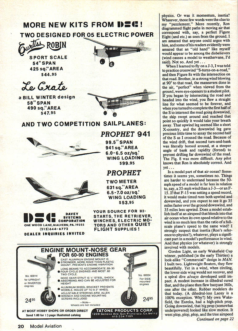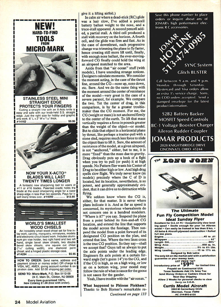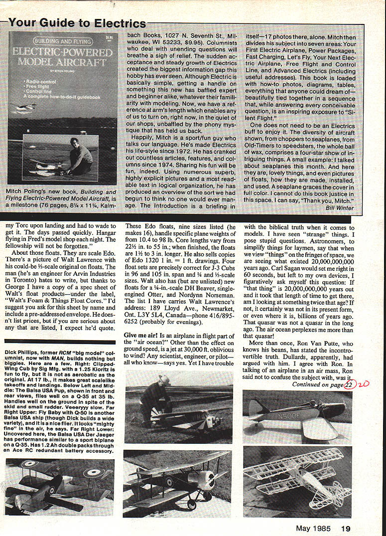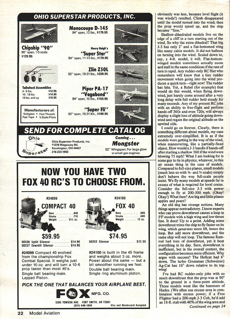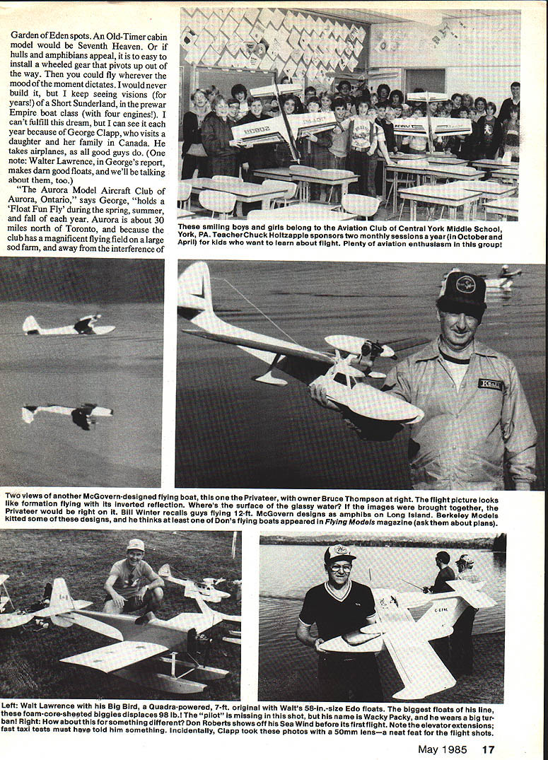 IJA ZROLLS AAO 5PAN 6 h 8 ~w P0 62 dO add 140% dd oisA MAed ddi4s0 O pcCEP 00 o4~ 01~dd $2~d 4$~sCO$ ys eA pAIA COG SPECIAL & SALE ITEMS GOOD UNTIL 1ST OF THE MONTH OF THIS ISSUE ONLY 0Af &53%1$G~t1z99 N$ AG 0 20 0Q 8Y BtgO6s 4 fLY BI3 tA~t & Garden Eden spots An Old-Timer cabin model would Seventh Heaven hulls amphibians appeal easy install wheeled gear pivots up out way could fly wherever mood moment dictates would never build keep seeing visions years Short Sunderland prewar Empire boat class four engines cant fulfill dream can see year because George Clapp visits daughter family Canada takes airplanes good guys note Walter Lawrence Georges report makes dam good floats well talking about too Aurora Model Aircraft Club Aurora Ontario says George holds Float Fun Fly during spring summer fall year Aurora about 30 miles north Toronto because club has magnificent flying field large sod farm away interference Two views another McGovern-designed flying boat Privateer owner Bruce Thompson right flight picture looks like formation flying its inverted reflection Wheres surface glassy water images brought together Privateer would right Bill Winter recalls guys flying 1 2-ft McGovern designs amphibs Long Island Berkeley Models kitted some designs thinks least Dons flying boats appeared Flying Models magazine ask about plans May1985 17 smiling boys girls belong Aviation Club Central York Middle School York PA Teacher Chuck Holtzapple sponsors two monthly sessions year October April kids want learn about flight Plenty aviation enthusiasm group Left Wait Lawrence witn nis Big Bird Quadra-powered 7ft original Walts 58-in.size Ecu tigais ne ciggear TIOSTS OT nis line foam-core-sheeted biggies displaces 98 lb pilot missing shot name Wacky Packy wears big tur ban Right about something different Don Roberts shows off Sea Wind before its first flight Note elevatorextensions fast taxi tests must have told him something Incidentally Clapp took photos 50mm lensa neat feat flight shots FLYING ION FLYER IV 2 lET SOP OF AD~ PRESTON N mr MOON SOD IV UQOGE ERrOR /00040 04 NC bO1371 STON AURCAAFT 00 Boo- RANor rLYJAs I3 P/Gfl*M va $2 1 CR062 Ww44F AU UNWa 4*SA TROD WOO W0$24 UON P04W5 flOwn P 545 cooS /A OWS SO C S S 0J II II ID N OWC SR 4*4 4OO rona. DER/de lOOts S4ar PRO P4vrra P Pot FUTY4U Aq0g ep TOt 41R mAew PR0* 5505 *ORNDS n7~S 51 W# OWSRY Illustrators like Frank Tinsley created detailed plans planes flown heroes like Bill Barnes used futurIstic features came pass villaIns mounted throwaway steeds often far practical designs fliers Rub ber Scale models have noted Flying Aces Newsletter prInted series show FAC Fiction Fliers No 1 No 2 monoplane before Wildcat featured July 1936 Air Trails novel Lancer Strikes 27 such bad-guy designs Color olive-green engIne Tornado armament two 50-cal guns Death Ship Adam Preston bipe flown villain Moon God October 1937 issue Winter edited copy says story very far out Waco could have done better Color used currently unknown demarcation lIne bottom line broad arrow side fuselage big city members ronto have invited participate event last few years Sand Lake near Muskoka Ont some 165 miles north Toronto three seasonal events decided October 13-15 would plan Friday evening Clapp wanders club mem bers Walter Lawrence Al Walton Bruce Thompson met Walts home consolidate models etc pack Walts van wagon models exception big 20s Era flying boat have foam-core floats designed Wt. other club members Don Jim Roberts Allan Brooks also came up evening Fred Lord owns camp super host cooks great meals Great weather Clear skies no wind speak shirt-sleeve tempera tures Other fellows didnt show learned later weekend Toronto foggy ram eight us did make total 24 RC models FF boat sand beach shallow good way out making easy retrieve model stalled engine near shore although water icy-cold know because upset Left Marty Meyer flies 15-lb movie camera Max 60 says Clark Y airfoil really helps lifting load Engine mounting pod keeps oily smoke being photographed Camera nose weighs 2 lb Marty should able get some great strafing shots Right Rubber Scale guys will love hate exercise ugliness During Twenties British fond baffling airplanes Blackburnof Airedale Sprat Splat Iris etccaiied fleet three-placer third man peered round windows bowels want Inspiration Blackburn Blackburn After group Virginia discussed beauty Ugliness Hurst Bowers made drawing monsterforthe Maxecuters newsletter None otherthan Dave Reese Biplane Bippee built 20-incherwith Saint Genese 26 airfoil Gosh care Buidog Puss flies around spotting fleet six strands 3/16 Sig rubber turning old 9-in Palowina trimmed 5l/3 Exactly 2 oz will take much cognac improve looks performance quite satisfactory 18 Model Aviation Torc upon landing iu WUU LU get days passed quickly Hangar flying Freds model shop night fellowship will forgotten About floats scale Edo Theres picture Walt Lawrence could-be -scale original floats man hes engineer Arvin Industries Toronto hates write thanks George have copy spec sheet Walts float productsunder label Walts Foam & Things Float Cores Id suggest ask sheet name include pre-addressed envelope does nt list prices serious about listed expect hed quote Dick Phillips former ACM big model col umnist now MAN builds nothing biggies few Right ClippedWing Cub Sig Mfg 125 Kioritz fun fiy aerobatic original 17 lb makes great scalelike takeoffs landings Below Left Mid dle Balsa USA Pup shown front rear views files well 0-35 35 lb Handles well ground spite skid small rudder Veeeryyy slow Far Right Upper Ply Baby 050 another Balsa USA ship though Dick builds wide variety itisa niceflier looks mighty fine air says Far Right Lower Uncovered Balsa USA Der Jaeger has performance simiiar sport biplane 035 Has 12 Ah double packs through Ace RC redundant battery accessory ruo iioats mne sizes listed makes 16 handle specific plane weights 104 98 lb Core lengths vary 22 55 finished floats 1 3 longer also sells copies Edo 1320 1 drawings Four 