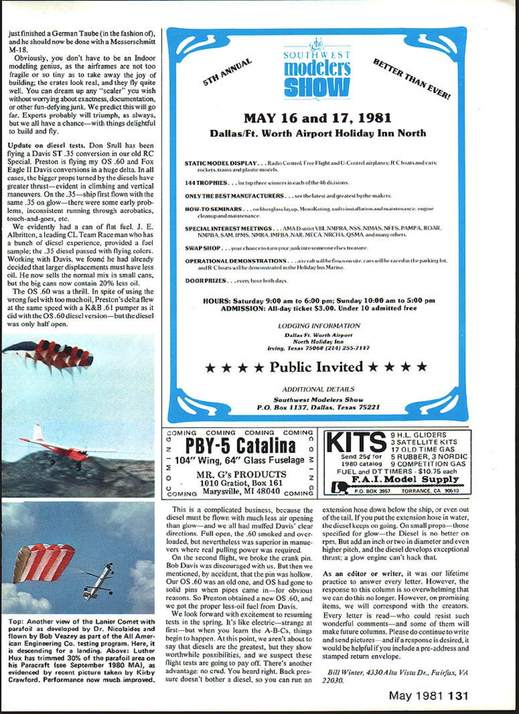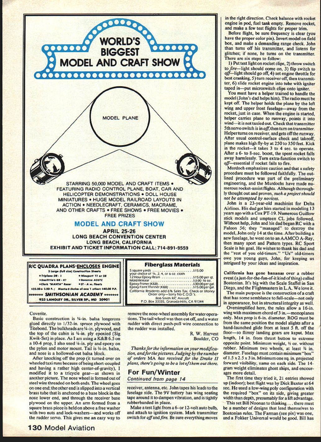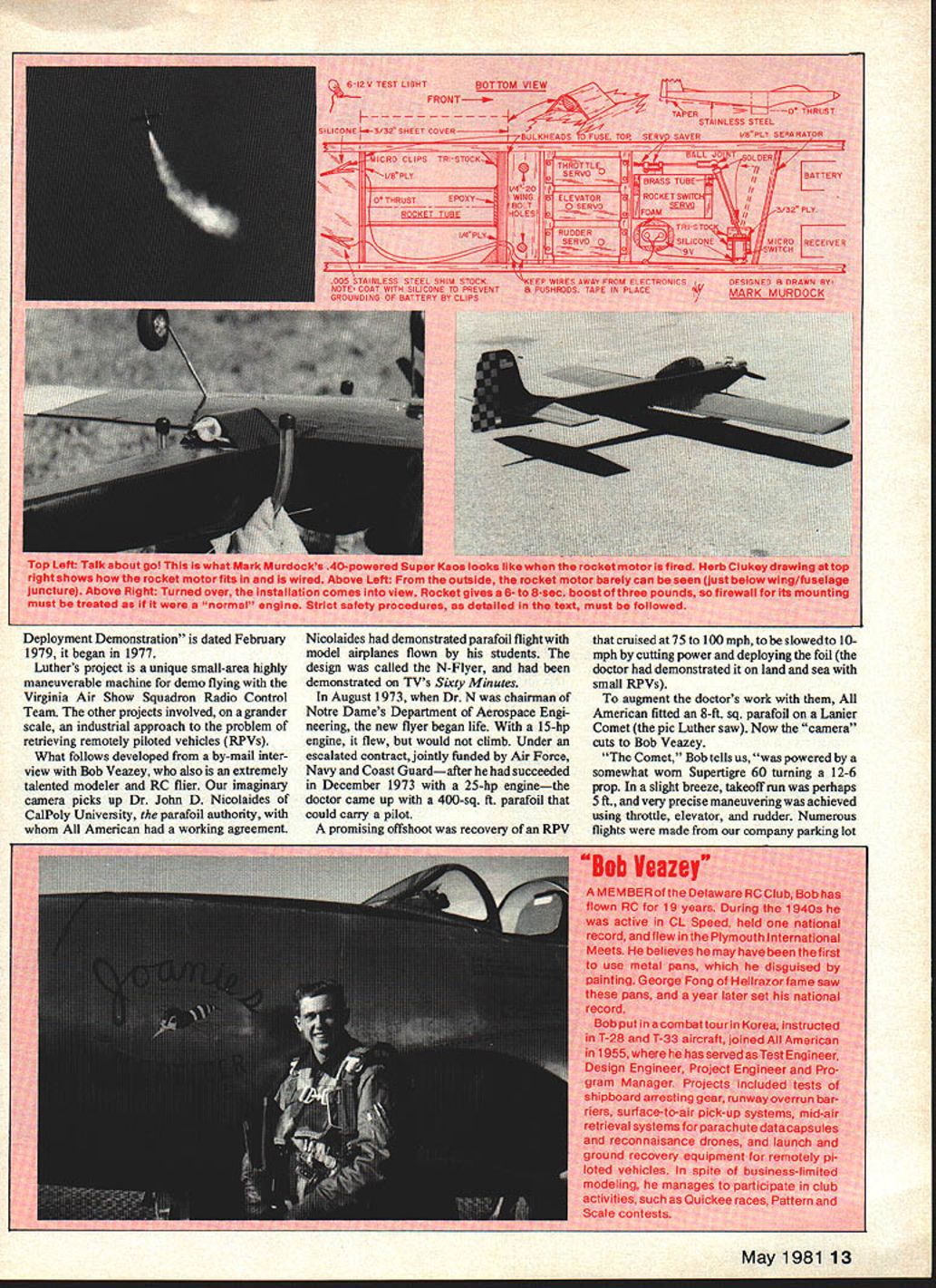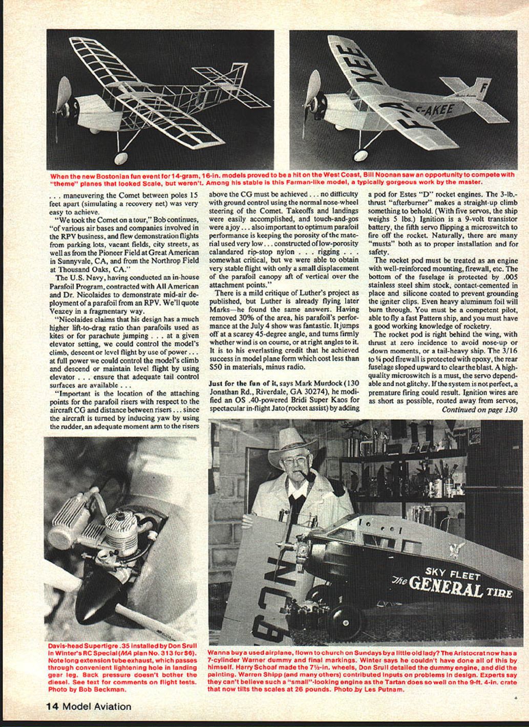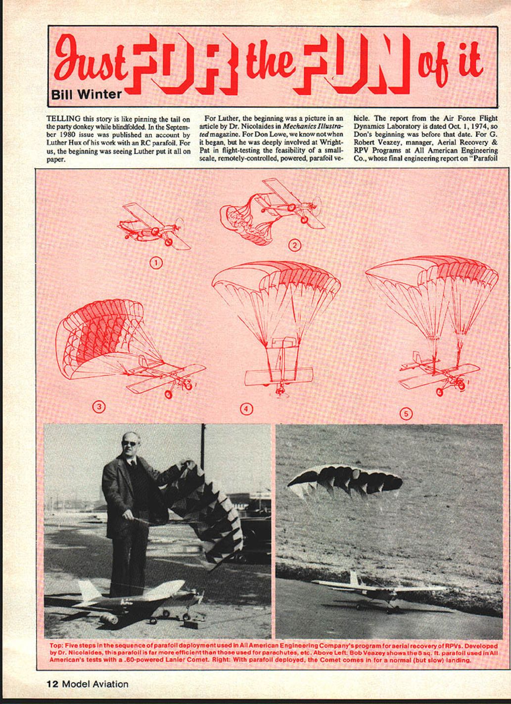 TELLING story like pinning tail party donkey blindfolded Septem ber 1980 issue published account Luther Hux work RC parafoil us beginning seeing Luther put paper Luther beginning picture article Dr Nicolaides Mechanics Illustra ted magazine Don Lowe know began deeply involved WrightPat flight-testing feasibility smallscale remotely-controlled powered parafoil yehide report Air Force Flight Dynamics Laboratory dated Oct 1 1974 50 Dons beginning before date G Robert Veazey manager Aerial Recovery & RPV Programs American Engineering Co final engineering report Parafoil 12 Model Aviation 9w~FIJF4 tkeiLLLj oj iL Bill Winter May 1981 13 Deployment Demonstration dated February Nicolaldes demonstrated parafoil flight wIul cruised 75 100 mph slowedto 101979 began 1977 model airplanes flown students mph cutting power deploying foil Luthers project unique small-area highly design called N-Flyer doctor demonstrated land sea maneuverable machine demo flying demonstrated TVs Sixty Minutes small RPVs Virginia Air Show Squadron Radio Control August 1973 Dr N chairman augment doctors work Team other projects involved grander Notre Dames Department Aerospace Engi American fitted 8-ft sq parafoil Lanier scale industrial approach problem neering new flyer began life 15-hp Comet pic Luther saw Now camera retrieving remotely piloted vehicles RPVs engine flew would climb Under cuts Bob Veazey What follows developed by-mail inter escalated contract jointly funded Air Force Comet Bob tells us powered view Bob Veazey also extremely Navy Coast Guardafter succeeded somewhat worn Supertigre 60 turning 12-6 talented modeler RC flier imaginary December 1973 25-hp enginethe prop slight breeze takeoff run perhaps camera picks up Dr John D Nicolaides doctor came up 400-sq ft parafoil 5 ft very precise maneuveringwas achieved CalPoly University parafoil authority could carry pilot using throttle elevator rudder Numerous American working agreement promising offshoot recovery RPV flights made company parking lot euvering Comet between poles 15 feet apart simulating recovery net very easy achieve took Comet tour Bob continues various air bases companies involved RPV business flew demonstration flights parking lots vacant fields city streets well Pioneer Field Great American Sunnyvale CA Northrop Field Thousand Oaks CA US Navy having conducted in-house Parafoil Program contracted American Dr Nicolaides demonstrate mid-air de ployment parafoil RPV Well quote Veazey fragmentary way Nicolaides claims design has much higher lift-to-drag ratio parafoils used kites parachute jumping en elevator setting could control models climb descent level flight use power. full power could control models climb descend maintain level flight using elevator sure adequate tail control surfaces available . Important location attaching points parafoil risers respect aircraft CG distance between risers e aircraft tamed inducing yaw using rudder adequate moment arm risers above CG must achieved ifficulty ground control using normal nose-wheel steering Comet Takeoffs landings easily accomplished touch-and-gos ajoy. also important optimum parafoil performance keeping porosity mate rial used very low structed low-porosity calandared rip-stop nylon gging somewhat critical able obtain very stable flight small displacement parafoil canopy aft vertical over attachment points mild critique Luthers project published Luther already flying later Markshe found same answers Having removed 30% area parafoils perfor mance July 4 show fantastic jumps off scarey 45-degree angle turns firmly whether wind course right angies to everlasting credit achieved success model plane form cost less $50 materials minus radio Just fun says Mark Murdock 130 Jonathan Rd Riverdale GA 30274 modi fied OS 40-powered Bridi Super Kaos spectacular in-flight Jato rocket assist adding pod Estes D rocket engines 3-lbthrust afterburner makes straight-up climb something behold five servos ship weighs 5 lbs Ignition 9-volt transistor battery fifth servo flipping microswitch fire off rocket Naturally musts both proper installation safety rocket pod must treated engine well-reinforced mounting firewall etc bottom fuselage protected 005 stainless steel shim stock contact-cemented place silicone coated prevent grounding igniter clips heavy aluminum foil will burn through must competent pilot able fly fast Pattern ship must have good working knowledge rocketry rocket pod right behind wing thrust zero incidence avoid nose-up -down moments tail-heavy ship 3/16 pod firewall protected epoxy rear fuselage sloped upward clear blast highquality microswitch must servo depend able glitchy system perfect premature firing could result Ignition wires short possible routed away servos Continued page 130 14 Model Aviation new Bostonian fun eventfOr 1 4gram 1 0-rn muo West Coast Bill Noonan saw opportunity compete theme planes looked Scale werent Among stable Farman-Ilke model typically gorgeous work master Winter Special MA plan No313 fOrS6 Wanna buya used airplane flown church Sundays bya little old lady TheArlstocratnow nas Note lony ~tension tube exhaust passes 7cylinder Warner dummy final markings Winter says couldnt have done through convenient lightening hole landing himself Harry Schoaf made 71/2-in wheels Don Srull detailed dummy engine did gear leg Back pressure doesnt bother painting Warren Shipp othersl contributed inputs problems design Experts say diesel See text comments flight tests cant believe such smalllooking engine Tartan does well 9-ft 4-in crate Photo Bob Beckman now tilts scales 26 pounds Photo Les Putnam Coverite Basic construction 4.jn balsa longerons glued directly 1/32-in spruce plywood Titebond bulkheads A-in plywood top cabin -in ply epoxied Sig Kwik-Set place As am using K&B 65 10-4 prop also used -in ply epoxy pylon motor mount Tail -in balsa nose hollowed-out balsa block After knocking off prop turned over wheeled taxi runs because ofbeing short-coupled having rather high center-of-g