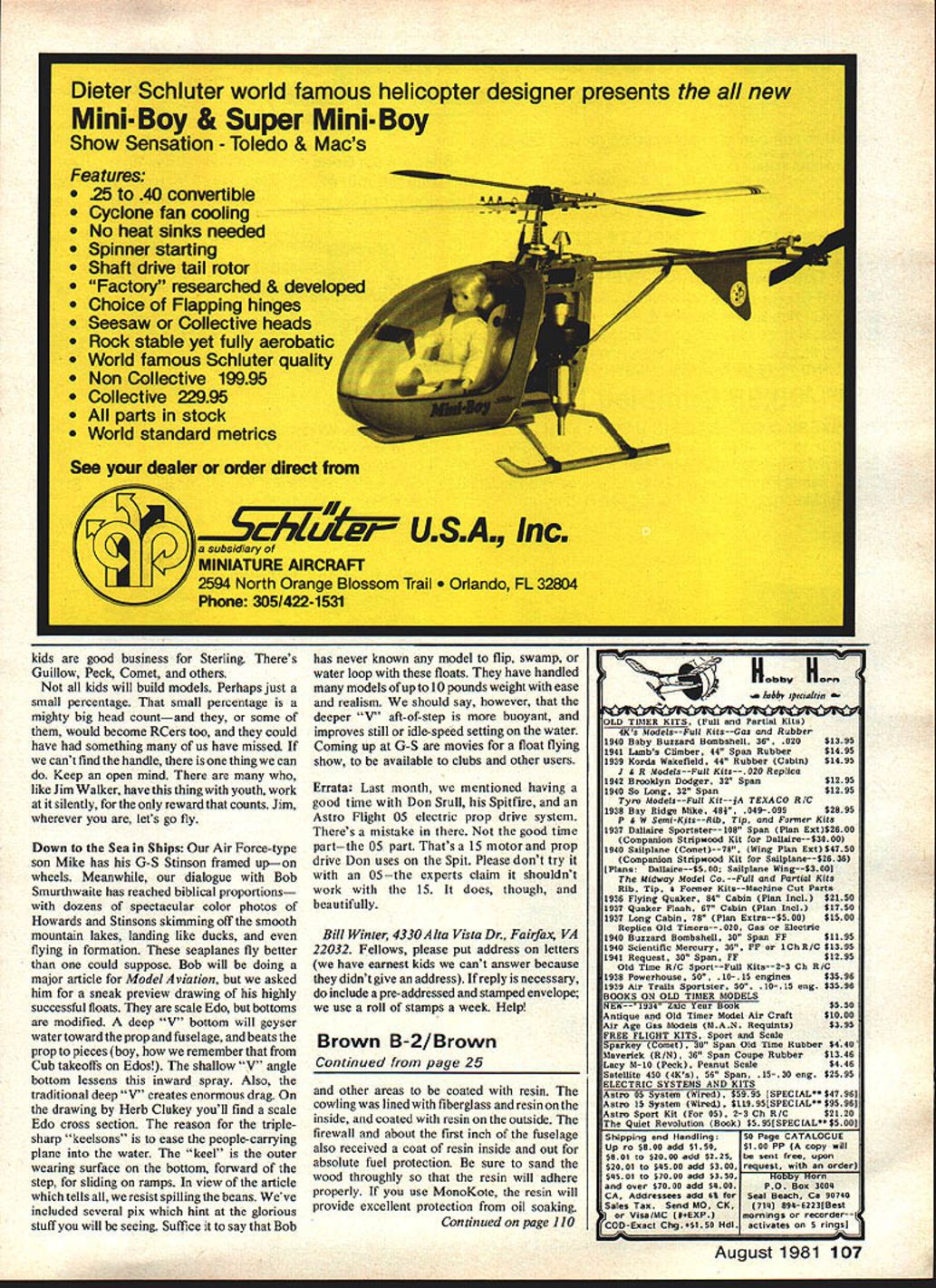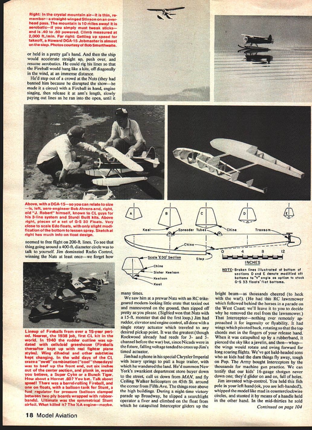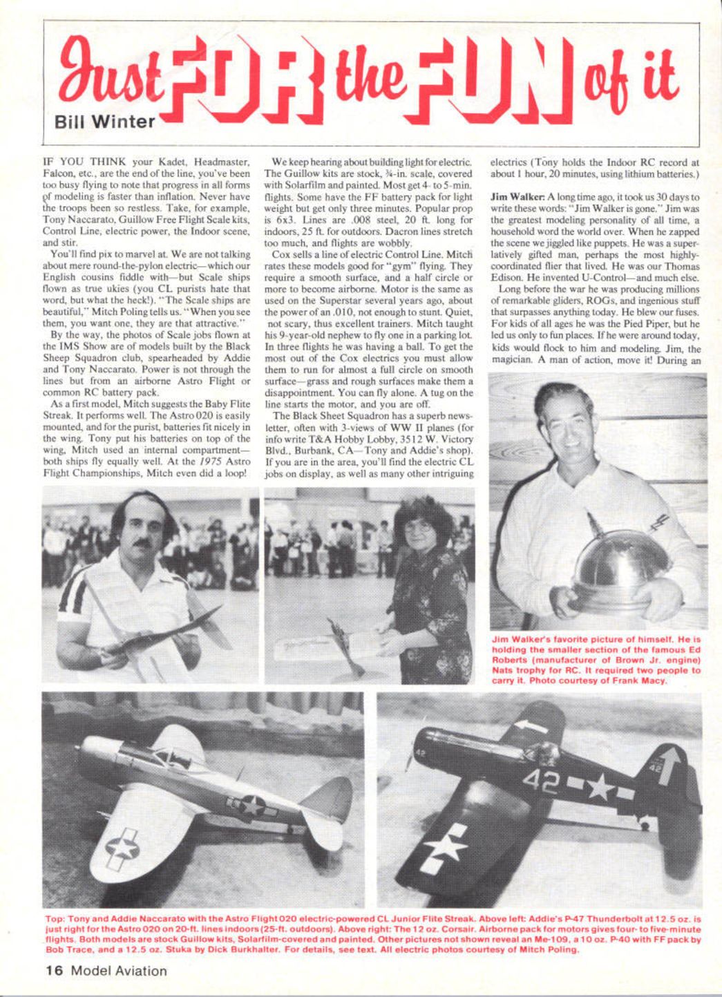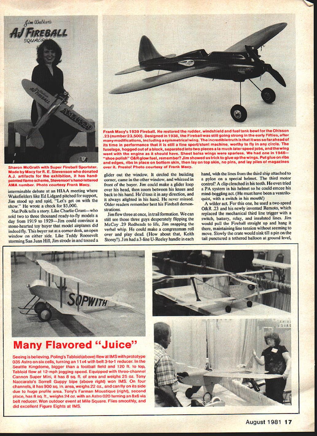 9F1[XF4 tktui\LLj 86 Bill Winter IF YOU THINK Kadet Headmaster Falcon etc end line youve too busy flying note progress forms f modeling faster inflation Never have troops restless Take example Tony Naccarato Guillow Free Flight Scale kits Control Line electric power Indoor scene stir Youll find pix marvel talking about mere round-the-pylon electricwhich English cousins fiddle withbut Scale ships flown true ukies CL purists hate word what heck Scale ships beautiful Mitch Poling tells us see want attractive way photos Scale jobs flown IMS Show models built Black Sheep Squadron club spearheaded Addie Tony Naccarato Power through lines airborne Astro Flight common RC battery pack As first model Mitch suggests Baby Flite Streak performs welL Astro 020 easily mounted purist batteries fit nicely wing Tony put batteries top wing Mitch used internal compartment both ships fly equally well 1975 Astro Flight Championships Mitch did loop keep hearing about building light electric Guillow kits stock -in scale covered Solarfilm painted Most get 4- 5-mm flights Some have FF battery pack light weight get three minutes Popular prop 6x3 Lines 008 steel 20 ft long indoors 25 ft outdoors Dacron lines stretch too much flights wobbly Cox sells line electric Control Line Mitch rates models good gym flying require smooth surface half circle become airborne Motor same used Superstar several years ago about power 010 enough stunt Quiet scary thus excellent trainers Mitch taught 9-year-old nephew fly parking lot three flights having ball get out Cox electrics must allow run almost full circle smooth surfacegrass rough surfaces make disappointment can fly alone tug line starts motor off Black Sheet Squadron has superb news letter often 3-views WV II planes info write T&A Hobby Lobby 3512W Victory Blvd Burbank CATony Addies shop area youll find electric CL jobs display well other intriguing electrics Tony holds Indoor RC record about 1 hour 20 minutes using lithium batteries Jim Walker-h longtime ago took us 30 days write words Jim Walker gone Jim greatest modeling personality time household word world over zapped scene jiggled like puppets super latively gifted man perhaps highlycoordinated flier lived Thomas Edison invented U-Controland much else Long before war producing millions remarkable gliders ROGs ingenious stuff surpasses anything today blew fuses kids ages Pied Piper led us fun places around today kids would flock him modeling Jim magician man action move During 16 Model Aviation Jim Walkers tavorite picture himself holding smaller section famous Ed Roberts manufacturer Brown Jr engine Nata trophy RC required two people carry Photo courtesy Frank Macy Top Tony Addie Naccarato Astro Flight 020 electric-powered CL Junior Flite Streak Above left Addies P-47 Thunderbolt 125 ox just right Astro 020 20-ft lines indoors 25-ft outdoors Above right 12 oz Corsair Airborne pack motors gives four- five-minute flights Both models stock Guillow kits Solarfilm-covered painted Other pictures shown reveal Me-i 09 ala ox P-40 FF pack Bob Trace 125 ox Stuka Dick Burkhalter details see text electric photos courtesy Mitch Poling N Sharon McGrath Super Fireball Sportster Made Macy R E Stevenson donated AJ artifacts exhibition has handpainted flame scheme Stevensons hand-lettered AMA number Photo courtesy Frank Macy interminable debate HIAA meeting Wakefielders like Ed Lidgard pitched support Jim stood up sgid Lets get show wrote check $5000 Nat Polk tells story Like Charlie Grantwho sold two three thousand ready-to-fly models day 1919 1929Jim could convince stone-hearted toy buyer model airplanes did indeed fly buyer sat corner desk open window either side Like Teddy Roosevelt storming San Juan Hill Jim strode tossed Frank Macys 1939 Fireball restored rudder windshield fuel tank bowl torthe Ohlsson 23 number 23500 Designed 1938 Fireball still going strong early Fifties after modifications including symmetricalwing incredibletruth isthat sofarahead its time performance still fine sport/stunt machine worthy fly circle fuselage hogged out block separated intotwo pieces ala much laterspeed jobs thewing went engine should have Sheet balsa wings sparless 1946 shoe polish OAR glow fuel remember Jim showed ustrickto glue upthewings Put glue ribs edges ribs place bottom skin lay top skin no pins lay piles magazines over Presto Photo courtesy Frank Macy glider out window circled building corner came other window whizzed front buyer Jim could make glider loop over head zoom between knees back hand Hed toss direction always alighted hand never missed Older readers remember best Fireball demon strations Jim flew three once trail formation can still see three guys desperately flipping McCoy 29 Redheads life Jim snapping verbal whip could make congressman roll over play dead about Keith Storey Jim 3-line U-Reeley handle hand lines third ship attached pylon special helmet third motor control clip clenched teeth tried PA system helmet could emcee mind-boggling act must have ventrilo quist switch mouth wilder act used two-speed O&R 23 newly invented Remoto replaced mechanical third line trigger switch battery relay insulated lines Jim would pull Fireball straight up hang maintaining line tension seeming move Slowly crate would sink till pin tail punctured tethered balloon ground level August 1981 17 Flavored Juice Seeing believing Polings Tabloid above flew lMSwith prototype 035 Astro six cells turning 11 x4 belt 3-to-i reducer Seattle Kingdome bigger football field 120 ft top Tabloid flew 12-mph jogging speed Equipped three-channel Cannon Super Mini has 8 sq ft area weighs 25 oz Tony Naccaratos Sorrell Guppy bipe above right won MS tour channels has 900 sq area weighs 22 oz can fly its side due huge profile area Tonys Farman Moustique right second place has 8 sq ft weighs 24 oz Astro 020 turning 8x6 via belt reducer Won outdoor event Mile Square Flies smoothly did excellent Figure Eights IMS Right In crystal mountain airit thin re membera stra