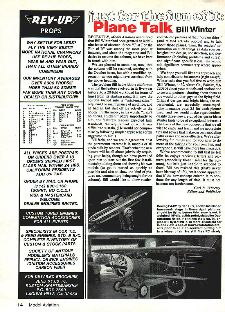 OUR INVENTORY VERA GES OVER 8000 PROPS! MORE THAN 60 SIZES! FAR MORE THAN ANY OTHER DEALER OR DISTRIBUTOR! SPECIAL PRO SERIESPOUR-CYCLE TAILORED HELICALPITCH 019PITCHPRICE DIAPITCHPRICE 634139 29339456169126697798276 92 392/4 45681791367 118349 89 6 69 1 169 14 6 7 Ii 8 449 9 4 56 89 1 79 166 15 6 7 656 10 456691 199 16 67 949 10 6W 6W 199 10 SEW 299 PYLON RACING II 4 6 7 79 19 793/48109 014PITCHPRICE II SEW 219 1 SN 59H 209 119 8 7 319 892/4 69 693/4 7 12 5 SW 6 359 79 792/4 269 13 56 329 8 7 79 792/4 266 14 56 429 15 56 626 W Wid8b619 16 6 7 919 8W ESD6 946 969 N NnW 9608 ALL PRICES ARE POSTPAID ON ORDERS OVER $10 ORDERS SHIPPED FIRST CLASS MAIL WITHIN 24 HRS CALIFORNIA RESIDENTS ADD 6% TAX ORDER BY MAIL OR PHONE 714 830-5162 SORRY NO COD WSA & MASTERCARD WELCOME DEALER INQUIRIES INVITED SPECIALISTS IN COX TD & REED ENGINES STD & RIC COMPLETE INVENTORY OF CUSTOM & STOCK PARTS Plane Talk Bill Winter RECENTLY ModelAviation announced Bill Winter granted indefi nite leave absence Since Just Fun among popular features since magazine Bill desire resume column have kept touch him pleased announce now column will resumed starting October issue modified ap proachas might have surmised above heading problem Bill old format feature evolved its five-year history 20-fold work load terms time its starting point Bill says column turned mini-magazine requiring maintenance office shut off activity hobby Furthermore words aint no spring chicken importantly him features readers expected high standards requirement difficult sustain would compro mise following simpler approaches often suggested him Bill feels agreement paramount interest models kinds built readers Thats what new feature will about obviously requir ing help though have prevailed upon him start out first few install ments talking about showing own models get started quickly possible also show kind pic tures commentary being sought column Bill would like show readercontributed pictures dream ships related activity photos talk about planes using readers formation such things data sources insights design construction per formance including problems cures significant specifications would add significant commentary appro priate hope will like approach help contribute its success right away Winter asks feel free write him Bill Winter 4432 Altura Ct Fairfax VA 22030 about models enclose several pictures chatting about would other guys flying field Original designs bright ideas ex perimental especially encouraged magazine pays $5 picture used would make reproductionquality three-views etc designs ideas Winter finds exceptional interest basis new concept wish enjoy learn appreciate tips advice make own modeling paths easier effective after low-key fun things guys talking own fun everyone else will have fun Weve recommended Bill tell folks enjoys receiving letters pic tures especially useful col umn hes just unable respond Bill has resisted thats never way life seems apparent new-concept column con tinue length time must become too burdensome Carl R Wheeley Editor Publisher Boeing P4-B2 byDan Lutz shown infinished framework stage April pIctures should flying before Issue out weighed 161/2 lb atthis point slated Dac ron/dope finish thinks 2 Cu en gine wlil fly 20 lb Sleek old car view Dans restoration proj ects prior auto accident putting him wheel chair still flies RC nicely 14 Model Aviation WHY SETTLE FOR LESS FLY THE VERY BEST! MORE NA TIONAL CHAMPIONS USE REV-UP PROPS YEAR IN AND YEAR OUT THAN ALL OTHER BRANDS COMBINED! SOCIETY OF ANTIQUE MODELERS MA TERIALS REPLICA OR WICK ENGINES IGNITION CCESSORIES CARBON FIBER