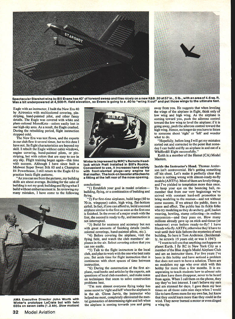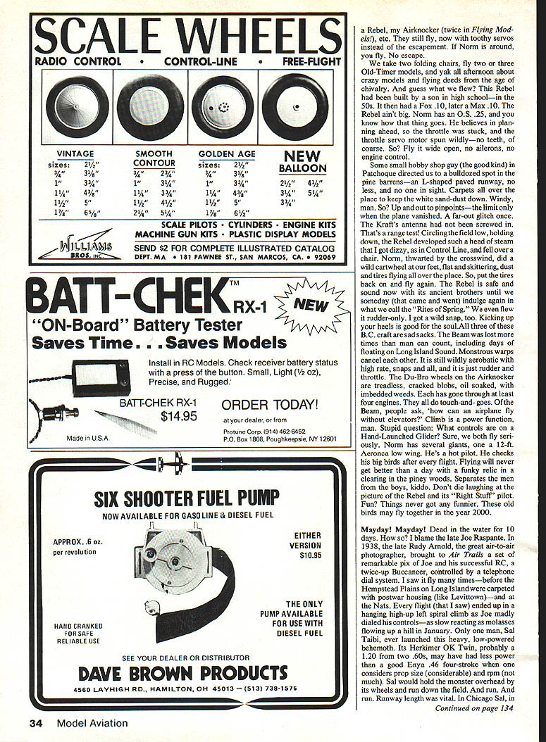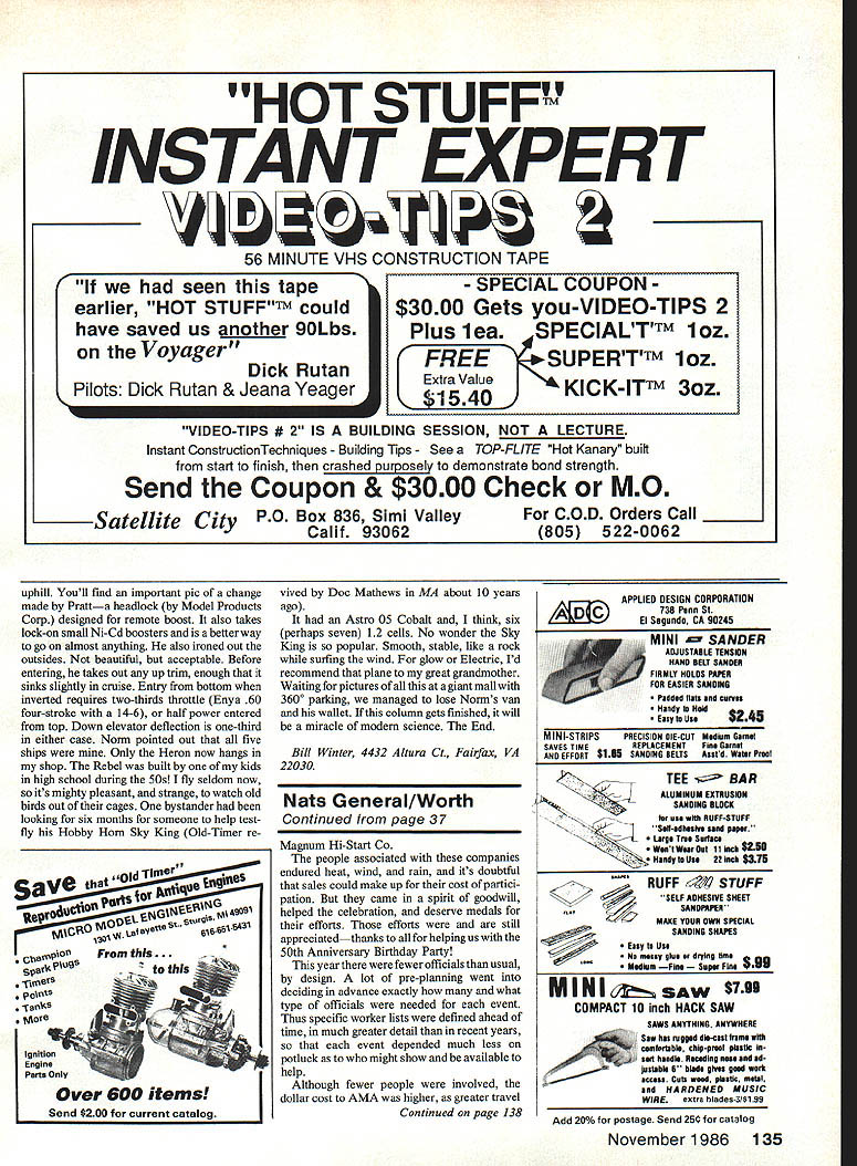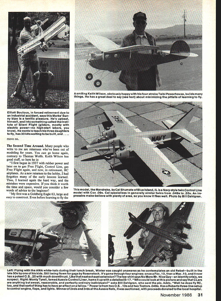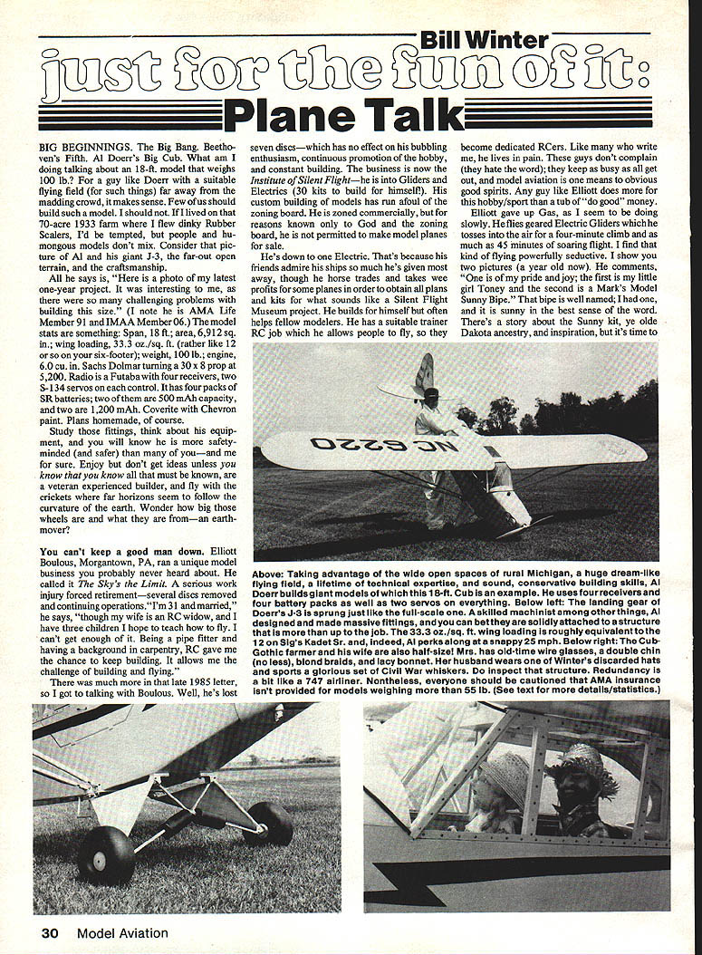 Bill Winter _____znn ______Plane Talk BIG BEGINNINGS Big Bang Beetho vens Fifth Al Doerrs Big Cub What am doing talking about 18-ft model weighs 100 lb guy like Doerr suitable flying field such things far away madding crowd makes sense Few ofus should build such model should lived 70-acre 1933 farm flew dink Rubber Scalers Id tempted people hu mongous models dont mix Consider pic ture Al giant J-3 far-out open terrain craftsmanship says is photo latest one-year project interesting challenging problems building size note AMA Life Member 91 IMAA Member 06 model stats something Span 18 ft area 6912 sq wing loading 333 oz/sq ft rather like 12 six-footer weight 100 lb engine 60 cu Sachs Dolmar turning 30 x 8 prop 5200 Radio aFutaba four receivers two S-134 servos control has four packs SR batteries two 500 mAh capacity two 1200 mAli Coverite Chevron paint Plans homemade course Study fittings think about equip ment will know safetyminded safer youand sure Enjoy dont get ideas unless know know must known veteran experienced builder fly crickets far horizons seem follow curvature earth Wonder big wheels what froman earthmover cant keep good man down Elliott Boulous Morgantown PA ran unique model business probably never heard about called Skys Limit serious work injury forced retirementseveral discs removed continuing operationsIm 31 married says though wife RC widow have three children hope teach fly cant get enough Being pipe fitter having background carpentry RC gave chance keep building allows challenge building flying much late 1985 letter got talkina Boulous Well hes lost seven discswhich has no effect bubbling enthusiasm continuous promotion hobby constant building business now Institute Silent Flighthe Gliders Electrics 30 kits build himself custom building models has run afoul zoning board zoned commercially reasons known God zoning board permitted make model planes sale Hes down Electric Thats because friends admire ships much hes given away though horse trades takes wee profits some planes order obtaln plans kits what sounds like Silent Flight Museum project builds himself often helps fellow modelers has suitable trainer RC job allows people fly become dedicated RCers Like write lives pain guys dont complain hate word keep busy get out model aviation means obvious good spirits Any guy like Elliott does hobby/sport tub ofdo good money Elliott gave up Gas seem doing slowly flies geared Electric Gliders tosses air four-minute climb much 45 minutes soaring flight find kind flying powerfully seductive show two pictures year old now comments pride joy first little girl Toney second Marks Model Sunny Bipe bipe well named sunny best sense word Theres story about Sunny kit ye olde Dakota ancestry inspiration its time 30 Model Aviation Above Taking advantage wide open spacea rural Michigan huge dream-ilke fiying ficid lifetime technical expertise sound conservative building skills Al Doerr builds giant models 18-ft Cub example uses four receivers four battey packs well two servos everything Below left landing gear Doerrs J-3 sprung just like full-scale skilled machinist among otherthings Al designed made massive fittings can betthey solidlyattached structure up tothe job 333 oz/sq ft wing loading roughlyequivalenttothe 12 Sigs KadetSr indeed Al perks along snappy 25mph Below right CubGothic farmer wife also half-size Mrs has old-time wire glasses double chin no less blond braids lacy bonnet husband wears Winters discarded hats sports glorious set Civil War whiskers inspect structure Redundancy bit like 747 aIrliner Nontheless everyone should cautioned AMA insurance isnt provided models weighing 55 lb See text details/statistics model Mandrake Cal Shumate Blue Island hiss Navy-style twin Control Line model Cox 09s Cal specializes generally similar twins 049s 35s An im pressive make-believe plenty area know flies well Photo Bill Dahigren Elliott Boulous forced retirement due industrial accident saysthis Marks Sun ny bipe terrific pleasure Hes upbeat himself something called Insti tute Silent Flight gliders mostly electric powerno high-start labors know wants teach three daughters fly has 30 kits waiting built .. move Second Time Around people write returnees whove out modeling years can go home again contrary Thomas Wolfe Keith Wilson has good stuff first began 1937 rubber power later gas Free Flight Control Line gas Free Flight again now retirement RC airplanes As new returnee hobby forgotten early lessons learned Thus learned again hard way mistakes expensive think worth time space would consider few words advice beginner first Goldberg Eagle 63 large easy construct before learning fly Left Flying AMA white-hats during lunch break Winter caught unawares contemplates old Rebelbuilt late SOs kids Still being flown forgags Rosenstock Its gonethrough fourengines oncea Fox 10 Max 10 now has potent OS 25 much downthrust Likethat neat exhaustextensionThetee-shirt says No Mr Nice Guyan identity crisis suspect Right MontyTyrell famed Aussie Control Liner hams upwith detailed B-i 7 could lookatthis picture saythatCLers anything sweet reasonable perfectly ordinary individuals asks Bill Dahigren sent plc Adds Well does fly RC too sort thing has have effect fellow Power two 05 106 two Testors 0498 Has Robertsthree-line setup control engine flaps lights Winnerof 2nds 3rds attheAussle Nats itwas auctioned proceeds donated tothe local hospital November 1986 31 smiling Keith Wilson obviously happywith hisfour-strokeTaibi Powerhouse builds things has great deal say see text about minimizing pitfalls learning fly Eagle instructor built New Era 40 Airtronics multicolored covering pinstriping band-painted pilot other fancy details Eagle covered white plum-colored MonoKotecolors easily lost high-sky area As result Eagle crashed During rebuilding period flight instruction stopped cold New Era test flown experts club flew several times date have Its flight characteristics beyond skill rebuilt Eagle cabin windows engine