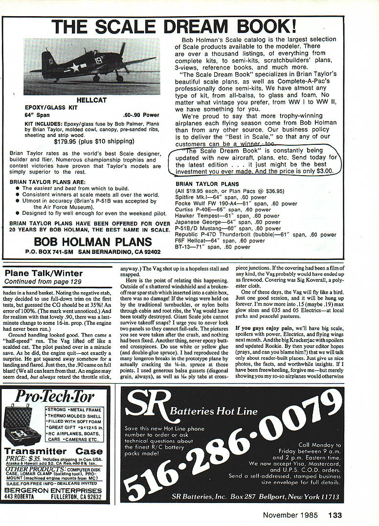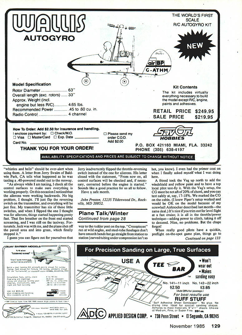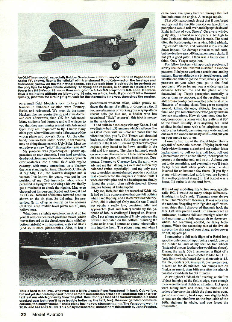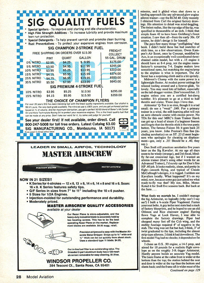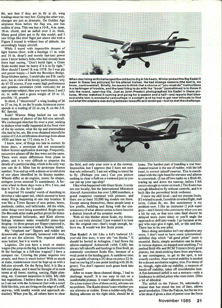 Bill Winter 7 Plane Talk WHY THE -SCALE ARISTOCRAT An other impulse always plane never forgotten always dream planes build remain fantasies build things never thought about subconscious always wanted big Buried some pigeon hole mind dimmed memory long-ago 9-ft rubber-powered Cessna 1920s prop carved 24-in-long balsa 2 x 4 took two us manhandle row knots sliced inner tube rubberno winder no stretching Tissue-covered Cessna skimmed aloft never above 6 ft slowmotion Jumbo-Jumbo land gloriously blackberry patch flightbut Lindy happy flight Aristocrat flew off board desk-bound environmentalist went back-packing see bees bears came upon Lost Ark airplane indelible now first model got fly solo 1-3 magazine ever edited made mixed-up kid learning expe rience outweighed others combined gone ROGs twin-pushers fuselages pushers tractors Rubber Scale Gas FF CL through CO-2 Jetex Payload Wakefield scads playthings like Dakota finally Radio Control would take courses Mississippi Delta Probably home-builder full-size planes gets fly lovely Pietenpol et al knows such feelings An airplane big realistically mimicing its historical prototype model usual sense dont know what real cant ride though feel sometunes dont wish inspire suggest will see idly tripled Flyline Models kit Aristocrat innocent would take 2 years pre-Purple Plan Editor remember earlier column enerev Don Srull arrived like Gen eral Stonewall Jackson could have taken forever spray-painted hooked up control cables decorated detailed dummy engine relentlessly drove strut mak ing other hideous unending chores notions building light using low power saw 12 lb 15 18 2022 ended up 26 1 lb lead ballast saw Fox Eagle II Fox 78 real lugger considered Davis offer dieselize either thought 90 called Harry Roe World Engines recommended heady stuff wallet suggessted single-cylinder Tartan 132 cu would turn Top Flite 186 props nice 7000 rpm Scale effect know little planes tend Left size Winters Aristocrat apparent picture Don Srull John Safety Comes First Preston attach wing panel Assembly two-man job three better Especially big planes Winter says panels must freeto give way event minor mishap unyielding turnbuckles nylon bolts can result needless destruction Aristocrat cracked prop pilot forgotto disengage coupled aileron-rudder final approach rolled weeds Right Test pilot DonSrull controls advances throttle first test hop powerful engines prop blast whipping Winters legs scale dummy radial engine removed fortestingan advisable precaution unnecessary case needle valve position has never changed one-turn correction aileron clevis adjustment ever made Bill says Itwas like taking care Jumbo elephant has no regrets may surpriseyou lateron builtaQuarterScale Piper Vagabondmore aboutthat thetextand anotherpicture 20 Model Aviation plane Winter says left mixed-up kid air looks like 30-35-powered Kadet weighs 26 lb flies 1 32 cu Tartan glow turning Top Flite 18-Bat 7000 rpm has 1 0-ft 4 span 155 sq ft area loading 26 ozIsq ft Bill calls Good News/Bad News Its dream fly tough get flying field has compact car -size Aristocrat now domiciled AMA Museum aileron gap see result sloppy fit contoured gap just like full-size plane has Stabilizer looks tiny size actually 15% vs originals 11% flit fly wing loadings must very low Going other way changes just dramatic Golden Age airplanes before flap era has oodles area has 10-ft 4-in span 18-in chord airfoil over 2 thick good pilots got fly model saw things like slow flight just above idle Figure 8 tossed loss altitude An exceedingly happy aircraft toyed impossible dreams light frames fuselage 11 wide 16 deep merely fast-taxi power now know better folks already kept saying Dont build light Giant Scale model must heavy fly right should know 1978 So ply gusset happyI built Brooklyn Bridge Soup-kitchen epoxy could take out 8 lb easily now view its lovely performance course wants high performance genuine aerobatics verticals appropriate subject want 2 3 cu mills gross weight 10 15 possibly 18 pounds short discovered wing loading 26 27 oz/sq ft -scale Aristocrat corre sponds loading 22 oz 1 sq ft 5-ft RC Special Scale Warren Shipp bailed out dozens photos full-size aircraft exchanged sketches over year seeking deduce what really happened front view tip section what tip intermediate ribs etc obtained microfiche copies CAA certification drawings about 1930 blew up 172 shots 5 x 7s know now things too late correct days prototype did necessarily follow license application drawings Frequentiy successive planes off line same differences plane plane very difficult pinpoint details particular ship way can Mine has its prototype license number end up dozen old shots plane identified its license number Wheels differ engines noses fin shapes stringers external Ts sometimes fav orite wheel days wore 30 x 5 tire 7 dia -scale required 3 months worth sketching develop take-apart tail seemed have things happening tiny location like Times Square axis points horns pushrods cables bellcranks other things being assembled Bright spots Du-Bro stub axles make perfect pivots homebrew plywood bellcranks Klett aileronlinkage retainers make wonderful piano-type hingingin three groups per flipper epoxied cannot removed Stanley knife elephant ear flippers rudder dynamically statically balanced lead ailerons required adding nose ballast worth Logistics have truck station wagon prop big must removed fit fuselage full-size wagon have compact car Crewing plane requires two people three much better much stake maintenance must kept up full-size aircraft flying field like full-size plane must bethought such terms times starting taxiing flight plan ning etc Constant inspection bible club has regulations believe 20-lb limit am out Aristocrat small field like living edge cliff anyway nearby woods approach ob stacles fly others have clear crew runway Impossioie approve have seen rule enforced am willing travel far fly Perhaps can Can picture seeking clear field weekend j