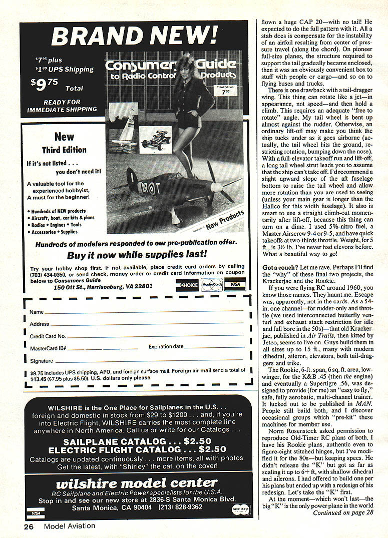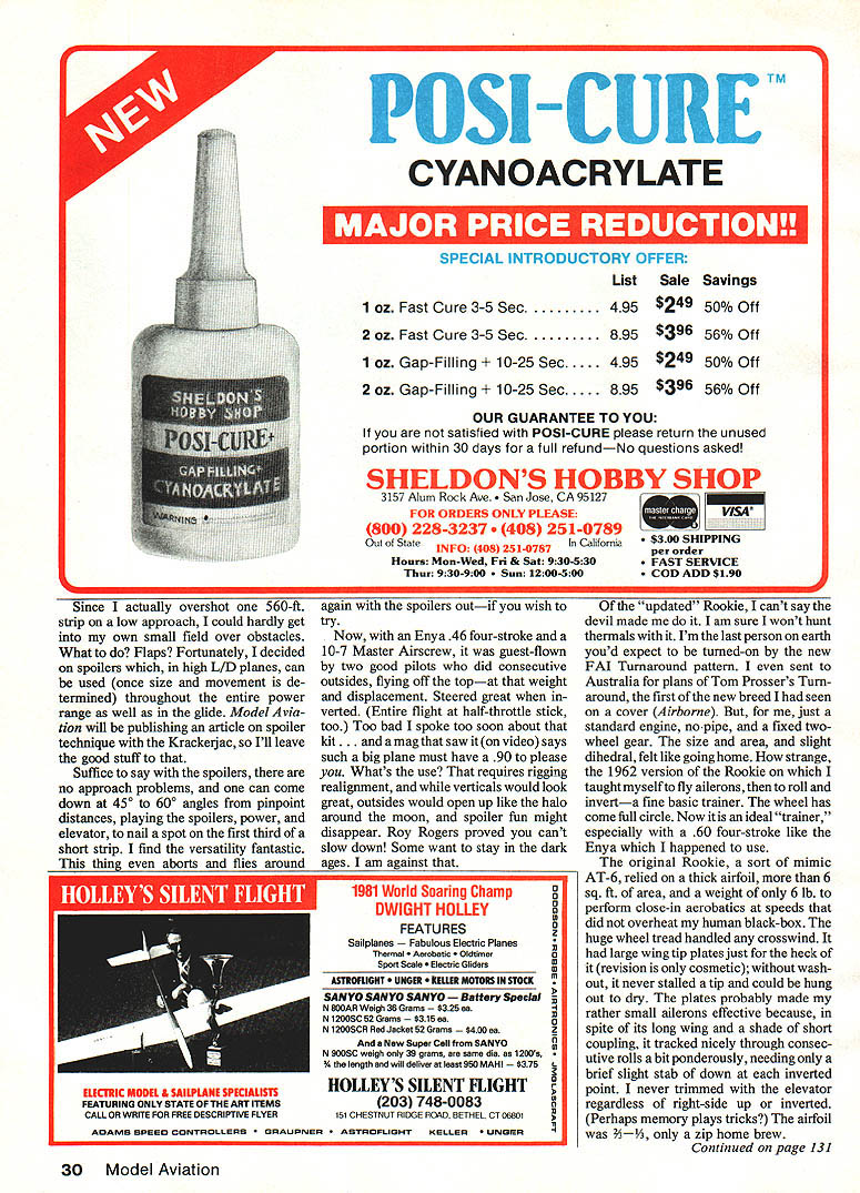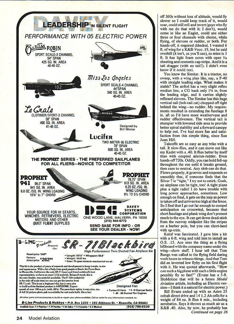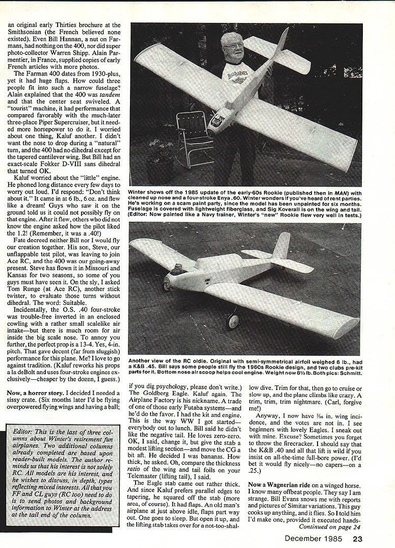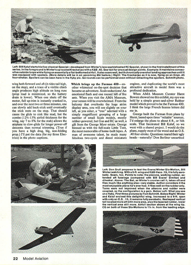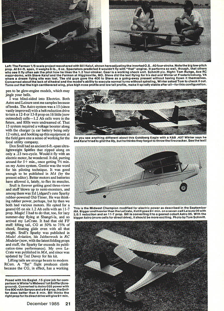 Bill Winter mane Talk AUTHORS NOTE Madness some submitted collection like old Fun column would have mut tered good Lord Being asked talk about retirement airplanes forgetting flock birds first two articles last roundup makes wonder What am doing Elec trics flying wings updated Rookie Scale sport have got kidding have no delusions about designer stuff Ialways believed good covering job can hide multitude sins As Mae West said Goodness nothing deane Thepoint would modeling can enchantment gets pried out locked-in special ization Electrics Five years ago would have caught dead notion motor rather engine pile dead weight battery cells Now Electrics make wonder occasionally kicking up ones heels good modeling soul Having built models 58 years find activity awesome have looked too Datsun ads told stupid things did beginning simple Electrics just flip switch fly intelligent AMAers would drum out corps An Electric simpleI think People write much about us scared death Just few paragraphs should supply enough A-B-Cs gorilla 10-mm flight Writing about own Electrics probably confuse novitiates columnists put together Manufacturers refer Winter syndrome like convenience almost-anywhere flying sites non-offending noise~ stirs no piranha neighbors like sail high wide handsome much duration can milked get back beauty Free Flight spirit sort before atomic power javelin launch es intimidated gentle soul like leis urely long climbs long glides occasional thermal flightinfinitely supe rior Valium pictures show briefly three innocent ships Two hap20 Model Aviation Bills first test flight parasol wing version LeCrate went nine-plus minutes followed hops 11 14 minutes parasol version requires being sticks much cabin version goes hands off once trimmed due its deeper forward profile dihedral required parasol side profile Bill getting quite similar flight duration direct drive Astro cobalt 05 7-4 prop Schmitt plc Five years ago Winter says Electrics left him coldbut now says its like going home again come having flown Free Flight since 1952 cant get enough watching minutes long slow cir cling glides enjoys after leisurely 5-to 8-mm climb electric motor Sailplanes cant use hi-starts parking lots other odd flying places refuses walking between flights LeCrate starts upon what Bill calls Siesta-Max Plc Tom Schmitt LeCrate planswere published MA shown conversion cabin ship light weight sheeting Model shown has sheetaddition thefin Late evening duration 1030 low drag wheels prop brake would add minute two Kit version eliminated cosmetic wing cutout extended thetop longeron wing TE stab LE Left Farman 1/5-scale project shared Bill Kaluf shown hereadjusting inverted 0S 40 four-stroke Notethe big low-pitch prop 6-ft span weighs 6 lb 6 oz Spectators predicted wouldnt fly engine performs well though others see fly often ask pilot likes 12 four-stroker Gear working shock unit Schmitt plc Right Tom Runge Ace RC major-domo Steve Kaluf Farman Higginsvllle MO Steve did test flying dad Winter Fredericksburg VA dream flying site lost old guys gave 400 Steve going-away present having flown themselves Concerned about lack dihedral models ability execute normal turns spiraling Winter asked Tom check out Turns outthat high cantlievered wing plus high nose profile iowtail profile make spirally stable after allforthis configuration pen glow-engine models may jingle bells blind-sided Electrics Both Astro Leisure sent samples because books Astro system 15 since vastly improved belt reduction drive turn 12-8 13-8 prop 16 little now outmoded cellsi 2 Ah cells future 800s undreamed 15 system required voltage booster along charger car battery being 12 volts hooking up equipment field gave sense working local utility company Don Srull ancient 6-ft-span ultralightweight Spitfire zipped along 23 two-cycle Would fly electric motor wondered did purring around 5 min once getting 7 mm Astro system Gentle word piloting technique good enough published MA present editor Better motors batteries have allowed lately flex its muscles Srull forever getting good three-views stuff blown up semi-monsters among Ed Lidgards cute Sparky rubber-powered Old-Timer think ing rubber power perhaps both various motors opted geared 05 six 12 Ah cells 11-7 prop Magic too lazy summer-day flying Shangri-la arrived LeCrate old FF stuff lifting tail CG 50% 75% chord floating glide weight Srulls Sparky published Model Aviation Jabberwock RC Modeler now latest folding props stuff Sparky far exceeds its publi cation-time performance own Le Crate published MA since updated Ted Davey kit Lifting tails strange beasts modem RCers flat flight produces climb because CG effect has working Posed Eaglet 15 glow job com parison Winters Midwest ASnifferforeground Converted Astro 035 power five 800 mAh Sanyos 6-4 prop Snif fer does better 8 mm Bill thinks right propfor itsdirectdrivewiil give 9 mm December 1985 21 see anything different about Goldberg Eagle K&B 40 Winter says Kaluf tried gild lily thinksthey forgotto throwthe firecracker Seethetext Midwest Champion modified siectric power oescriued mc oeptember MA Bigger heavierthan LeCrate still goes 9 mm seven-cell LeisureOS 361 reduction 11-7 prop Bill converting geared cobalt Astro 05 biggerAstro cells direct drive should exciting Photo byTom Schmitt Left Bill Kaluf starts five-channel Specialdeveloped Winters less sophisticated RC Special shown first instailmentof series theforeground Winters up-scaled Krackerjac K&B AO Seetextfor unusual design points Example maintainsconsec utive outside loopswhileflying essentiallya flat-bottomed airfoil Italso soarswell itchronicallyovershot landing approaches until equipped spoilers details will upcoming MA feature Right Krackerjac now flying Enya 45 four-stroker Spoilers can seen flyby plc Go-rounds can performed retracting spoilers Schmitt photo wing both forward aft rides tail high step trace visible climb angle produces high altitude long runs prop load minimized battery drain lower shuts of