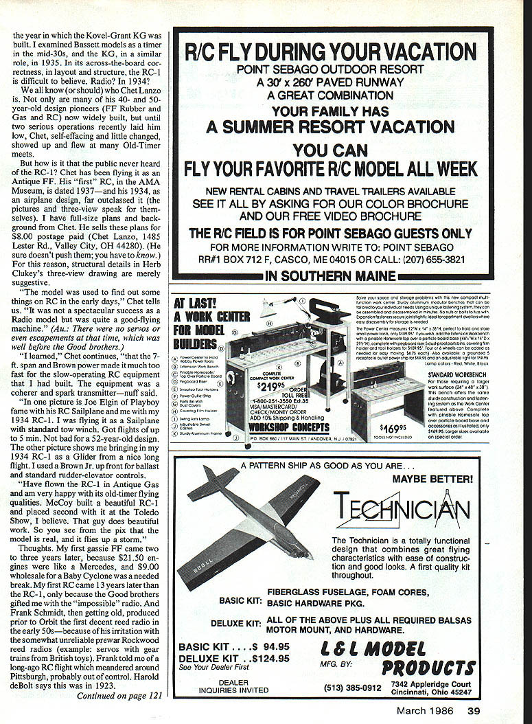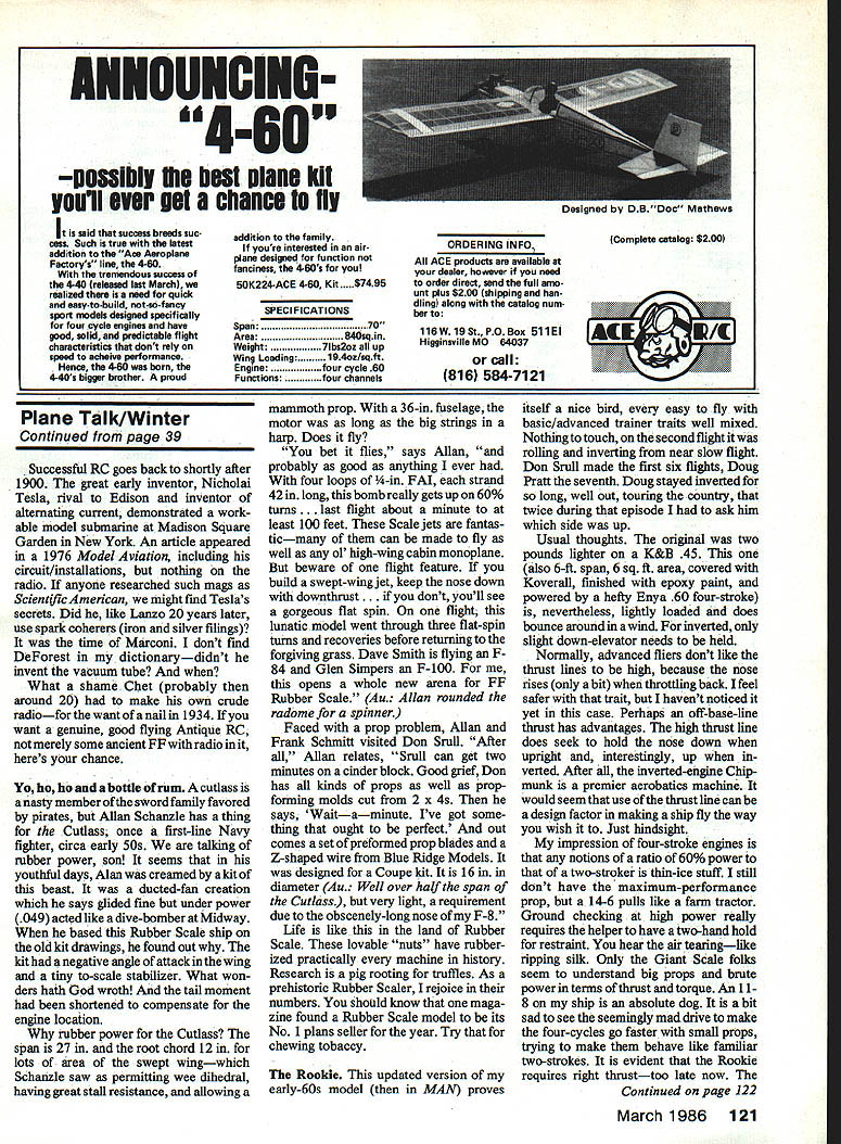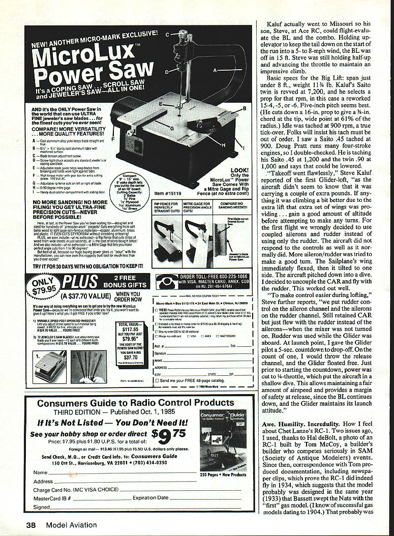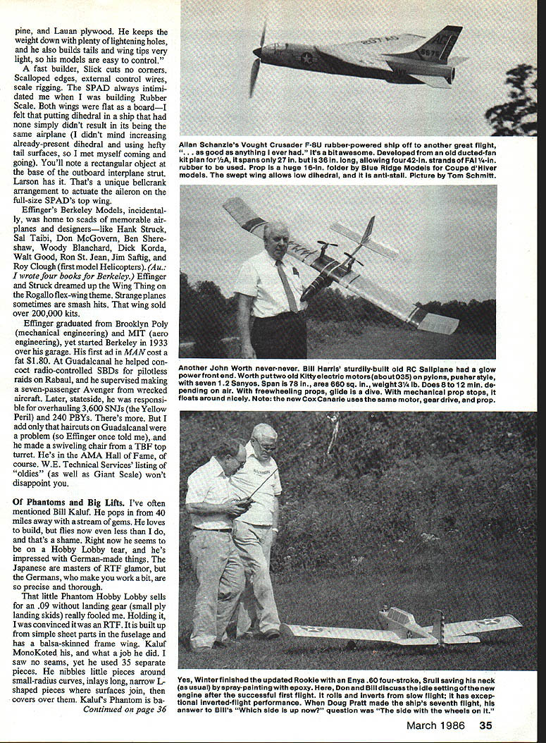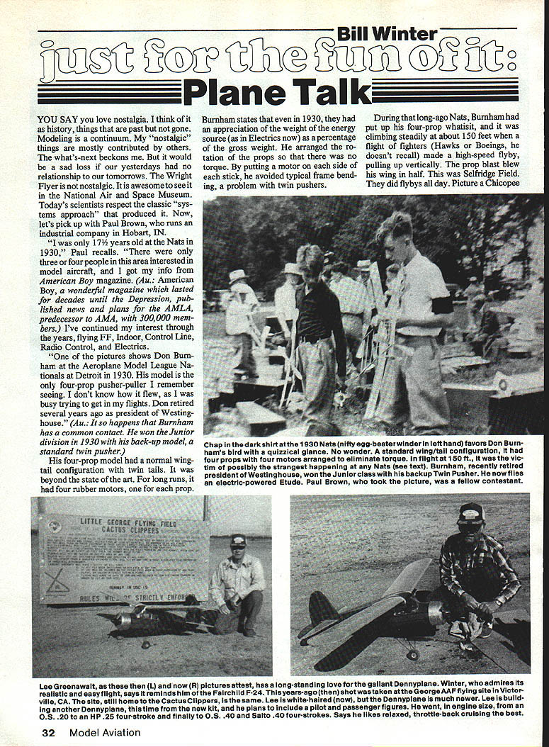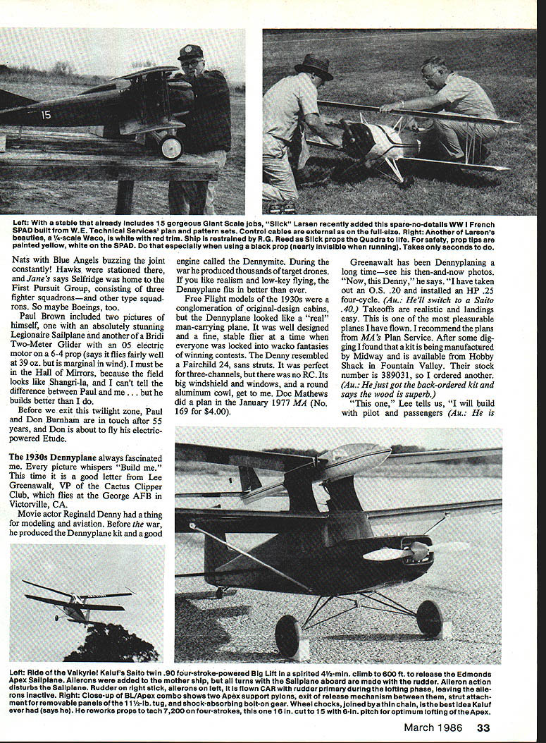 Bill Winter _____ fl3g ______Plane Talk YOU SAY love nostalgia think history things past gone Modeling continuum nostalgic things mostly contributed others whats-next beckons would sad loss yesterdays no relationship tomorrows Wright Flyer notnostalgic Itis awesome see National Air Space Museum Todays scientists respect classic sys tems approach produced Now lets pick up Paul Brown runs industrial company Hobart IN Iwas 17 years old Nats 1930 Paul recalls three four people area interested model aircraft got info American Boy magazine Au American Boy wonderful magazine lasted decades until Depression pub lished news plans AMLA predecessor AMA 300000 mem bers Ive continued interest through years flying FF Indoor Control Line Radio Control Electrics pictures shows Don Burnham Aeroplane Model League Na tionals Detroit 1930 model four-prop pusher-puller remember seeing dont know flew busy trying get flights Don retired several years ago president Westing house Au happens Burn ham has common contact won Junior division 1930 back-up model standard twin pusher four-prop model normal wingtail configuration twin tails beyond state art long runs four rubber motors prop Burnham states 1930 appreciation weight energy source Electrics now percentage gross weight arranged ro tation props no torque putting motor side stick avoided typical frame bend ing problem twin pushers During long-ago Nats Burnham put up four-prop whatisit climbing steadily about 150 feet flight fighters Hawks Boeings doesnt recall made high-speed flyby pulling up vertically prop blast blew wing half Selfridge Field did flybys day Picture Chicopee Lee Greenawalt L now R pictures attest has long-standing love forthe gallant Dennypiane Winter admires its realistic easyflight says reminds him Fairchild F-24 Thlsyears-ago shot wastaken atthe GeorgeAAF flying site Victor yule CA site stlii home Cactus Clippers same Lee white-haired now Dennyplane much newer Lee build ing another Dennyplane time new kit plans includes pilot passenger figures went engine size 05 20 HP 25 four-stroke finally 05 40 Saito 40 four-strokes Says ilkes relaxed throttle-back cruising best 32 Model Aviation Chap dark shirt atthe 1930 Nats nitty egg-beaterwinder left hand favors Don Burnhams bird quizzical glance No wonder standard wing/tail configuration four props four motors arranged eliminate torque flight 150 ft vic tim possibiy strangest happening Nate see text Burnham recently retired president Westinghouse won Junior class backupTwin Pusher now flies electric-powered Etude Paul Brown took picture fellow contestant Left stable already includes 15 gorgeous Giant Scale jobs Slick Larsen recently added spare-no-details WW French SPAD built WE Technical Services plan pattern sets Control cables external full-size Right Another Larsens beauties 14-scale Waco white red trim Ship restrained RG Reed Slick props Quadra life safety prop tips painted yellow white SPAD especially using black prop nearly invisible running Takes seconds Nats Blue Angels buzzing joint constantly Hawks stationed Janes says Selfridge home First Pursuit Group consisting three fighter squadronsand other type squad rons So maybe Boeings too Paul Brown included two pictures himself absolutely stunning Legionaire Sailplane another Bridi Two-Meter Glider 05 electric motor 6-4 prop says flies fairly well 39 oz marginal wind must Hall Mirrors because field looks like Shangri-la cant tell difference between Paul lds better Before exit twilight zone Paul Don Burnham touch after 55 years Don about fly electricpowered Etude 1930s Dennypiane always fascinated picture whispers Build time good letter Lee Greenawalt VP Cactus Clipper Club flies George AEB Victorville CA Movie actor Reginald Denny thing modeling aviation Before war produced Dennyplane kit good engine called Dennymite During war producedthousands target drones like realism low-key flying Dennyplane fits better ever Free Flight models 1 930s conglomeration original-design cabins Dennyplane looked like real man-carrying plane well designed fine stable flier time everyone locked wacko fantasies winning contests Denny resembled Fairchild 24 sans struts perfect three-channels no RC Its big windshield windows round aluminum oowl get Doc Mathews did plan January 1977 MA No 169 $400 Greenawalt has Dennyplaning long timesee then-and-now photos Now Denny says have taken out OS 20 installed HP 25 four-cycle Au Hell switch Saito 40 Takeoffs realistic landings easy pleasurable planes have flown recommend plans MA s Plan Service After some dig ging found kit being manufactured Midway available Hobby Shack Fountain Valley stock number 389031 O ordered another Au just got back-ordered kit says wood superb Lee tells us will build pilot passengers Au Left Ride Vaikyrie KaiufsSaito twin 90 four-stroke-powered Big Lift spirited 41/2-min climb 800 ft release Edmonds Apex Sailplane Ailerons added mother ship turns Sailplane aboard made rudder Aileron action disturbs Sailpiane Rudder right stick ailerons left flown CAR rudder primary during lofting phase leaving aile rons inactive Right Close-up EL/Apex combo shows two Apex support pylons exit release mechanism between strut attach ment fo removable panels 11 1/2-ib tug shock-absorbing bolt-on gear Wheel chocks joined bya thin chain isthe best idea Kaluf ever says reworks props tach 7200 four-strokes 16 cut 15 8-in pitch optimum lofting Apex March 1986 33 THIS 1934 7 FREE FLIGHT DESIGN WAS ALSO FLOWN RC thinking now carrying disk camera servo-operated mini-cassette pro duce tower chatter am thinking 05 40 four-cycle will give shorter takeoff mnand throttle back fun fly ing now wants Saito 40 Denny certainly does require ailerons could added easily Flaperons maybe Dihedral overdone Greenawalts club Cactus Clippers does displays demos both big base Apple Valley Airport Open House have good lot people club Lee tells us allow no foolishness field Everyone very safety-minded have no aircraft vs people vehicles can recal