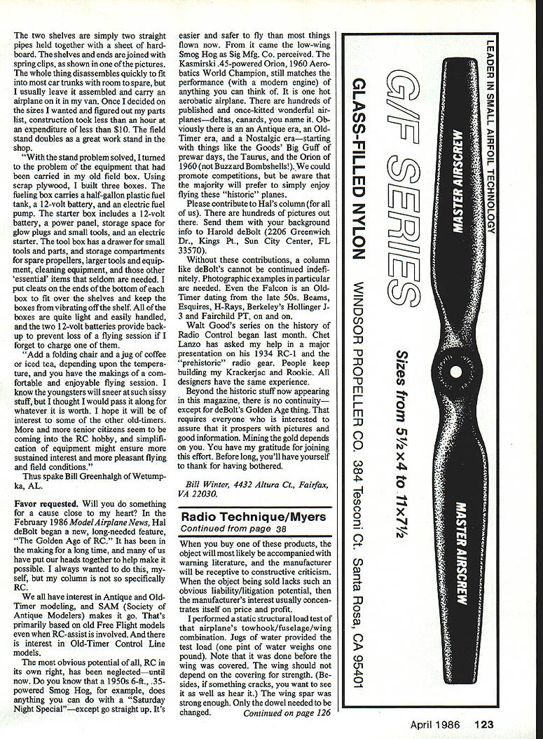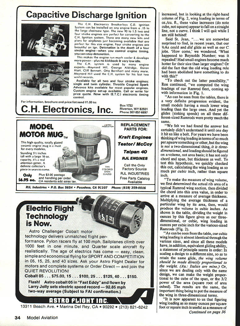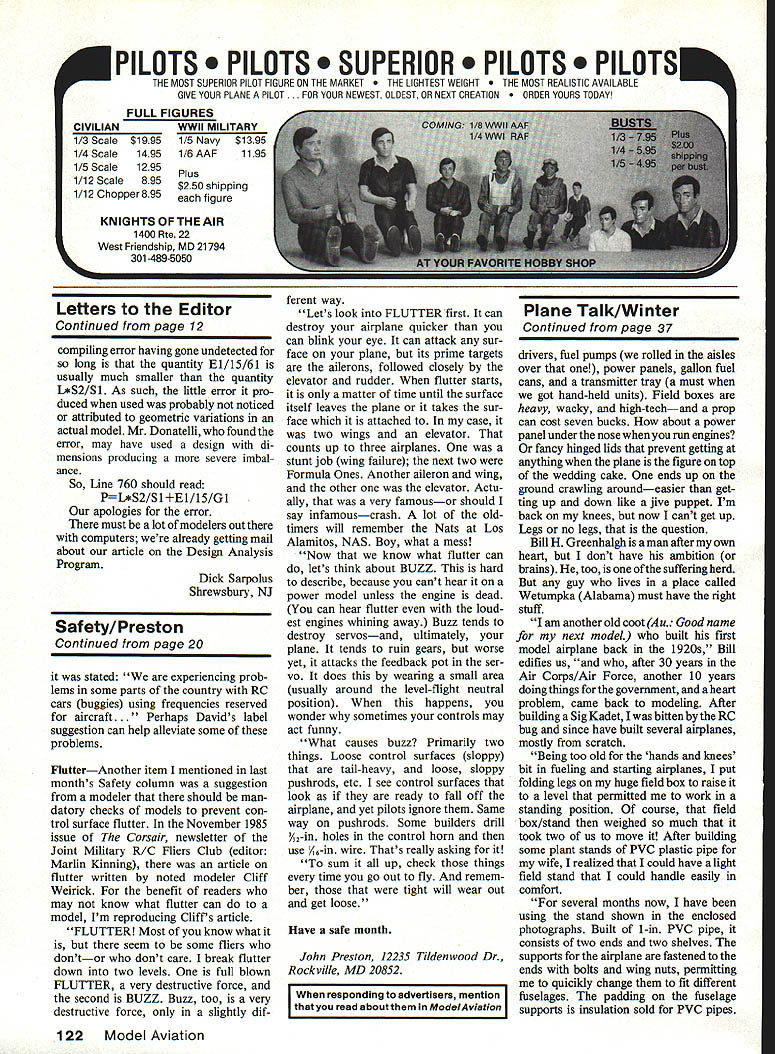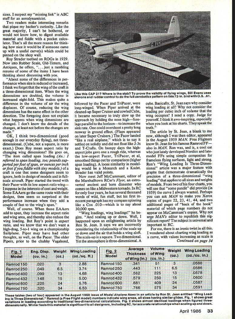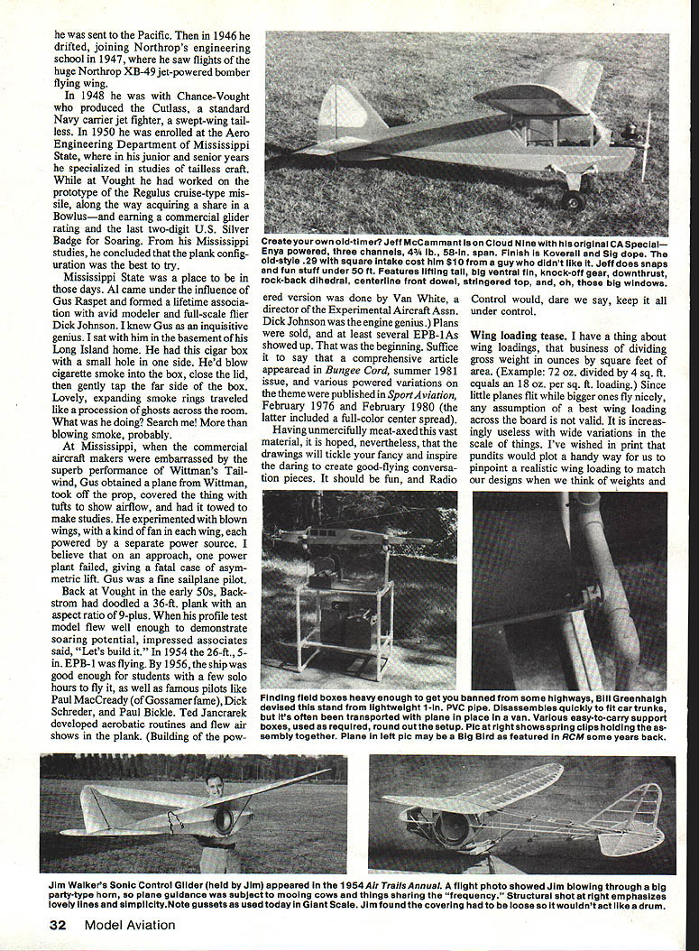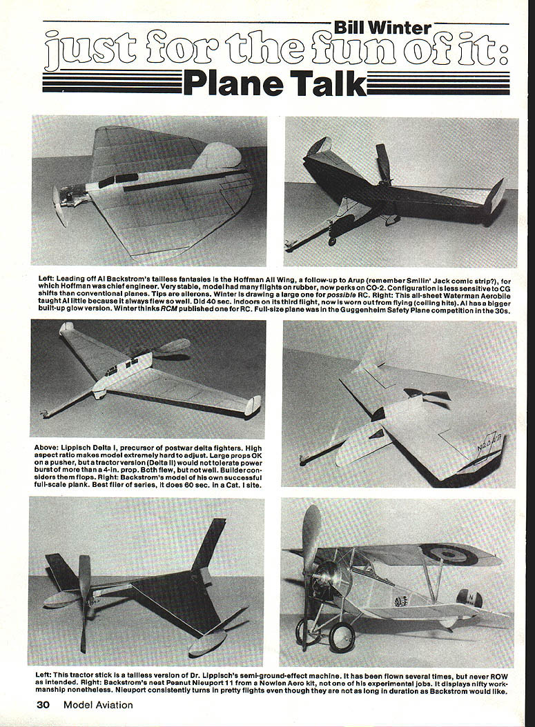 Bill Winter _____T12ILX E1Z0 0 Plane Talk Left Leading off Al Backstroms tailless fantasies Hoffman Wing follow-up Arup remember Smilin Jack comic strip Hoffman chief engineer Very stable model manyflights rubber now perks CO-2 Configuration less sensitive CG shifts conventional planes Tips ailerons Winter drawing large possible RC Right all-sheet Waterman Aerobile taughtAl iittl@ because always flew well Did 4Osec indoors its third flight now worn out flying ceiling hits Al has bigger built-up glow version Winterthinks RCM published RC Full-size plane Guggenheim Safety Plane competition 30s Above Lipplach Delta precursor postwar delta fighters High aspect ratio makes model extremely hard adjust Large props OK pusher tractor version Delta II would tolerate power burstof a4-in prop Both flew notwell Buildercon alders flops Right Backatroms model own successful full-scale plank Best flier series does 60 sec Cat site Left tractor stick isa tailless version Dr Lippiachs semi-ground-effect machine has flown several times never ROW Intended Right Backatroms neat Peanut Nicuport 11 Nowlen Aero kit experimental jobs displays nifty work manship nonetheless Nieuport consistently turns pretty flights though long duration Backatrom would like 30 Model Aviation L1JiJ~ FIG NOTE Long short wing versions FIG C 11 III / I/ Final version Backstroms pusher-engined plank has 110 flIght hours Insert side view tip fin isa drag rudderwhich hinges outward Dick Johnsons engine concept 16- 20-hp twin belt-driven countershaft top-mounted prop larger side view shows reflex alrfoli pusher props thrust line I Future possIbilities could include twin having delta-shaped center section area profile sketch shows airfoils thrust lines As planned two Johnsons twin-cylinder engines would used turning singie-biaded Evereil propellers TWILIGHT ZONE Lincoln Beachey glamour pilot early century said Give barn door Twill fly Al Backstrom would horrified being compared immortal Beachey indeed quite mortalgoing out boots thrilling multitudes San Francisco Golden Gate Exposition 1915 Al designs flies full-scale planks Planks go way back notably Europe Backstroms addiction finicky birds both gliders powered has found attention home-builders long involvement fringe-stuff models similarly reflects lifetime fascination gliders tailless aircraft Whats plank As see drawings plank usually paralleledged wing tailless generally assumed have no sweep heavily reflexed airfoil makes stable Well concentrate full-scale work Backstrom friends Backstrom finds No-Cal rubber-pow ered quickies especially useful look bit rough dont fooled include Nieuport 11 Peanut show capability modeling approach no fuss no feathers modeling inspired Air Trails late 30s AT covers things like Zanonia Bowlus sailplanes fired imagination articles about Northrop wings other novelties such Waterman Arrowbile convinced him such designs would fly models During epic interruption NW II became first student proposed gliding school shootingwas overthatfallofl945but EPB-iC 1965FiG D Al Cleaves 1965 modifications Backstroms 1954 EPB-1 glider uses center fin/rudder Winter says guestimating sport model hed expect CG close 15% chord hed use 5 dihedrai three-channel version 3 ailerons used modei would probably need aft vertical area especially ailerons April 1986 31 sent Pacific 1946 drifted joining Northrops engineering school 1947 saw flights huge Northrop XB-49 jet-powered bomber flying wing 1948 Chance-Vought produced Cutlass standard Navy carrier jet fighter swept-wing tail less 1950 enrolled Aero Engineering Department Mississippi State junior senior years specialized studies tailless craft Vought worked prototype Regulus cruise-type mis sile along way acquiring share Bowlusand earning commercial glider rating last two-digit US Silver Badge Soaring Mississippi studies concluded plank config uration best try Mississippi State place days Al came under influence Gus Raspet formed lifetime associa tion avid modeler full-scale flier Dick Johnson knew Gus inquisitive genius sat him basement Long Island home cigar box small hole side Hed blow cigarette smoke box close lid gently tap far side box Lovely expanding smoke rings traveled like procession ghosts across room What doing Search blowing smoke probably Mississippi commercial aircraft makers embarrassed superb performance Wittmans Tailwind Gus obtained plane Wittman took off prop covered thing tufts show airflow towed make studies experimented blown wings kind fan wing powered separate power source believe approach power plant failed giving fatal case asym metric lift Gus fine sailplane pilot Back Vought early SOs Backstrom doodled 36-ft plank aspect ratio 9-plus profile test model flew well enough demonstrate soaring potential impressed associates said Lets build 1954 26-ft 5in EPB-1 flying 1 956the ship good enough students few solo hours fly well famous pilots like Paul MacCready Gossamer fame Dick Schreder Paul Bickle Ted Jancrarek developed aerobatic routines flew air shows plank Building powered version done Van White director Experimental Aircraft Assn Dick Johnson engine genius Plans sold least several EPB-1As showed up beginning Suffice say comprehensive article appearead Bungee Cord summer 1981 issue various powered variations theme published SportAviation February 1976 February 1980 latter included full-color center spread Having unmercifully meat-axed vast material hoped nevertheless drawings will tickle fancy inspire daring create good-flying conversa tion pieces should fun Radio Control would dare say keep under control Wing loading tease have thing about wing loadings business dividing gross weight ounces square feet area Example 72 oz divided 4 sq ft equals 18 oz per sq ft loading Since little planes flit bigger ones fly nicely assumption best wing loading across board valid increas ingly useless wide variations scale things Ive wished print pundits would plot handy way us pinpoint realistic wing loading match desi
