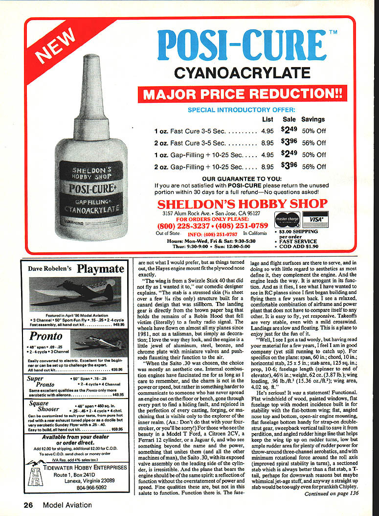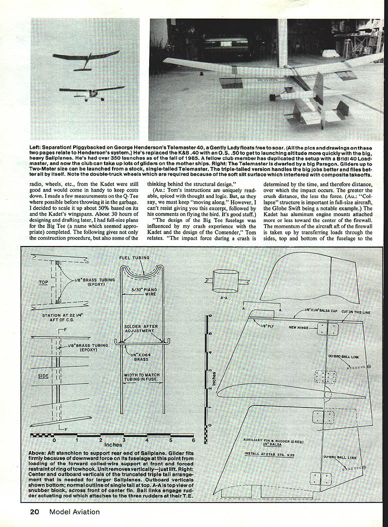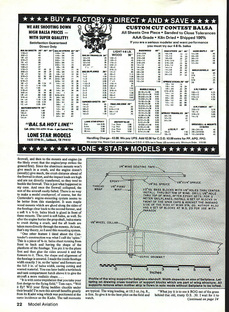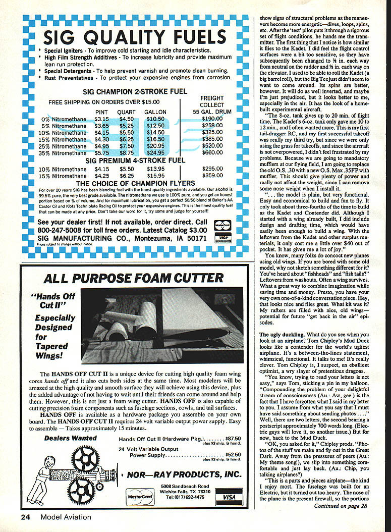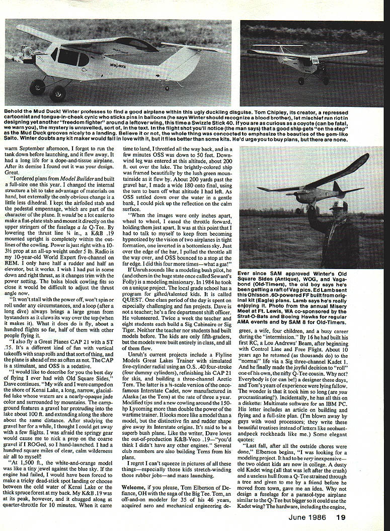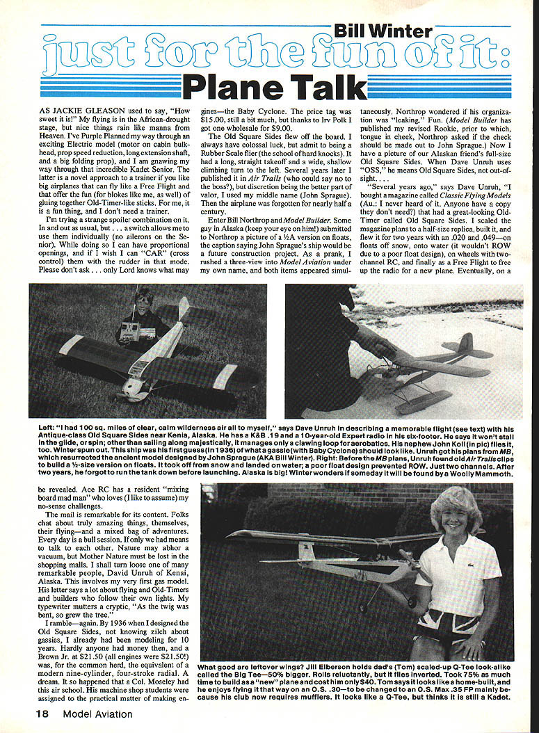 Bill Winter 0 K Plane TalL AS JACKIE GLEASON used say sweet flying African-drought stage nice things rain like manna Heaven Ive Purple Planned way through exciting Electric model motor cabin bulk head prop speed reduction long extension shaft big folding prop sin gnawing way through incredible Kadet Senior latter novel approach trainer like big airplanes can fly like Free Flight offer fun blokes like well gluing together Old-Timer-like sticks fun thing dont need trainer Im trying strange spoiler combination out usual tch allows use individually no ailerons Se nior doing can have proportional openings wish can CAR cross control rudder mode Please dont ask. Lord knows what may ginesthe Baby Cyclone price tag $1500 still bit much thanks Irv Polk got wholesale $900 Old Square Sides flew off board always have colossal luck admit being Rubber Scale flier school hard knocks long stralght takeoff wide shallow climbing turn left Several years later published Air Trails could say no boss discretion being better part valor used middle name John Sprague airplane forgotten nearly haIfa century Enter Bill Northrop ModelBuilder Some guy Alaska keep eye him submitted Northrop picture version floats caption saying John Spragues ship would future construction project As prank rushed three-view Model Aviation under own name both items appeared simul taneously Northrop wondered organiza tion leaking Fun Model Builder has published revised Rookie prior tongue cheek Northrop asked check should made out John Sprague Now have picture Alaskan friends full-size Old Square Sides Dave Unruh uses OSS means Old Square Sides out-ofsight . Several years ago says Dave Unruh bought magazine called Classic Flying Models Au never heard Anyone have copy dont need great-looking OldTimer called Old Square Sides scaled magazine plans half-size replica built flew two years 020 049on floats off snow onto water wouldnt ROW due poor float design wheels twochannel RC finally Free Flight free up radio new plane Eventually Left 100 sq miles clear calm wilderness air myself says Dave Unruh describing memorable flight see text Antique-class Old Square Sides near Kenla Alaska has K&B 19 1 0-year-oid Expert radio six-footer says wont stall glide spin otherthan sailing aiong majesticaliy manages clawing loop forasrobatics nephewJohn Koll plc flies too Winterspun out ship hisfirst guess 1938 whata gassie BabyCyclone should iook ilke Unruh got plansfrom MB resurrected ancient model designed byJohn Sprague AKA Bill Winter Right BeforetheMB plans Unruh found oidAir Trails clips build 1/2-size version floats took off snow landed water poor float design prevented ROW Just two channels After two years forgot run tank down before launching Alaska big Winterwonders someday will found Wooily Mammoth revealed Ace RC has resident mixing board mad man loves like assume no-sense challenges mail remarkable its content Folks chat about truly amazing things themselves flyingand mixed bag adventures day bull session means talk other Nature may abhor vacuum Mother Nature must lost shopping malls shall turn loose remarkable people David Unruh Kenai Alaska involves very first gas model letter says lot about flying Old-Timers builders follow own lights typewriter mutters cryptic As twig bent grew tree rambleagain 1936 designed Old Square Sides knowing zilch about gassies already modeling 10 years Hardly anyone money Brown Jr $2150 engines $2150 common herd equivalent modern nine-cylinder four-stroke radial dream happened Col Moseley air school machine shop students assigned practical matter making en18 Model Aviation wna gooa ietover wingst Jiii ioerson noias asas omj scaica-up u-ice lOOK-aliKe called Big Tee50% bigger Rolls reluctantiy flies inverted Took 75% much timeto build asa new planeand costhim oniy$40 Tom says looks iikea home-built enjoys flying way 0S 30to changed OS Max 35 FP mainly cause club now requires mufflers looks like 0-Tee thinks stili Kadet Behold Mud Duck Winter professes find good airplane within ugly duckling disguise Tom Chipley its creator repressed cartoonist tongue-in-cheek cynic sticks pins balloons says Winter should recognize blood brother let mischief run riot designing yet another freedom fighter around leftover wing time Swizzle Stick 40 curious coyote can fatal warn mystery unravelled sort text flight shot youll notice man says good ship gets step Mud Duck grooves nicely landing Believe whole thing concocted emphasize beauties gem-like Saito Winter doubts kit maker would fail love it flies betterthan some kits Hed urge buy plans warm September afternoon forgot run tank down before launching flew away long life dope-and-tissue airplane After its demise found out design Great ordered pians ModelBuilder bui full-size year changed internal structure bit take advantage materials hand externally obvious change little less dihedral kept airfoiled stab pedestal empennage part character plane would lot easier make flat-plate stab mount directly upper stringers fuselage la Q-Tee lowering thrust line 19 mounted upright completely within Out lines cowling Power just right 103 prop all-up weight under 5 lb Radio 10-year-old World Expert five-channel REM have half rudder half elevator works wish put some down right thrust changes trim power setting balsa block cowling fits close would difficult adjust thrust angle now wont stall power off wont spin roll under circumstances loop after long dive always brings large groan bystanders claws its way over top makes What does fly about hundred flights far half other people flying also fly Great Planes CAP 21 ST 75 Its different kind fun vertical takeoffs snap rolls sort thing plane ahead ofme often CAP stimulant OSS sedative would like describe best day flying ever Old Square Sides Dave continues wife camped shore Kenal Lake along narrow glacialfed lake waters nearly-opaque jade color surrounded mountains camp ground features gravel bar protruding lake about 100 ft extending along shore about sam
