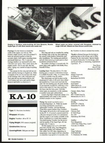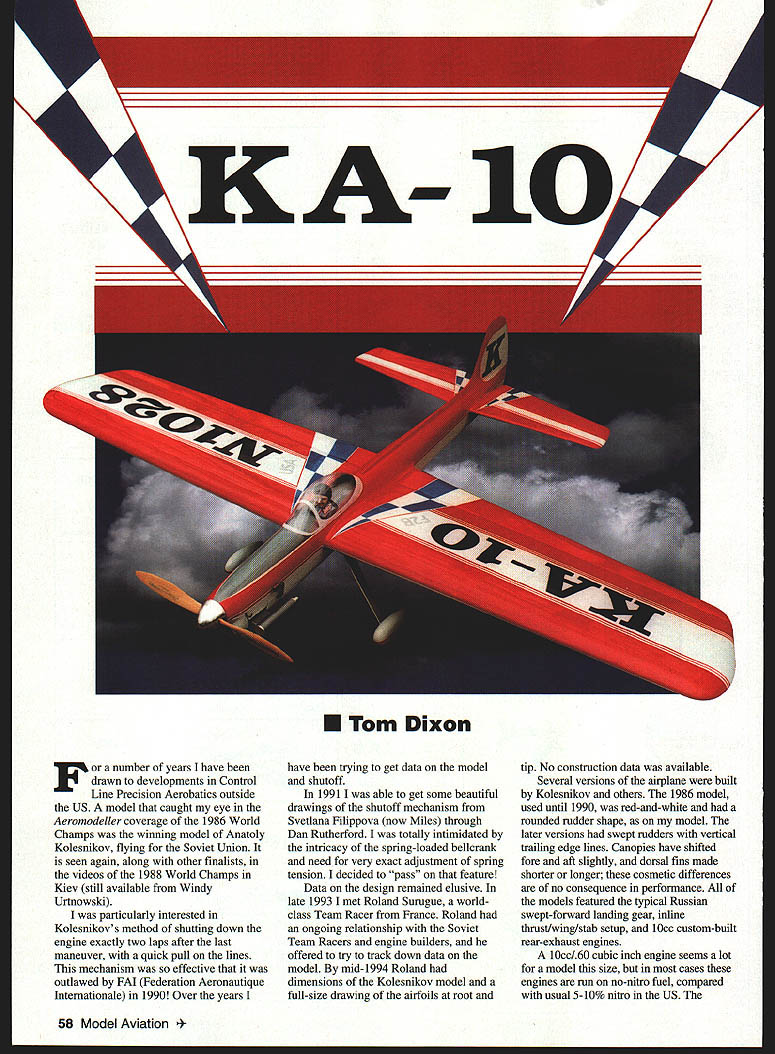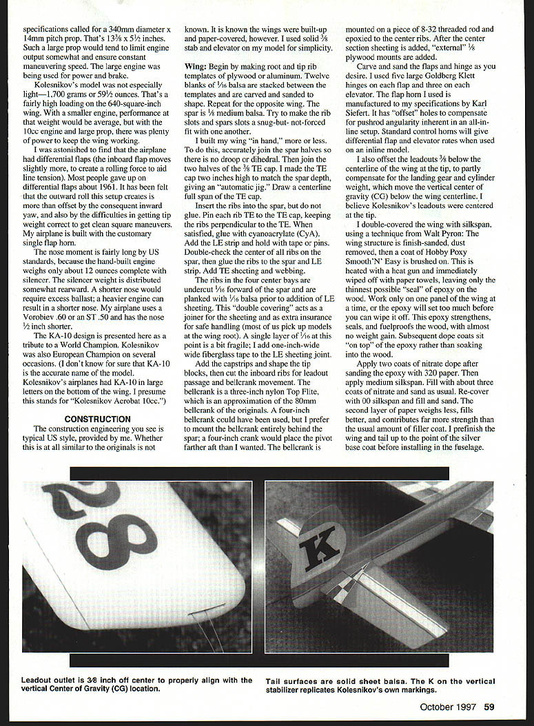 y number years have drawn developments Control Line Precision Aerobatics outside US model caught eye Aeromodeller coverage 1986 World Champs winning model Anatoly Kolesmkov flying Soviet Union seen again along other finalists videos 1988 World Champs Kiev still available Windy Urtnowski particularly interested Kolesnikovs method shutting down engine exactly two laps after last maneuver quick pull lines mechanism effective outlawed FAI Federation Aeronautique Intemationale 1990 Over years have trying get data model shutoff 1991 able get some beautiful drawings shutoff mechanism Svetlana Filippova now Miles through Dan Rutherford totally intimidated intricacy spring-loaded bellcrank need very exact adjustment spring tension decided pass feature Data design remained elusive late 1993 met Roland Surugue worldclass Team Racer France Roland ongoing relationship Soviet Team Racers engine builders offered try track down data model mid-1994 Roland dimensions Kolesnikov model full-size drawing airfoils root tip No construction data available Several versions airplane built Kolesnikov others 1986 model used until 1990 red-and-white rounded rudder shape model later versions swept rudders vertical trailing edge lines Canopies have shifted fore aft slightly dorsal fins made shorter longer cosmetic differences no consequence performance models featured typical Russian swept-forward landing gear inline thrustlwinglstab setup 10cc custom-built rear-exhaust engines lOcc/60 cubic inch engine seems lot model size cases engines run no-intro fuel compared usual 5-10% nitro US 58 Model Aviation 0 U Tom Dixon specifications called 340mm diameter x 14mm pitch prop Thats l3/i X 51/2 inches Such large prop would tend limit engine output somewhat ensure constant maneuvering speed large engine being used power brake Kolesnikovs model especially light1700 grams 591/2 ounces Thats fairly high loading 640-square-inch wing smaller engine performance weight would average 10cc engine large prop plenty power keep wing working astonished find airplane differential flaps inboard flap moves slightly create rolling force aid line tension Most people gave up differential flaps about 1961 has felt outward roll setup creates offset consequent inward yaw also difficulties getting tip weight correct get clean square maneuvers airplane built customary single flap horn nose moment fairly long US standards because hand-built engine weighs about 12 ounces complete silencer silencer weight distributed somewhat rearward shorter nose would require excess ballast heavier engine can result shorter nose airplane uses Vorobiev 60 ST 50 has nose /2 inch shorter KA-lO design presented tribute World Champion Kolesnikov also European Champion several occasions dont know sure KA-lO accurate name model Kolesnikovs airplanes KA-lO large letters bottom wing presume stands Kolesnikov Aerobat 10cc CONSTRUCTION construction engineering see typical US style provided Whether similar originals known known wings built-up paper-covered however used solid 3/ stab elevator model simplicity Wing Begin making root tip rib templates plywood aluminum Twelve blanks 1As balsa stacked between templates carved sanded shape Repeat opposite wing spar 1/g medium balsa Try make rib slots spars slots snug-but- not-forced fit another built wing hand less accurately join spar halves no droop dihedral join two halves 3/ TE cap made TE cap two inches high match spar depth giving automatic jig Draw centerline full span TE cap Insert ribs spar glue Pin rib TE TE cap keeping ribs perpendicular TE satisfied glue cyanoacrylate CyA Add LE strip hold tape pins Double-check center ribs spar glue ribs spar LE strip Add TE sheeting webbing ribs four center bays undercut 1A6 forward spar planked A6 balsa prior addition LE sheeting double covering acts joiner sheeting extra insurance safe handling us pick up models wing root single layer 146 point bit fragile add one-inch-wide wide fiberglass tape LE sheeting joint Add capstrips shape tip blocks cut inboard ribs leadout passage bellcrank movement bellcrank three-inch nylon Top Bite approximation 80mm bellcrank originals four-inch bellcrank could have used prefer mount bellcrank entirely behind spar four-inch crank would place pivot farther aft wanted bellcrank mounted piece 8-32 threaded rod epoxied center ribs After center section sheeting added external 1/i plywood mounts added Carve sand flaps hinge desire used five large Goldberg Klett hinges flap three elevator flap horn used manufactured specifications Karl Siefert has offset holes compensate pushrod angularity inherent all-in line setup Standard control horns will give differential flap elevator rates used inline model also offset leadouts 3/ below centerline wing tip partly compensate landing gear cylinder weight move vertical center gravity CG below wing centerline believe Kolesnikov s leadouts centered tip double-covered wing silkspan using technique Walt Pyron wing structure finish-sanded dust removed coat Hobby Poxy SmoothN Easy brushed heated heat gun immediately wiped off paper towels leaving thinnest possible seal epoxy wood Work panel wing time epoxy will set too much before can wipe off epoxy strengthens seals fuelproofs wood almost no weight gain Subsequent dope coats sit top epoxy rather soaldng wood Apply two coats nitrate dope after sanding epoxy 320 paper apply medium silkspan Fill about three coats nitrate sand usual Re-cover 00 silkspan fill sand second layer paper weighs less fills better contributes far strength usual amount filler coat prefinish wing tail up point silver base coat before installing fuselage October 1997 59 Leadout outlet 38 inch off center properly align theTail surfaces solid sheet balsa K vertical vertical Center Gravity CG locationstabilizer replicates Kolesnikovs own markings Fuselage Cut formers match width engine will use fonners maple mounts cross-grained 1/2 balsa epoxied together form accurate crutch Drill engine mounting holes install 