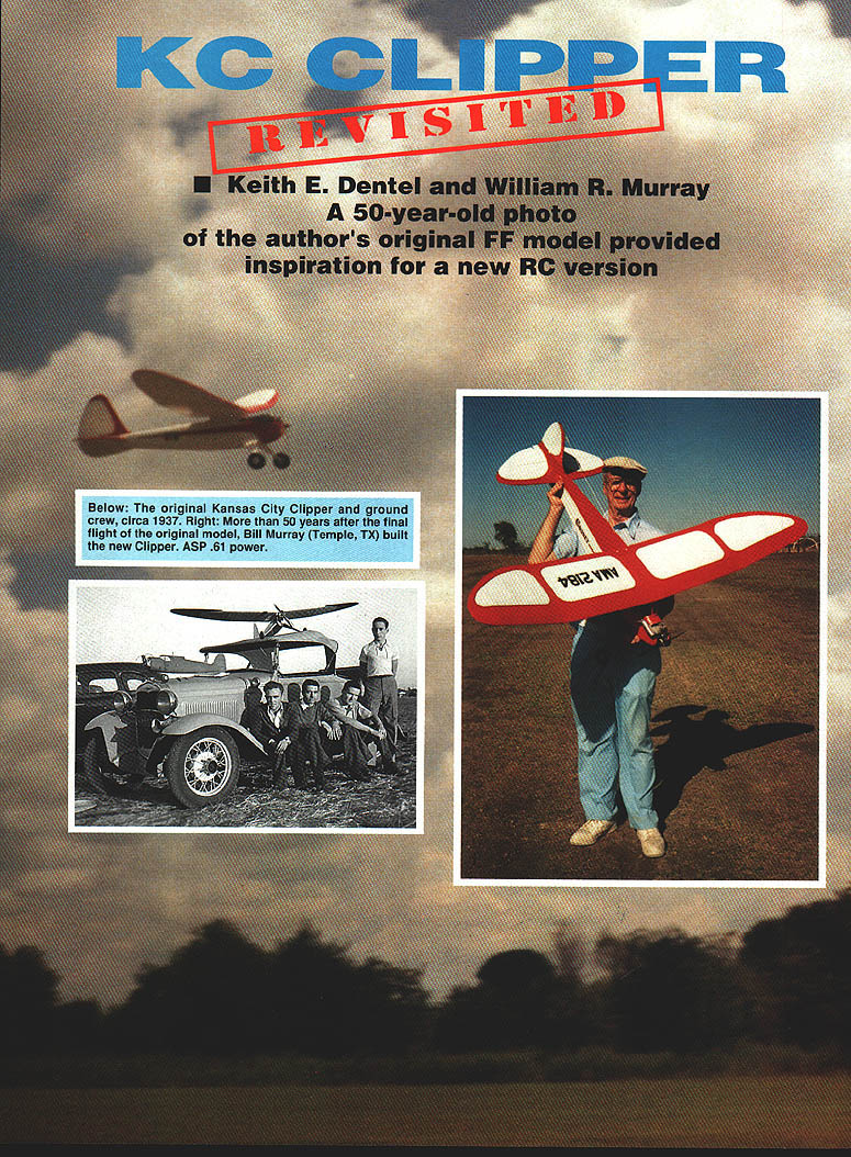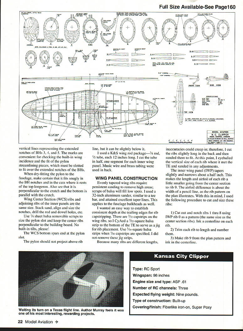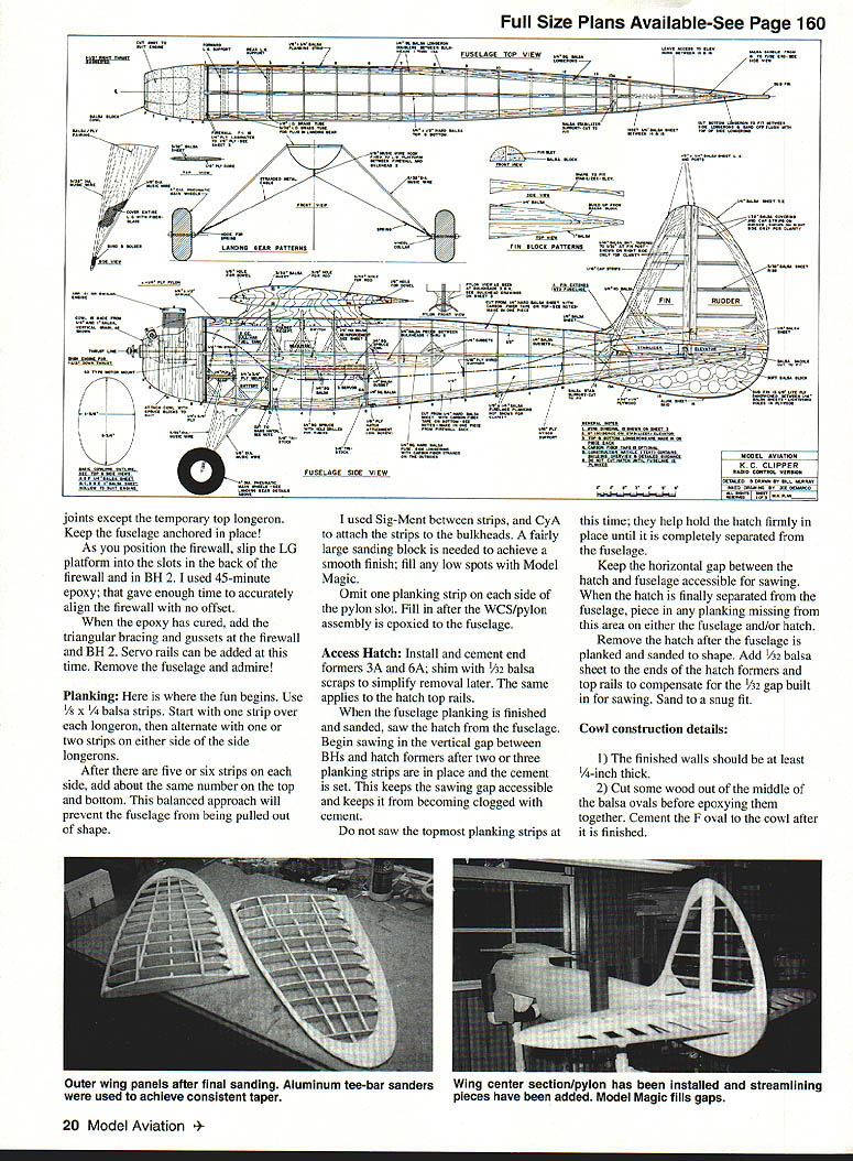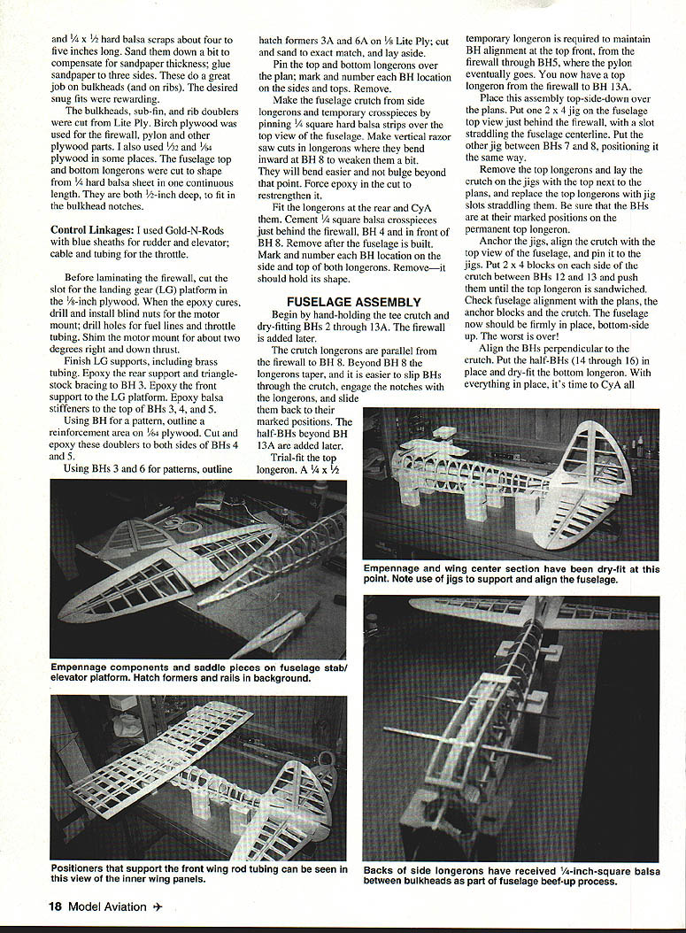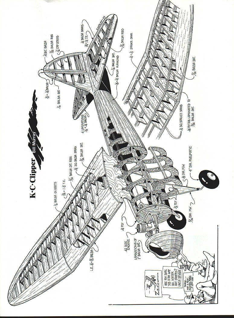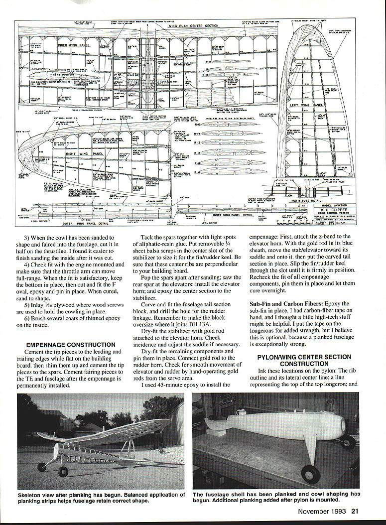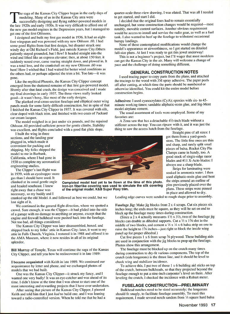 NO OCR TEXT saga Kansas City Clipper began early days modeling us Kansas City area successfully designing flying rubber-powered models late 1 920s early 1 930s very difficult afford new gas model engines Depression years managed get first Ohlssons designed built first gas model 1936 eightfoot wingspan powered new Ohlsson 60 some good flights first design disaster struck windy day Old Richards Field just outside Kansas CityOthers patiently stayed grounded flew headed straight wind lifted like express elevator about 150 feet suddenly nosed over came roaring straight down plowed total loss crankshaft new Ohlsson 60 bent wished waited better wind conditions others perhaps adjusted trim bit Too lateit gone Like mythical Phoenix Kansas City Clipper concept emerged shattered remains first gas-powered model Shortly after fatal crash design conceived made final drawings early 1937 three-views really looked goodit wasnt boxy like early designs planked oval-cross-section fuselage elliptical outer wing panels made some fairly difficult construction spite finished Kansas City Clipper 1937 covered silk clear doped black trim finished two coats Packard car cream lacquer model weighed just under six pounds repaired Ohlsson 60 provided sufficient power gentle climbs Stability excellent flights concluded good flat glide slope built wing three sections landing gear plugged made convenient packing shipping folks shipped model Burbank California gone 1938 complete aeronautical engineering studies Clippers last flight 1939 eyedropper gas should have used climbed its usual gentle angle headed southeast knew right away chase necessary buddy cranked up old Model followed best could lost sight continued general flight direction spotted crowd Sure enough Clipperit glided side garage no damage anything anyone except engine firewall bulkhead pushed back fuselage too bad things considered Kansas City Clipper later disassembled boxed shipped back folks attic Kansas City later went attic Falls Church Virginia restored 1988 offered AMA Museum now resides its original splendor Bill Murray Temple Texas will continue saga Kansas City Clipper tell rediscovered late 1989 became acquainted Keith late 1989 continued acquaintance letter phone exchanged photos models built Kansas City Clipperit struck fancy wanted very badly eye-catcher ahead its time didnt know time about start interesting rewarding projects have ever undertaken After seeing picture Kansas City Clipper phoned Keith told him just build leaning toward radio-controlled version told quarter-scale three-view drawing elated needed get started start did decided original lines remain essentially unchanged some construction changes would requiredmost notably movable control surfaces Another obvious requirement would access install service radio gear well fuel tank also wanted beef up fuselage withstand occasional bumpy landings None contemplated modifications would change models appearance airworthiness got started detailed full-size plans last ready get jewel underway beginners project Ill wager modelers can get Kansas City air will welcome change pace challenge doing something different GENERAL CONSTRUCTION NOTES used tracing paper copy parts plans attached tracings wood 3M spray adhesive paper peels off after cutting time parts should numbered otherwise identified could kit entire model before construction begins Adhesives used cyanocrylates CyA epoxies six- 45minute working times sandable aliphatic-resin glue Sig-Ment model airplane cement usual assortment tools employed Some favorites Zona saw has detachable 4/2-inch blade stiffener across top can ripsaw it just thing saw access hatch fuselage Straight pins sizes got yard-goods store little fine ones thin sharp rarely split small pieces balsa Rocket City Pin Clamps came handy too good stock single-edge razor blades #11 X-Acto blades always use sharp blade Strips laminating soaked ammonia water used aliphatic-resin glue bent strips around outline pins previously placed over plans strips pinned place allowed dry Leading edge curves sanded rough shape prior assembly Fuselage Jig Make jig blocks 2 x 4 scraps Cut six pieces six inches long ends must square will set end block up fuselage times during construction Since 2 x 4 actually measures 11/2 x 3/2 two fuselage jig blocks can double dihedral supports Cut 1/2 x la/s slot middle two blocks cement x balsa strip raise height 1 5A inchesjust right block inside wing panel up proper dihedral Cut five pieces 1 x 6 scrap 3/ plywood building aids used conjunction jig blocks prop up fuselage Photos show arrangement fuselage must blocked up crutch times during construction dry-fit various components top crutch side longerons thrust line should level check wing stabilizer incidence achieve put two 1 x 6 building aid sticks top crutch between bulkheads projected beyond fuselage enough put nine-inch carpenters level After leveling crutch checked incidence Robart meter FUSELAGE CONSTRUCTIONPRELIMINARY Bulkhead notches need sized accurately longerons should fit snugly facilitate fuselage assembly meet requirement made several notch sanders re hard balsa November1993 17 Completed model yet flown time photo Iron-on fiberlike covering used simulate silk covering original model K&B Super Poxy trim 2 hard balsa scraps about four five inches long Sand down bit compensate sandpaper thickness glue sandpaper three sides great job bulkheads nbs desired snug fits rewarding bulkheads sub-fin rib doublers cut Lite Ply Birch plywood used firewall pylon other plywood parts also used A2 /&4 plywood some places fuselage top bottom longerons cut shape balsa sheet continuous length both /2-inch deep fit bulkhead notches Control Linkages used Gold-N-Rods blue sheaths rudder elevator cable tubing throttle Before laminating firewall cut slot landing gear LG platform /8-inch plywood epoxy cures drill install blind nuts motor mount drill holes fuel lines throttle tubing Shim motor mount about two degrees r