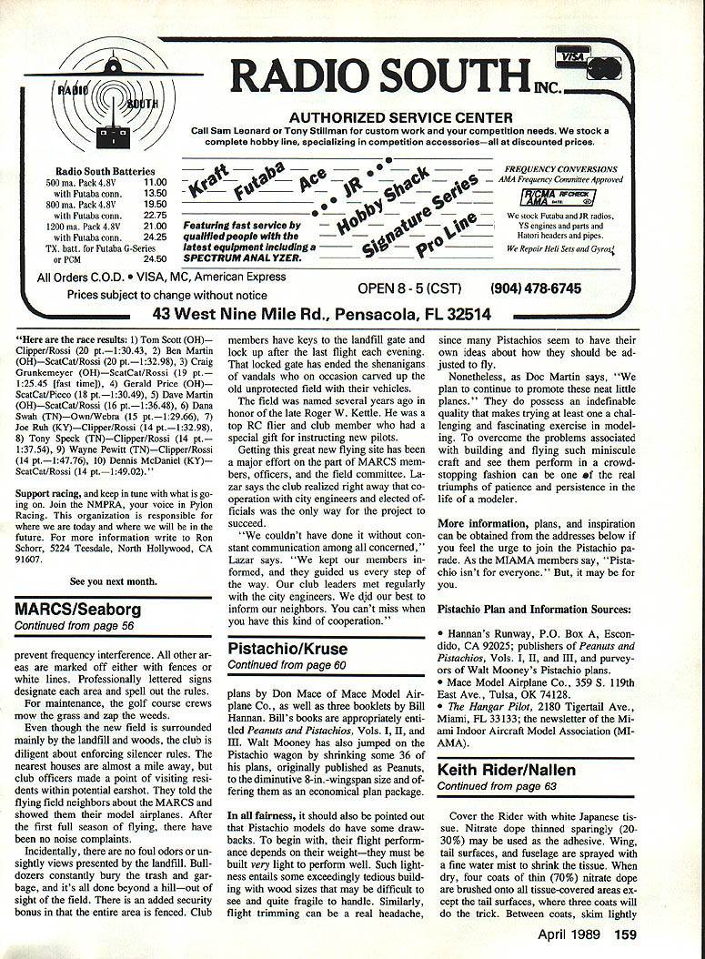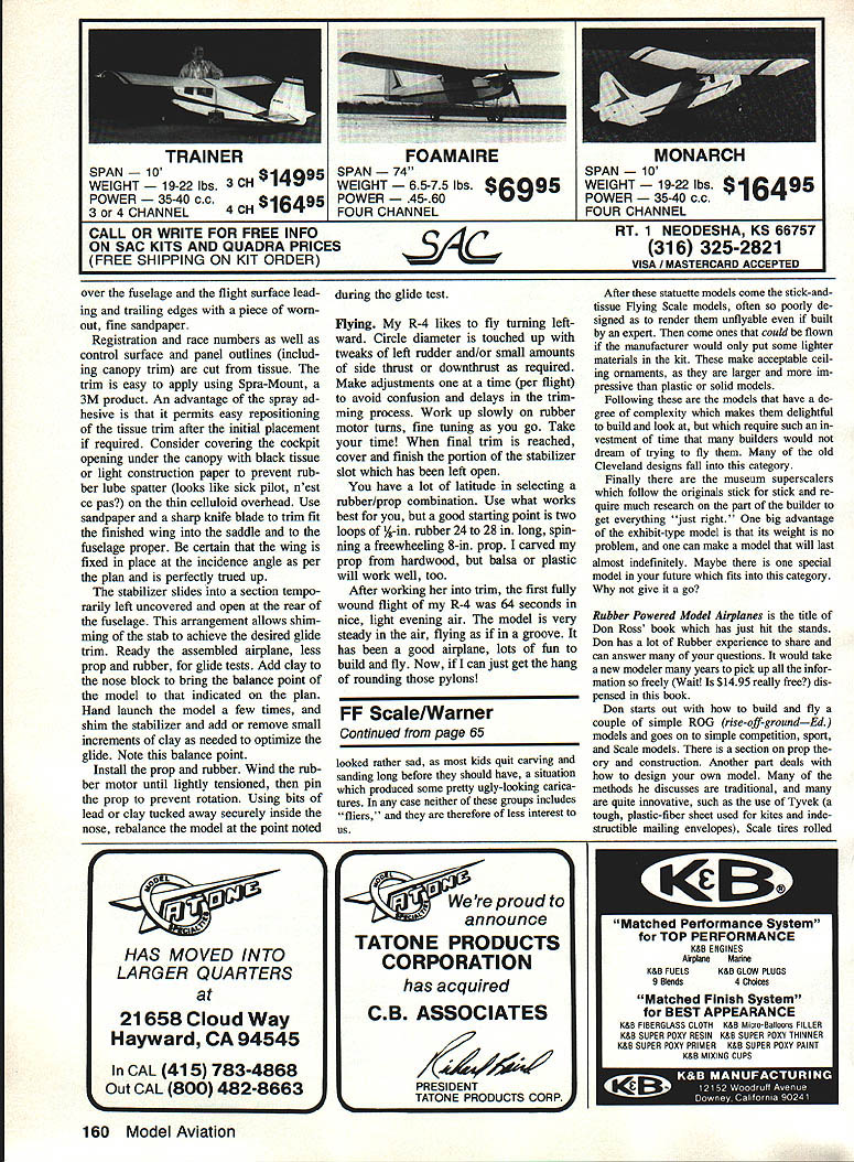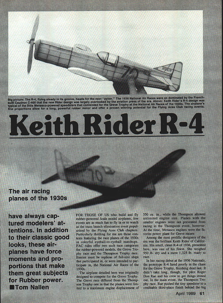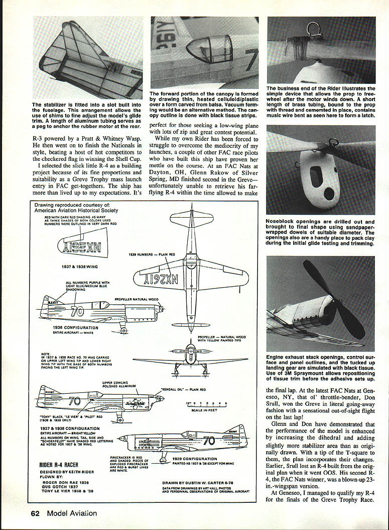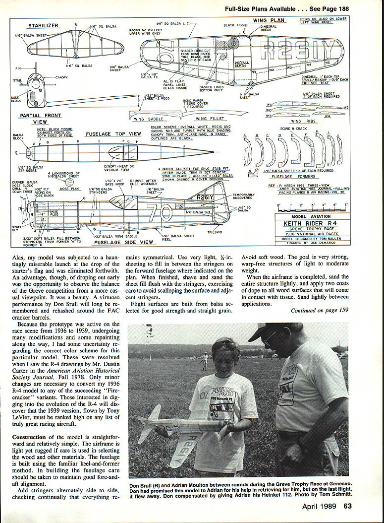 NO OCR TEXT stabilizer fitted slot built fuselage arrangement allows use shims fine adjust models glide trim length aluminum tubing serves peg anchor rubber motor rear R-3 powered Pratt & Whitney Wasp went finish Nationals style beating host hot competitors checkered flag winning Shell Cup selected slick little R-4 building project because its fine proportions suitability Greve Trophy mass launch entry FAG get-togethers ship has lived up expectations Its Drawing reproduced courtesy American Aviation Historical Society RED WITH DARE RED SHADING AS MANY AS THREE SHASES OF ROTH COLORS USED NUMBERS WERE OUTUNED IN VERY CARE RED 1937 & 1938 WING perfect seeking low-wing plane lots zip great contest potential own Rider has forced struggle overcome mediocrity launches couple other FAC race pilots have built ship have proven mettle course FAG Nats Dayton OH Glenn Rakow Silver Spring MD finished second Greve unfortunately unable retrieve farflying R-4 within time allowed make 1938 NUMBERS N RED ALL NUMBERS PURPLE WITH UGHT BLUE/MEDIUM BLUE 4 PROPELLER RAL WOOD WITH YELLOW PAINTED TIPS NOTI IN 1B37 & IB3R RACE NO 70 WAS CARRIED ON UPPER LEFT WING TIP AND LOWER RIGHT WING TIP WITH THE BASE OF BOTH NUMBERS PACING THE LEFT WING TIP UPPER COWUNG POUSHEG ALUMINUM 01L N RED 120 R 23 AR BOALE IN FEET TONY BLACK L5 VIER & PILUr RED IIR3R & 1931 ONLY 1937 & 1938 CONFIGURATION ENTIRE AIRCRAFT HT YELIOWII ALL NUMBERS ON WING TAIL SIDE AND -SCHOENFELOr HAVE SHADED RBD LETTERING OTED FOR 1937 & 35 WING PIRECRACEER IS RED1939 CONFIGURATION AND SHADED PIECES OP EXPLODED PIRECRACEERFAINTED AS 1937 & 39 EXCEPT FOR WING ARE RED & BURST UNES ARE WHITE HIDER R-4 RACER DESIGNED BY KEITH RIDER FLOWN BY ROGER DON RAE 1936 Gus GOTCH 1937 TONY LB VIER 1938 & 29 DRAWN BY OUSTIN W CARTER 6-70 DATA PROM DRAWINGS BY ART HALL PHOTOS AND PIRSONNAL OBSERVATIONS OP ORIGiNAL AIRCRAFT busIness end Rider illustrates simple device allows prop freewheel after motor winds down short length brass tubing bound prop thread cememted place contains music wire bent seen form latch Noseblock openings drilled out brought final shape using sandpaperwrapped dowels suitable diameter openings also handy place pack clay during initial glide testing trimming final lap latest FAG Nats Gen eseo NY ol throttle-bender Don Srull won Greve literal going-away fashion sensational out-of-sight flight last lap Glenn Don have demonstrated performance model enhanced increasing dihedral adding slightly stabilizer area origi nally drawn tip T-square plan incorporates changes Earlier Srull lost R-4 built orig inal plan went 005 second R 4 FAC Nats winner blown-up 23in -wingspan version Geneseo managed qualify R-4 finals Greve Trophy Race 62 Model Aviaton ne sorward portion canopy IS ormea drawing thin heated celluloid/plastic over form carved balsa Vacuum form ing would alternative method can opy outline done black tissue strips Engine exhaust stack openings control sur face panel outlines tucked up landing gear simulated black tissue Use 3M Spraymount allows repositioning tissue trim before adhesive sets up Full-Size Plans Available. See Page 188 L/B SO BALSA L E STABILIZERv SQ BALSA 1/16 BALSA SHEET FIN I/A SQ BALSA STA CANOPY 0 NOSEV SHEET-2REGD BLOO PARTIAL FRONT VIEW NOTE BLACK TISSUE ESHAUST PORTS ON BALSABOTH SIDES OF FUSE BLOCK JLO I/IA SQ BALSA STRINGERS 4 LAMINATIONS OF I/16BALSA SHEET NOSE PLUS RACIHG NO ON LEFT UPPER WINS ONLY a F] SHADED MUCUT RE BLA -SI ER-2EACH 1/16 BALSA-.-- T 1/16 x 1/8 BALSA TE ALA FLAP PANEL LINES BLACK TISSUE DASHED LINES BOTTOM ONLY BOND PAPEH TISSUE COVER 2 REQUIRES WING LEWING ET COLOR SCHEME ALL WHITE S AND RACING NOS ARE PURPLE WITH BLUE SHADING FUSELAGE TOP VIEWCANOPY TRIM U ED H CANOPY-HEAT OH VACUUM FORM OUTLINES ARE BLACK NOTCH TAILPOST FOR SNUG STAB FIT AFTER GLIDE TRIM IS CARVED BALSA1/32 I/IAREMOVE AFTER SHOWN DASHED COVER OPENING NOSE BLOCKBASS HOOFFUSE ASSEMBLY DRILL INI/3D PLY____________I/ASQ BALSA1/16 BALSA DOWN THAST FACING ONSTRINGERSSHEET \ NOSE BLOCK V DOWELl~KEYACDK PDH TA ILS K ID 5/32 SOFT BALSA FILL BETWEEN1/32 BALSA WING SADDLE1/16 BALSA SHEET STRINGERS FROM FORMER TOFUSELAGE SIDE VIEWKEEL FORMER B WING PLAN BLACK TISSUE DIHEDRAL -I BREAK REGIS NO ALSO ON LOWER LEFT WING PANEL r1r1m 1i6EILLW5 DEPTH IIJWfIIW4JI OHEDRAL ULL RAKOW3/B EACH T P TEST 1/16 BALSA SHEET____________________ 1/16 BALSA SHEET 2 OF EACH REQUIRED WI W2 WS ----WA WING RIBS SCORE B CRACK B PANELABCD I/K BALSA SHEET 2 OF EACH REQUIRED FUSELAGEFaRMERS REF RSCH 19KB THREE-VIEW HIST JOURNAL FALL 1978 B AIR HACINSVOL AL I2S456 I I I MODEL AVIATION KEITH RIDER R4 GREVE TROPHY RACE IOK RGIFS MODEL DESIGNED BY TOM NALLEN TRACING BY DOE DEMARCO Alas model subjected haun tingly miserable launch drop starters flag eliminated forthwith An advantage though dropmg out early opportunity observe balance Greve competition cas ual viewpoint beauty virtuoso performance Don Srull will long re membered rehashed around FAC cracker barrels Because prototype active race scene 1936 1939 undergoing modifications some repainting along way some uncertainty re garding correct color scheme particular model resolved saw R-4 drawings Mr Dustin Carter American Aviation Historical Society Journal Fall 1978 Only minor changes necessary convert 1936 R-4 model succeeding Fire cracker variants interested dig ging evolution R-4 will dis cover 1939 version flown Tony LeVier must ranked high list truly great racing aircraft Construction model straightfor ward relatively simple airframe light yet rugged care used selecting wood other materials fuselage built using familiar keel-and-former method building fuselage care should taken maintain good fore-andaft alignment Add stringers alternately side side checking continually everything re mains symmetrical Use very light %-in sheeting fill between stringers forward fuselage indicated plan finished shave sand sheet fill flush stringers exercising care avoid scalloping surface adja cent stringers Flight surfaces built balsa se lec