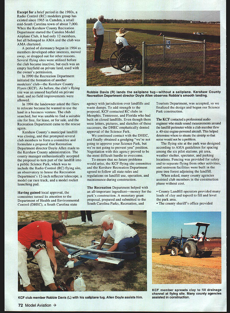 Aerial view closed Kershaw County landfill Kershaw County Flyers runway shelter observatory lower middle completed shelter spectator area fencing big Taube Balsa USA Stingray sitting pit area August 1998 71 Except brief period 1980s Radio Control RC modelers group has existed since 1965 Camden small mid-South Carolina town about 7000 Kershaw County Recreation Department started Camden Model Airplane Club 12 members belonged AMA club AMA chartered period dormancy began 1984 members developed other interests moved away dropped out other reasons Several flying sites utilized before club became inactive empty hayfield private land used owners permission 1990 Recreation Department initiated formation another modelers clubthe Kershaw County Flyers KCF As before clubs flying site unused hayfield private land no field improvements allowed 1994 landowner asked fliers relocate because wanted use land business venture club searched unable find suitable site free lease sale Recreation Department came rescue again Kershaw Countys municipal landfill closing prompted several club members form committee formulate proposal Recreation Department director Doyle Allen made Kershaw County administration county manager enthusiastically accepted proposal turn part landfill public Science Park include Radio Control RC flying site observatory house Recreation Departments 12-inch reflector telescope model car race track model rocket launching pad Having gained local approval committee turned its attention Department Health Environmental Control DHEC South Carolina state Robbie Davis R lands sailplane tugwithout sailplane Kershaw County Recreation Department director Doyle Allen observes Robbies smooth landing Tourism Department accepted finalized design began Science Park construction agency jurisdiction over landfills waste dumps add strength proposal KCF contacted RC clubs Memphis Tennessee Florida built closed landfills though letters pictures sketches successes DHEC emphatically denied approval Science Park continued contact DHEC finally obtained grudging going approve Science Park going prevent you~ position Negotiation agency proved difficult hurdle overcome ensure no future problems would arise KCF flying site committee Kershaw Recreation Department agreed follow state rules regulations landfill use operation maintenance during construction Recreation Department helped all-important ingredientmoney parks construction monetary grant proposal prepared submitted South Carolina Parks Recreation KCF contacted professional audio engineer made sound measurements around landfill perimeter club member flew 44-size engine-powered aircraft helped determine situate airstrip noise would problem flying site park designed according AMA guidelines spacing among six pilot stations pit area weather shelter spectator parking locations Fencing provided safety separate flying other activities restroom facilities built pine tree forest adjoining landfill asked county agencies assisted club members construction phase cost County Landfill operators provided loads clay topsoil fill level park area county sheriffs office provided 72 Model Aviation club member Robbie Davis L sailplane tug Allen Doyle assists him KCF member spreads clay fill drainage channel flying site county agencies assisted construction inmates help club members build 20- x 40-foot weather shelter restrooms paved runway fencing observatory house telescope install 1500-foot underground watering system 1000 feet electrical wiring inmates served community service portion sentences us Recreation Department provided tractors lawn equipment grade prepare 800- x 100-foot grass runway County road maintenance personnel graded entrance road installed culverts heavy equipment South Carolina state highway maintenances county unit provided equipment personnel hydroseed grass fertilizer entire park site weather shelter runway completed field inspector DHEC accompanied county landfill manager stopped flying site regular landfill inspection trips KCF club member began explain building other facilities constructed interrupted DHEC inspector Yes know did watching inspector complimented club making good use otherwise unusable land turned landfill manager said wanted remainder closed landfill look like couldnt have asked stronger endorsement planning hard work 20 members KCF proud users first-class flying site obtained through efforts agencies dedicated club members club sponsored Camden Kershaw County Recreation Department AMA chartered Kershaw County insured site owner Since South Carolina state law specifies closed landfills must owned maintained owner 30 years believe club assured premier flying site years come Near-term flying site improvements include expanding 20- x 30-foot paved runway 40- x 400-feet widening 800-foot grass strip 150 feet picnic area larger seating area spectators also recognized needs KCF site committee formulated following guidelinesour advice clubs looking new site persistence careful thought work some probable compromises club can successful Keep positive attitude will encounter obstacles Prepare proposal homework before contacting site owners governmental agencies find out document what other clubs have done successfully Enlist aid local officials civic groups site search procurement efforts Link tie several recreational outlets together multiuse site proposal will benefit wide range interests Demonstrate assure site owner responsible mature attitude toward safety site design proposals operations Follow through progress reports keep agencies working informed r L Marshall Secretary/Treasurer Kershaw County Flyers 420 Ridgecrest Dr Camden SC 29020 4 CycleEDSONematarmawover60lwiteregInes. AdjustabiMG-LP 81296M40FC 61896 FItSFITS Motor MountSAITO4046SAITO6610120 OS MAX406090OS MAX9010120 ENYA40 eoENVA60 120 OTHERS40 60WEBRA8010120 NO DRILLING TAPPING REQUIRED Send Free Catalog & Discount Sheet SPA PARTS AVAILABLE.. ~ Make ble Call 973661231O l7Spw Ptaoe NuU