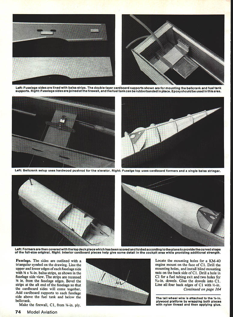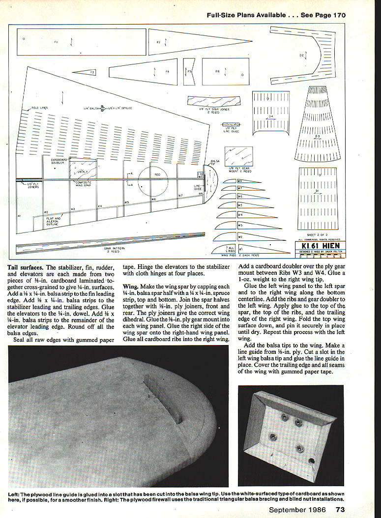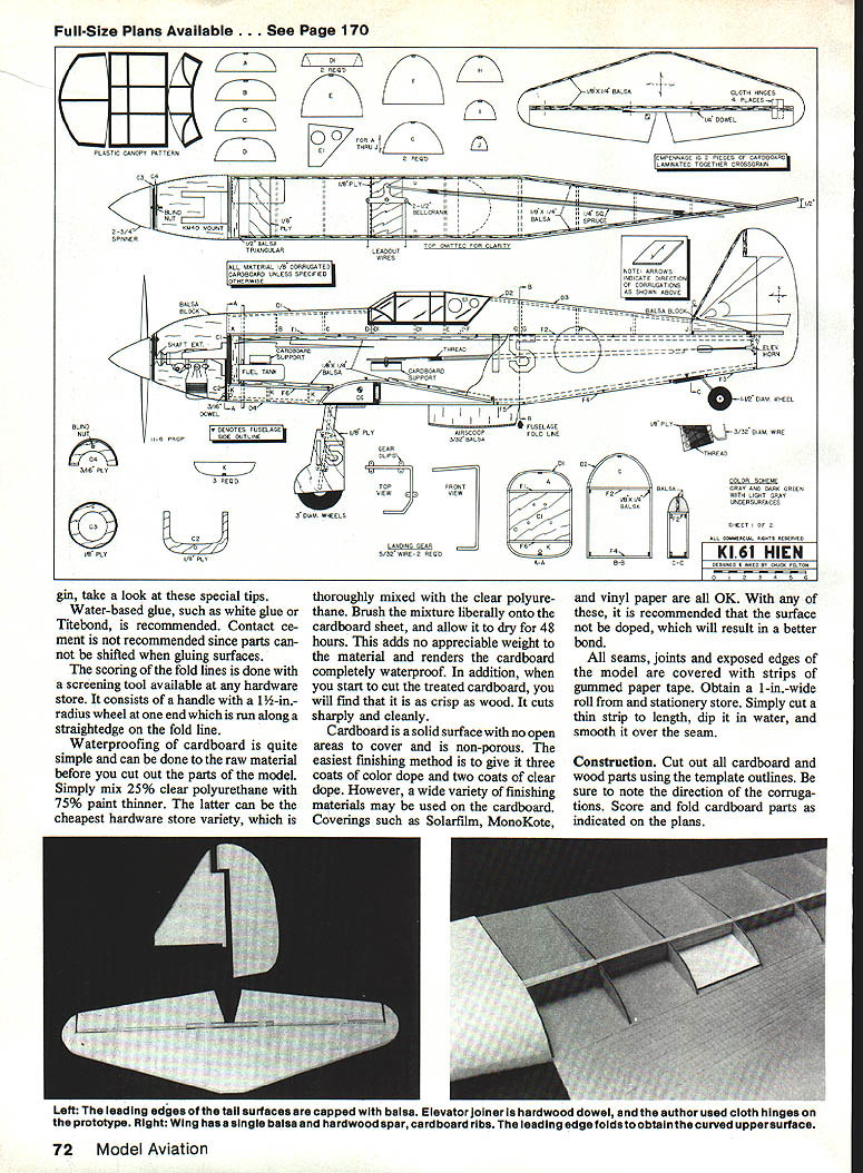 The first Japanese fighter aircraft WW II earn reputation tough airplane could withstand real punishment stay air semiscale Control Line model though made cardboard inherits origi nals ruggedness EChuck Felton 70 Model Aviation THE PROTOTYPE AIRCRAFT its possessed substantially heavier lire power name meaning flying swallow Japanese markedly sturdier airframe completed December 1941 traditional Japanese Imperial Army Air Hien dubbed Tony powered Ha-40 liquid-cooled engine Service fighter designs earlier air- Allies went action around New revised lightened version craft lightly armed lightly loaded Guinea April 1943 Despite service German DB6O1 engine Hien highly maneuverable contrast problems including often unreliable reached speed 368 mph performed Hien stressed speed climb-and-dive engine lien forced Allied pilots very well against captured P-40 Bf characteristics marked introduction modify tactics evolved 109 sent Japan submarine pilot armor protection self-sealing combat lighter nimble Japa Hien radical departure fuel tanks Japanese fighter also nese fighters Hien thoroughly fcot gives wingspan 60 length 45 bottom airfoil flat curved upper surface due scoring folding technique Working cardboard Before becompetent design virtually as-employed Engines of30 40 Cu fl can pect other type wasbe used responsible disproving widely held belief Japanese aircraft light weights incapable taking punishment surviving model constructed primarily m corrugated cardboard greatly re duces both cost building time design makes use cardboards unique properties wing built two large pieces cardboard cardboard ribs single spar tail surfaces fuselage primarily cardboard little internal bracing result low cost lightweight fast building model has gcod scalelike appearance can take plenty punishment flying field Cardboard varies weight cardboard will Sources material include box manufacturers local shopping centers anywhere else can find stacks discarded boxes Look cardboard brown paper side white-finished paper other white paper outside model results smcother finish neater appearance method folding cardboard use gummed paper tape seal joints exposed corru gations explained construction hints model built scale 1 inches September1986 71 Top careful finish authoss tips working cardboard wiii find hard tell anything other baisa model Above Shown author can get idea actuai size fine-flying quick-to-build model Full-Size Plans Available. See Page 170 II OREQOHE 1014 BALSACLOTl RINGES EIA PCRCES-I 4 DOWEL 00 ElRU4 READ H B AB ii B PROP 4AR I/NHIROCOOPFOLD NEPLOinHB HR WIRE 3IOORHLSA Jf~HEAR THREAD COLOR SCHEME BASAORHO AND GARB GREEN H/HSNDERSLHFHCCS WIIIK-IIW TB LOOT GOHO 3DM WADEli~4iJ~SHEET OF 1i ABMUERRIA RON NRENEPAED W ULIjIjEIi7 B BHRHKFBTRN OF CAROBOARO TOGETHER CROGOGRAIN IHBPLYUii NI IUlID 2IDI III IIBELTRANKIIIIRA 114II IR OS IlBALSAOPR4E IIU II ROAN ~ZHHHHZUCF41-AT 014W WHEEL 3/IA L4DR DOWEL I~UTLINE gin take look special tips Water-based glue such white glue Titebond recommended Contact ce ment recommended since parts can shifted gluing surfaces scoring fold lines done screening tool available hardware store consists handle 1-inradius wheel end run along straightedge fold line Waterproofing cardboard quite simple can done raw material before cut out parts model Simply mix 25% clear polyurethane 75% paint thinner latter can cheapest hardware store variety thoroughly mixed clear polyure thane Brush mixture liberally onto cardboard sheet allow dry 48 hours adds no appreciable weight material renders cardboard completely waterproof addition start cut treated cardboard will find crisp wood cuts sharply cleanly Cardboard solid surface no open areas cover non-porous easiest finishing method give three coats color dope two coats clear dope However wide variety finishing materials may used cardboard Coverings such Solarfilm MonoKote vinyl paper OK recommended surface doped will result better bond seams joints exposed edges model covered strips gummed paper tape Obtain 1-in-wide roll stationery store Simply cut thin strip length dip water smooth over seam Construction Cut out cardboard wood parts using template outlines sure note direction corruga tions Score fold cardboard parts indicated plans Left leading edges tail surfaces capped balsa Elevator joiner hardwood dowel author used cloth hinges prototype Right Wing has single balsa hardwood spar cardboard ribs leading edge foldsto obtainthe curved uppersurface 72 Model Aviation NRN Full-Size Plans Available. See Page 170 PD VA FSA SPUR JOINER 2 READ CARDBOARD DOUBLER B PLY AILERON OUTLINE C OUP U SIT E WINO OPAR LA WA LINE 0010 F WA W7 READ OD II 04////IlIlll\\\ I//I/IIJII\\\\ - Kim LINE 00102 I/A PLO/II/IIiIl\\\ I//Il 77fl /8 PS UFUR MOUNT 0 REOD K __ jJIB7 Ml WINO RIBA 2 EACA BEAU I11 IIII 01 11111111 EET 0 OF 0 K161 HIEN BeBANBA BREAR ARUAXPEL U04OW Tail surfaces stabilizer Cm rudder elevators made two pieces -in cardboard laminated gether cross-grained give -in surfaces Add n balsa strip Cm leading edge Add n balsa strips stabilizer leading trailing edges Glue elevators -in dowel Add n balsa strips remainder elevator leading edge Round off balsa edges Seal raw edges gummed paper tape Hinge elevators stabilizer cloth hinges four places Wing Make wing spar capping -in balsa spar half n spruce strip top bottom Join spar halves together -in ply joiners front rear ply joiners give correct wing dihedral Glue -in ply gear mount wing panel Glue right side wing spar onto right-hand wing panel Glue cardboard ribs right wing Add cardboard doubler over ply gear mount between Ribs W3 W4 Glue 1-oz weight right wing tip Glue left wing panel left spar right wing along bottom centerline Add ribs gear doubler left wing Apply glue top th spar top ribs trailing edge right wing Fold top wing surface down pin securely place until dry Repeat process left wing Add balsa tips wing Make line guide -in ply Cut slot left wing balsa tip glue line guide place Cover trailing edge seams win