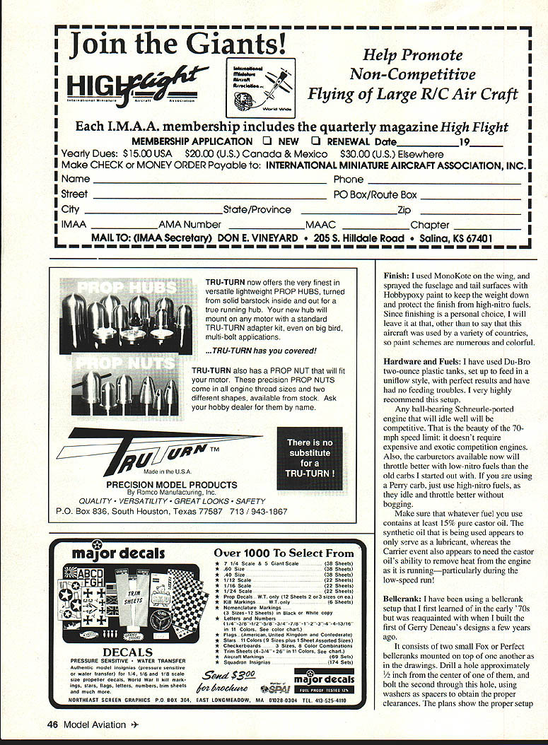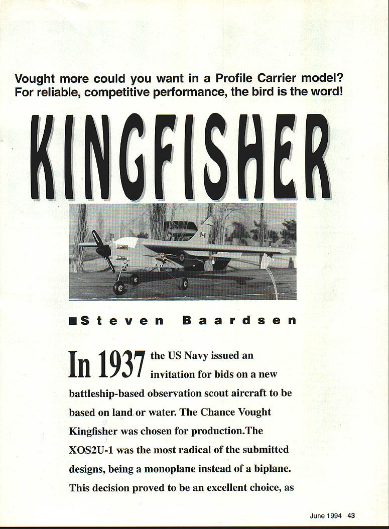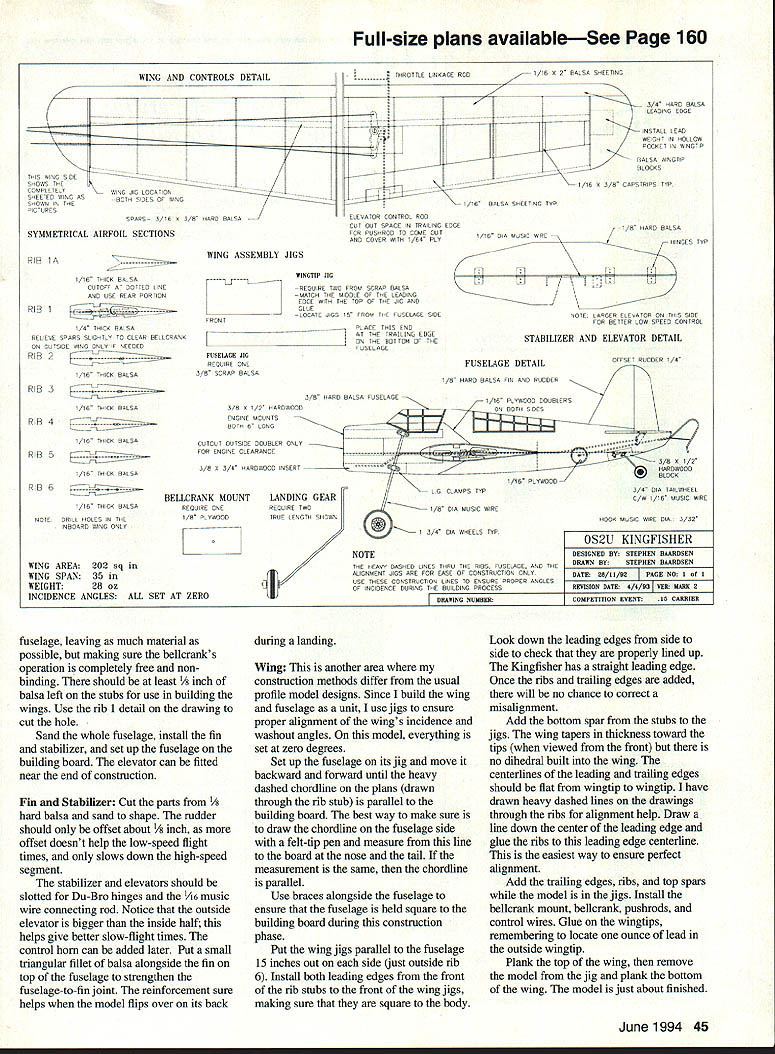 Vought could want Profile Carrier model reliable competitive performance bird word US Navy issued 1937 invitation bids new battleship-based observation scout aircraft based land water Chance Vought Kingfisher chosen productionThe XOS2U-1 radical submitted designs being monoplane instead biplane decision proved excellent choice June1994 43 ESteven Baardsen aircraft easy maintain sea handled well variety roles assigned During its service Kingfisher also exported number Allied countries aircrafts record very good Its best-known role rescue plane downed WW II carrierbased airmen shot down over Pacific Ocean Kingfisher has popular Navy Carrier subject number years version first have seen developed particularly 15 Profile Carrier event interest aircraft originated desire build legitimate Carrier aircraft 15 event lightest possible weight largest possible wing area looking too distorted Since original Kingfisher designed scout floatplane optimized high lift using big wing area its relatively small sizeperfect Carrier competition number other features fullsize aircraft attractive 1 A midwing location allowed mounting bellcrank center gravity within wing less drag 2 Fuselage-mounted gear less weight stronger mounting arrangement 3 A large scale tail group 4 A small body relative its wing area 5 A fairly large user group countries different color schemes 6 It Navy aircraft wanted best contest airplane could build everything considered light used lightest balsa could find put lightest finish hot fuel proof installed reworked Conquest engine OS 2H helicopter carburetor used low-drag racing wheels concession performance stock muffler model will exceed 70 mph limit set event will fly slowly pilot can manage going over 600 angle rule has proven competitive machine hoped would Although model capable higher performance horsepower recommended average builder install stock engine Contests won primarily reliable consistent equipment good low-speed times high-speed times dont matter much long speed close 70 mph limit cant win engine doesnt run properly dont complete flight CONSTRUCTION Fuselage construction no different profile models except cut out fuselage slide wing prefer build wings fuselage integral unit usual profile fuselage cracking between body wing doesnt occur Cut fuselage sheet /8 x 4 hard baisa add maple engine mounts tail wheel block Laminate 1/16 plywood doublers using epoxy After epoxy has cured drill engine landing gear strap mounting holes Join ribs 1 rib lA glue assemblies both sides fuselage form stub used support wing Rib lA used spacer between rib 1 fuselage compensate 1/16 plywood doubler Take care locate stabs shown plans control incidence angle wings have drawn heavy dashed lines side view fuselage help alignment Notice plywood bellcrank mount recessed bottom outside rib 1 mount butts up against plywood doubler does project fuselage strongest arrangement bellcrank can have aircraft would have disintegrate before bellcrank could pull loose Carefully cut bellcrank clearance hole through stubs body 44 Model Aviation ey authors Amazon parrot checks sure parts accounted prior construction Jigs quick easy way ensure properly aligned model Note wing stubs holes control wires Airframe ready removed jigs Wingtips fitted sheeting added next Belicrank setup visible completed Kingfisher less tank engine Hobbypoxy finish fuselage wings covered MonoKote Type CL Profile Carrier Wingspan 35 inches Engine size/type 15 glow Flying weight 24 ounces Construction Built-up foam wing Covering/finish Hobbypoxy fuselage MonoKote wing Full-size plans availableSee Page 160 WING AND CONTROLS DETAIL THO WINS SDE---- - I-OwS FE LORHIETETASS JO LOCATON SHEETED W SO AS BoTH S DES OF WOO SHOWN H THE STEREO SPAPS- 3 HA 3H HARD BASA SYMMETRICAL AIRFOIL SECTIONS 3/iN 5 RASH SEETING 3/H HANG BALSA EASING EDGE I&HCATDTRIP INSTAL EAT WE OH 3 IN TOIHOW POCKET N ANOTH AISA ANSTP IIB000 IIK7I~0TSP 1/16 BALSA SHEETIND TYP ELEHATOR CONTROL ROD CAT SOT SPACE IN TRAIL NO EDDE FOR PUSHHOD TO COME SOT ANT COVER WITH 3/NH PET B IAHI BALSA 1 DA BASIS WIRE HINGES TSP RB lA 1/lA 1 SE GASH LTOFF AT DOTTED LNE AND ESE REAR PORTION B B 1 THICK BASA BEE ATE SPARS SLIGHTLY TO LEAR BE CRANK ON OUTUSE WINS OILY IF NEEDED RB 2 K pczr THICK BASA RB 3 1/16 ThEA RALSA RB 4 1/1K TASK BALSA RIB 5 1/36 S-CR BASA B B BEZIZ~L ~ 1/16 THICK BALSA NOTEDRHOES IN THE INROARD WINS ONY WING ASSEMBLY JIGS WINGTIP JIG BEGS RE TWO FROM SCRBP BALSA MATCH THE MITDLC OF THE LEAD NO FOOL WITH THE TOP OF THE HG ANT OLAF OCAGS GS 15 FROM S-F EHOELASE SITE FRONT FUSELAGE JIG HEOJIRE ONE 3/H SCRAP BASA PLACE S-IS INT AT SNE TRAILINO LTSE ON THE BOTTOM GE THE F SOFA AD F NOTE LARSER LEHATOR ON TH 0 SITE FOR BETTER OW SPEED CONTROL STABILIZER AND ELEVATOR DETAIL FUSELAGE DETAIL OFFSET RUTOER 1/H 1/B HAHG BASA FN ANT HODGES 3/H HAAG BAESA FUSELAGE 1/16 PETWOOD GOEBLERS 3/B 0 1/3 HAROWOOG SNOINE MOUNTS BOTH 6 ONG CETOUT OGTSIGE GOLBER OILY FOH ENS NE CLEARANCEK~- DOS - 3/U H 1/2 3/H 0 3/H HARDAOGG NSEHT HARDADOG 3/4 GIA TAEWHEEA C/W 116 MEDIC WIRE 1/B D MUSIC WIRE HOOK MASIC WIRE GIA 1/32 1 3/H DIA WHEED 11S BELLCRANK MOUNT REOL HE ONE 1/H ATWOOD WING AREA 202 sq WING SPAN 35 WEIGHT 28 oz INCIDENCE ANGLES ALL SET AT ZERO LANDING GIG SI NOTE THE HFAVH GASHED ENES GAHE THE H HO FUSEAGGE HND THE HA ONMENT JIGS ARE FOR EASE OF CONSTRUCTION ONES USE THESE CONSTRACTIOS ANES TO ENSURE ROPER ANGLED OF INCIDENCE GERINS THE RUILDING PROCESS DRAWIUG NUMBERI OS2U KINGFISHER DESIGNED HYI STEPHEN HAAHDSEN DRAWN RYI STEPHEN BAAHDSEN DATEI 28/11/92PAGE NGI REVISION DATE 4/4/931 VEIl MARE 2 COMPETITION EVENTI15 CARRIER fuselage leaving much material possible making sure belicrank s operation completely free non binding should least I/ inch balsa left stubs use building wings Use rib 1 detail drawing cut hole Sand whole fuselage install fin stabilizer set up fuselage building board elevator can fitted near end construction Fin Stabilizer Cut parts 1/8 hard balsa sand shape rudder should o