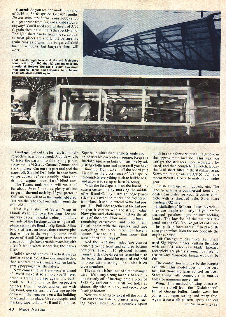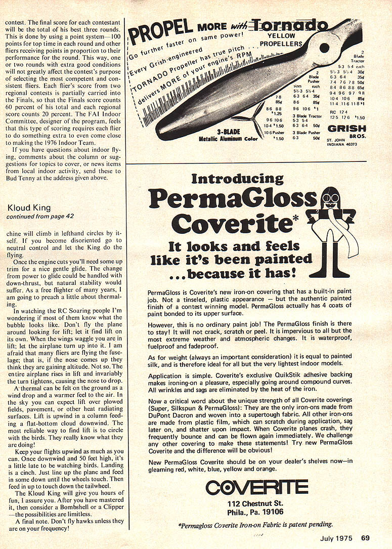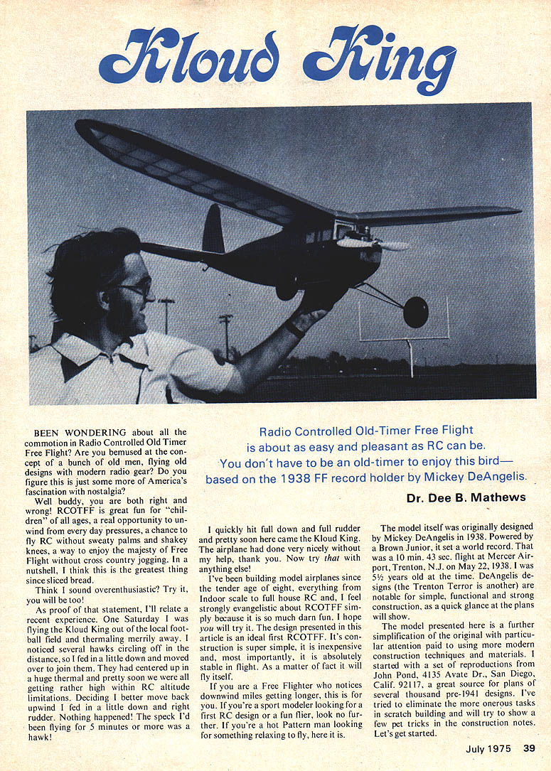 c717oud cXing BEEN WONDERING about commotion Radio Controlled Old Timer Free Flight Are bemused con cept bunch old men flying old designs modern radio gear figure just some Americas fascination nostalgia Well buddy both right wrong RCOTFF great fun chil dren ages real opportunity un wind day pressures chance fly RC sweaty palms shakey knees way enjoy majesty Free Flight cross country jogging nutshell think greatest thing since sliced bread Think sound overenthusiastic Try will too As proof statement Ill relate recent experience Saturday flying Kloud King out local foot ball field thermaling merrily away noticed several hawks circling off distance fed little down moved over join centered up huge thermal pretty soon getting rather high within RC altitude limitations Deciding better move back upwind fed little down right rudder Nothing happened speck Id flying 5 minutes hawk Radio Controlled Old-Timer Free Flight about easy pleasant RC can dont have old-timer enjoy bird based 1 938 FF record holder Mickey DeAngelis Dr Dee B Mathews quickly hit full down full rudder pretty soon came Kloud King airplane done very nicely help thank Now try anything else Ive building model airplanes since tender age eight everything Indoor scale full house RC feel strongly evangelistic about RCOTFF sim ply because much darn fun hope will try design presented article ideal first RCOTFF Its con struction super simple inexpensive importantly absolutely stable flight As matter fact will fly itself Free Flighter notices downwind miles getting longer youre sport modeler looking fora first RC design fun flier look no fur ther youre hot Pattern man looking something relaxing fly model itself originally designed Mickey DeAngelis 1938 Powered Brown Junior set world record 10 mm 43 sec flight Mercer Air port Trenton NJ May 22 19381 5 years old time DeAngelis de signs Trenton Terror another notable simple functional strong construction quick glance plans will show model presented further simplification original particu lar attention paid using modern construction techniques materials started set reproductions John Pond 4135 Avate Dr San Diego Calif 92117 great source plans several thousand pre-1941 designs Ive tried eliminate onerous tasks scratch building will try show few pet tricks construction notes Lets get started July1975 39 General As see model uses lot 3/16 x 3/16 spruce Get 48 lengths substitute balsa hobby shop can get spruce Sig should stock anyway Youll need several sheets 3/32 C-grain sheet balsa thats speckly kind 3/16 sheet can scrap box pieces short just sure grain runs drawn Try get celluloid windows butyrate sheet will work see-through look old fashioned Construction RC isl can make guy emotional Below radio just like installationstanks batteries two-channel brick etc Area 660 sq Fuselage Cut out formers respective sizes plywood quick way trace parts onto thin typing paper spray 3M Spray Contact Cement stick place Cut out part peel paper off Simple Drill holes nose form er dowels before assembly Mark drill engine mount 4x40 blind nuts Tatone tank mount will run 19 about 1 2 minutes plenty time get thermal activity prefer Sullivan tank will fit windshield area Just run tubes out side through celluloid Next lay sheet Saran Wrap 1-landi Wrap etc over plans use wax paper weakens glue joints Lay side fuselage down using ali phatic resin Tite Bond orSig Bond Allow dry least hour remove pins will way lay some small pieces Handi Wrap over structure areas might have trouble reaching knife blade separating halves later Build second side over first just similar possible Allow overnight dry separate halves using kitchen knife gently popping apart halves Now comes part everyone afraid Well make simple youll never dread frame fuselage again Fit bulk heads B C respective notches trim needed cement Sig Bond quickly turn fuselage upside down wing rests flat building board pin place Use clothespins masking tape hold B C place Square up right angle triangle adjustable carpenters square Keep fuselage square both dimensions ad justing clothespins tape until have lined up Dont take off board yet First fit crosspieces 3/16 spruce complete everything back bulkhead C allow set up least 24 hours fuselage still board lo cate center line marking middle B C Lay straight edge yard stick etc over marks clothespin place should extend tail post position Pull sides together tail post centers straight edge Now glue clothespin together aft ends sides Now mark mid lines remaining crosspieces place Check again squares tape everything place now have square fuselage dimensionsthat wasnt hard Add 3/32 sheet sides use contact cement front sand bottom contours Place 1/16 plywood bottom using flexible direction conform bend should epoxied held place masking tape Joint cross members tail skid bent out clothes hanger wireits plenty strong Mark out line directly off fuselage onto piece 3/32 ply cut out Drill two holes shown slip wire place poxy onto fuselage bottom Now going take off board Cut out turtle deck formers using trac ing paper Dont put complete spare notch formers just cut groove approximate location way can get stringers accurately lo cated complete notch Epoxy 3/16 sheet filter stabilizer area Servo mounting nails 3/8 x 1/2 maple motor mounts Epoxy match radio gear Finish fuselage dowels etc landing gear commercial item dealer can order comes com plete threaded axle Sure beats bending 5/32 wire Installation RC gear used Nyrods simple easy prefer pushrods go aheadjust sure nothing bends location batteries de pends CG Youve got lots space just pack foam stuff place sure switch side opposite engine exhaust Tail Cant get much simpler used Sig Nylon hinges cutting slots FSI sabre saw blade Epoxied toothpicks plenty strong can see no reason Monokote hinges wouldnt OK control horns must longest available model doesnt move very fast large control surfaces Start flying connectors outside holes minimum movement Wing method wing construc tion rip o