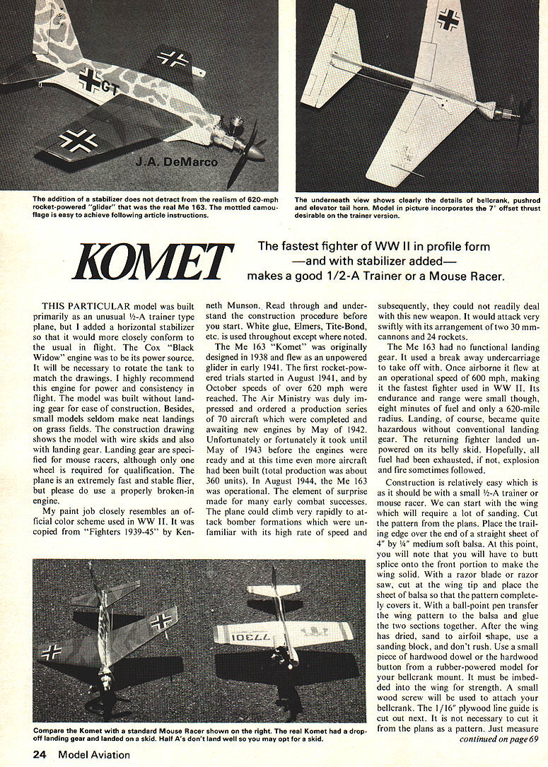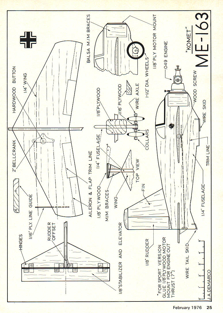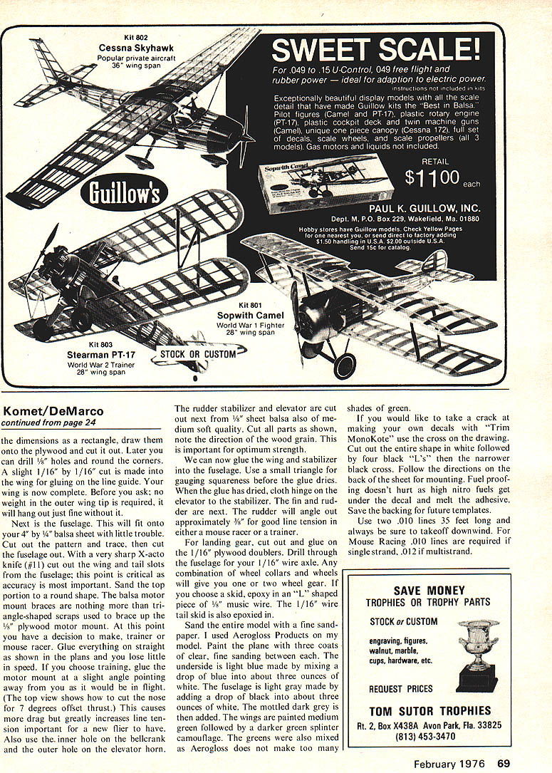 The fastest fighter WW II profile form stabilizer added KL1IIEI makes good 1/2-A Trainer Mouse Racer THIS PARTICULAR model built primarily unusual -A trainer type plane added horizontal stabilizer would closely conform usual flight Cox Black Widow engine its power source will necessary rotate tank match drawings highly recommend engine power consistency flight model built land ing gear ease construction Besides small models seldom make neat landings grass fields construction drawing shows model wire skids also landing gear Landing gear speci fied mouse racers although wheel required qualification plane extremely fast stable flier please use properly broken-in engine paint job closely resembles ficial color scheme used WW II copied Fighters 1939-45 Kenneth Munson Read through under stand construction procedure before start White glue Elmers Tite-Bond etc used throughout except noted 163 Komet originally designed 1938 flew unpowered glider early 1941 first rocket-pow ered trials started August 1941 October speeds over 620 mph reached Air Ministry duly im pressed ordered production series 70 aircraft completed awaiting new engines May 1942 Unfortunately fortunately took until May 1943 before engines ready time aircraft built total production about 360 units August 1944 163 operational element surprise made early combat successes plane could climb very rapidly tack bomber formations un familiar its high rate speed subsequently could readily deal new weapon would attack very swiftly its arrangement two 30 mmcannons 24 rockets 163 no functional landing gear used break away undercarriage take off Once airborne flew operational speed 600 mph making fastest fighter used WW II Its endurance range small though eight minutes fuel 620-mile radius Landing course became quite hazardous conventional landing gear returning fighter landed un powered its belly skid Hopefully fuel exhausted explosion fire sometimes followed Construction relatively easy should small -A trainer mouse racer can start wing will require lot sanding Cut pattern plans Place trail ing edge over end straight sheet 4 um soft balsa point will note will have butt splice onto front portion make wing solid razor blade razor saw cut wing tip place sheet balsa pattern complete ly covers ball-point pen transfer wing pattern balsa glue two sections together After wing has dried sand airfoil shape use sanding block dont rush Use small piece hardwood dowel hardwood button rubber-powered model bellcrank mount must imbed ded wing strength small wood screw will used attach bellcrank 1/16 plywood line guide cut out next necessary cut plans pattern Just measure continued page 69 24 Model Aviation addition stabilizer does detract realism 620-mph rocket-powered glider real 163 mottled camou flage easy achieve following article instructions underneath view shows clearly details bellcrank pushrod elevator tail horn Model picture incorporates 7 offset thrust desirable trainer version Compare Komet standard Mouse Racer shown right real Komet dropoff landing gear landed skid Half As dont land well may opt skid 118STABILI Z ER HINGES 1/16 PLY LINE GUIDE AND ELEVATOR 118 RUDDER FOR SPORT VERSION GLUE I/8PLYWOOD MOTOR MOUNT FOR ENGINE OUT THRUST 70 WIRE 0I234 IIII 2 BELLCRANK AILERON & FLAP TRIM LINE I/8 PLYWOOD114 FUSELAGE M/M BRACES70 WING V TOP VIEW HARDWOOD BUTTON 1/8 PLYWOOD 2 1/16 PLYWOOD WIRE AXLE COLLARS BALSA M/M BRACES WHEELS 1/8 PLY MOTOR MOUNT K 1-1/2 DIA ENGINE ______________KOMET WOOD SCREW ME-16 3 049 -n CD CC 0 0 C N 31 J DEMARCO dimensions rectangle draw onto plywood cut out Later can drill holes round corners slight 1/16 1/16 cut made wing gluing line guide wing now complete Before ask no weight outer wing tip required will hang out just fine Next fuselage will fit onto 4 a sheet little trouble Cut out pattern trace cut fuselage out very sharp X-acto knife #11 cut out wing tail slots fuselage point critical accuracy important Sand top portion round shape balsa motor mount braces nothing tri angle-shaped scraps used brace up /s plywood motor mount point have decision make trainer mouse racer Glue everything straight shown plans lose little speed choose training glue motor mount slight angle pointing away would flight top view shows cut nose 7 degrees offset thrust causes drag greatly increases line ten sion important new flier have Also use inner hole bellcrank outer hole elevator horn rudder stabilizer elevator cut out next /8 sheet balsa also dium soft quality Cut parts shown note direction wood grain important optimum strength can now glue wing stabilizer fuselage Use small triangle gauging squareness before glue dries glue has dried cloth hinge elevator stabilizer fin rud der next rudder will angle out approximately good line tension either mouse racer trainer landing gear cut out glue 1/16 plywood doublers Drill through fuselage 1/16 wire axle Any combination wheel collars wheels will give two wheel gear choose skid epoxy L shaped piece /8 music wire 1/16 wire tail skid also epoxied Sand entire model fine sand paper used Aerogloss Products model Paint plane three coats clear fine sanding between underside light blue made mixing drop blue about three ounces white fuselage light gray made adding drop black about three ounces white mottled dark grey added wings painted medium green followed darker green splinter camouflage greens also mixed Aerogloss does make too shades green would like take crack making own decals Trim MonoKote use cross drawing Cut out entire shape white followed four black Ls narrower black cross Follow directions back sheet mounting Fuel proof ing doesnt hurt high nitro fuels get under decal melt adhesive Save backing future templates Use two 010 lines 35 feet long always sure takeoff downwind Mouse Racing 010 lines required single strand 012 multistrand February 1976 69 Komet/DeMarco continued page 24 SAVE MONEY TROPHIES OR TROPHY PARTS STOCK CUSTOM engraving figures walnut marble cups hardware etc REQUEST PRICES TOM