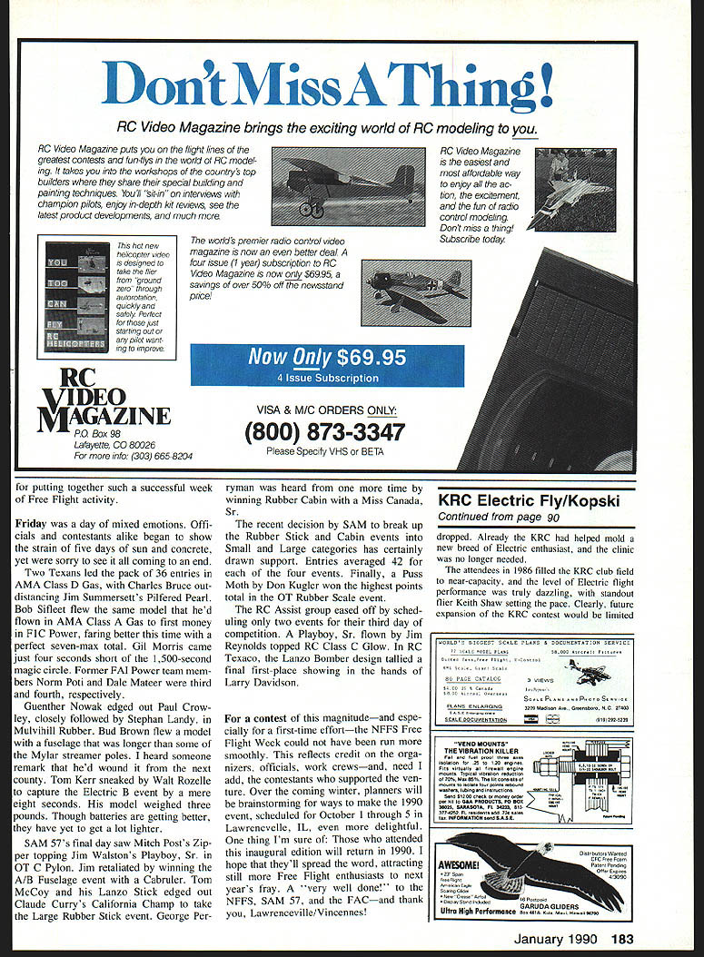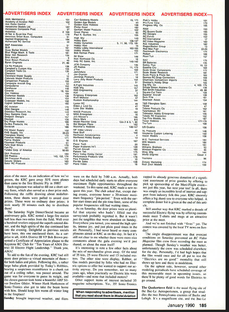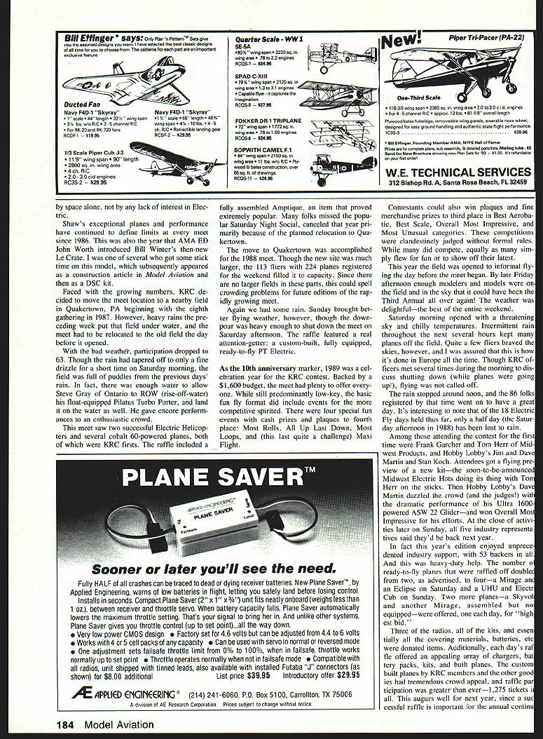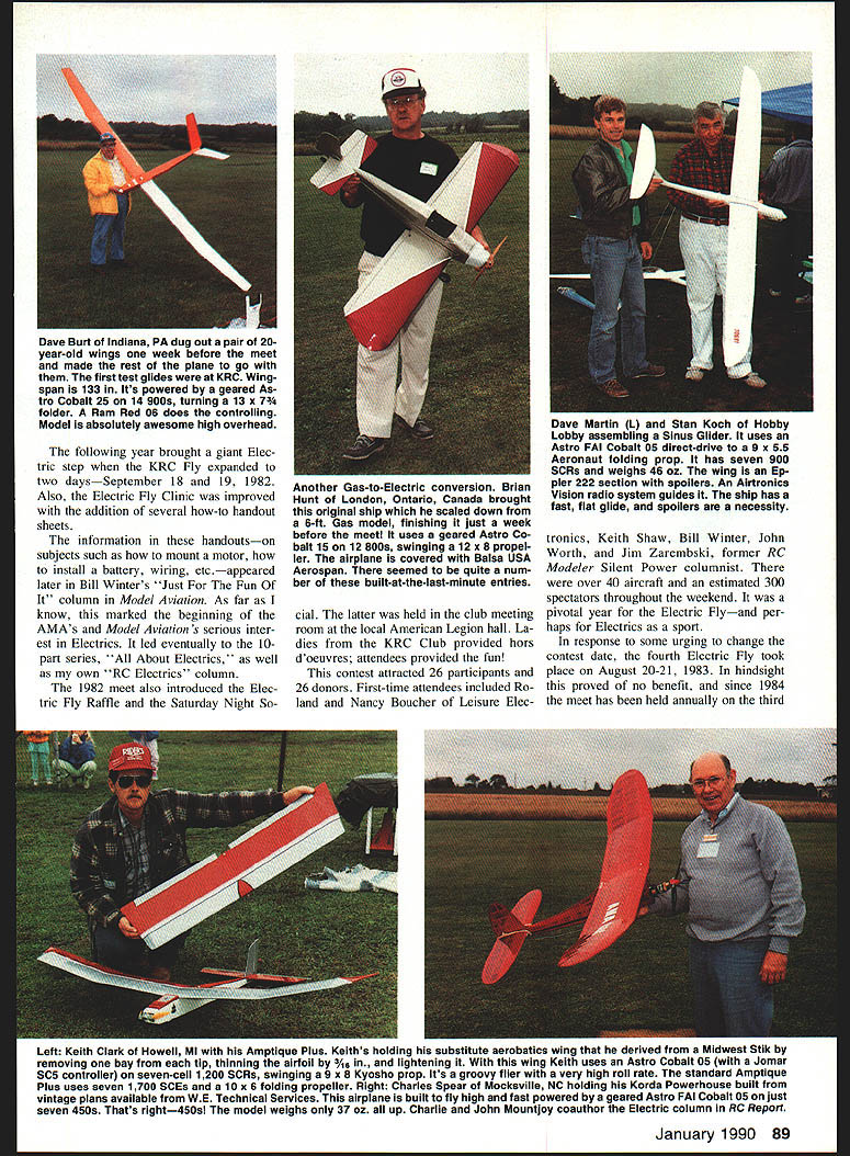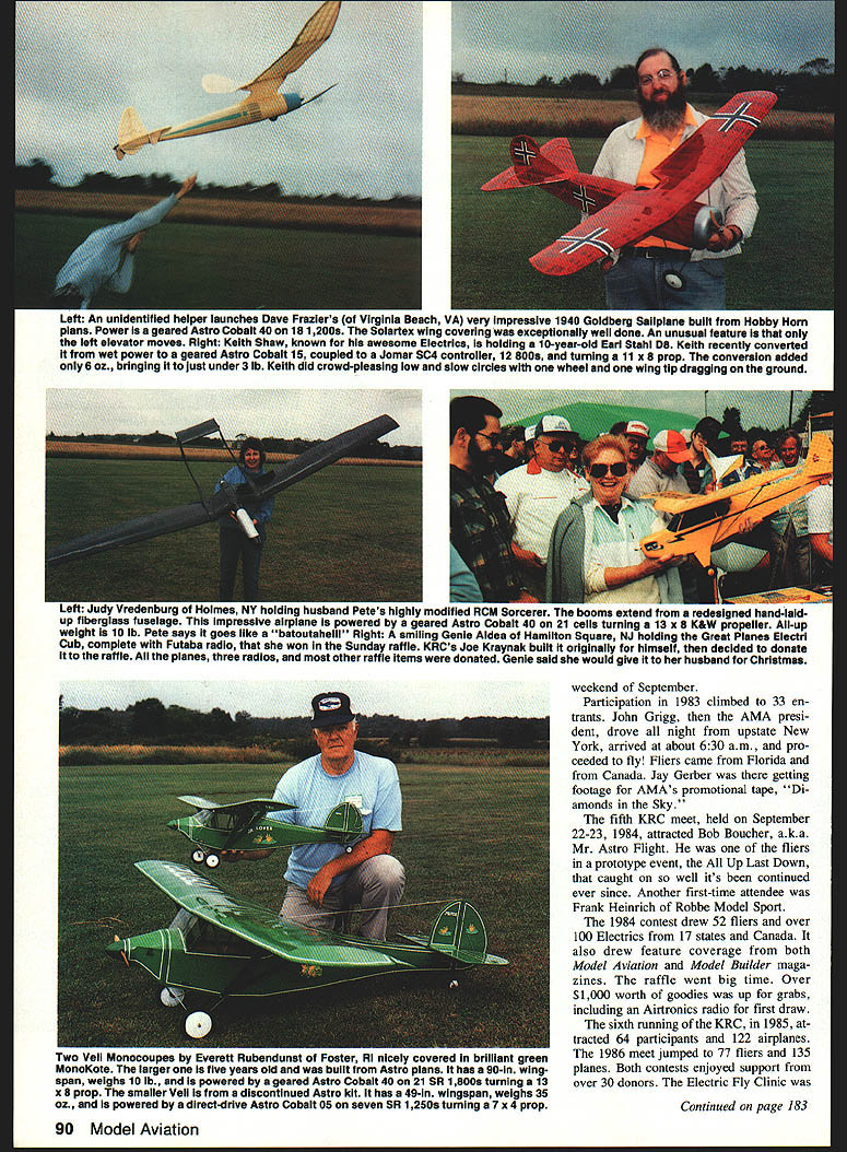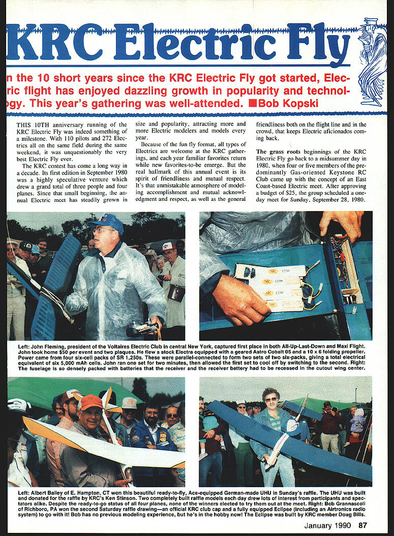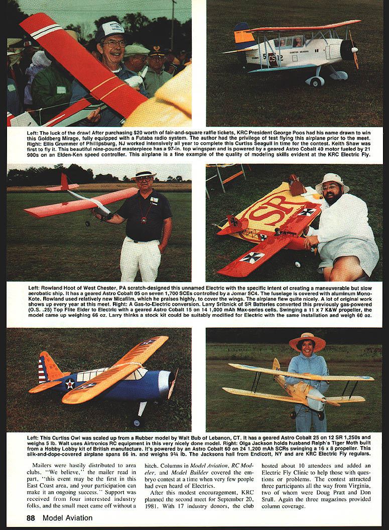 cc ic 10 short years since KRC Electric Fly got started Elec flight has enjoyed dazzling growth popularity technol years gathering well-attended EBob Kopski friendliness both flight line crowd keeps Electric aficionados com ing back grass roots beginnings KRC Electric Fly go back midsummer day 1980 four five members pre dominantly Gas-oriented Keystone RC Club came up concept East Coast-based Electric meet After approving budget $25 group scheduled oneday meet Sunday September 28 1980 Left John Fleming president Voltaires Electric Club central New York captured first place both All-Up-Last-Down Maxi Flight John took home $50 per event two plaques flew stock Electra equipped geared Astro Cobalt 05 10 x B folding propeller Power came four six-cell packs SR 1 250s parallel-connected form two sets two six-packs giving total electrical equivalent six 5000 mAh cells John ran set two minutes allowed first set cool off switching second Right fuselage densely packed batteries receiver receiver battery recessed cutout wing center Left Albert Bailey E Hampton CT won beautiful ready-to-fly Ace-equipped German-made UHU Sundays raffle UHU built donated raffle KRCs Ken Stinson Two completely built raffle models day drew lots interest participants spec tators alike Despite ready-to-go status four planes winners elected try out meet Right Bob Grannascoli Richboro PA won second Saturday raffle drawingan official KRC club cap fully equipped Eclipse including Airtronics radio system go Bob has no previous modeling experience hes hobby now Eclipse built KRC member Doug Bills January 1990 87 THIS 10TH anniversary running KRC Electric Fly indeed something milestone 110 pilots 272 Elec trics same field during same weekend unquestionably very best Electric Fly ever KRC contest has come long way decade Its first edition September 1980 highly speculative venture drew grand total three people four planes Since small beginning nual Electric meet has steadily grown size popularity attracting more Electric modelers models year Because fun fly format types Electrics welcome KRC gather ings year familiar favorites return new favorites-to-be emerge real hallmark annual event its spirit friendliness mutual respect Its unmistakable atmosphere model ing accomplishment mutual acknowl edgment respect well general Left Rowland Hoot West Chester PA scratch-designed unnamed Electric specific intent creating maneuverable slow aerobatic ship has geared Astro Cobalt 05 seven 1700 SCEs controlled Jomar SC4 fuselage covered aluminum Mono Kote Rowland used relatively new Micaflm praises highly cover wings airplane flew quite nicely lot original work shows up year meet Right Gas-to-Electric conversion Larry Sribnick SR Batteries converted previously gas-powered 05 25 Top Flite Elder Electric geared Astro Cobalt 15 14 1000 mAh Max-series cells Swinging 11 x 7 K&W propeller model came up weighing 66 oz Larry thinks stock kit could suitably modified Electric same installation weigh 60 oz Left This Curtiss Owl scaled up Rubber model Walt Bub Lebanon CT has geared Astro Cobalt 25 12 SR 1250s weighs 5 lb Walt uses Airtronics RC equipment very nicely done model Right Olga Jackson holds husband Ralphs Tiger Moth built Hobby Lobby kit British manufacture Its powered Astro Cobalt 60 24 1200 mAh SCRs swinging 16 x 8 propeller silk-and-dope-covered airplane spans 66 weighs 9 lb Jacksons hail Endicott NY KRC Electric Fly regulars Mailers hastily distributed area clubs believe mailer read part event may first East Coast area participation can make ongoing success Support received four interested industry folks small meet came off hitch Columns Model Aviation RC Mod eler Model Builder covered em bryo contest time very few people heard Electrics After modest encouragement KRC planned second meet September 20 1981 17 industry donors club hosted about 10 attendees added Electric Fly Clinic help ques tions problems contest attracted three participants way Virginia two Doug Pratt Don Srull Again three magazines provided column coverage 88 Model Aviation Left luck draw After purchasing $20 worth fair-and-square raffle tickets KRC President George P005 name drawn win Goldberg Mirage fully equipped Futaba radio system author privilege test flying airplane prior meet Right Ellis Grummer Phillipsburg NJ worked intensively year complete Curtiss Seagull time contest Keith Shaw first fly beautiful nine-pound masterpiece has 97-in top wingspan powered geared Astro Cobalt 40 motor fueled 21 900s Elden-Ken speed controller airplane fine example quality modeling skills evident KRC Electric Fly cial latter held club meeting room local American Legion hall La dies KRC Club provided hors doeuvres attendees provided fun contest attracted 26 participants 26 donors First-time attendees included Ro land Nancy Boucher Leisure Elec Dave Martin L Stan Koch Hobby Lobby assembling Sinus Glider uses Astro FAI Cobalt 05 direct-drive 9 x 55 Aeronaut folding prop has seven 900 SCRs weighs 46 oz wing Ep pier 222 section spoilers An Airtronics Vision radio system guides ship has fast flat glide spoilers necessity tronics Keith Shaw Bill Winter John Worth Jim Zarembski former RC Modeler Silent Power columnist over 40 aircraft estimated 300 spectators throughout weekend pivotal year Electric Flyand per haps Electrics sport response some urging change contest date fourth Electric Fly took place August 20-21 1983 hindsight proved no benefit since t984 meet has held annually third Left Keith Clark Howell Ml Amptique Plus Keiths holding substitute aerobatics wing derived Midwest Stik removing bay tip thinning airfoil 3A lightening wing Keith uses Astro Cobalt 05 Jomar 5C5 controller seven-cell 1200 SCRs swinging 9 x 8 Kyosho prop Its groovy flier very high roll rate standard Amptique Plus uses seven 1700 SCEs 10 x 6 folding propeller Right Charles Spear Mocksville NC holding Korda Powerhouse built vintage plans available WE Technical Services airplane built fly high fast powered geared Astr