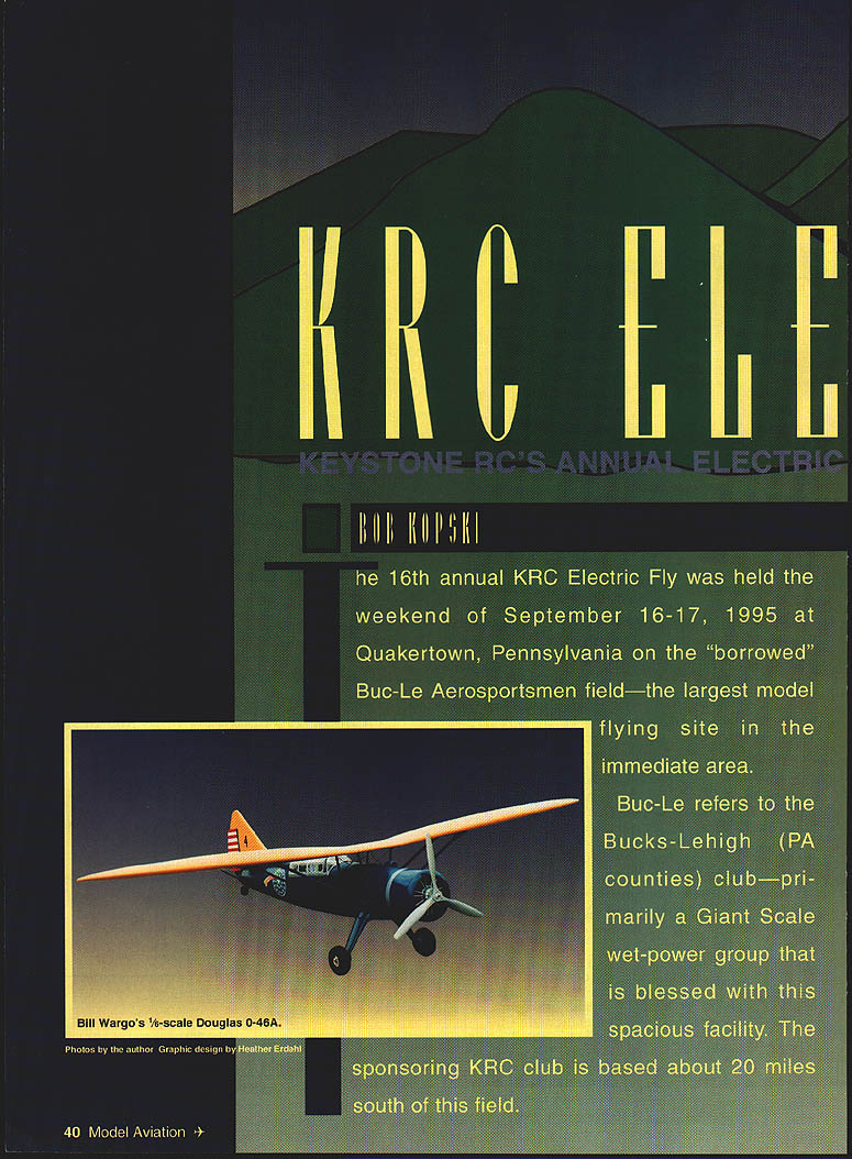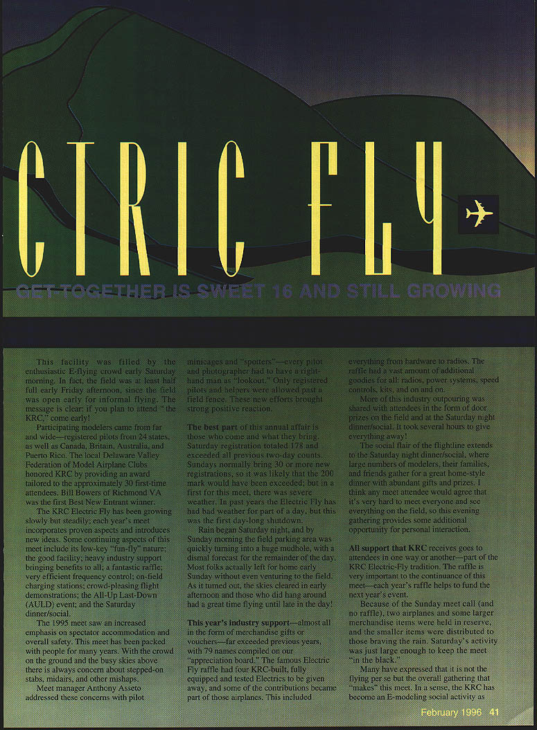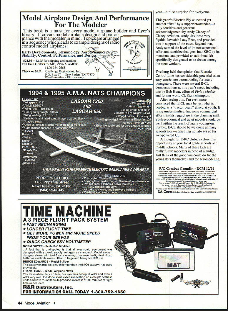 NO OCR TEXT NO OCR TEXT much flying affair Part collected warmth good will directly attributable meet being noncontest KRC meet format successful anywhere because everyone concert instead competitive conflict Over years KRC did include such activities rolls spins activities got difficult administrate meet grew larger tended interrupt open flying recently KRC has substituted all-staticjudging activities include such generalized challenges smallest aircraft best scale best technical effort Puget Sound Electric Model Flyers Special Interest Group Boeing Hawks R/C Flyers home club Bernard Cawley Bernard has published several E-articles various magazines well PSEMF newsletter has also worked manufacturers product evaluations has very active totally selfless way over years benefit club Because Bernards contributions PSEMF presented him grand surprise gift all-expenses-paid trip KRC 95 Ben Almojuela president group tells everyone gladly pitched support amazing thank Bernard As turned out trip troublefree Bernard arrived area late Thursday eveningsome four hours overduebut baggage including airplanes did arrive him motel just few miles home Bernard came over around 11 night frazzled tiredcertainly way begin KRC weekend assured Bernard hed flying meet no matter what put spare REVOLT charge As turned out wayward stuff did show up Friday afternoon able fly own two airplanes Bernard great time because truly unique gesture part own club Another PSEMF member Mitch Poling also attendance February 1996 43 Dave Baron Russ Pribanics 81-inch Britten-Norman Islander Jesse Burgin Acworth GA scaled-up 12-foot Flying Aces powered two Astro 15s weighs 12 pounds model Astro 40 21 cells 31 custom gear box 13 pounds Sam Willcox Lancaster PA Morris Hobbies Penknife WEP Turbo Plus 1012 x 10 prop lOx 1100 cells FX controller Herm Perez Kadet Sr has DeWalt cordless drill motors running 300 watts Master Airscrew props via 21 gears Wattchacallit Richard Rowe 12-sqft wing can carry variety packs video still cameras up 18 lb heU pur hI oonuI Uhoe rome ooh whU Uhe liriog KRCs Ken Stinson Turkey Volture Span 72 inches 54 ounces 10 1400s1 5G turning 12 x 8 Master Airscrew folder Model Airplane Design Performance Modeler book must model airplane builder flyers library covers model airplane design perfor mance modeler mind Topics arranged sequence leads example designs radio control model airplanes Early Developments Terminology Aer Stability Control Performance Desi $2495 shipping handing Toll Free Orders MC VISA & AMEX 1-800-364-2665 Check MO Challenge Engineering Inc PO Box 67 New Baden TX 77870 TX residents add lax -- US currency ics 1sP L yeara nice surprise everyone years Electric Fly witnessed yet another first supporter/attendeea truly sensitive generous acknowledgement Andy Clancy Clancy Aviation Andy kits very flyable loveable Lazy Bees provided kits support meet Beyond Andy sensed level immense personal effort sacrifice goes KRC its members provided additional kit specifically designated drawn among meet workers Ive long held opinion Electric Control Line has considerable potential easy entr& aeromodeling youngsters several E-CL demonstrations years meet including Bob Hunt editor Flying Models former world CL Stunt champion After seeing Im convinced E-CL may just what needed tractor beam aimed youth understanding some commercial efforts regard planning mill Such economical quiet models should well within reach youngsters Further E-CL should welcome schoolyardssomething always wet-powered CL thought E-RC clubs explore opportunity local grade schools middle schools kids really future modelers need nudge Just think good could youngsters themselves aeromodeling R/C Combat Gremlin RCM 12/92 Affordable Cnmputer cot Custnm Cores fnr Modelers Modelers coatbat Grrmlisrn Coess ooly 512 Short kiss $20 parreros wood Foil kits wood peroat 505 Cosbat osrrtottr root shotlfott kit Upgtade yosrgtidet Seas istroordiste cost new soing S5021 S07037 Gratis Lady Spitt 2M ott (anodes woodt wiog kin $35 EtodgerorLaesoo2lQoiokre500ooerr $0 per pair PsOsro 00550 3 thiok taings to40 parsl 550 4 thiok $65 -isotodes slabs Let 00001 5005 nest stab projeot Manofootorer ioqoirissianitsd ordets add 5$ S&ht CODs add $6 additioral Cootactos ores PO Boo $63 Soothbridge MA 01550 orISOSt 765-9995 44 Model Aviation MACHINE 3 PIECE FLIGHT PACK SYSTEM FAST RECHARGING LONGER FLIGHT TIME GET MORE POWER MORE SPEED FROM YOUR SERVOS QUICK CHECK ESV VOLTMETER NORM GOYER Scale R/C Modeler .A fact undisputed electronic equipment designed six-volt supply voltages standard Model aircraft designers lowered 48 volts years ago because lightest Nicad batteries available still far large heavy R/C use BRUCE EDWARDS Model Builder battery charge lasts much longer NiCd battery used previously FRANK TIANO Model Airplane News Yes have absolutely no fear systems accept 6 volts 7 volts very well Ive done some extensive testing couple units have found produce excess 300 minutes offlight time under load R&R Distributors Inc FOR IN FORMATION CALL TODAY 1800-7521650 besides having fun yourself year enjoyed special personal first Over yearsespecially times Electric-Fly ManagerI tried hard attract several people meet witness enjoy Electric its best same time dispel misimpressions may have often took years letters calls attain success Im now truly happy say two longterm holdouts came spectators Maynard Hill Tom Runge Heres hoping next year see em Electrics Another aspect Electric Fly weekend independent though timecoincident SR Batteries Symposium Friday Night Fly second year Symposium third Night Fly both very successful day-long symposium held nearby motel featured guest speakers covering wide range topics 100 modelers glued place whole day gathering Night Fly saw 20-some E modelers fly darkness delight field full spectators came equipped airplanes outfitted built-in lighting systems some simply stuck chemical light sticks onto existing models As usual no mishaps lots fun Fridays act
