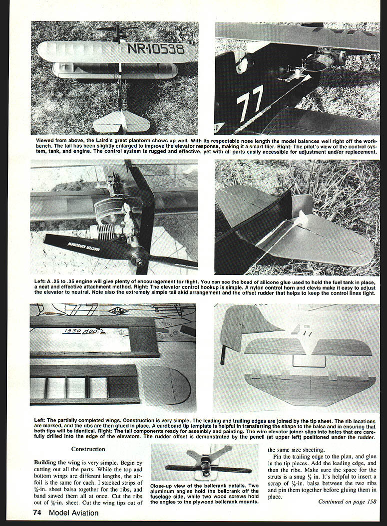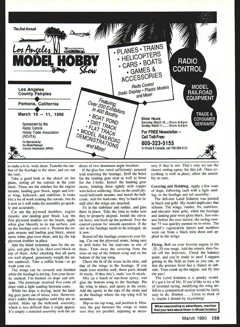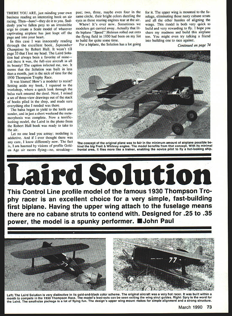 THERE YOU ARE just minding own business reading interesting book air racing Thenbarn Sud denly youve fallen prey irresistible urge create Scale model whatever captivating airplane has just leapt off page heart case innocently reading through excellent book September Champions Robert Hull wasnt till page 33 lost head Laird Solu tion always favorite full-size aircraft its beauty caption infected too seems Solution built less month just nick time 1930 Thompson Trophy Race kismet Hows modeler resist Setting aside book repaired workshop quick look through balsa rack ensured deed Next mined set three-view drawings out stack books piled shop made sure everything else needed balsa began yield knife sander just short weekend meta morphosis complete Now terrificlooking model Laird photo Robert Hull book ready take air Let no lead astray modeling addictive ever thought cure know differently now fact am haunted visions profile Gold en Age air racers flyingno streaking past two three maybe four same circle bright colors dazzling eyes roaring engines tear air Whew Its over now Sometimes modelers get carried away Actually lit tle biplane Speed Holman rolled out onto flying field 1930 list build quite some time biplane Solution has lot going upper wing mounted fu selage eliminating nasty cabane struts other hassles aligning wings model both very quick build very rewarding fly hope share madness build airplane too might try talking friend building race against Continued page 74 Laird Solution Control Line profile model famous 1930 Thompson Tro phy racer excellent choice very simple fast-building first biplane Having upper wing attach fuselage means no cabane struts contend Designed 25 35 power model spunky performer EJohn Paul March 1990 73 concept original plane fair minimum amount airplane possible hind big Pratt & Whitney engine model benefits concept its minimal frontal area flies like trainer enabling novice pilot fly hot-looking ship Left Laird Solution very distinctive its gold-and-black color scheme original aircraft very hot racer built within month compete 1930 Thompson Race models lead-outs can seen exiting wing strut guides Right Spry word Laird small-size package lot flying fun designs upper wing mount makes simple alignment strong structure Viewed above Lairds great plantorm shows up well its respectable nose length model balances well right off work bench tail has slightly enlarged improve elevator response making smart flier Right pilots view control sys tem tank engine control system rugged effective yet parts easily accessible adjustment and/or replacement Left 25 35 engine will give plenty encouragement flight can see bead silicone glue used hold fuel tank place neat effective attachment method Right elevator control hookup simple nylon control horn clevis make easy adjust elevator neutral Note also extremely simple tail skid arrangement offset rudder helps keep control lines tight Left partially completed wings Construction very simple leading trailing edges joined tip sheet rib locations marked ribs glued place cardboard tip template helpful transferring shape balsa ensuring both tips will identical Right tail components ready assembly painting wire elevator joiner slips holes care fully drilled edge elevators rudder offset demonstrated pencil upper left positioned under rudder Construction Building wing very simple Begin cutting out parts top bottom wings different lengths air foil same stacked strips A-in sheet balsa together ribs band sawed once Cut ribs out A-in sheet Cut wing tips out Close-up view bellcrank details Two aluminum angles hold belicrank off fuselage side two wood screws hold angles plywood belicrank mounts same size sheeting Pin trailing edge plan glue tip pieces Add leading edge ribs Make sure space struts snug / Its helpful insert scrap A-in balsa between two ribs pin together before gluing placeContinued page 158 74 Model Aviation AIR WOLF EPOXY FIBERGLASS FUSELAGES TAKES MOST 50-60 MECHANICS OTHER MODELS AVAILABLE LARRY JOLLY MODEL PRODUCTS $21000 5501 WCOMO SANTA ANA CALIFORNIA 92703 714 826-6861 ing spiraling air gracefully Free Flight models performed ballet-like maneuversfor part Sometimes model would get over-banked turn would witness re kitting model member low-wing Pacemaker field very radical airplane time almost models high wingers model thought bet ter efficient flier painted bright blue yellow prewar military air craft paint scheme its first hand-launched flight screamed sky shallow arching turn model headed down down towards ground fatal maneuver plane looked smooth graceful transfixed hypnotized watch ing demise airplane just before hitting ground Pacemaker righted itself bumped hard landing suffering damage landing gear left wing tip Blankety blank low-wingers never fly right fumed owner Id sell fifty cents anybody would offer continued Quick wink took him up offer ended up snazzy repairable Gas model Later came own fly models such Cleveland Cloudster Comet Zipper finally just before interrupted war Cleveland Play boy Other fond memories revolve around Pittsburgh-Allegheny County Airport flight path lived near saw early transports landed took offthe Boeing 247 race Douglas last vintage Ford Tn-motors Stinson Model American Airlines large cumbersome bi-winged Curtiss Condor course DC-2s DC-3s saw balloon rac es great dirigibles like Graf Zepplin Hindenburg mix presents quite memory fix Modeling days compli cated now never overly concerned safety though did prac tice Safety everyones responsibil ity Liability insurance wasnt thought of Seems like nothing sueable ever hap pened us chase re trieve errant model property owners werent hostile always helpful Spectators just seemingly glad just watch inter fere went back visit Five Fields couple years ago first time 40 years No will able fly unless high school planted old fly ing field can removed sat hill watched birds imagining graceful Free Flight models once years ago executed intricate ma neuvers fie