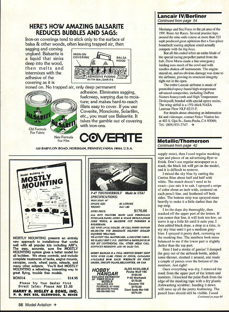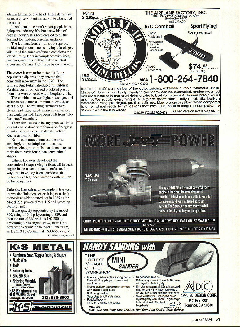 June1994 49 U Don Berliner Lancair IV prototype Its record-setting trip San Francisco Denver earned four-seat home-built touring plane place 1991 Reno Air Races pit area hopes could compete likes Sea Furys Mustangs Fuselage remains completely gear 76 dIameter proyaller 12 prop clearance 78 AFIER WORLD WAR U airplane factories switched fighters bombers private planes Beech Bonanza leapt spotlight its futuristic lines allmetal construction exotic V tail far ahead resunected prewar Piper Cubs Aeroncas Taylorcrafts Forty-five years later Bonanza looks about same remains top line has interior room bigger engine vastly improved radios navigation gear price has risen little $5000 $200000 its rivals have come gone Bonanza still Cadillac personal airplanes can updated 1946 airplane best American aircraft industry can come up someone wants get places huny isnt quite up buying Leaijet results decades progress aerodynamics materials about airplane less half cost Bonanza flies 100 mph faster same power tells everyone its owner out front comes advanced thinking Lancair does thanks its truly modern design Like almost other personal airplane has debuted past decade Lancair homebuilt like homebuilts offers performance looks eons beyond anything lightplane manufacturing industry USA France anywhere else have able build source such shocking differences mostly economic cost homebuilt neednt include labor its really recreation liability insurance advertising 50 Model Aviation Gallants Lancalr 320 1991 Oshkosh Kit Built Grand Champion Art Gallants Lycoming 0-320-powered Lancair 320 cost approximately $45000 Lancair 320 Oshkosh 91 Span 23 feet 6 inches gross weight 1685 lb administration overhead items have turned once-vibrant industry bunch memories isnt arent smart people lightplane industry its new kind cottage industry has created fill demand modern personal airplanes kit manufacturer turns out superbly molded major componentswings fuselages tailsand home craftsman completes job turning airplanes lines contours finishes make latest Pipers Cessnas look crude comparison secret composite materials Long popular sailplanes entered homebuilt movement 1970s brilliant Burt Rutan introduced tail-first VariEze built carved blocks plastic foam covered fiberglass cloth combination lighter stronger easier-to-build aluminum plywood steel tubing resulting airplanes cleaner aerodynamically advanced could possibly have built old fashioned materials dont seem practical limits what can done foam-and-fiberglass advanced materials such Kevlar carbon fiber Rutan continues turn out amazingly shaped airplanescanards tandem-wings push-pullsand continues make work better conventional shapes Others however developed conventional shape wing front tail back engine nose performed ways have long considered trademark high-tech factories milliondollar computers Take Lancair example very impressive little two-seater just sleek monoplane started out 1985 Model 235 powered 115 hp Lycoming 0-235 engine quickiy supplanted model 320 using 150 hp Lycoming 0-320 model 360 its 180-200 hp Lycoming 0-360 engine Now advanced version four-seat Lancair IV 350 hp Continental TSIO-550 engine Continued poge 54 K&S METAL Sport Flying Flys hour L THE AIRPLANE FACTORY INC 1880 PINt VItW MANDEVILLE LA 70448 504-626-7840 FRtt CATALOG R/C Cornball__________ Crash Resistant 48 wingspan 44 -5Ibs Aluminum Landing Gea Video 4$74 95 $595P&H $1295 PPLIST $89 95 VISA 1-800-264-7840 AM-X COD Kombat 40 member quick building extremely durable Armadillo senes Made aluminum polypropelyne no foam can assembled engine mounted radio installed hour NoThing extra buy provide 4 channel radio / 25-40 engine supply everything else great sports plane fully aerobatic bolt-on symmetrical wing pre-hinged pre-finished red blue orange yellow compared other almost ready fly designs take 10-12 hours longer complete Koinbat 40 true winner ORDER YOURS TODAVI Trainer Version available $8495 June1994 51 AluniinumlBrass/Copper Tubing & Shapes Music Wire Tools Soldering Irons Silk Silk Span Finishing Materials SEND $100 FOR iL2ijjjjjbN THE LITTLEST MI QNDER MIRACLE OF THE WORKSHOP Ever-taut adlustIe sanding belt paper saver Patented locking p~pIe. snaps taut s square rich usanie No waste hnger pill ingenious fasteiing dipA Pits smaJi large osrve resesses Use companion Mini-Strips assortedI small large beads grits wet dry Buy readymade bets Knife-edge sides own 8 bets standard sheeti Sands dose right angle fitrings Sturdy constructon High impad plasacAPPLIEDDESIGN CORP Padded body est quatty town tubber Tough enoughP 0Box 3384 Conforms variations surface heaviest wori hobbyist Mfrs househeder Torrance CA 90510 Add 20% far 8 & H -Glue Tips Stay-Tray Tee Bar Mini-Saw Ruft-SILIff & Jewel Stripes $795 shielded resistor spail plug lead 89 lded cover Prices include switch harness pulse switch Available T&G 8nons MM Brisson older CH systems 11 jJ[J new heavy-duty ignition system featuring Low drain high output circuit Will run 15000 rpm American-made spark coil Spark plug lead eas ily replaced Heavyduty aluminum case Iiitro Price $19995 List SUS SIO S&H NYS add 7% tax Reids Quality Model Products 16 Main Street Phelps New York 14532 Catalog S1OO 3155483779 American Made Lancair IV/Berliner Continued page 51 having twin-intercooled turbochargers two-seat models 235 320 360 share same airframe basic kit costs around $20000 cost finished airplane neighborhood $45000 has length 21 feet wingspan 23 feet six inches wing area 76 square feet gross weight 1685 pounds cabin three feet seven inches wide five feet three inches long three feet 61/2 inches high baggage capacity 50-90 pounds Performance course varies power Lancair 320 cruises 241 mph 8000 feet after sea-level takeoff run 700 feet 30 hp Lancair 360 cruises 250 mph Both will cruise along 1000 miles tank gas Lancair IV another matter entirely larger 25 feet long 30 feet 11/2 inch wingspan has 98 square feet wing area heavier 1750 pounds empty 2900 pound