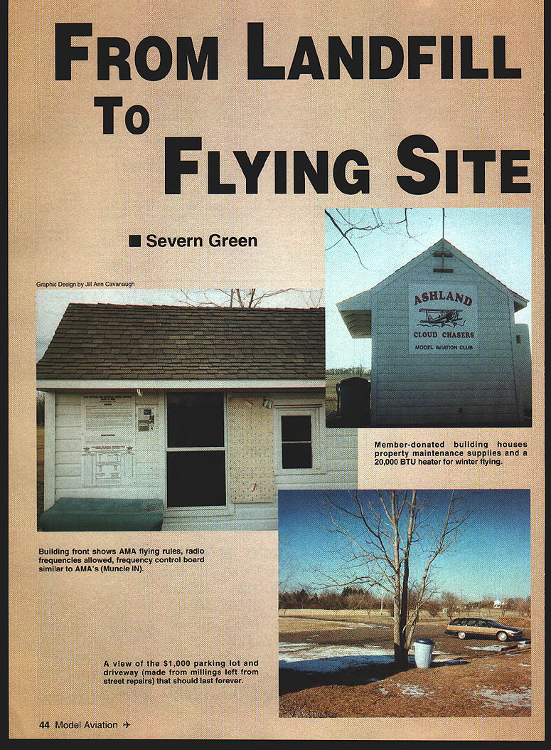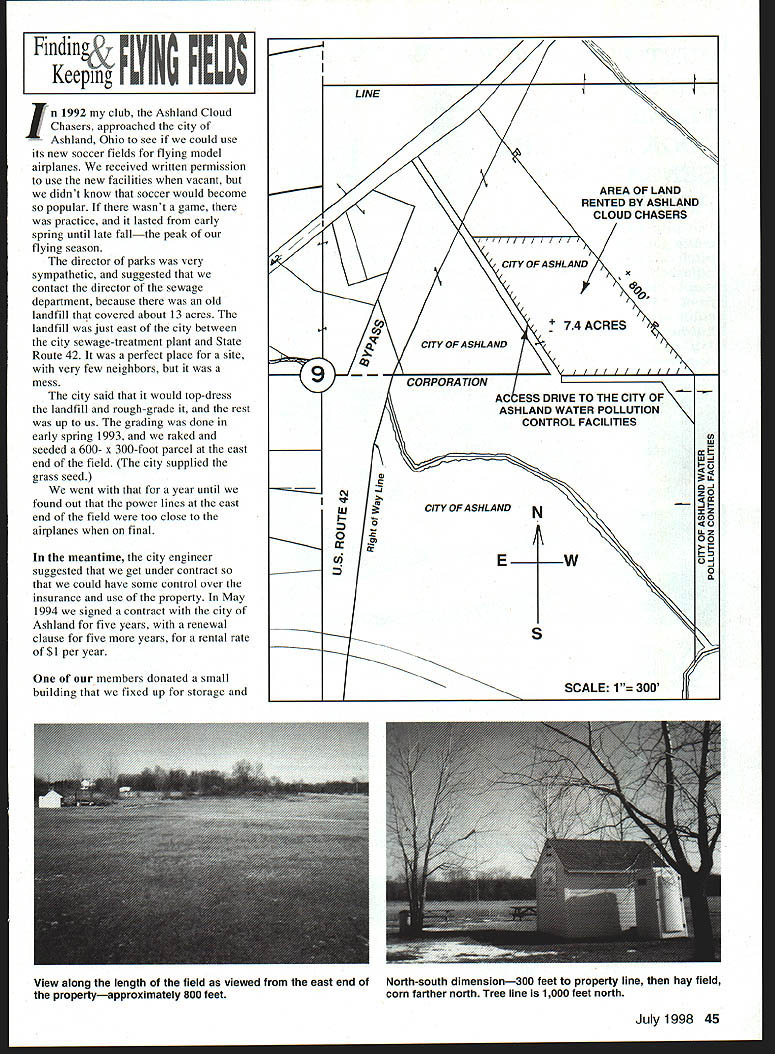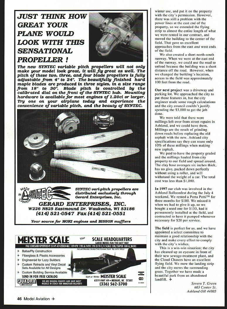 NO OCR TEXT Find Kee RYINC PillS n1992 club Ashland Cloud Chasers approached city Ashland Ohio see could use its new soccer fields flying model airplanes received written permission use new facilities vacant didnt know soccer would become popular wasnt game practice lasted early spring until late fallthe peak flying season director parks very sympathetic suggested contact director sewage department because old landfill covered about 13 acres landfill just east city between city sewage-treatment plant State Route 42 perfect place site very few neighbors mess city said would top-dress landfill rough-grade rest up us grading done early spring 1993 raked seeded 600- x 300-foot parcel east end field city supplied grass seed went year until found out power lines east end field too close airplanes final meantime city engineer suggested get under contract could have some control over insurance use property May 1994 signed contract city Ashland five years renewal clause five years rental rate $1 per year members donated small building fixed up storage AREA OF LAND RENTED BY ASHLAND CLOUD CHASERS CITY OF ASHLAND CITY OF ASHLAND CORPORATION AC ESS DRIVE TO THE CITY OF ASHLAND WATER POLLUTION CONTROL FACILITIES U U-I wCITY OF ASHLANDN -J 0 0 S SCALE 1 July1998 45 View along length field viewed east end ofNorth-south dimension300 feet property line hay field propertyapproximately 800 feetcorn farther north Tree line 1000 feet north JUST THINK HOW GREAT YOUR PLANE WOULD LOOK WITH THIS SENSATIONAL PROPELLER new SYIVTEC variable pitch propellers will make model look great will fly great welL pitch two three four blade propellers fully adjustable 4 24 beautifully finished hard maple blades produced three styles size range 18 30 Blade pitch controlled calibrated dial front SYNTEC hub Mounting hardware available engines 12Oci larger Try airplane today experience convenience variable pitch beauty SYNTEC winter use put property citys permission However still problem power lines east end property extended flying strip almost entire length what rented contract moved building center field gave us excellent approaches east west ends field also created short north-south runway east end runway could use road unload because building short distance off road However changed buildings location access field approximately 100 feet road next project driveway parking lot approached city put features city engineer made some rough calculations city council couldnt justify spending $3000 get job done told millings left over street repairs Ashland could have Millings result grinding down roads before replacing old asphalt new Ashland city specifications say can reuse 10% millings making new asphalt paid have property graded millings hauled city property field spread around clay base averages six inches thick has no give packed down perfectly using roller will withstand weight car total cost less $1000 1997 club involved Ashland Balloonfest during July 4 weekend rented Porta PottiTM three months $180 missed give up bought used $150 permanently installed field contracted have pumped whenever necessary $20 per service field perfect us have appointed select committee maintain good relationship city make effort comply citys wishes win-win situation city has cleaned up eyesore front new sewage-treatment plant Cloud Chasers have excellent flying field mow landing strip city mows surrounding grass Together have made beautiful park abandoned landfill 4Severn T Green 603 Center St Ashland OH 44805 46 Model Aviation EC van-pitch propellers IN AXWI1A~iA distributed exclusively through Gerard Enterprises Inc GERARD ENTERPRISES INC W226 N825 Eastmound Dr Waukesha WI 53186 414 521-0547 Fax 414 521-0551 source MOKI engines BISSON muufflers Call or wrlte MISTER SCALE 6319 HWY 49 NE NC 27302 336 562-3700