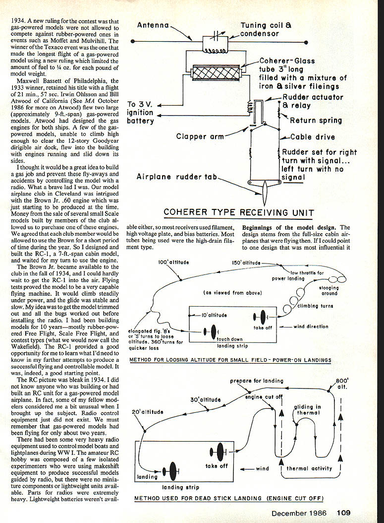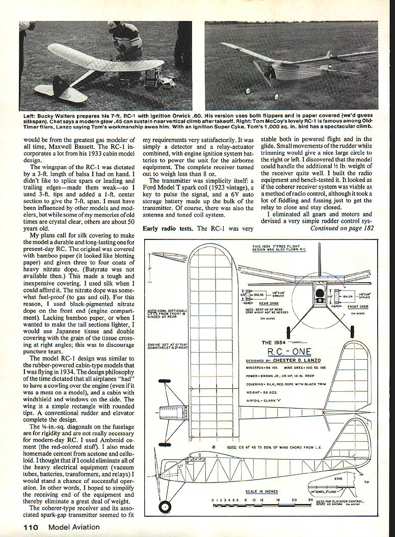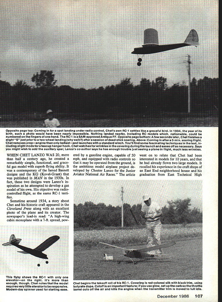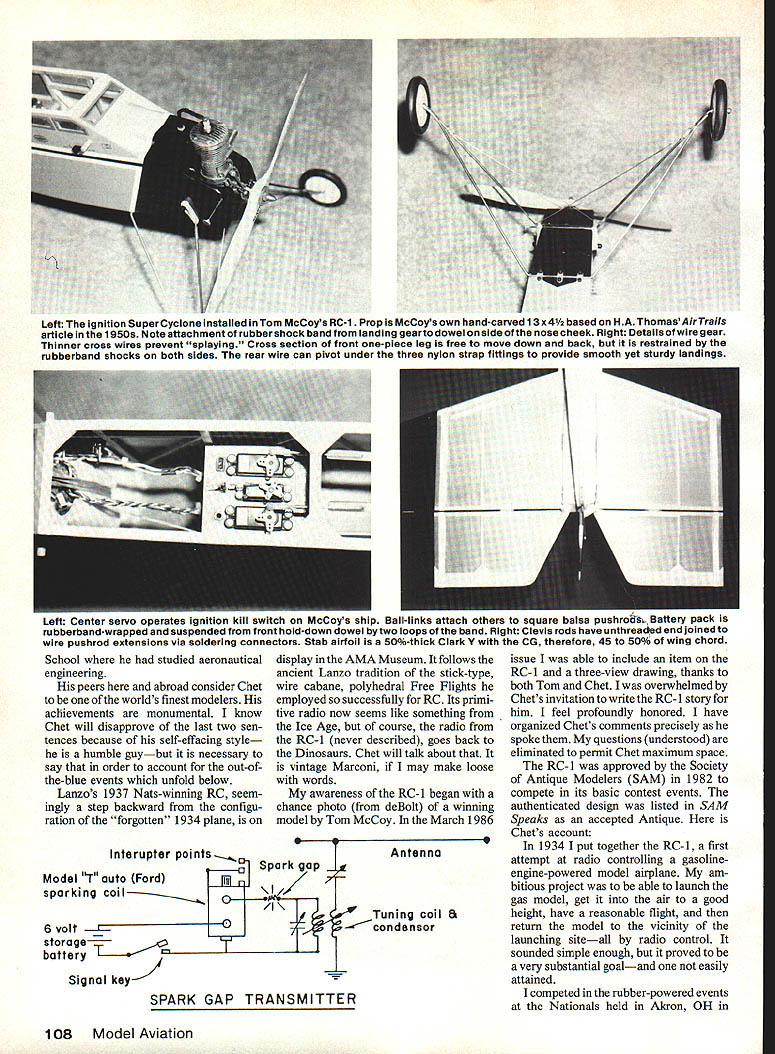 NO OCR TEXT Opposite page top Coming spot landing under radio control Chats own RC-1 settles like graceful bird 1934 year its birth such photo would have nearly impossible Nothing landed nearby including RC models nationwide could numbered fingers hand RC-1 SAM-approved Antique FP Opposite page bottom few seconds later Chet finishes slight S just prior two-wheel landing walk after session dead-stick soaring Above Coming after 5-mm soaring flight Chet removes propengine ballastand launches standard winch Youll find some fascinating techniques text cluding slight mods teacup hanger hook Chet watches wrinkles covering during launch eases off necessary Says might wish add auxIliary spar Lanzos co-author says has enough trouble just seeing plane flight much less wrinkles WHEN CHET LANZO WAS 20 half century ago created remarkably simple functional grace ful gas model superb flying ability contemporary famed Bassett designs KG Kovel-Orant published MAN 1 930s fact two designs Lanzos spiration attempted develop gas model own objective radiocontrolled flight name RC-l testi fies Sometime around 1934 story about Chet historic craft appeared Cleveland Press along excellent photo plane its creator newspapers lead-in read high-wing cabin monoplane 7-ft spread powThis flyby shows RC-1 elevatoron right Its enough though Chet notes model requiresvery little elevatorto responsive Modern-day spinner used starting ease ered gasoline engine capable 50 mph equipped radio controls may operated ground ambitious model airplane project de veloped Chester Lanzo Junior Aviator National Air Races article went relate Chet interested models 10 years already flown two large models recalled experience craft shops East End neighborhood house graduation East Technical High Chet begins takeoff roll RC-1 Covering red-colored silk black trim using butyrate dope Cutoff Important feature use glow set up carb throttle barrel cuts off air kills engine transmitter trim moved full idle December 1986 107 Left The ignition SuperCyclone installed Tom McCoys RC-1 McCoys own hand-carved 13 x4 based HA ThomasAir Trails article 19509 Note attachment rubbershock band landing gearto dowel sideofthe nose cheek Right Detailsof wire gear Thinner cross wires prevent splaying Cross section front one-piece leg free move down back restrained rubberband shocks both sides rear wire can pivot under three nylon strap fittings provide smooth yet sturdy landings Left Center servo operates ignition Kill switcn Mcloys snip Ball-links attach others square balsa pushroifS Battery pack rubberband-wrapped suspended front hold-down dowel two loops band Right Clevis rods have unthread end joined wire pushrod extensions via soldering connectors Stab airfoil 50%-thick Clark Y CG therefore 45 50% wing chord School studied aeronautical engineering peers abroad consider Chet worlds finest modelers achievements monumental know Chet will disapprove last two sen tences because self-effacing style humble guybut necessary say order account out-ofthe-blue events unfold below Lanzos 1937 Nats-winning RC seem ingly step backward configu ration forgotten 1934 plane display AMA Museum follows ancient Lanzo tradition stick-type wire cabane polyhedral Free Flights employed successfully RC Its primi tive radio now seems like something Ice Age course radio RC-1 never described goes back Dinosaurs Chet will talk about vintage Marconi may make loose words awareness RC- 1 began chance photo deBolt winning model Tom McCoy March 1986 Antenna Interupter Spark gap Model T auto Fordiii sparking coiI~ Tuning coil & 6 volt _con dens storage Signal key SPARK GAP TRANSMITTER issue able include item RC- 1 three-view drawing thanks both Tom Chet overwhelmed Chets invitation write RC- 1 story him feel profoundly honored have organized Chets comments precisely spoke questions understood eliminated permit Chet maximum space RC-1 approved Society Antique Modelers SAM 1982 compete its basic contest events authenticated desigu listed SAM Speaks accepted Antique Chets account 1934 put together RC-l first attempt radio controlling gasolineengine-powered model airplane am bitious project able launch gas model get air good height have reasonable flight return model vicinity launching siteall radio control sounded simple enough proved very substantial goaland easily attained competed rubber-powered events Nationals held Akron OH 108Model Aviation 1934 new ruling contest gas-powered models allowed compete against rubber-powered ones events such Moffet Mulvihill winner Texaco event made longest flight gas-powered model using new ruling limited amount fuel ound model weight Maxwell Bassett Philadelphia 1933 winner retained title flight 21 mm 57 sec Irwin Ohlsson Bill Atwood California See MA October 1986 Atwood flew two large approximately 9-ft-span gas-powered models Atwood designed gas engines both ships few gaspowered models unable climb high enough clear 1 2-story Goodyear dirigible air dock flew building engines running slid down its sides thought would great idea build gas job prevent fly-aways accidents controlling model radio What brave lad model airplane club Cleveland intrigued Brown Jr 60 engine just starting produced time Money sale several small Scale models built members club al lowed us purchase engines agreed club member would allowed use Brown short period time during year So designed built RC-1 7-ft-span cabin model waited turn use engine Brown Jr became available club fall 1934 could hardly wait get RC-l air Flying tests proved model very capable flying machine would climb steadily under power glide stable slow idea get model trimmed out bugs worked out before installing radio building models 10 yearsmostly rubber-pow ered Free Flight Scale Free Flight contest types what would now call Wakefield RC-1 provided good opportunity learn what Id need know further attempts produce successful flying controllable model indeed good starting point RC picture bleak 1934 did know anyone building bui