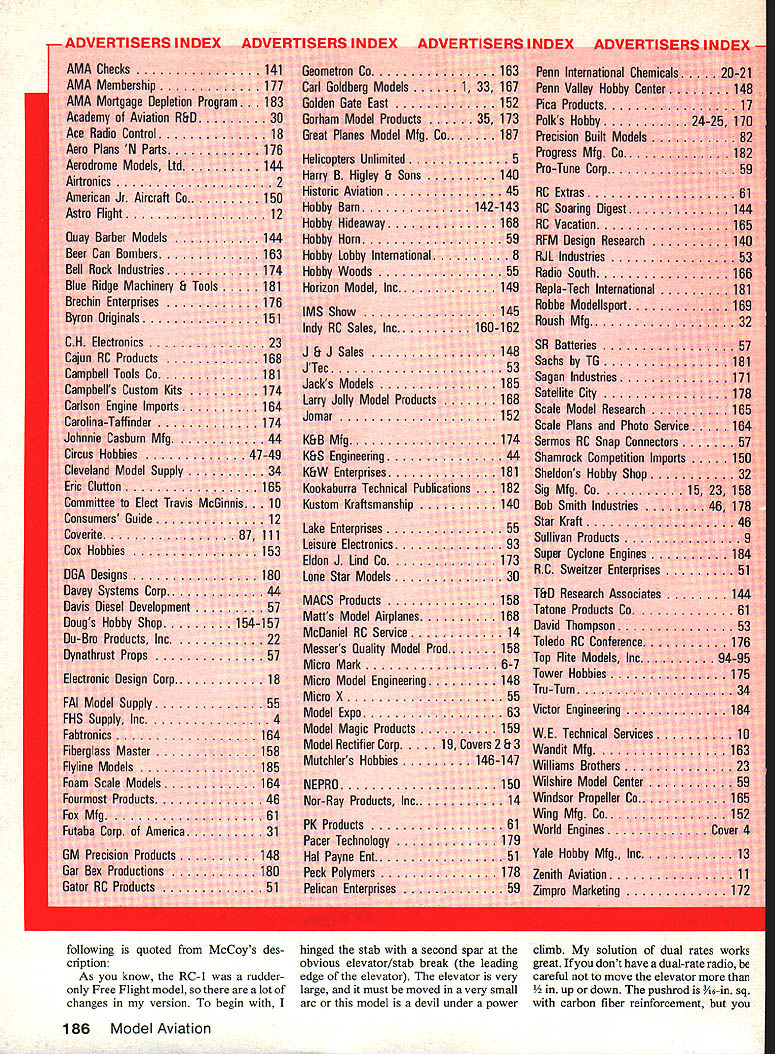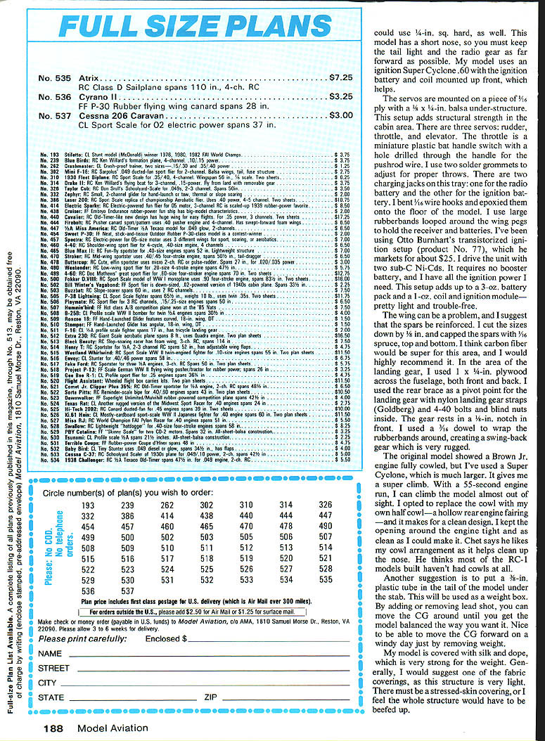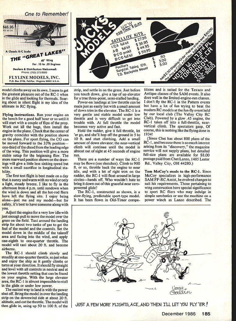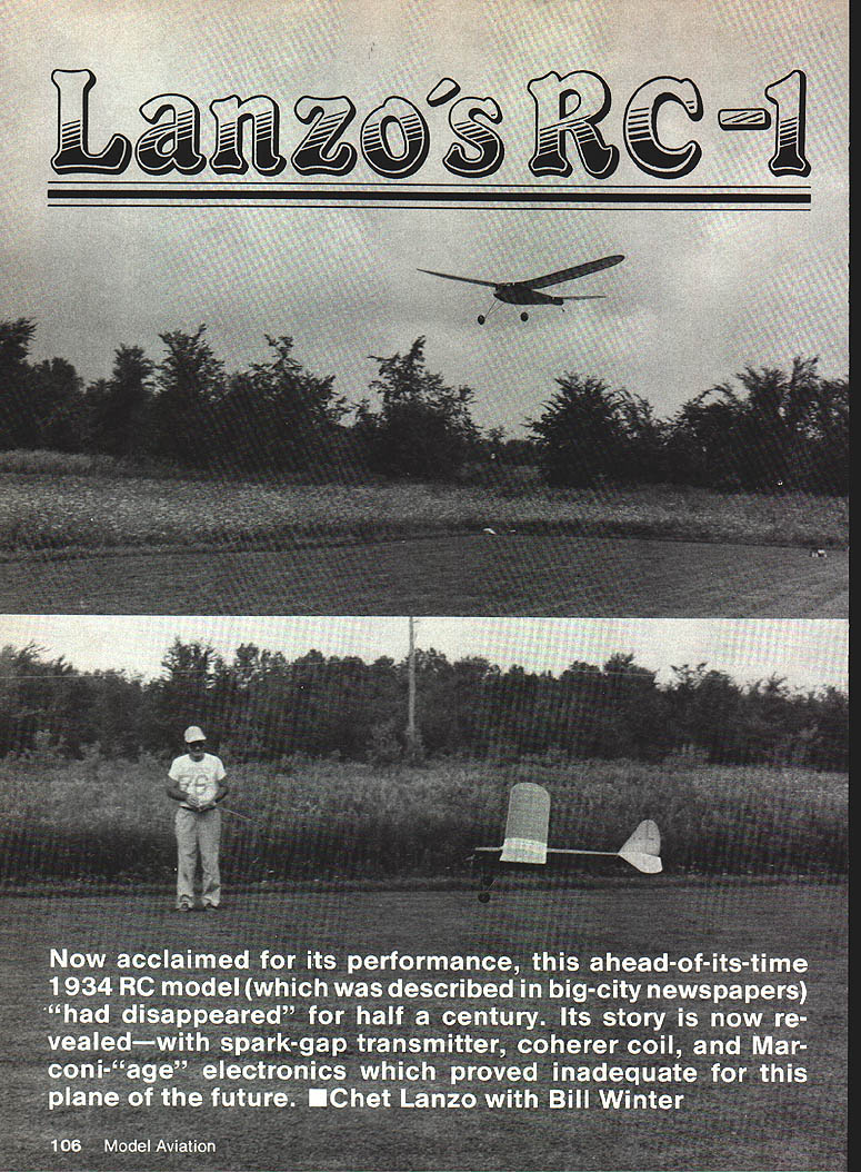 NO OCR TEXT Opposite page top Coming spot landing under radio control Chats own RC-1 settles like graceful bird 1934 year its birth such photo would have nearly impossible Nothing landed nearby including RC models nationwide could numbered fingers hand RC-1 SAM-approved Antique FP Opposite page bottom few seconds later Chet finishes slight S just prior two-wheel landing walk after session dead-stick soaring Above Coming after 5-mm soaring flight Chet removes propengine ballastand launches standard winch Youll find some fascinating techniques text cluding slight mods teacup hanger hook Chet watches wrinkles covering during launch eases off necessary Says might wish add auxIliary spar Lanzos co-author says has enough trouble just seeing plane flight much less wrinkles WHEN CHET LANZO WAS 20 half century ago created remarkably simple functional grace ful gas model superb flying ability contemporary famed Bassett designs KG Kovel-Orant published MAN 1 930s fact two designs Lanzos spiration attempted develop gas model own objective radiocontrolled flight name RC-l testi fies Sometime around 1934 story about Chet historic craft appeared Cleveland Press along excellent photo plane its creator newspapers lead-in read high-wing cabin monoplane 7-ft spread powThis flyby shows RC-1 elevatoron right Its enough though Chet notes model requiresvery little elevatorto responsive Modern-day spinner used starting ease ered gasoline engine capable 50 mph equipped radio controls may operated ground ambitious model airplane project de veloped Chester Lanzo Junior Aviator National Air Races article went relate Chet interested models 10 years already flown two large models recalled experience craft shops East End neighborhood house graduation East Technical High Chet begins takeoff roll RC-1 Covering red-colored silk black trim using butyrate dope Cutoff Important feature use glow set up carb throttle barrel cuts off air kills engine transmitter trim moved full idle December 1986 107 Left The ignition SuperCyclone installed Tom McCoys RC-1 McCoys own hand-carved 13 x4 based HA ThomasAir Trails article 19509 Note attachment rubbershock band landing gearto dowel sideofthe nose cheek Right Detailsof wire gear Thinner cross wires prevent splaying Cross section front one-piece leg free move down back restrained rubberband shocks both sides rear wire can pivot under three nylon strap fittings provide smooth yet sturdy landings Left Center servo operates ignition Kill switcn Mcloys snip Ball-links attach others square balsa pushroifS Battery pack rubberband-wrapped suspended front hold-down dowel two loops band Right Clevis rods have unthread end joined wire pushrod extensions via soldering connectors Stab airfoil 50%-thick Clark Y CG therefore 45 50% wing chord School studied aeronautical engineering peers abroad consider Chet worlds finest modelers achievements monumental know Chet will disapprove last two sen tences because self-effacing style humble guybut necessary say order account out-ofthe-blue events unfold below Lanzos 1937 Nats-winning RC seem ingly step backward configu ration forgotten 1934 plane display AMA Museum follows ancient Lanzo tradition stick-type wire cabane polyhedral Free Flights employed successfully RC Its primi tive radio now seems like something Ice Age course radio RC-1 never described goes back Dinosaurs Chet will talk about vintage Marconi may make loose words awareness RC- 1 began chance photo deBolt winning model Tom McCoy March 1986 Antenna Interupter Spark gap Model T auto Fordiii sparking coiI~ Tuning coil & 6 volt _con dens storage Signal key SPARK GAP TRANSMITTER issue able include item RC- 1 three-view drawing thanks both Tom Chet overwhelmed Chets invitation write RC- 1 story him feel profoundly honored have organized Chets comments precisely spoke questions understood eliminated permit Chet maximum space RC-1 approved Society Antique Modelers SAM 1982 compete its basic contest events authenticated desigu listed SAM Speaks accepted Antique Chets account 1934 put together RC-l first attempt radio controlling gasolineengine-powered model airplane am bitious project able launch gas model get air good height have reasonable flight return model vicinity launching siteall radio control sounded simple enough proved very substantial goaland easily attained competed rubber-powered events Nationals held Akron OH 108Model Aviation 1934 new ruling contest gas-powered models allowed compete against rubber-powered ones events such Moffet Mulvihill winner Texaco event made longest flight gas-powered model using new ruling limited amount fuel ound model weight Maxwell Bassett Philadelphia 1933 winner retained title flight 21 mm 57 sec Irwin Ohlsson Bill Atwood California See MA October 1986 Atwood flew two large approximately 9-ft-span gas-powered models Atwood designed gas engines both ships few gaspowered models unable climb high enough clear 1 2-story Goodyear dirigible air dock flew building engines running slid down its sides thought would great idea build gas job prevent fly-aways accidents controlling model radio What brave lad model airplane club Cleveland intrigued Brown Jr 60 engine just starting produced time Money sale several small Scale models built members club al lowed us purchase engines agreed club member would allowed use Brown short period time during year So designed built RC-1 7-ft-span cabin model waited turn use engine Brown Jr became available club fall 1934 could hardly wait get RC-l air Flying tests proved model very capable flying machine would climb steadily under power glide stable slow idea get model trimmed out bugs worked out before installing radio building models 10 yearsmostly rubber-pow ered Free Flight Scale Free Flight contest types what would now call Wakefield RC-1 provided good opportunity learn what Id need know further attempts produce successful flying controllable model indeed good starting point RC picture bleak 1934 did know anyone building bui