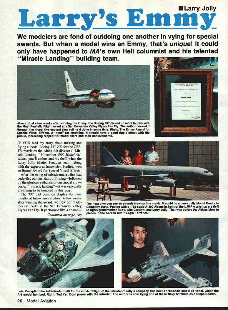 U Larry Jolly Larrys Emtny modelers fond outdoing another vying special awards model wins Emmy thats unique could have happened MAs own Heli columnist talented Miracle Landing building team IF YOU read story about making flying model Boeing 737-200 CBSTV movie Aloha Air disaster Mir acle Landing November 1990 Model Avi ation youll understand thrill Larry Jolly Model Products team along experts Introvision Studios won Emmy Award Special Visual Effects After string misadventures bedeviled first days filmingfollowed glorious catharsis models own perfect miracle landingit especially gratifying honored way 737 display nine months Introvision Studios few weeks after winning award flew madefor-TV model San Fernando Valley Flyers Fan Fly performed like champ Continued pare 148 26 Model Aviation Above Just few weeks after winning Emmy Boeing 737 picked up laurels Most Realistic Fiight award San Fernando Valley Flyers Fan Fly author coaxed through nicest five-second slow roil hed done sometime Right Emmy Award Special Visual Effects first modeling should have good rIpple effect public increasing respect model filers achievements next time see aircran blow up movie could tarry oiiy Model Products Company plane Posing ill 2-scale A-300 Alrbus front LJMP workshop left right grandmother Ruby wife Carolyn Larry Jolly before Airbus blew pieces Korean film Virgin TerrorIst Left Cockpit A-6 intruder built movie Flight intruder Jollys company also built 112-scale model Hanoi A-6 model bombed Right Ted Van Dorn poses intruder author now flying Navy bombers Slope Soarer models fill need hotdog show-off sport plane Knife edge take-offs flat spins snaps anything can Wing foam Fuselage Tail lite ply balsa Builds quick lands likes trainer Flying weight 10 lbs 184 13 lbs 192 1 Oh OHIO SUPERSTAR PRODUCTS INC 11375 RIDGEWAY ROADKENSINGTON OHIO 44427 7215-2231950 Larrys Emmy/Jolly Continued page 26 won Most Realistic Flight award team hand Emmy certificate display hundreds mod elers watching read Model Aviation article day turned out super homecoming ol 723 cant tell much means LIMP team able achieve such performance Winning Emmy model aircraft bound reverber ate better public image hobby hope everyone whos interested model aviation can share inand ultimately bene fit fromthis award After Miracle Landing couldnt have made except model makes glad proud II Big Bingol/Mathews Continued page 36 Adjust wire length servo end neutral position both servo horn surface being moved Disconnect pushrod horn end pull rods forward solder front links sil ver solder Temporarily remove fin stabi lizer give model final sanding before covering choice landing gear units given plan youre using 120-stroker smaller two-cycle engine Klett fiber glass gear included Ace 4-120 kit preferable since its nearly pound lighter longer aluminum unit Klett unit however will safely clear oaly 16-in props landing gear can secured fuselage block #6 x 1-in sheet metal screw 6-32 bolts blind nuts prefer Covering finishing Since Big Bingo wing uses stressed-skin engineer ing principle seen full-scale aviation depends covering material some its torsional strength Hence softer lower-heat covering plastics inappropri ate still leaves wide choice MonoKote Ultracote Oracover Koverall dress sheathing have tried successfully Heres quick-and-dirty approach fin ishing use plastic film everything except inside cowl under tank area latter sealed two coats K&B Superpoxy clear painted white Su perpoxy usually spray landing gear wheel pants Rustoleum course can use own custom finishing method long dont cover wings lower-heat materials prototypes covered ange transparent MonoKote Rustoleum white borders wing looks wonder ful some paint has chipped pre vent try using primer Mono Kote before spraying color used DJs Multistripe material pinstripes sealed fuelproofed brushing thin layer Superpoxy clear Wheel pants must Big Bingo wont look right Several choices available ABS variety Ace R/C works fine Ace also carries fiberglass AArr 0* TRIM 420.-tCSHEETS 0 oP major decalsOver 750 Select __________________________________*7 1/4 scale 118Sheets *80 Size38Sheets *40 size138Sheets *Propeiter Decais nly 16 Sheeis3sizeson ea *Kill Markings only16Sheets *Nomenclature Markings 13 Stzes-12 Sheets Black Whitecopy * T mShees 434 26 slOCoosseecoc cha * Letters Numbers l1/4-3/S-1/2-518-3/4-7S-1234413116 10 Coiors See coior chatl * Fags Ame can Unted Kngdom Cost ede e * Stasn 0 Coos 9 Sacs pus Slice o Asso ed S zes DECALS PRESSURE SENSITIVE WATER TRANSFE Aaihentic modei insignias preusare sensitlo e major decals water transfer 1/4 scale 40 60 size propeller decais World War ii hit mark ings stars hugs utters numbers trim sheets II LNOSTREAST SCREEN GRAPHICS 21 FtSHER AVE. EAST LONGMEADOW MA 01828 TEL 413-525-4110 148 Model Aviation SPORTOBATIC 17995 18995 84 Far 120 4-cycle 90 2-cycle T 200025003000- OPS 18 NEW 05 BGX13500 SCRATCHBUILD 14 SCALE PLANS span sheets price CESSNA AGWAGON 123S 4 ,S60O0 CESSNA U206TU206 107i5 0S650C CESSNA 152 AEROBAT 998 3 rS55OC PIPER PAWNEE[v32]T108 4 nrS6OOC TRANSA VIA AIRTRUK 1178 5 nS65O0 EDO FLOATS58 2rS3900 EDO AMPHIB FLOATS 61 3 0S4900 Add 40Z Surface Mail P & P VISA & MASTERCARD Welcome tEND l5zlt5tO POt COMPLETE LiSTiNG ALL PLANS tOOtS zuPtODUCTt SEcAICES Ff1 F WITH ALL itROtilS NEW ZEALAND AERO PRODUCTS 34 cues palatE STifLING POINT ELUFF NEW ZEALAND