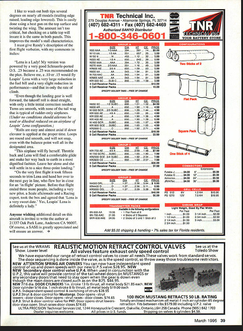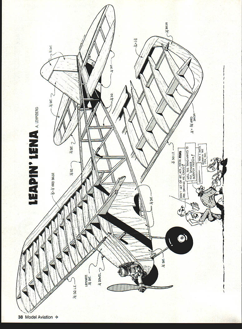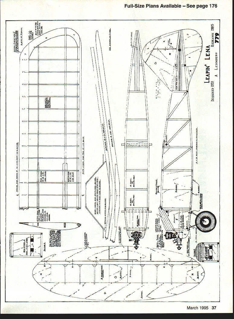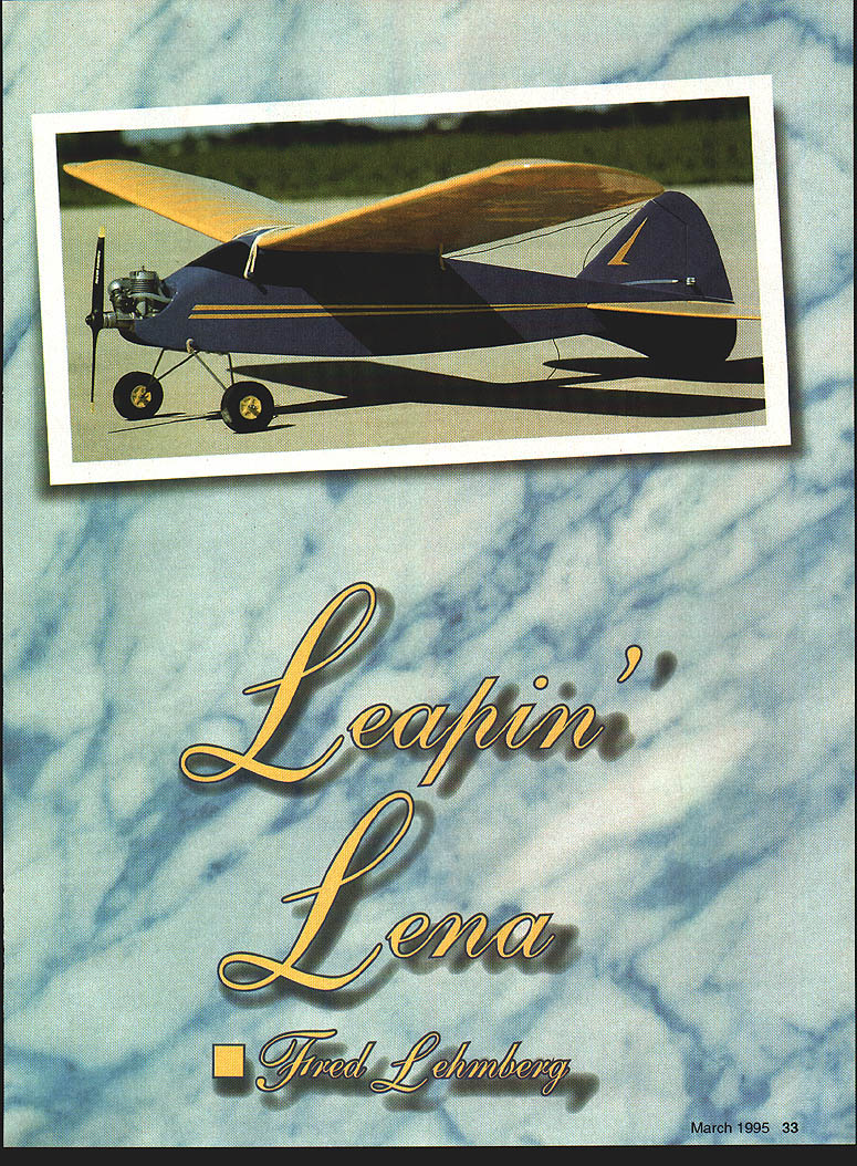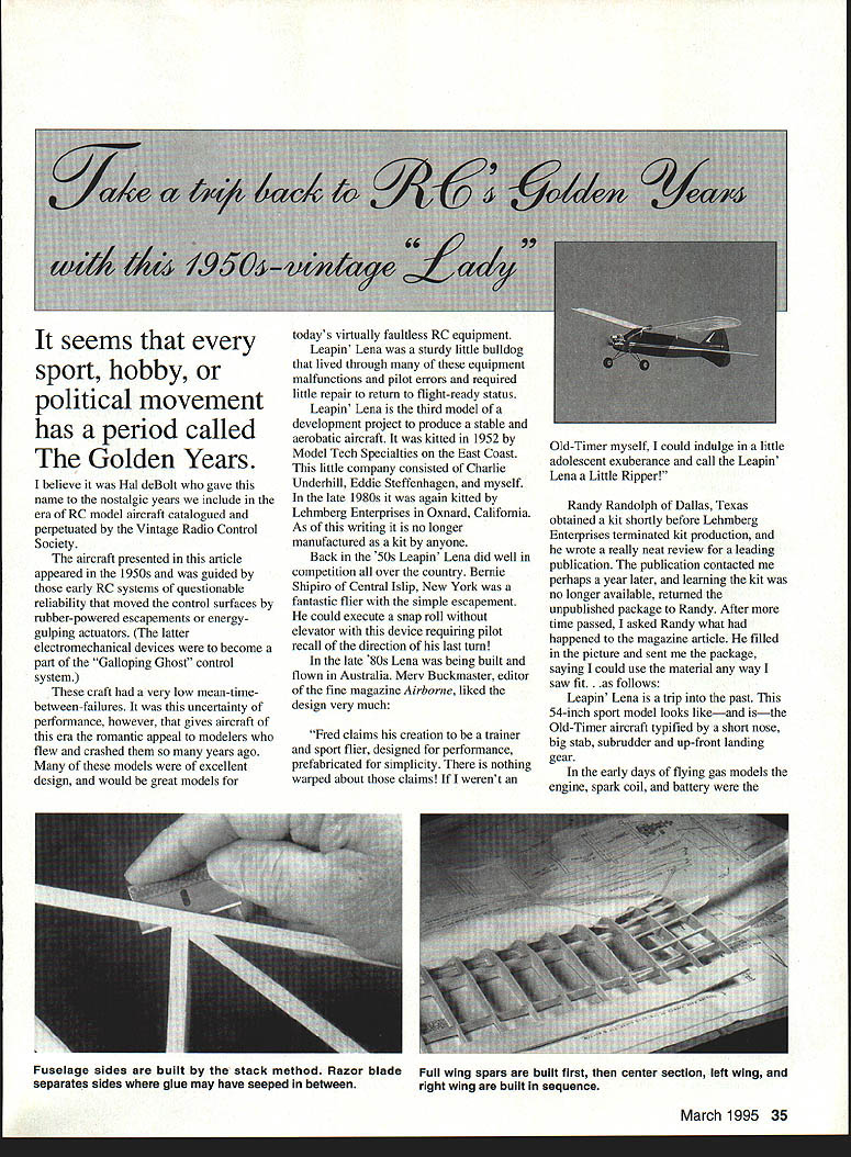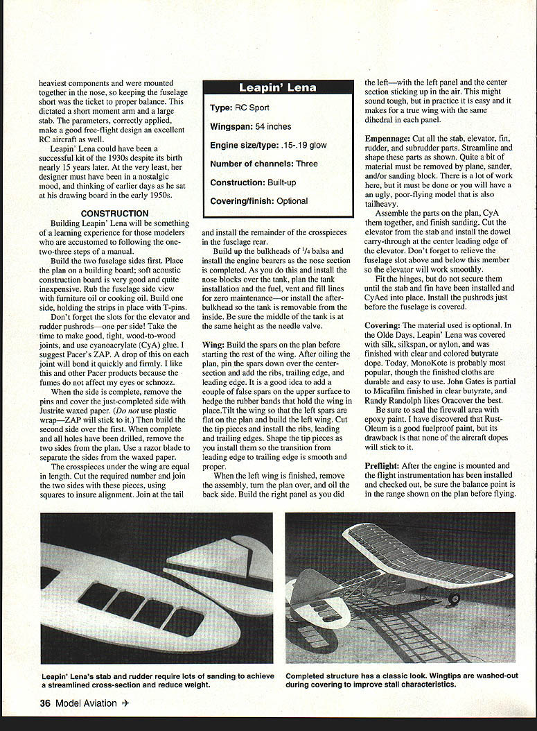 NO OCR TEXT sport hobby political movement has period called Golden Years believe Hal deBolt gave name nostalgic years include era RC model aircraft catalogued perpetuated Vintage Radio Control Society aircraft presented article appeared 1950s guided early RC systems questionable reliability moved control surfaces rubber-powered escapements energygulping actuators latter electromechanical devices become part Galloping Ghost control system craft very low mean-timebetween-failures uncertainty performance however gives aircraft era romantic appeal modelers flew crashed years ago models excellent design would great models todays virtually faultless RC equipment Leapin Lena sturdy little bulldog lived through equipment malfunctions pilot errors required little repair return flight-ready status Leapin Lena third model development project produce stable aerobatic aircraft kitted 1952 Model Tech Specialties East Coast little company consisted Charlie Underhill Eddie Steffenhagen myself late 1980s again kitted Lehmberg Enterprises Oxnard California As writing no longer manufactured kit anyone Back SOs Leapin Lena did well competition over country Bernie Shipiro Central Islip New York fantastic flier simple escapement could execute snap roll elevator device requiring pilot recall direction last turn late 80s Lena being built flown Australia Merv Buckmaster editor fine magazine Airborne liked design very much Fred claims creation trainer sport flier designed performance prefabricated simplicity nothing warped about claims werent Randy Randolph Dallas Texas obtained kit shortly before Lehmberg Enterprises terminated kit production wrote really neat review leading publication publication contacted perhaps year later learning kit no longer available returned unpublished package Randy After time passed asked Randy what happened magazine article filled picture sent package saying could use material way saw fit ows Leapin Lena trip past 54-inch sport model looks likeand isthe Old-Timer aircraft typified short nose big stab subrudder up-front landing gear early days flying gas models engine spark coil battery March 1995 35 seems Old-Timer myself could indulge little adolescent exuberance call Leapin Lena Little Ripper Fuselage sides built stack method Razor blade separates sides glue may have seeped between Full wing spars built first center section left wing right wing built sequence heaviest components mounted together nose keeping fuselage short ticket proper balance dictated short moment arm large stab parameters correctly applied make good free-flight design excellent RC aircraft well Leapin Lena could have successful kit 1 930s despite its birth nearly 15 years later very least designer must have nostalgic mood thinking earlier days sat drawing board early 1950s CONSTRUCTION Building Leapin Lena will something learning experience modelers accustomed following onetwo-three steps manual Build two fuselage sides first Place plan building board soft acoustic construction board very good quite inexpensive Rub fuselage side view furniture oil cooking oil Build side holding strips place T-pins Dont forget slots elevator rudder pushrodsone per side Take time make good tight wood-to-wood joints use cyanoacrylate CyA glue suggest Pacers ZAP drop joint will bond quickly firmly like other Pacer products because fumes affect eyes schnozz side complete remove pins cover just-completed side Justrite waxed paper use plastic wrapZAP will stick build second side over first complete holes have drilled remove two sides plan Use razor blade separate sides waxed paper crosspieces under wing equal length Cut required number join two sides pieces using squares insure alignment Join tail install remainder crosspieces fuselage rear Build up bulkheads 1/4 balsa install engine bearers nose section completed As install nose blocks over tank plan tank installation fuel vent fill lines zero maintenanceor install afterbulkhead tank removable inside sure middle tank same height needle valve Wing Build spars plan before starting rest wing After oiling plan pin spars down over centersection add ribs trailing edge leading edge good idea add couple false spars upper surface hedge rubber bands hold wing placeTilt wing left spars flat plan build left wing Cut tip pieces install ribs leading trailing edges Shape tip pieces install transition leading edge trailing edge smooth proper left wing finished remove assembly turn plan over oil back side Build right panel did leftwith left panel center section sticking up air might sound tough practice easy makes true wing same dihedral panel Empennage Cut stab elevator fin rudder subrudder parts Streamline shape parts shown Quite bit material must removed plane sander and/or sanding block lot work must done will have ugly poor-flying model also taliheavy Assemble parts plan CyA together finish sanding Cut elevator stab install dowel carry-through center leading edge elevator Dont forget relieve fuselage slot above below member elevator will work smoothly Fit hinges secure until stab fin have installed CyAed place Install pushrods just before fuselage covered Covering material used optional Olde Days Leapin Lena covered silk silkspan nylon finished clear colored butyrate dope Today MonoKote probably popular though finished cloths durable easy use John Gates partial Micafilm finished clear butyrate Randy Randolph likes Oracover best sure seal firewall area epoxy paint have discovered Rust Oleum good fuelproof paint its drawback aircraft dopes will stick Preflight After engine mounted flight instrumentation has installed checked out sure balance point range shown plan before flying 36 Model Aviation RO Sport Wingspan 54 inches Engine size/type 15-19 glow Number channels Three Construction Built-up Covering/finish Optional Leapin Lenas stab rudder require lots sanding achieve streamlined cross-section reduce weight Completed structure has classic look Wingtips washed-out during covering improve stall 