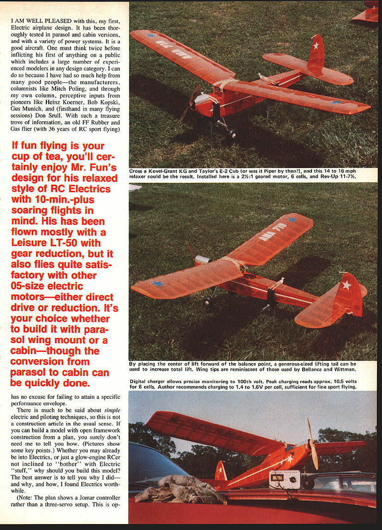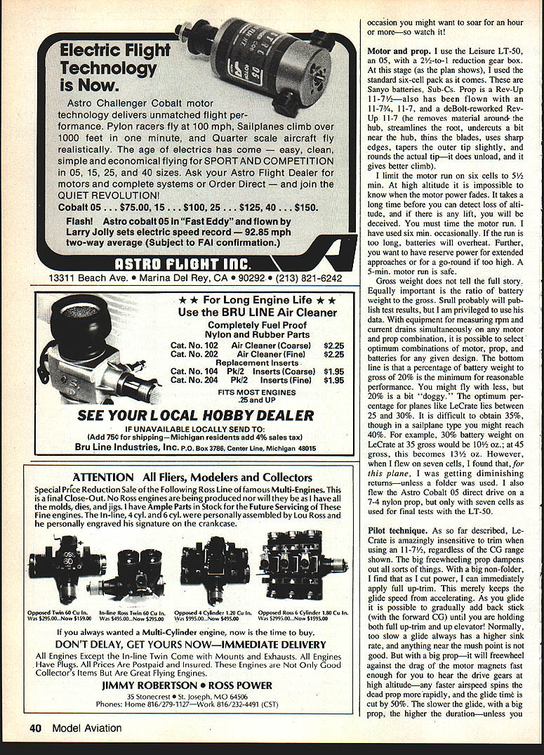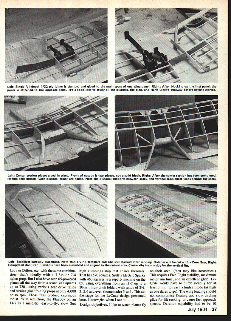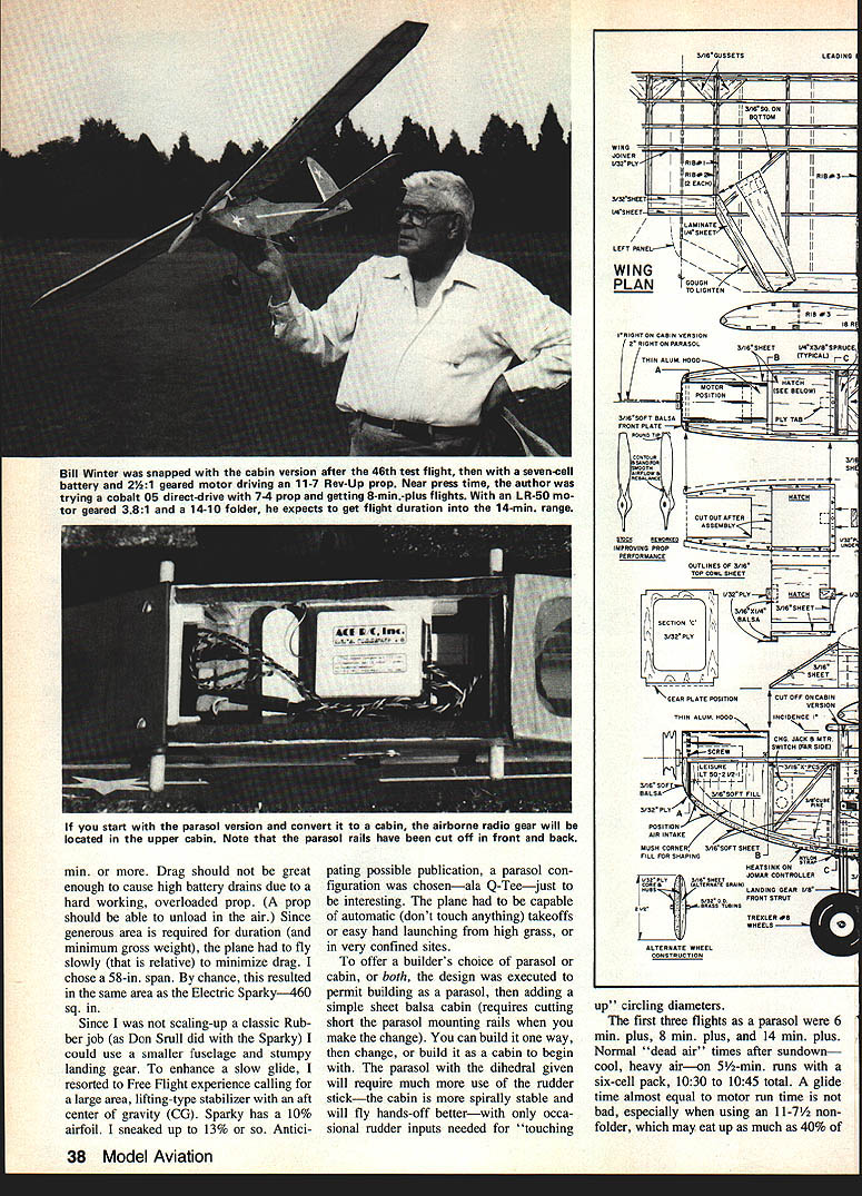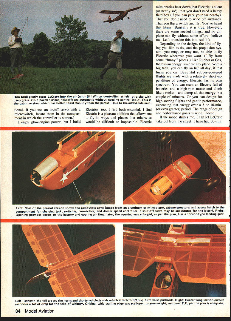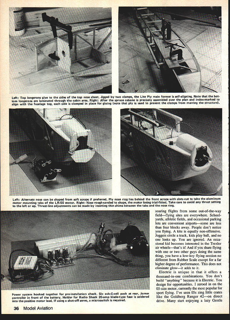 NO OCR TEXT AM WELL PLEASED first Electric airplane design has thor oughly tested parasol cabin versions variety power systems good aircraft must think twice before inflicting first anything public includes large number experi enced modelers design category can because have much help good peoplethe manufacturers columnists like Mitch Poling through own column perceptive inputs pioneers like Heinz Koemer Bob Kopski Gus Munich firsthand flying sessions Don Srull such treasure trove information old FF Rubber Gas flier 36 years RC sport flying fun flying cup tea youll cer tainly enjoy Mr Funs design relaxed style RC Electrics 10-min-plus soaring flights mind has flown mostly Leisure LT-50 gear reduction also flies quite satis factory other 05-size electric motorseither direct drive reduction Its choice whether build para sot wing mount cabinthough conversion parasol cabin can quickly done has no excuse failing attain specific performance envelope much said about simple electric piloting techniques construction article usual sense can build model open framework construction plan surely dont need tell Pictures show some key points Whether may already Electrics just glow-engine RCer inclined bother' Electric stuff should build model best answer tell did found Electrics worth Note plan shows Jomar controller rather three-servo setup op E-2 Cub itand relaxer could result Installed 2A1 geared motor 6 cells RevUp 11 .d increase total lift Wing tips reminiscent used Bellanca Wittman Digital charger allows precise monitoring 100th volt Peak charging reads approx 105 volts R mile flmnihor romnmmande rhnrninn to SW nor rail e,ffiriont fine anon flvina tional use on/off servo microswitch locate compart ment controller shown enjoy glow-engine power build Electrics too find both essential find Electric pleasant addition allows fly ways places otherwise would difficult impossible Electric missionaries bear down Electric silent nearly dont need heavy field box can park car nearby dont need wipe off airplanes flip switch fly Youve heard litany Basically true However some needed things no air plane can fly some effortbelieve Lets translate real life Depending design kind fly ing like propulsion sys tem may may able fly Electric wherever want fly some funny places Like Rubber Gas energy limit plane big tank can fly RC day turns Beautiful rubber-powered flights made relatively short ex penditure energy Electric has its own spectrum can cram Electric full batteries high-rpm motor climb like rocketand dump energy couple minutes can design high soaring flights gentle performance expending energy over 5 10-mm greater period range design performance goals wide indeed mood strikes can let LeCrate take off street have 30-mm Left Nose parasol version shows removable cowl made aluminum printing plate cabane structure access hatch compartment charging iack switches connectors Jomar speed controller shut-off servo may substituted latter Right Opening provides access battery cooling air flow later opening enlarged per plan Has torsion-type landing gear Left Beneath tail see horns shortened clevis rods attach 3/16 sq firm balsa pushrods Right Center wing section cutout sacrifices bit drag sake whimsy Original wide trailing edge scalloped save weight narrower TE per plan adequate 34 Model Aviation Don SruH gently eases LeLrate tne air witn MIII vvinter controiiing tetti site witn deep grass paved surface takeoffs automatic needing control input cabin version has better spiral stability parasoldue added side area NO OCR TEXT Left Top longerons glue sides top nose sheet Jigged two clamps Lite Ply main former self-aligning Note bot tom longerons laminated through cabin area Right After spruce cabane precisely assembled over plan index-marked align fuselage top side clamped place gluing note ply used prevent clamps marring structure r soaring flights some out-of-the-way fieldflying sites everywhere School yards athletic fields occasional parking lots convenient airportssome less four blocks away People dont notice flying kite equally non-offensive Joggers circle track kids play ball no looks up ignored An occa sional kid becomes interested Trexler air wheelsthats share flying two other guys doing same thing have low-key flying session no different Rubber Scale except far higher degree performance does eliminate glowit adds Electric unique offers thousand-in-one combinations dont build anything because Electric design opportunities zeroed 05-size motor currently popular sport flying Ive seen OSs zing little crates like Goldberg Ranger 42on direct drive start enjoying lazy Gentle Left Alternate nose can shaped soft scraps preferred Ply nose ring lies behind front scraps slots cut take aluminum motor mounting tabs LR-50 motor Right Nose rough-sanded shape motor being trial-fitted Take care avoid thrust setting left up Thrust-line adjustments can made inserting thin shims between tabs nose ring Power system hooked together pre-installation check Six sub-C-cell pack rear Jomar controller front battery Holder Radio Shack 20-amp blede-type fuse soldered positive motor lead using shut-off servo microswitch required 36 Model Aviation Left Single full-depth 1/32 ply joiner clamped glued main spars wing panel Right After blocking up first panel joiner attached opposite paneL Its good idea study pictures plan Hank Clarks cutaway before getting started Left Center section pieces glued place Front cutout two pieces solid block Right After center section has completed leading edge gussets diagonal grain added Note diagonal supports between spars vertical-grain sheet webs behind spars Left Stabilizer partially assembled Note thin ply rib template ribs still stacked after sanding Notches will cut Zona Saw Right Completed stabilizer Elevators have assembled aligned cutout area Center ribs form slot vertical fin Lady Drifter etc same combina tionthats ideally 7-3 7-4 nylon prop also have seen 05-powered planes way scant 300 squares up 720using var