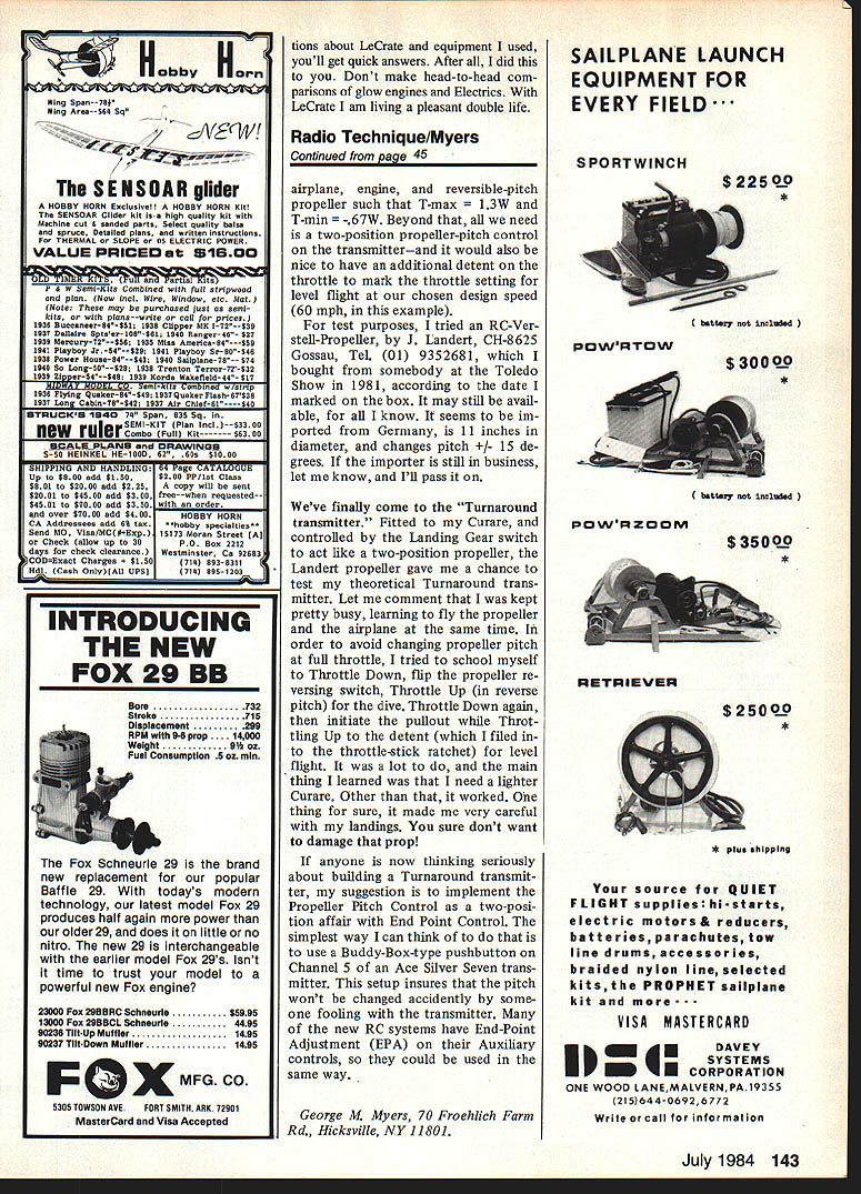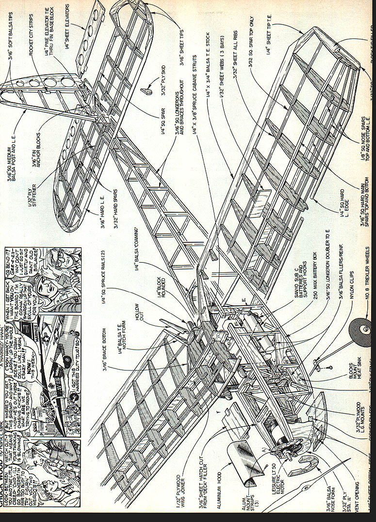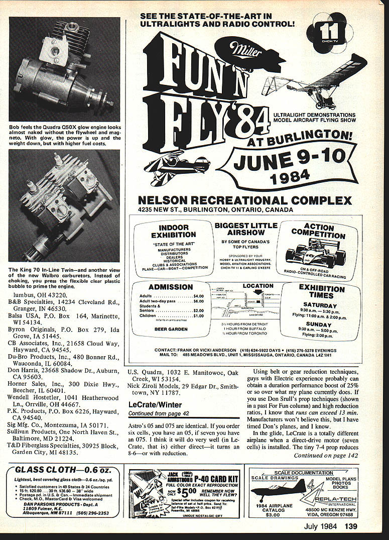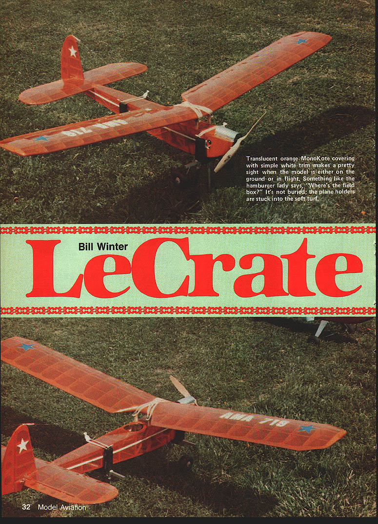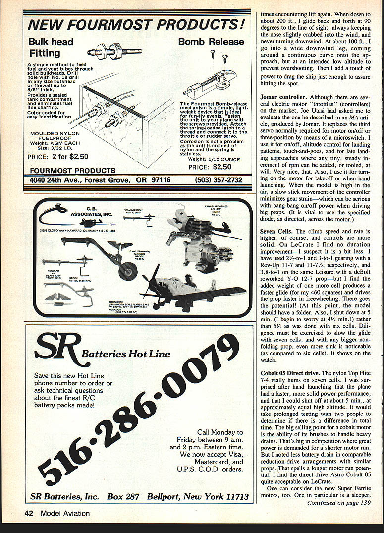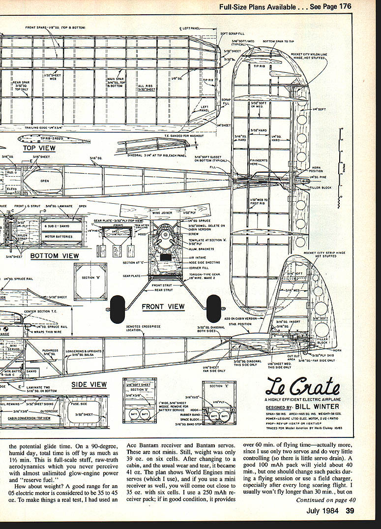 NO OCR TEXT AM WELL PLEASED first Electric airplane design has thor oughly tested parasol cabin versions variety power systems good aircraft must think twice before inflicting first anything public includes large number experi enced modelers design category can because have much help good peoplethe manufacturers columnists like Mitch Poling through own column perceptive inputs pioneers like Heinz Koemer Bob Kopski Gus Munich firsthand flying sessions Don Srull such treasure trove information old FF Rubber Gas flier 36 years RC sport flying fun flying cup tea youll cer tainly enjoy Mr Funs design relaxed style RC Electrics 10-min-plus soaring flights mind has flown mostly Leisure LT-50 gear reduction also flies quite satis factory other 05-size electric motorseither direct drive reduction Its choice whether build para sot wing mount cabinthough conversion parasol cabin can quickly done has no excuse failing attain specific performance envelope much said about simple electric piloting techniques construction article usual sense can build model open framework construction plan surely dont need tell Pictures show some key points Whether may already Electrics just glow-engine RCer inclined bother' Electric stuff should build model best answer tell did found Electrics worth Note plan shows Jomar controller rather three-servo setup op E-2 Cub itand relaxer could result Installed 2A1 geared motor 6 cells RevUp 11 .d increase total lift Wing tips reminiscent used Bellanca Wittman Digital charger allows precise monitoring 100th volt Peak charging reads approx 105 volts R mile flmnihor romnmmande rhnrninn to SW nor rail e,ffiriont fine anon flvina tional use on/off servo microswitch locate compart ment controller shown enjoy glow-engine power build Electrics too find both essential find Electric pleasant addition allows fly ways places otherwise would difficult impossible Electric missionaries bear down Electric silent nearly dont need heavy field box can park car nearby dont need wipe off airplanes flip switch fly Youve heard litany Basically true However some needed things no air plane can fly some effortbelieve Lets translate real life Depending design kind fly ing like propulsion sys tem may may able fly Electric wherever want fly some funny places Like Rubber Gas energy limit plane big tank can fly RC day turns Beautiful rubber-powered flights made relatively short ex penditure energy Electric has its own spectrum can cram Electric full batteries high-rpm motor climb like rocketand dump energy couple minutes can design high soaring flights gentle performance expending energy over 5 10-mm greater period range design performance goals wide indeed mood strikes can let LeCrate take off street have 30-mm Left Nose parasol version shows removable cowl made aluminum printing plate cabane structure access hatch compartment charging iack switches connectors Jomar speed controller shut-off servo may substituted latter Right Opening provides access battery cooling air flow later opening enlarged per plan Has torsion-type landing gear Left Beneath tail see horns shortened clevis rods attach 3/16 sq firm balsa pushrods Right Center wing section cutout sacrifices bit drag sake whimsy Original wide trailing edge scalloped save weight narrower TE per plan adequate 34 Model Aviation Don SruH gently eases LeLrate tne air witn MIII vvinter controiiing tetti site witn deep grass paved surface takeoffs automatic needing control input cabin version has better spiral stability parasoldue added side area NO OCR TEXT Left Top longerons glue sides top nose sheet Jigged two clamps Lite Ply main former self-aligning Note bot tom longerons laminated through cabin area Right After spruce cabane precisely assembled over plan index-marked align fuselage top side clamped place gluing note ply used prevent clamps marring structure r soaring flights some out-of-the-way fieldflying sites everywhere School yards athletic fields occasional parking lots convenient airportssome less four blocks away People dont notice flying kite equally non-offensive Joggers circle track kids play ball no looks up ignored An occa sional kid becomes interested Trexler air wheelsthats share flying two other guys doing same thing have low-key flying session no different Rubber Scale except far higher degree performance does eliminate glowit adds Electric unique offers thousand-in-one combinations dont build anything because Electric design opportunities zeroed 05-size motor currently popular sport flying Ive seen OSs zing little crates like Goldberg Ranger 42on direct drive start enjoying lazy Gentle Left Alternate nose can shaped soft scraps preferred Ply nose ring lies behind front scraps slots cut take aluminum motor mounting tabs LR-50 motor Right Nose rough-sanded shape motor being trial-fitted Take care avoid thrust setting left up Thrust-line adjustments can made inserting thin shims between tabs nose ring Power system hooked together pre-installation check Six sub-C-cell pack rear Jomar controller front battery Holder Radio Shack 20-amp blede-type fuse soldered positive motor lead using shut-off servo microswitch required 36 Model Aviation Left Single full-depth 1/32 ply joiner clamped glued main spars wing panel Right After blocking up first panel joiner attached opposite paneL Its good idea study pictures plan Hank Clarks cutaway before getting started Left Center section pieces glued place Front cutout two pieces solid block Right After center section has completed leading edge gussets diagonal grain added Note diagonal supports between spars vertical-grain sheet webs behind spars Left Stabilizer partially assembled Note thin ply rib template ribs still stacked after sanding Notches will cut Zona Saw Right Completed stabilizer Elevators have assembled aligned cutout area Center ribs form slot vertical fin Lady Drifter etc same combina tionthats ideally 7-3 7-4 nylon prop also have seen 05-powered planes way scant 300 squares up 720using var