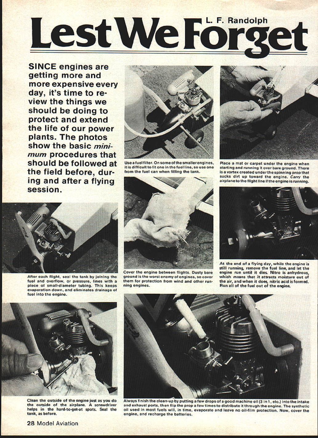 F Randolph Lest Forget SINCE engines getting more expensive day its time re view things should doing protect extend life power plants photos show basic mini mum procedures should followed field before dur ing after flying session Clean outside engine just outside airplane screwdriver helps hard-to-get-at spots Seal tank before 28 Model Aviation UseafuelfilterOnsomeofthesmallerengines Place mat carpet under engine difficult fit fuel line souse starting running over bare ground fuel can filling tank vortex created under spinning prop sucks dirt up toward engine Carry airplane flight line engine running After flight seal tank joining fuel overflow pressure lines piece small-diameter tubing keeps evaporation down eliminates drainage fuel engine Cover engine between flights Dusty bare ground worst enemy engines cover protection wind other run ning engines end ot flying day engine still running remove fuel line let engine run until dies Nitro anhydrous means attracts moisture out air does nitric acid formed Run fuel out engine 1-up ny putting tew drops Ot good machine Oil etc intake ano exnaust pans tnen flip prop few times distribute through engine synthetic oil used fuels will time evaporate leave no oil-film protection Now cover engine recharge batteries