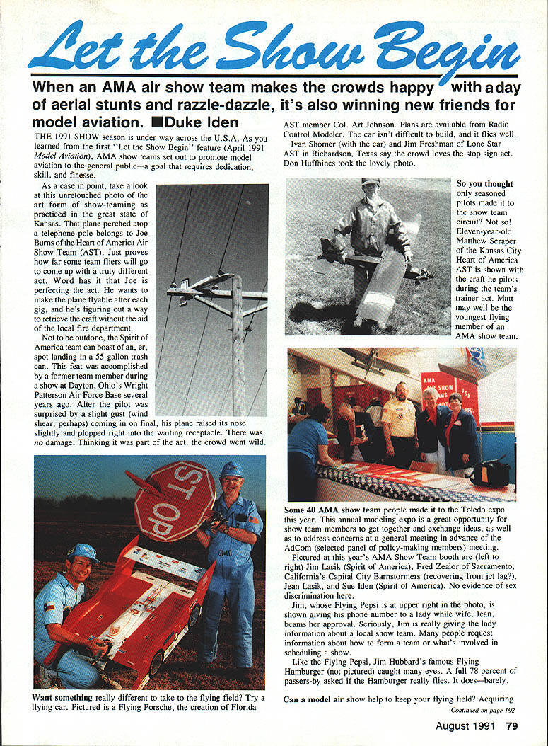det r6e S6caat ec AMA air show team makes crowds happy aday aerial stunts razzle-dazzle its also winning new friends model aviation U Duke Iden THE 1991 SHOW season under way across USA As learned first Let Show Begin feature April 1991 Model Aviation AMA show teams set out promote model aviation general publica goal requires dedication skill finesse As case point take look unretouched photo art form show-teaming practiced great state Kansas plane perched atop telephone pole belongs Joe Burns Heart America Air Show Team AST Just proves far some team fliers will go come up truly different act Word has Joe perfecting act wants make plane flyable after gig hes figuring out way retrieve craft aid local fire department outdone Spirit America team can boast er spot landing 55-gallon trash can feat accomplished former team member during show Dayton Ohios Wright Patterson Air Force Base several years ago After pilot surprised slight gust wind shear perhaps coming final plane raised its nose slightly plopped right waiting receptacle no damage Thinking part act crowd went wild Want something really different take flying field Try flying car Pictured Flying Porsche creation Florida AST member Col Art Johnson Plans available Radio Control Modeler car isnt difficult build flies well Ivan Shomer car Jim Freshman Lone Star AST Richardson Texas say crowd loves stop sign act Don Hufthines took lovely photo So thought seasoned pilots made show team circuit Eleven-year-old Matthew Scraper Kansas City Heart America AST shown craft pilots during teams trainer act Matt may well youngest flying member AMA show team Some 40 AMA show team people made Toledo expo year annual modeling expo great opportunity show team members get together exchange ideas well address concerns general meeting advance AdCom selected panel policy-making members meeting Pictured years AMA Show Team booth left right Jim Lasik Spirit America Fred Zealor Sacramento Californias Capital City Barnstormers recovering jet lag Jean Lasik Sue Iden Spirit America No evidence sex discrimination Jim Flying Pepsi upper right photo shown giving phone number lady wife Jean beams approval Seriously Jim really giving lady information about local show team people request information about form team whats involved scheduling show Like Flying Pepsi Jim Hubbards famous Flying Hamburger pictured caught eyes full 78 percent passers-by asked Hamburger really flies doesbarely Can model air show help keep flying field Acquiring Continued page 192 August 1991 79 FEATHER CUT creates new standard ease accuracy cutting white blue foam wing cores ds off Precise single wire tracking concert micro-adjustable balance weights guided exclusive three-point tracking system guarantees ripple-free surfaces No trailing edge burn-out common two wire systems Couple FEATHER CUT Tekoas THERMAL GENERATOR fool proof temperature control youll Pro st time out Cuts straight taper wings fins stabilizers matically ts tape edge workbench dining table stores its own heavy duty mailing tube lete kit anodized plated components no hardware store trips ructions include cutting first wing making templates utter supplied adapts 50 Power supply required Guaranteed out perform rest Simply best FEATHER CUT $13950 S&H THERMAL GENERATOR Power Supply $9450 S&H Ken Sykoras Old Timer Model Supply 1991 catalog contains oodles plans various sizes vintage rubberpowered flying scale models Such plans old Dallaire Comet Megow Peerless Scientific kits among listed plus Earl Stahl Dick Struhl classics addition jumbo Lindbergh scale jobs numerous rubber endurance designs yesteryear Ken also supplies basics balsa sheet strip rubber other accessories Send $2 Old Timer Model Supply PO Box 7334 Van Nuys CA 91409 fine 15-page publication Jerry Skrjancs Micro-X Products Catalog No 16 also $2 item PO Box 1063 Lorain OH 44055 Jerrys specialty small Indoor Outdoor stick-and-tissue models wide variety rubber sizes super Indoor wood associated hardware build fly such creations numerous minutely-dimensioned wood sizes available amazing like 080 sheet wing ribsgreat stuff Send catalog TEKOA THE CENTER OF DESIGN 3219 CANYON LAKE DRIVE HOLLYWOOD 0068 PHONE/FAX 213469s5584 see what mean Ed Dolbys FAI Model Supply Catalog No 18 offers 20 pages goodies Outdoor Rubber Glider disciplines array available kits accessories plus KSB engine timers gas kits accessories address same listed elsewhere column relative KSB mechanisms see no reference cost catalog send buck two show support anyway gotta go See downwind D Let Show/Iden Continued page 79 good flying site getting harder keeping difficult still live high-growth areas have already affected rest problem will surface sooner later Whether youre seeking flying site club process losing AMA show team area may able help nearby show team can asked put model plane benefit air show may Control Line Radio Control combination two depending teams specialty show can staged location proceeds can go local charity accomplishes two things First expose general public fun adventure model aviation make special invitations local political leaders media Second club makes positive contribution community also might pick up few new members bring local hobby dealer new business club has done good job planning promoting event single day aerial pyrotechnics will leave much stronger image community some developer political interest group casts envious eye field memory benefit show could tip scales favor Keep YOUF eyes open too chance show-and-tell evening recently during supper wife teaches French mentioned fellow teacher wits end figuring out decorate school cafeteria dinner-theater student presentation highlighting 1940s Aha thought can fit model airplanes Thats World War II Flying Fortresses Mustangs maybe venerable Piper Cub two hanging gracefully ceiling Cherubic high school students crooning Marie Dont Fence After couple phone calls convinced Jerry Lucke show impressive B-17 Leroy Katterheinrich show Sig 