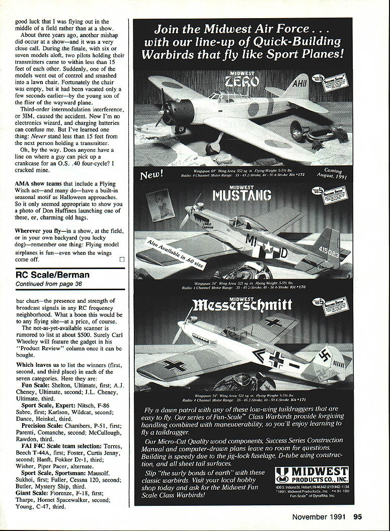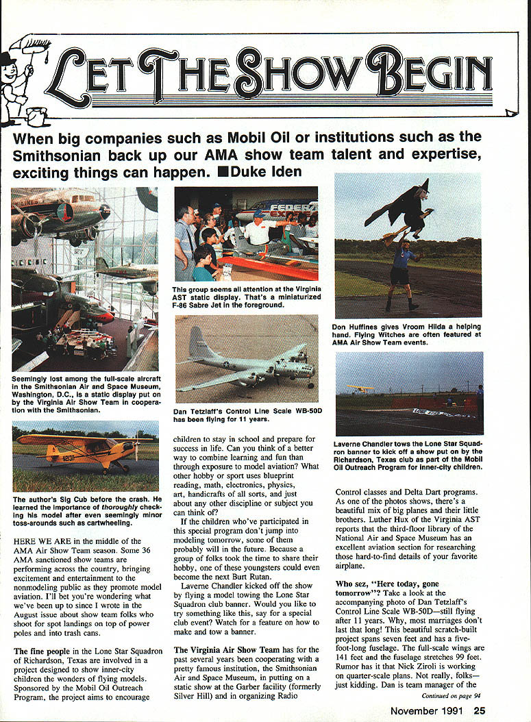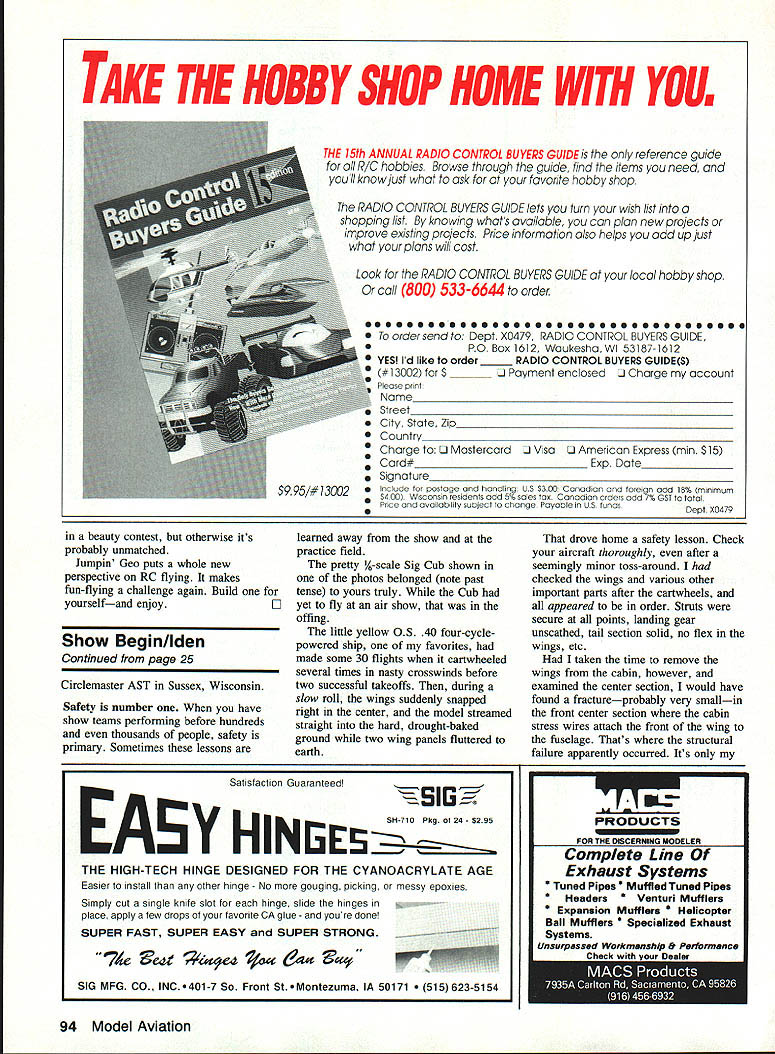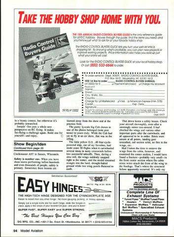 CET THE SHOWIEGm companies such Mobil Oil institutions such Smithsonian back up AMA show team talent expertise exciting things can happen EDuke Iden HERE WE ARE middle AMA Air Show Team season Some 36 AMA sanctioned show teams performing across country bringing excitement entertainment nonmodeling public promote model aviation Ill bet youre wondering what weve up since wrote August issue about show team folks shoot spot landings top power poles trash cans fine people Lone Star Squadron Richardson Texas involved project designed show inner-city children wonders flying models Sponsored Mobil Oil Outreach Program project aims encourage children stay school prepare success life Can think better way combine learning fun through exposure model aviation What other hobby sport uses blueprint reading math electronics physics art handicrafts sorts just about other discipline subject can think children whove participated special program dont jump modeling tomorrow some probably will future Because group folks took time share hobby youngsters could become next Burt Rutan Laverne Chandler kicked off show flying model towing Lone Star Squadron club banner Would like try something like say special club event Watch feature make tow banner Virginia Air Show Team has past several years cooperating pretty famous institution Smithsonian Air Space Museum putting static show Garber facility formerly Silver Hill organizing Radio Control classes Delta Dart programs As photos shows theres beautiful mix big planes little brothers Luther Hux Virginia AST reports third-floor library National Air Space Museum has excellent aviation section researching hard-to-find details favorite airplane sez today gone tomorrow Take look accompanying photo Dan Tetzlaffs Control Line Scale WB-50Dstill flying after 11 years marriages dont last long beautiful scratch-built project spans seven feet has fivefoot-long fuselage full-scale wings 141 feet fuselage stretches 99 feet Rumor has Nick Ziroli working quarter-scale plans really folks just kidding Dan team manager Continued poge 94 November 1991 25 group seems attention Virginia AST static display Thats miniaturized F-Se Sabre Jet foreground Seemingly lost among full-scale aircraft Smithsonian Air Space Museum Washington DC static display put Virginia Air Show Team coopera tion Smithsonian Don Huffines gives Vroom Hilda helping hand Flying Witches often featured AMA Air Show Team events Dan Tetzlaffs Control Line Scale WB-500 has flying 11 years authors Sig Cub before crash learned importance thoroughly check ing model after seemingly minor toss-arounds such cartwheeling Laverne Chandler tows Lone Star Squad ron banner kick off show put Richardson Texas club part Mobil Oil Outreach Program inner-city children beauty contest otherwise its probably unmatched Jumpin Geo puts whole new perspective RC flying makes fun-flying challenge again Build yourselfand enjoy0 Show Begin/Iden Continued page 25 Circlemaster AST Sussex Wisconsin Safety number have show teams performing before hundreds thousands people safety primary Sometimes lessons learned away show practice field pretty 4-scale Sig Cub shown photos belonged note past tense yours truly Cub yet fly air show offing little yellow OS 40 four-cyclepowered ship favorites made some 30 flights cartwheeled several times nasty crosswinds before two successful takeoffs during slow roll wings suddenly snapped right center model streamed straight hard drought-baked ground two wing panels fluttered earth drove home safety lesson Check aircraft thoroughly after seemingly minor toss-around checked wings various other important parts after cartwheels appeared order Struts secure points landing gear unscathed tail section solid no flex wings etc taken time remove wings cabin however examined center section would have found fractureprobably very smallin front center section cabin stress wires attach front wing fuselage Thats structural failure apparently occurred Its Satisfaction Guaranteedi EAYHINI 5H-710 Pkg 24 $2 95 THE HIGH-TECH HINGE DESIGNED FOR THE CYANOACRYLATE AGE Easier install other hinge No gouging picking messy epoxies Simply cut single knife slot hinge slide hinges place apply few drops favorite CA glue youre done SUPER FAST SUPER EASY SUPER STRONG 7de ee4 fo e4a MFG CO INC.401-7 So Front St.Montezuma IA 50171 623-5154 PRODUCTS FOR THE DISCERNING MODELER Complete Line Exhaust Systems * Tuned Pipes Muffled Tuned Pipes * Headers * Venturi Mufflers * Expansion Mufflers copter Ball Mufflers ialized Exhaust Systems Unsurpassel W,ki,n Drfomanc 94 Model Aviation TAKE THE HOBBY SHOP HOME WITH YOUM THE 15th ANNUAL RADIO CONTROL BUYERS GUIDE ts reference gutde oIl R/C hobbies Browse through guide find items need ond youll know just whot ask favorite hobby shop RADIO CONTROL BUYERS GUIDE lets turn wish list o shopping list knowing whats ovoilable con plan new projects improve existing projects Price informotion olso helps add up just whot plons will cost Look RADIO CONTROL BUYERS GUIDE local hobby shop call 800 533-6644 order ccc... eeceoccc ceoceec c eeecec eec Jo order send Dept X0419 RADIO CONTROL BUYERS GUIDE PO Box 1612 WaukeshaWI 53187-1612 YES Id like order _____ RADIO CONTROL BUYERS GUIDES #13002 $ ______ J Payment enclosed J Charge account Please print Name_________________________________________________ Street______________________________________________________[v33][b22911249163110790]] City State Zip__________________________________________________ Country_____________________________________________________[v33][b24421331183111470]] Charge Li Mastercard Li Visa Li American Express mm $15 Card#_________________________ Exp Date_____________ Signature Include tar postage handling US 3300 canadian tareign add 18% minimum $400 Wisconsin residents add 5% sales tas canadian araers add 7% GST ta tatal Price availability sublect ta change Payable US tunds Dept X0479 good luck flying out middle field rather show About three years ago anoth