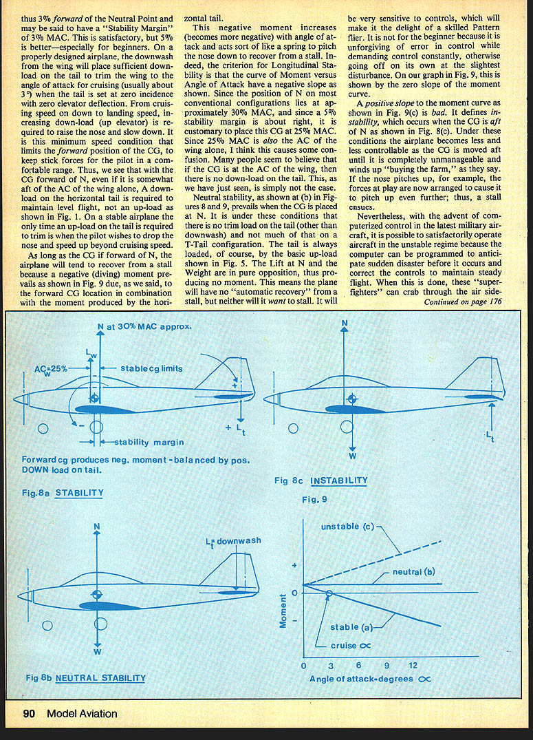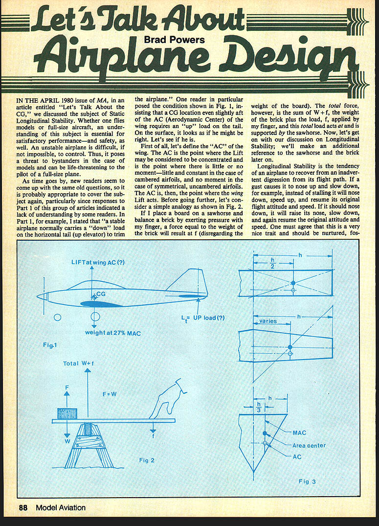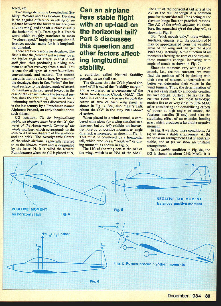 Let i7aUa #lbout Powers _______A ne Deiqri IN THE APRIL 1980 issue MA article entitled Lets Talk About CG discussed subject Static Longitudinal Stability Whether flies models full-size aircraft under standing subject essential satisfactory performanceand safety well An unstable airplane difficult impossible control Thus poses threat bystanders case models can life-threatening pilot full-size plane As time goes new readers seem come up same old questions soit probably appropriate cover sub ject agaln particularly since responses Part 1 group articles indicated lack understanding some readers Part 1 example stated stable airplane normally carries down load horizontal tail up elevator trim airplane reader particular posed condition shown Fig 1 sisting CG location slightly aft AC Aerodynamic Center wing requires up load tail surface looks might right Lets see First lets define AC wing AC point Lift may considered concentrated point little no momentlittle constant case cambered airfoils no moment case symmetrical uncambered airfoils AC point wing Lift acts Before going further lets con sider simple analogy shown Fig 2 place board sawhorse balance brick exerting pressure finger force equal weight brick will result f disregarding weight board total force however sum W ight brick plus load f applied finger total load acts supported sawhorse Now lets get discussion Longitudinal Stability well make additional reference sawhorse brick later Longitudinal Stability tendency airplane recover inadver tent digression its flight path gust causes nose up slow down example instead stalling will nose down speed up resume its original flight attitude speed should nose down will raise its nose slow down again resume original attitude speed must agree very nice trait should nurtured fos LIFTat wing AC L UPload t weight 27% MAC Fig1 L Total W--f FW -] Fig 2 h h varies h MAC Area center AC Fig 3 88 Model Aviation Jliii III El 0 F tered etc Two things determine Longitudinal Sta bility decalage CO location Decalage angular difference setting cidence between forward surface usu ally wing aft surface usually horizontal tail Decalage French word roughly translates mean wedge shaped implying angular dif ference another name longitudi nal dihedral two reasons decalage first forward surface must higher angle attack will stall first thus producing diving mo ment affect recovery stall true types aircrafttailless conventional canard second reason aft surface reason decalage does fact trim ward surface desired angle attack maintain desired speed except case canard forward sur face does trimming need trimming surface discovered back last century Frenchman named Alphonse Penaud early theorist about such things CG location longitudinally stable airplane must have CG ward Aerodynamic Center whole airplane corresponds total W diagram sawhorse brick Aerodynamic Center whole airplane generally referred Neutral Point designated letter N called Neutral Point because CG placed N Can airplane have stable flight up-load horizontal tail Part 3 discusses question other factors affect ing longitudinal stability condition called Neutral Stability prevails shall see distance CG placed ward N called stability margin expressed percentage Mean Aerodynamic Chord MAC MAC chord passes through center area wing panel shown Fig 3 See also Lets Talk About CG May 1980 Model Aviation placed wind tunnel cam bered wing alone wing attached fuselage no tail exhibits increas ing nose-up positive moment angle attack increased shown Fig 4 must countered horizontal tail produces negative div ing moment shown Fig 5 Lift wing acts AC wing 25% MAC Lift horizontal tail acts AC tail although common practice consider tail lift acting elevator hinge line practical reasons AC whole airplane N fore lies somewhat aft wing AC shown Fig 6 stick models fuselages engines etc position N may approximated weighted areas wing tail see April 1980 MA Actually N function moments affecting trim airplane moments change increasing angle attack shown Fig 7 Since moments vary angle attack ie constant must find position N dealing rates change derivatives better yet determine values wind tunnels Thus determination N easily made modeler creating own design Suffice say Neutral Point N Scale-type models lies very close 30% MAC after considering destabilizing effects power high angles attack fuselage nacelles also stabilizing effect extended landing gear produces favorable negative moment Fig 8 show three conditions show stable arrangement b show arrangement neutrally stable c show unstable arrangement stable condition Fig 8a CG shown about 27% MAC / / POSITIVE MOMENT no horizontal tail 4 Fig4 NL her w GATIVE TAIL MOMENT balances positive moment Fig 5 4/ 7 Forces producing Other moments Fig6 December 1984 89 thus 3 o forward Neutral Point may said have Stability Margin 3% MAC satisfactory 5% betterespecially beginners properly designed airplane downwash wing will place sufficient down load tail trim wing angle attack cruising usually about 30 tail set zero incidence zero elevator deflection cruis ing speed down landing speed creasing down-load up elevator re quired raise nose slow down minimum speed condition limits forward position CG keep stick forces pilot com fortable range Thus see CG forward N somewhat aft AC wing alone down load horizontal tail required maintain level flight up-load shown Fig 1 stable airplane time up-load tail required trim pilot wishes drop nose speed up beyond cruising speed As long CG forward N airplane will tend recover stall because negative diving moment pre vails shown Fig 9 due said forward CG location combination moment produced hori zontal tail negative moment increases becomes negative angle tack acts sort like spring pitch nose down recover stall deed criterion Longitudinal Sta bility curve Moment versus Angle Attack have negative slope shown Since position N conventional configurations lies ap proximately 30% MAC since 5% stability margin about right cus